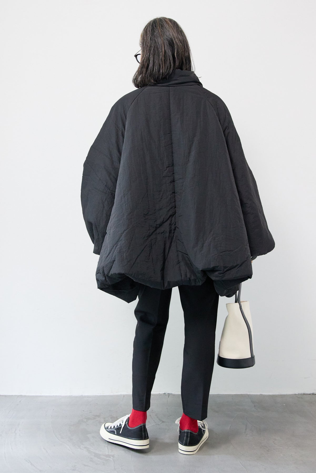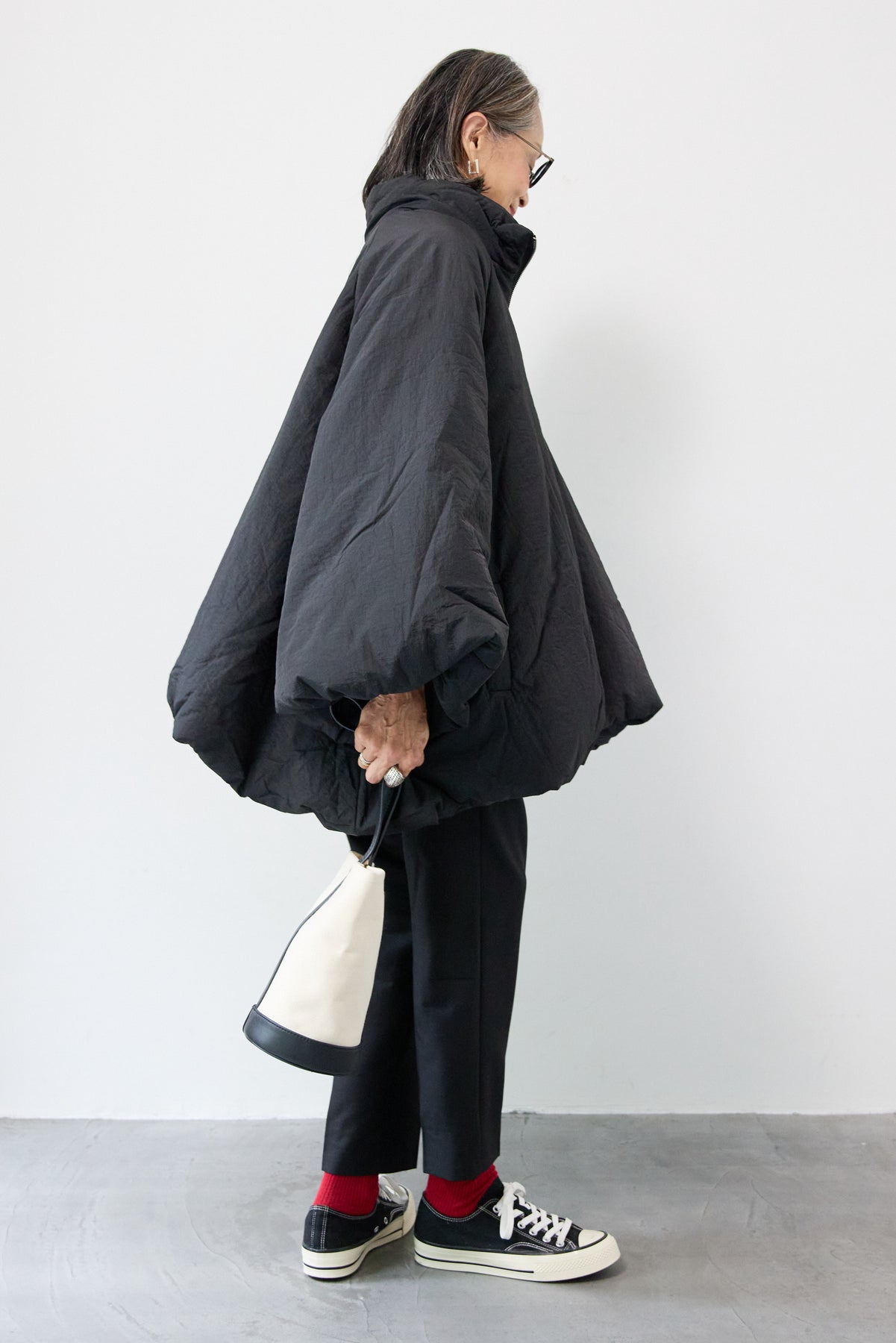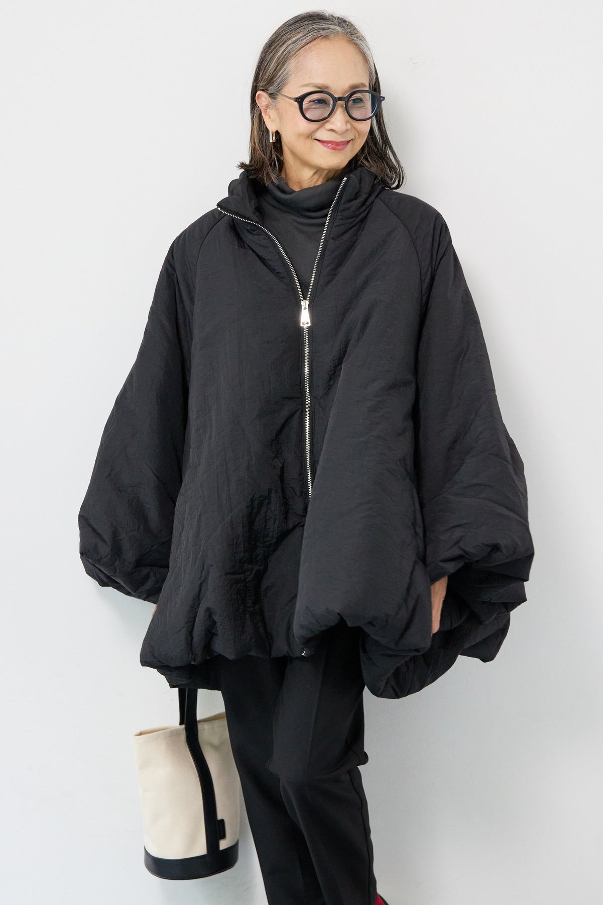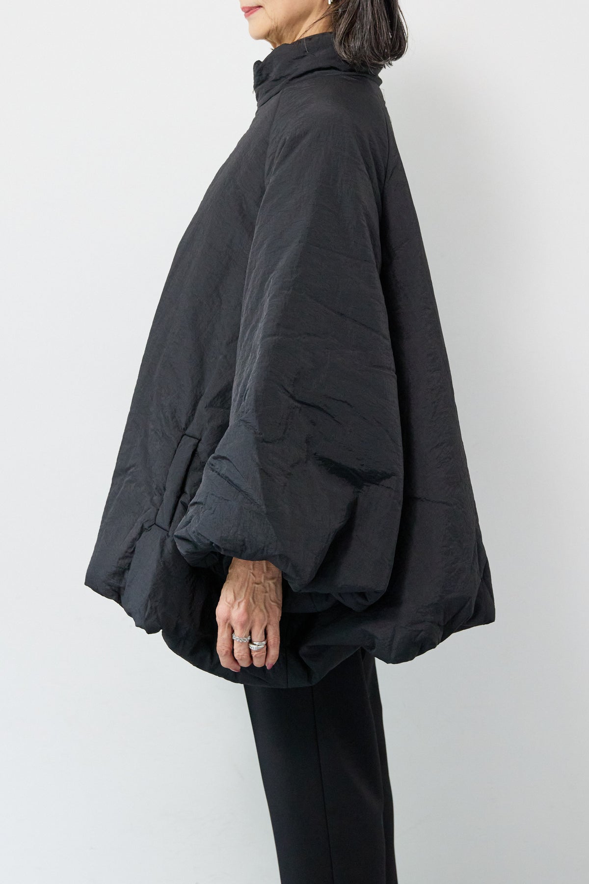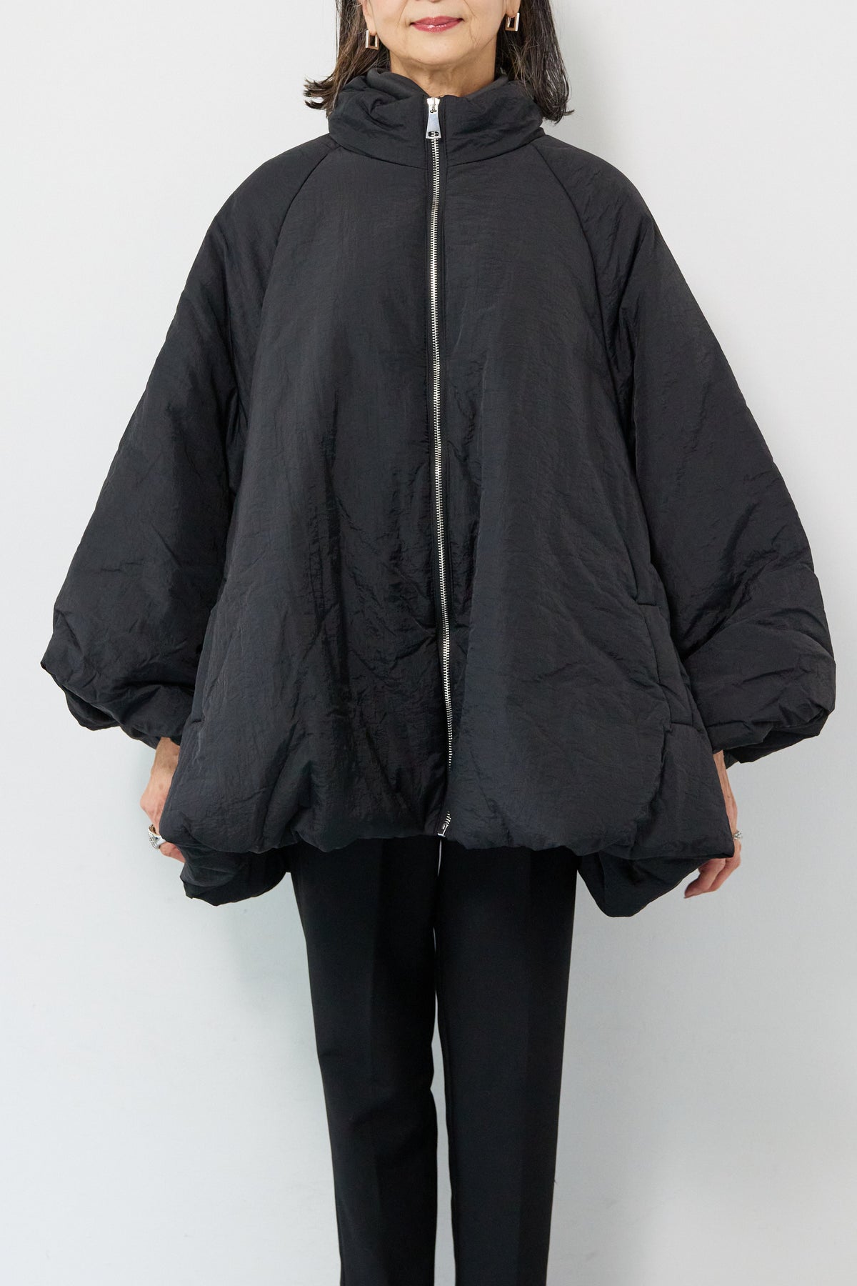 丸みのあるフォルムが特徴の中綿バルーンコート。軽やかな着心地ながらしっかりと保温性があり、寒い季節も快適に過ごせます。 ラグランスリーブのゆったりとしたシルエットで、厚手のニットの上からもストレスなく羽織れるデザイン。 艶を抑えたマットな質感が落ち着いた印象を与え、大人のカジュアルスタイルにぴったりです。 裾の丸みとふんわりとしたボリューム感が優しい雰囲気をプラスし、シンプルながら存在感のある一着です。