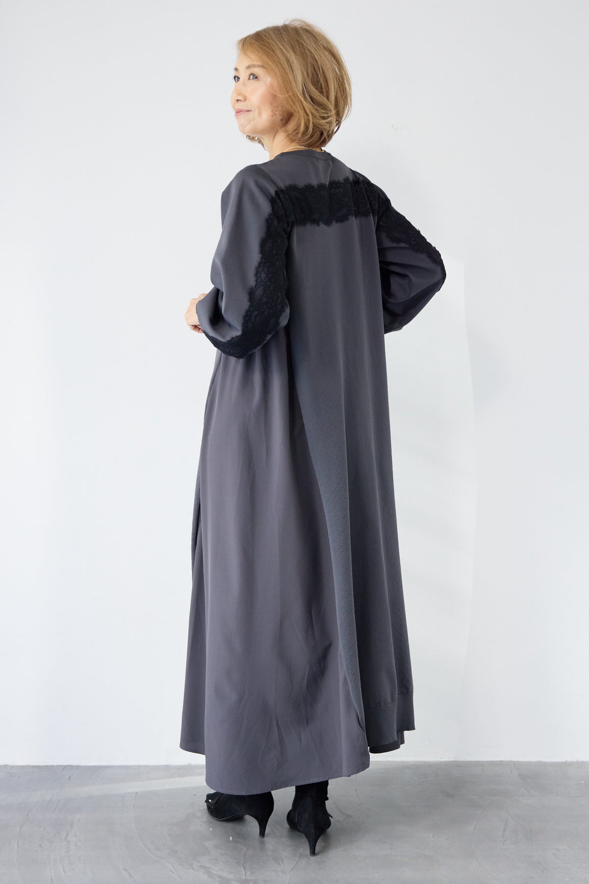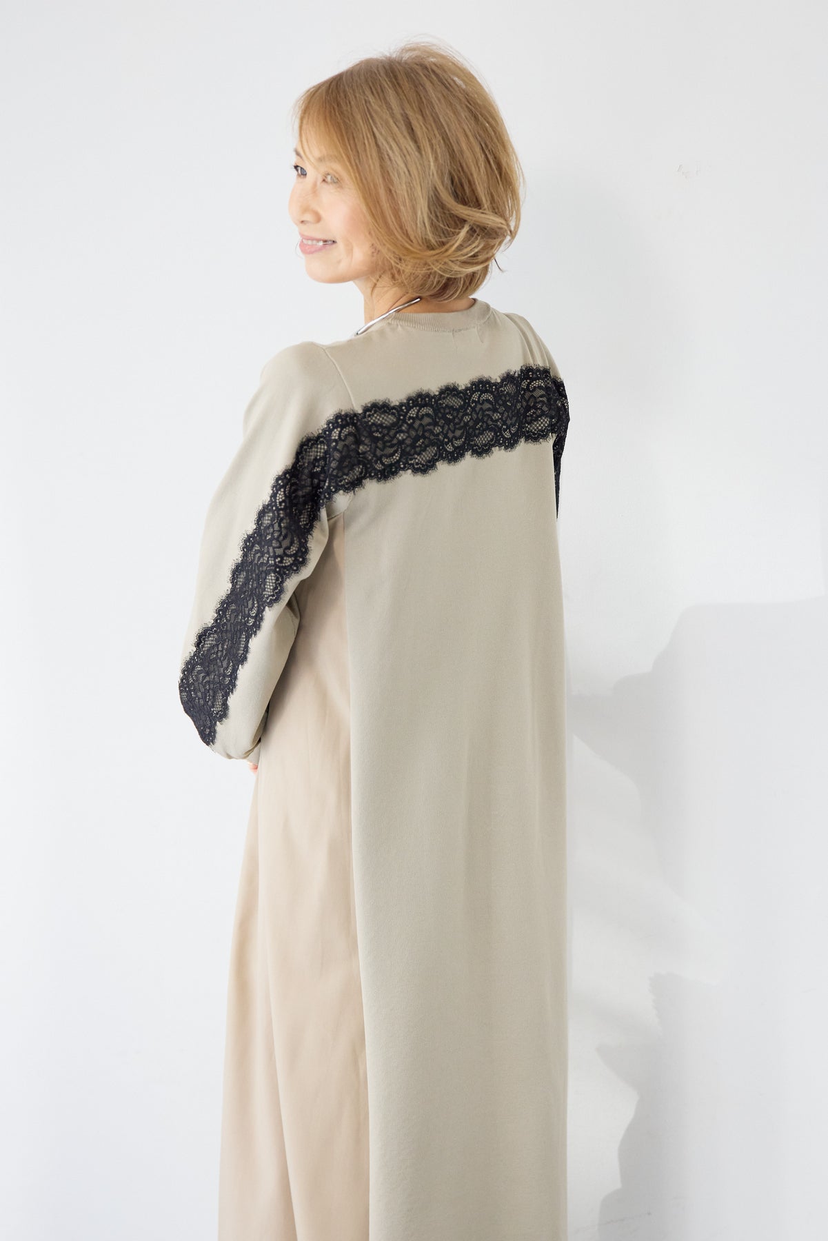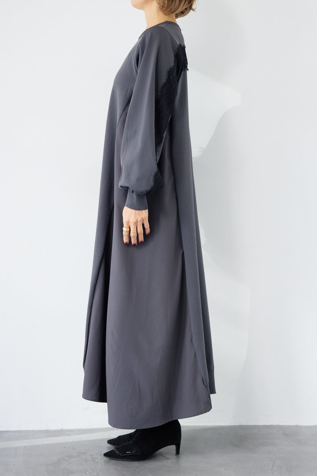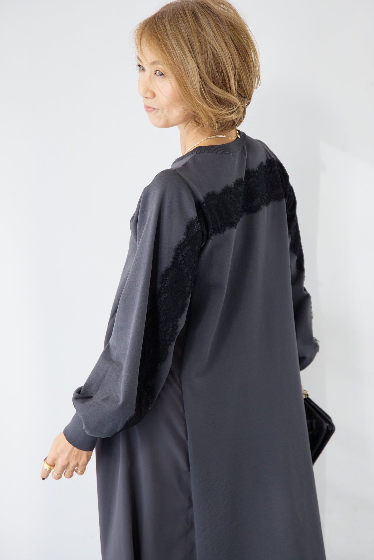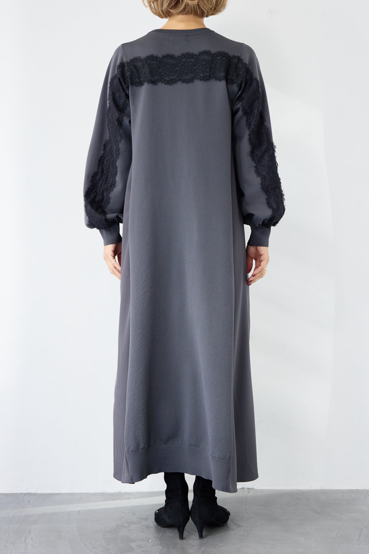 シンプルなフロントデザインに、背面と袖へあしらったレースが印象的なロングワンピース。前から見るとミニマル、後ろ姿でさりげない表情が加わるバランスが魅力です。 ゆったりとしたシルエットと落ち感のある素材が、体のラインを拾いにくく、動くたびに自然な揺れを生みます。袖口はリブ仕様で、ボリュームスリーブもすっきりとした印象に。 一枚で着用するのはもちろん、アウターや小物を合わせることで、日常から少しきちんと感を求めたいシーンまで幅広く対応します。