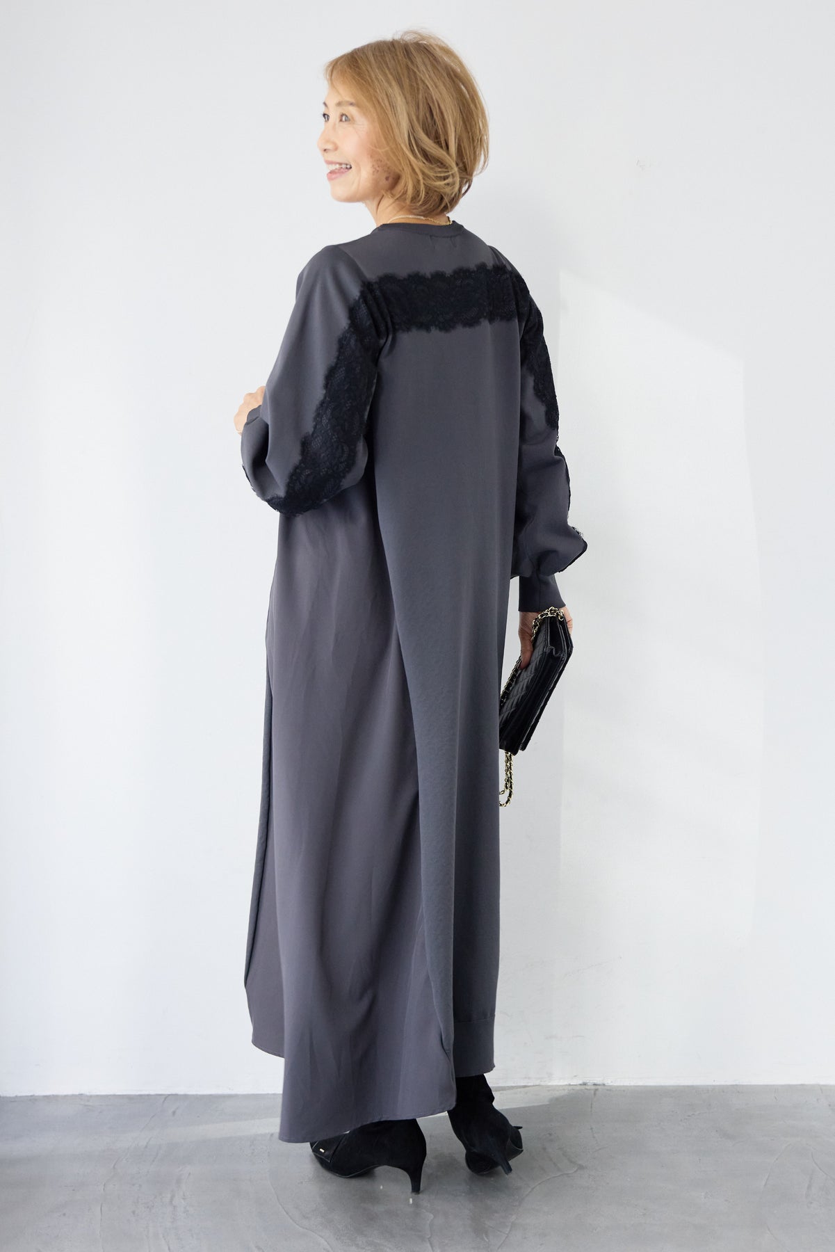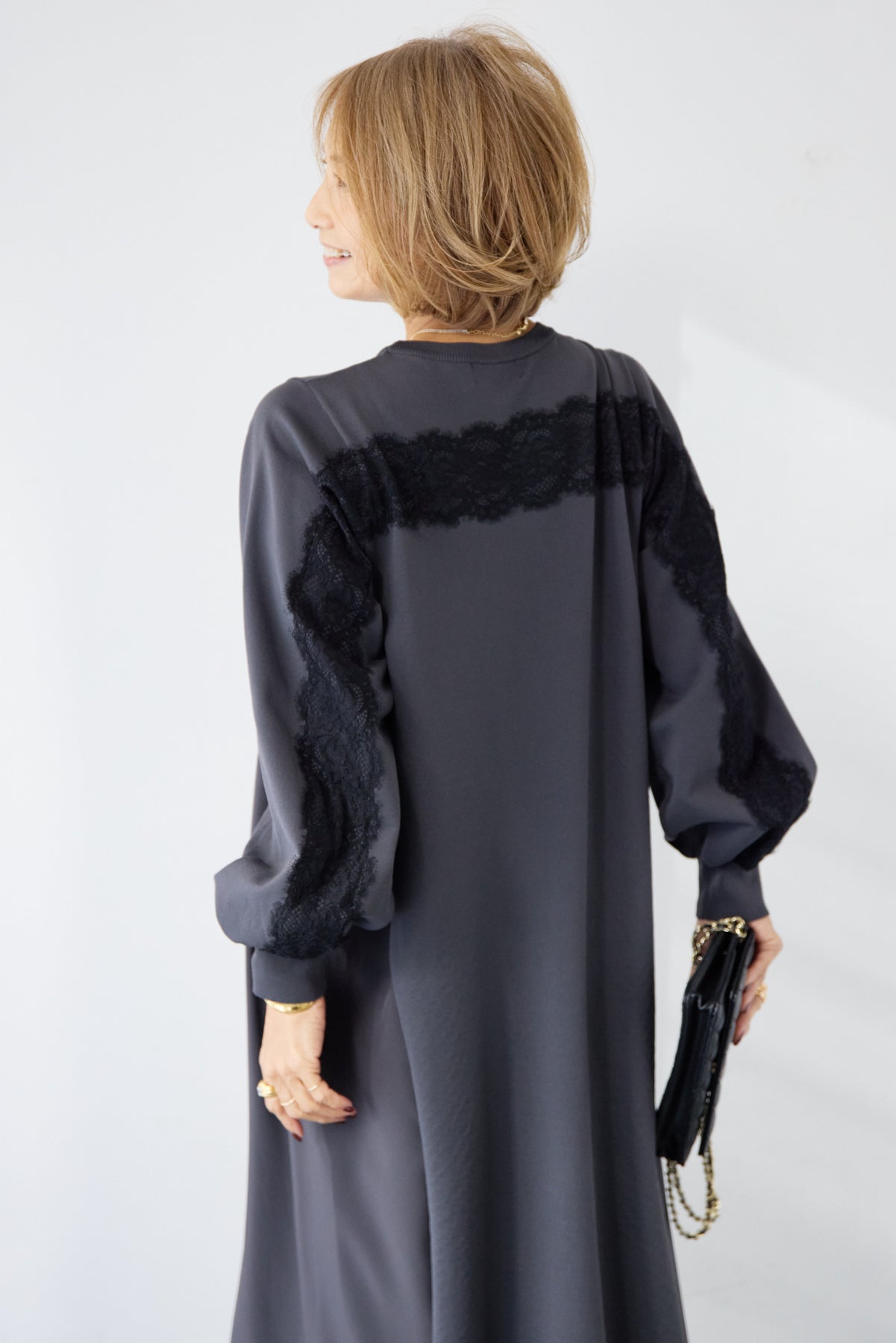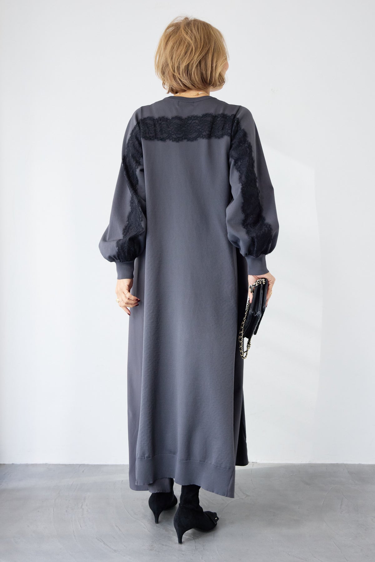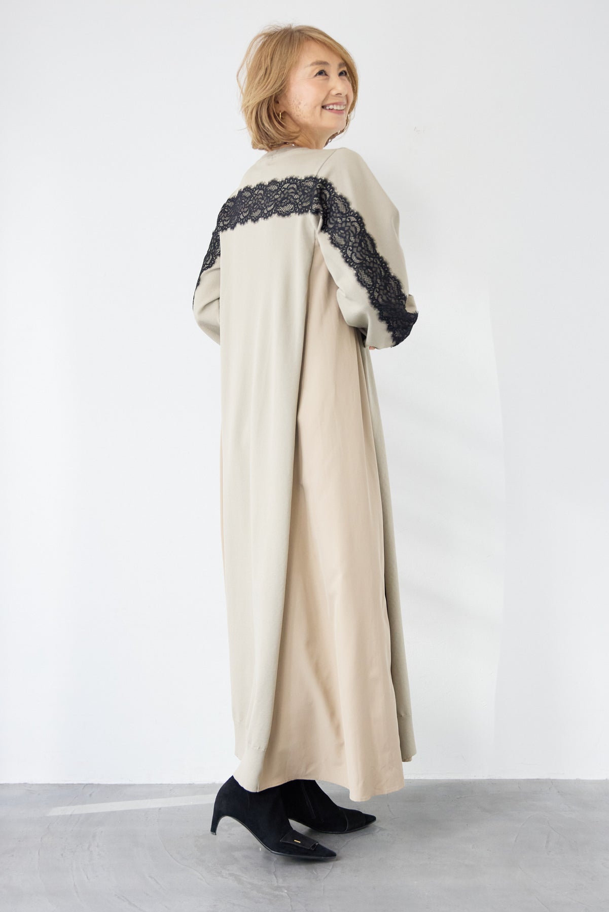 シンプルなフロントデザインに、背面と袖へあしらったレースが印象的なロングワンピース。前から見るとミニマル、後ろ姿でさりげない表情が加わるバランスが魅力です。 ゆったりとしたシルエットと落ち感のある素材が、体のラインを拾いにくく、動くたびに自然な揺れを生みます。袖口はリブ仕様で、ボリュームスリーブもすっきりとした印象に。 一枚で着用するのはもちろん、アウターや小物を合わせることで、日常から少しきちんと感を求めたいシーンまで幅広く対応します。