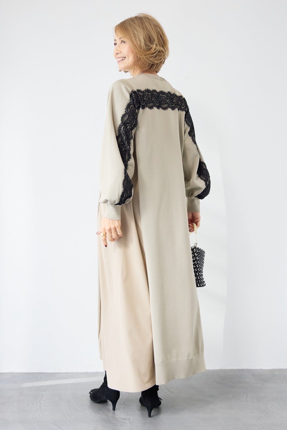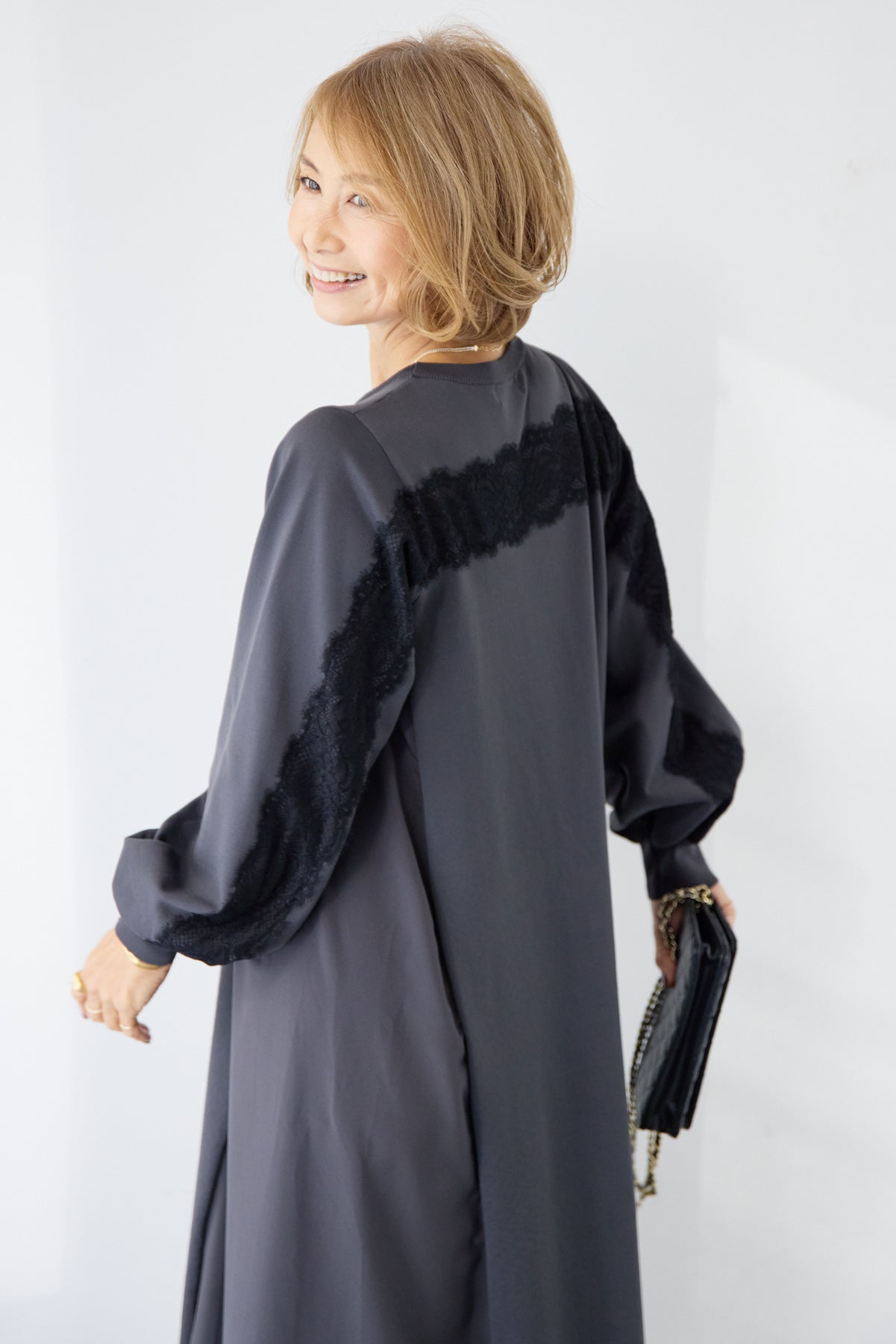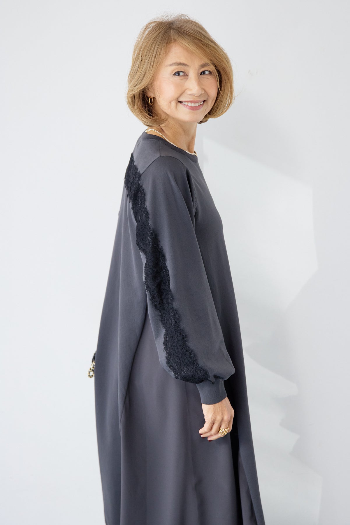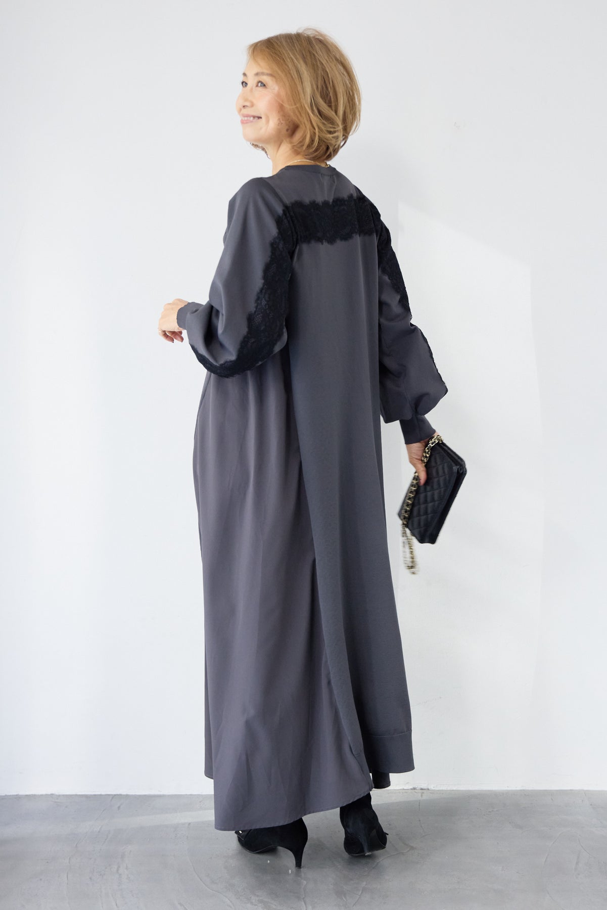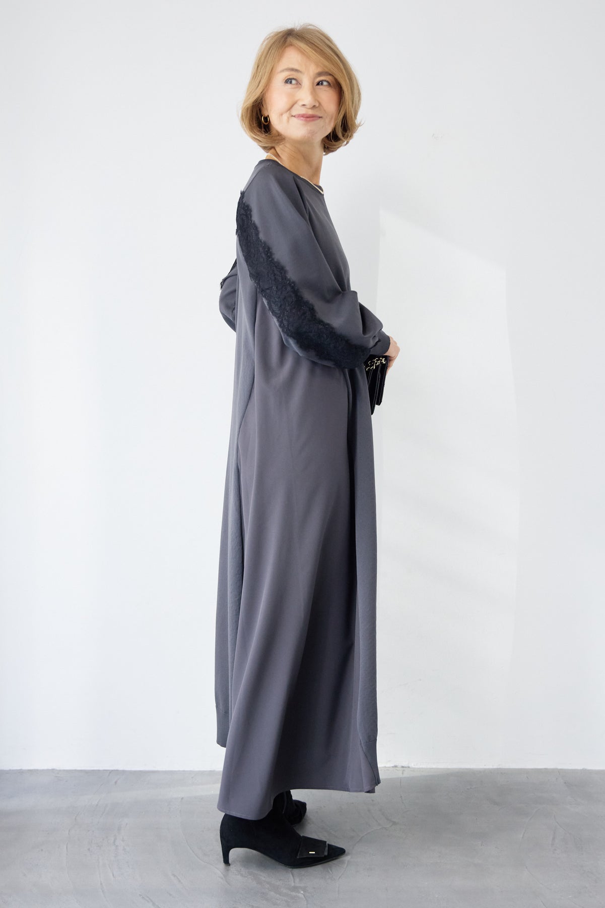 シンプルなフロントデザインに、背面と袖へあしらったレースが印象的なロングワンピース。前から見るとミニマル、後ろ姿でさりげない表情が加わるバランスが魅力です。 ゆったりとしたシルエットと落ち感のある素材が、体のラインを拾いにくく、動くたびに自然な揺れを生みます。袖口はリブ仕様で、ボリュームスリーブもすっきりとした印象に。 一枚で着用するのはもちろん、アウターや小物を合わせることで、日常から少しきちんと感を求めたいシーンまで幅広く対応します。