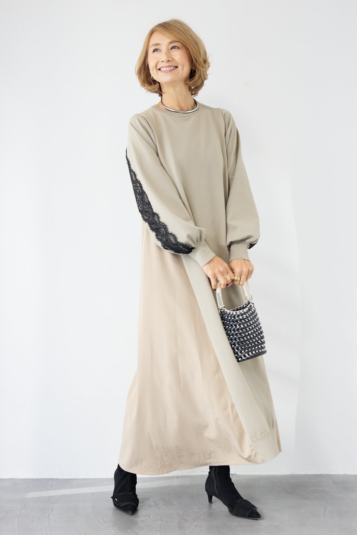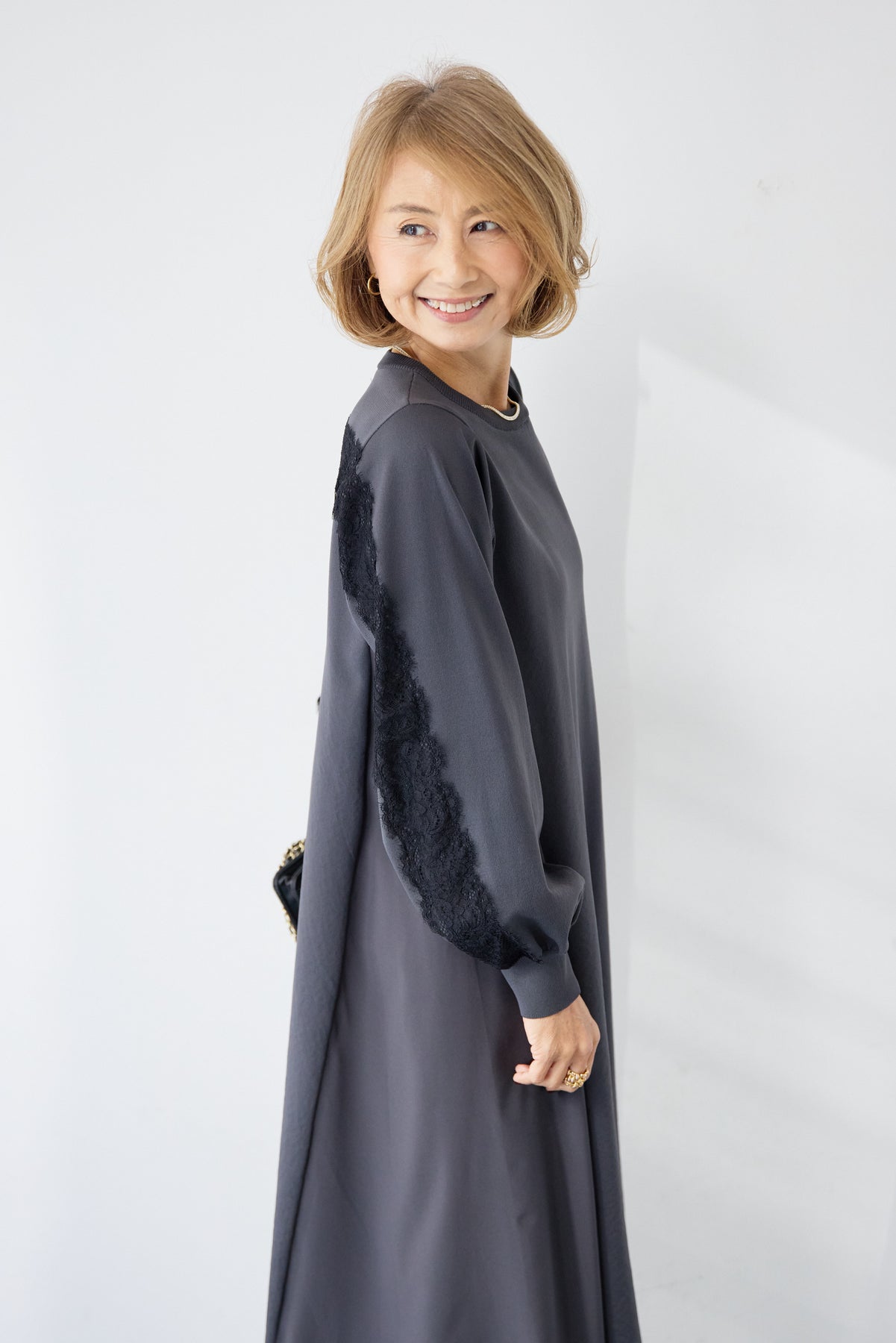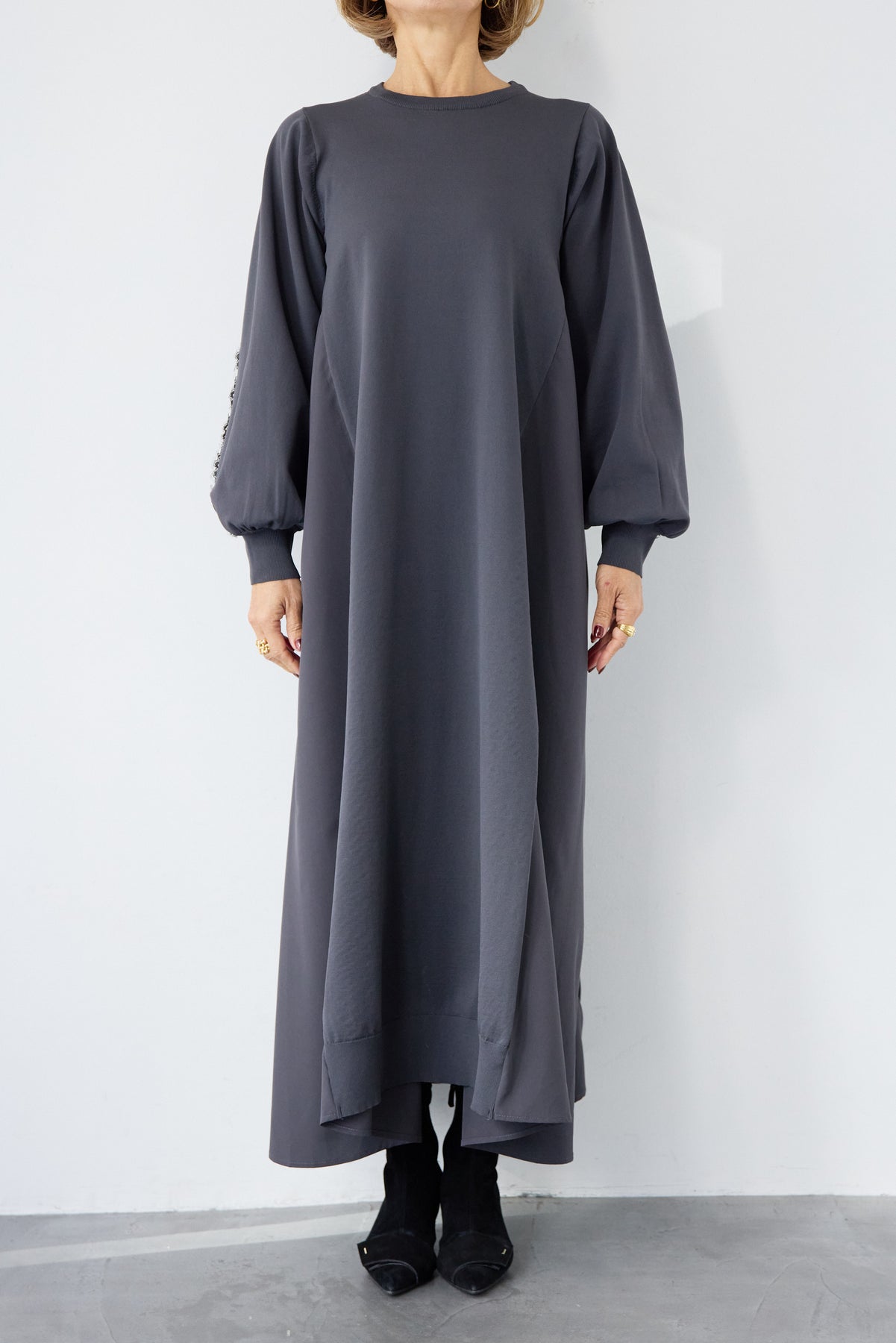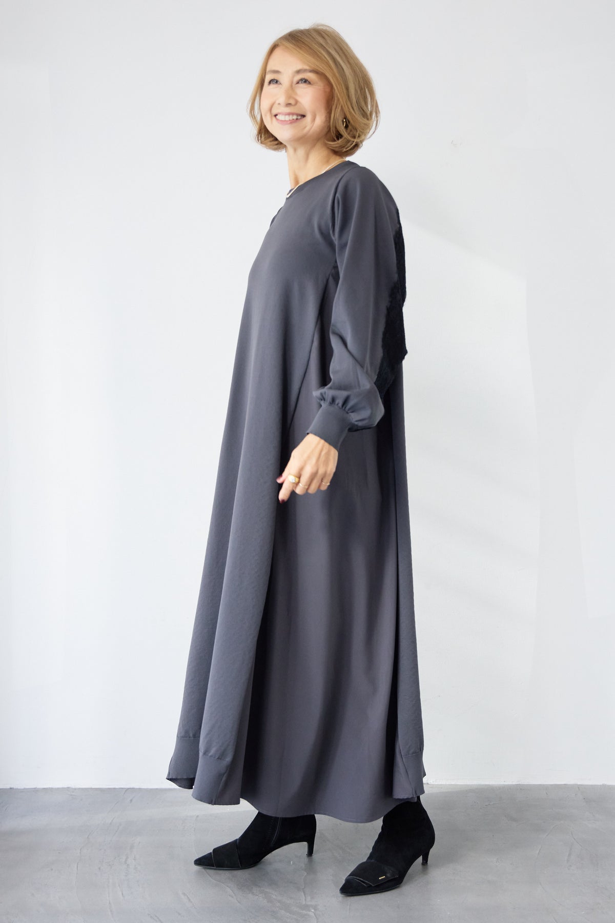シンプルなフロントデザインに、背面と袖へあしらったレースが印象的なロングワンピース。前から見るとミニマル、後ろ姿でさりげない表情が加わるバランスが魅力です。 ゆったりとしたシルエットと落ち感のある素材が、体のラインを拾いにくく、動くたびに自然な揺れを生みます。袖口はリブ仕様で、ボリュームスリーブもすっきりとした印象に。 一枚で着用するのはもちろん、アウターや小物を合わせることで、日常から少しきちんと感を求めたいシーンまで幅広く対応します。