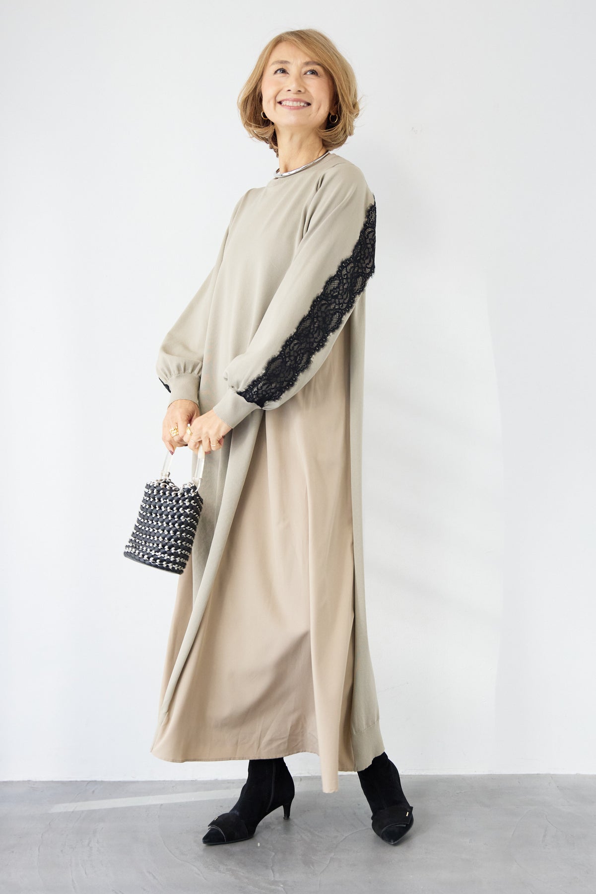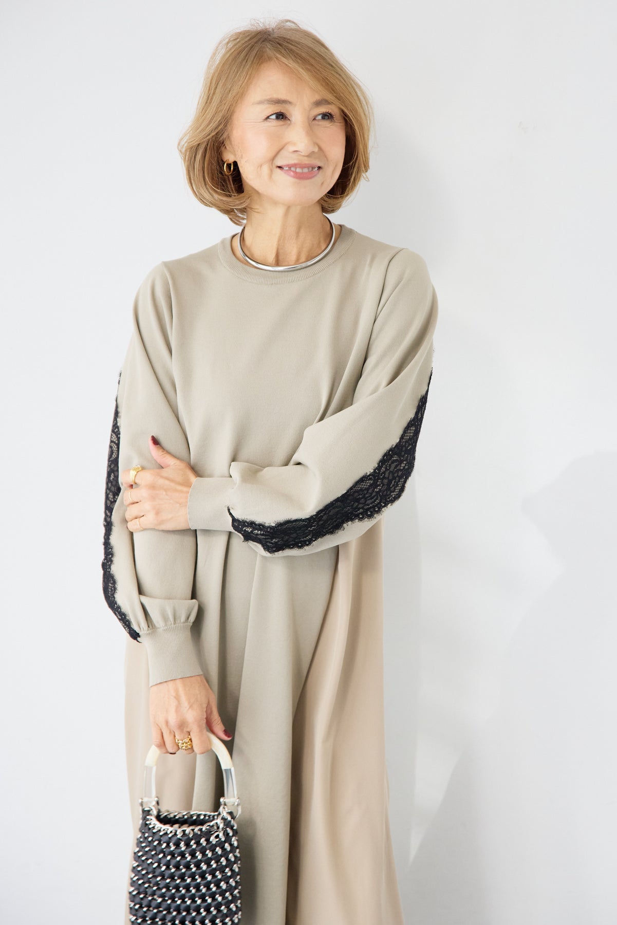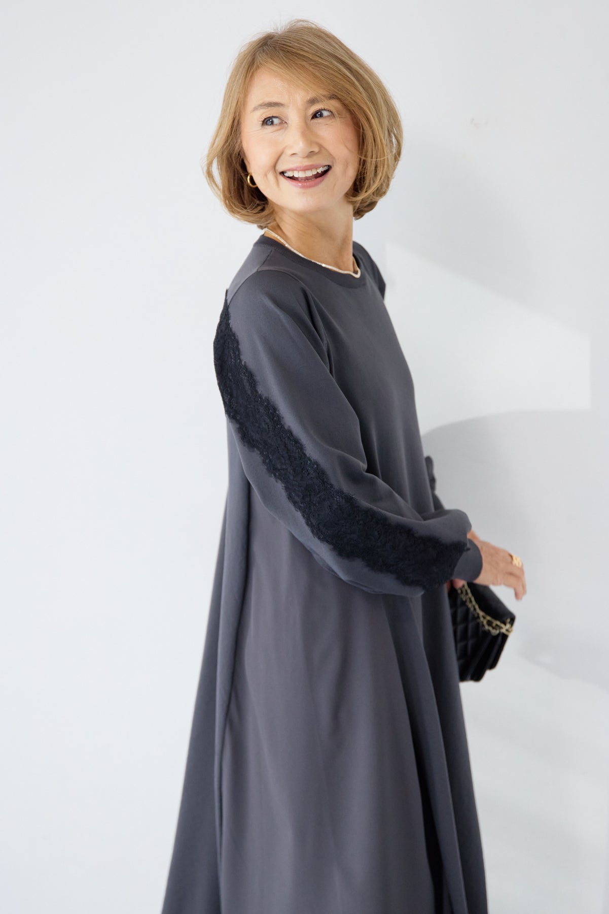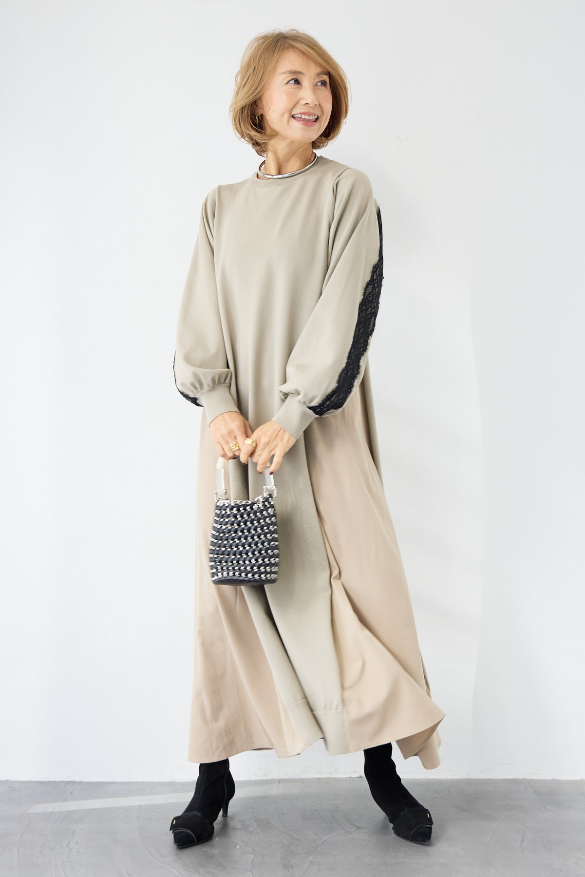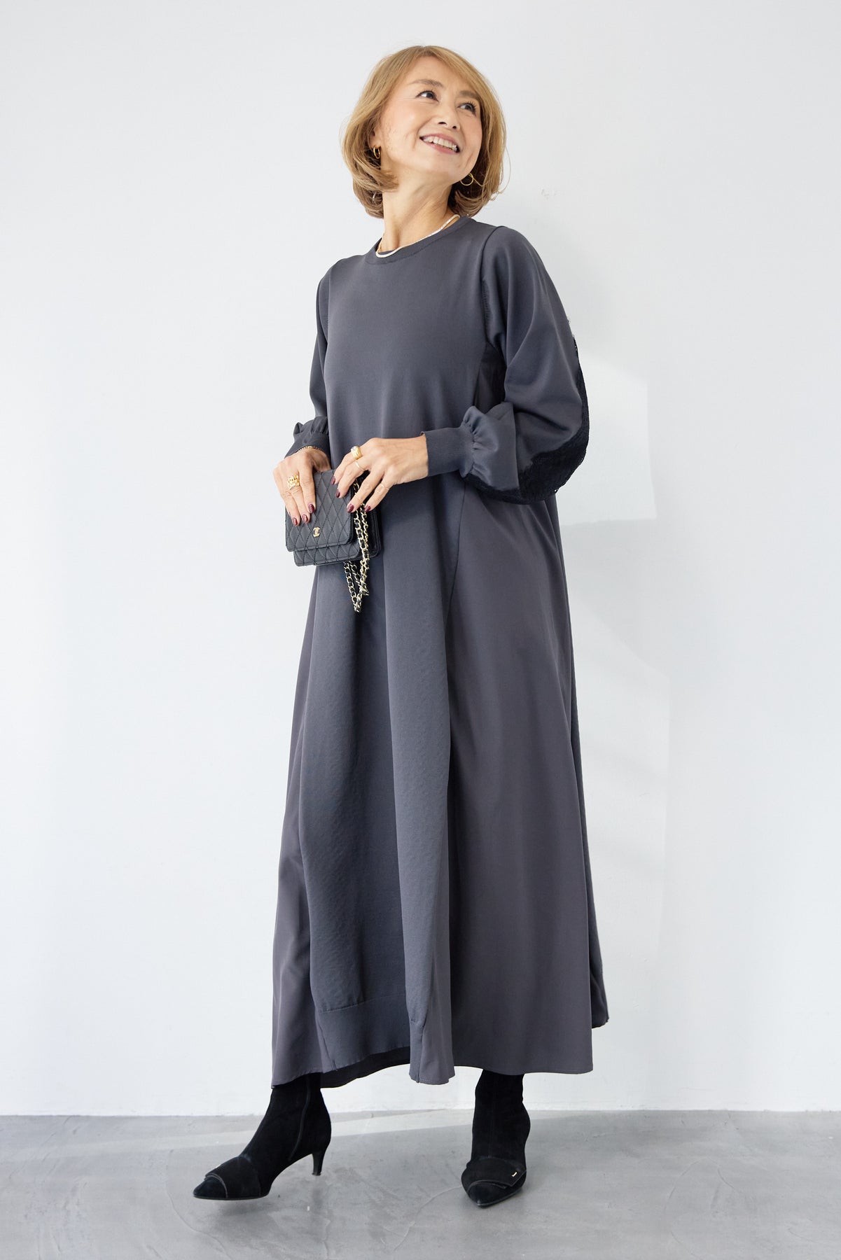 シンプルなフロントデザインに、背面と袖へあしらったレースが印象的なロングワンピース。前から見るとミニマル、後ろ姿でさりげない表情が加わるバランスが魅力です。 ゆったりとしたシルエットと落ち感のある素材が、体のラインを拾いにくく、動くたびに自然な揺れを生みます。袖口はリブ仕様で、ボリュームスリーブもすっきりとした印象に。 一枚で着用するのはもちろん、アウターや小物を合わせることで、日常から少しきちんと感を求めたいシーンまで幅広く対応します。