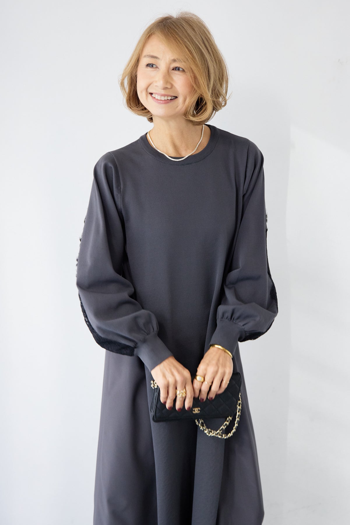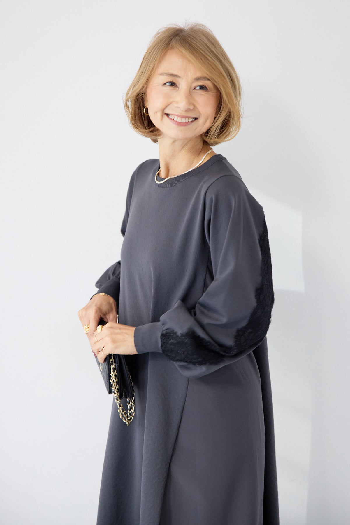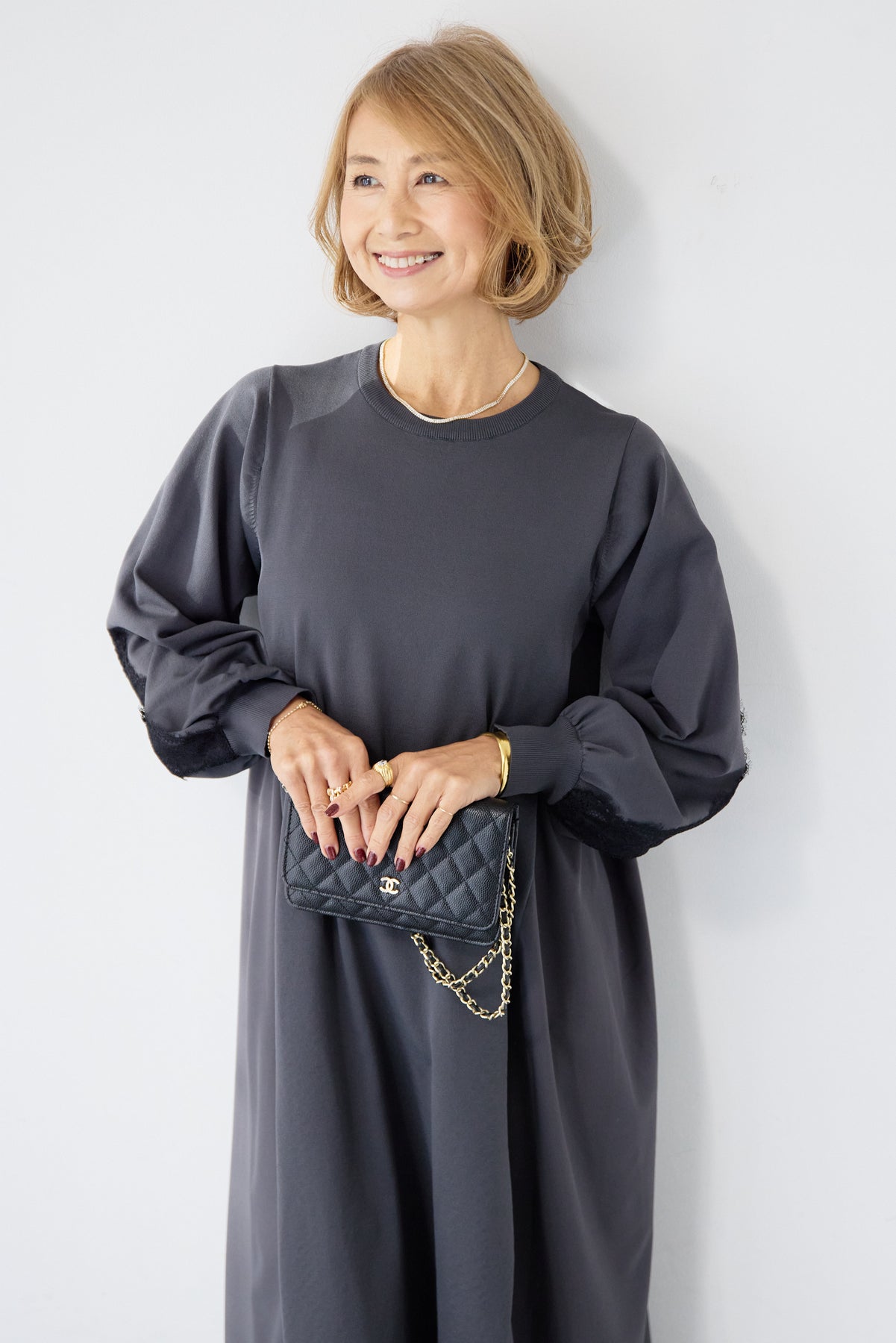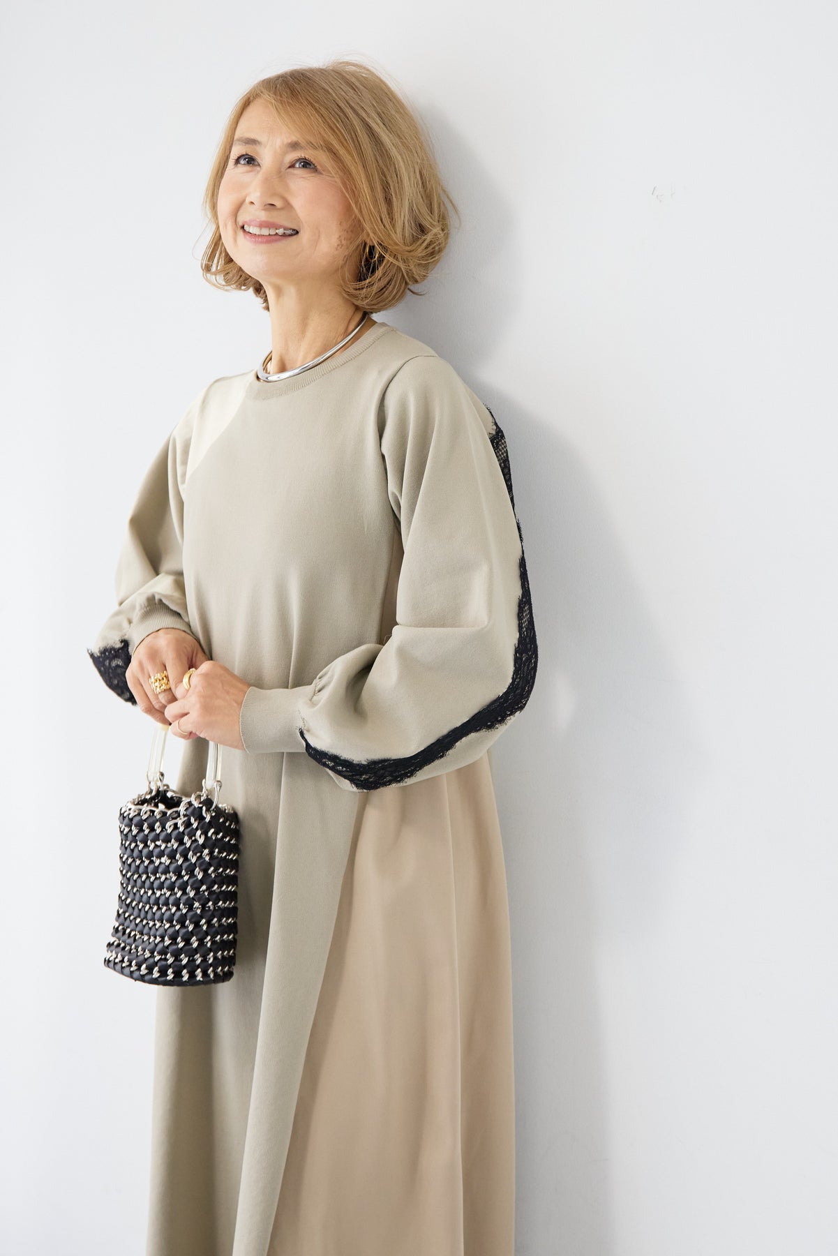 シンプルなフロントデザインに、背面と袖へあしらったレースが印象的なロングワンピース。前から見るとミニマル、後ろ姿でさりげない表情が加わるバランスが魅力です。 ゆったりとしたシルエットと落ち感のある素材が、体のラインを拾いにくく、動くたびに自然な揺れを生みます。袖口はリブ仕様で、ボリュームスリーブもすっきりとした印象に。 一枚で着用するのはもちろん、アウターや小物を合わせることで、日常から少しきちんと感を求めたいシーンまで幅広く対応します。