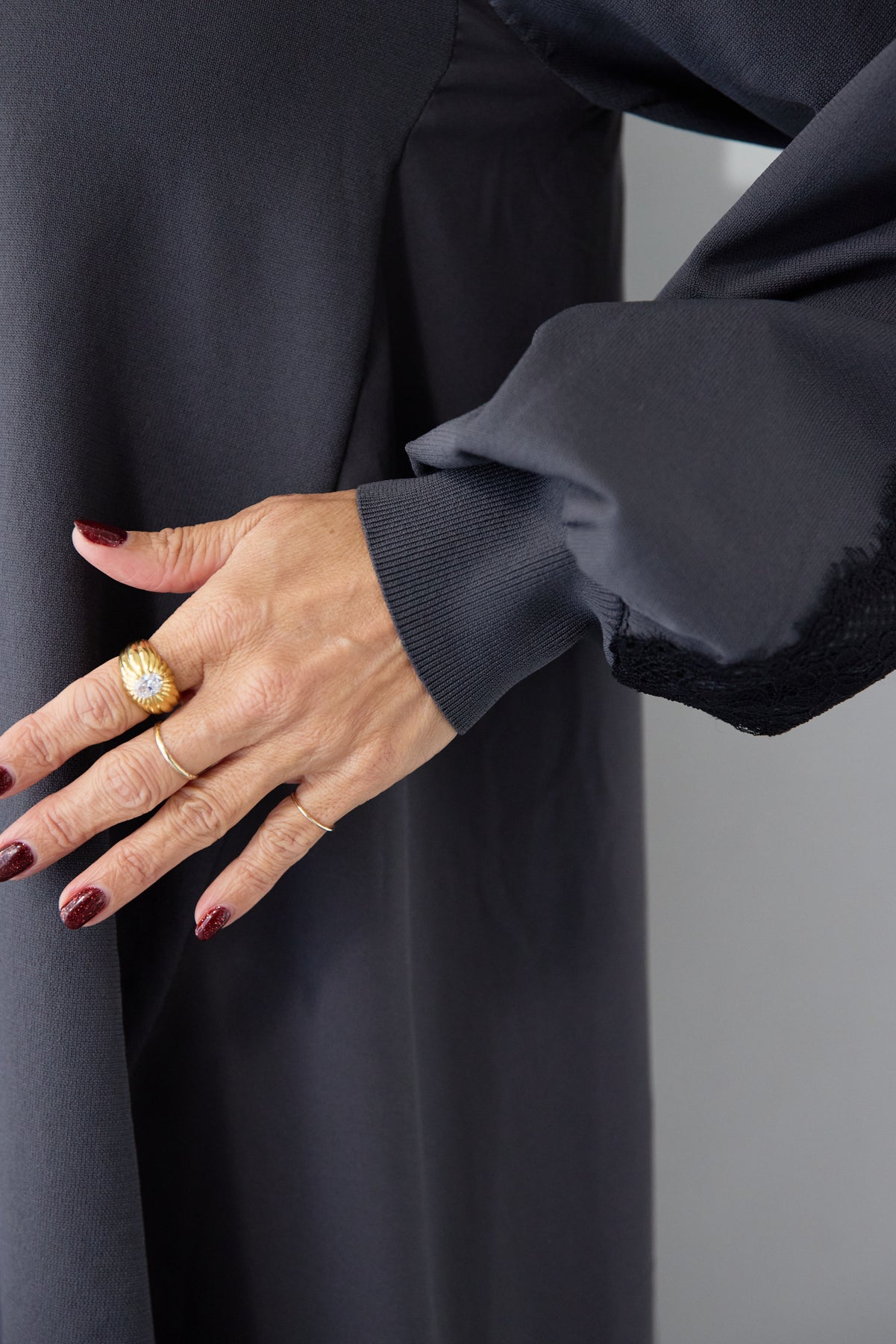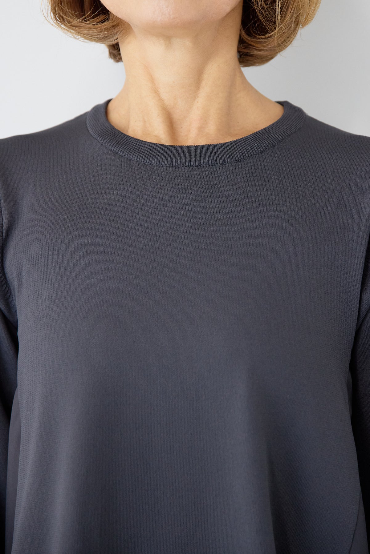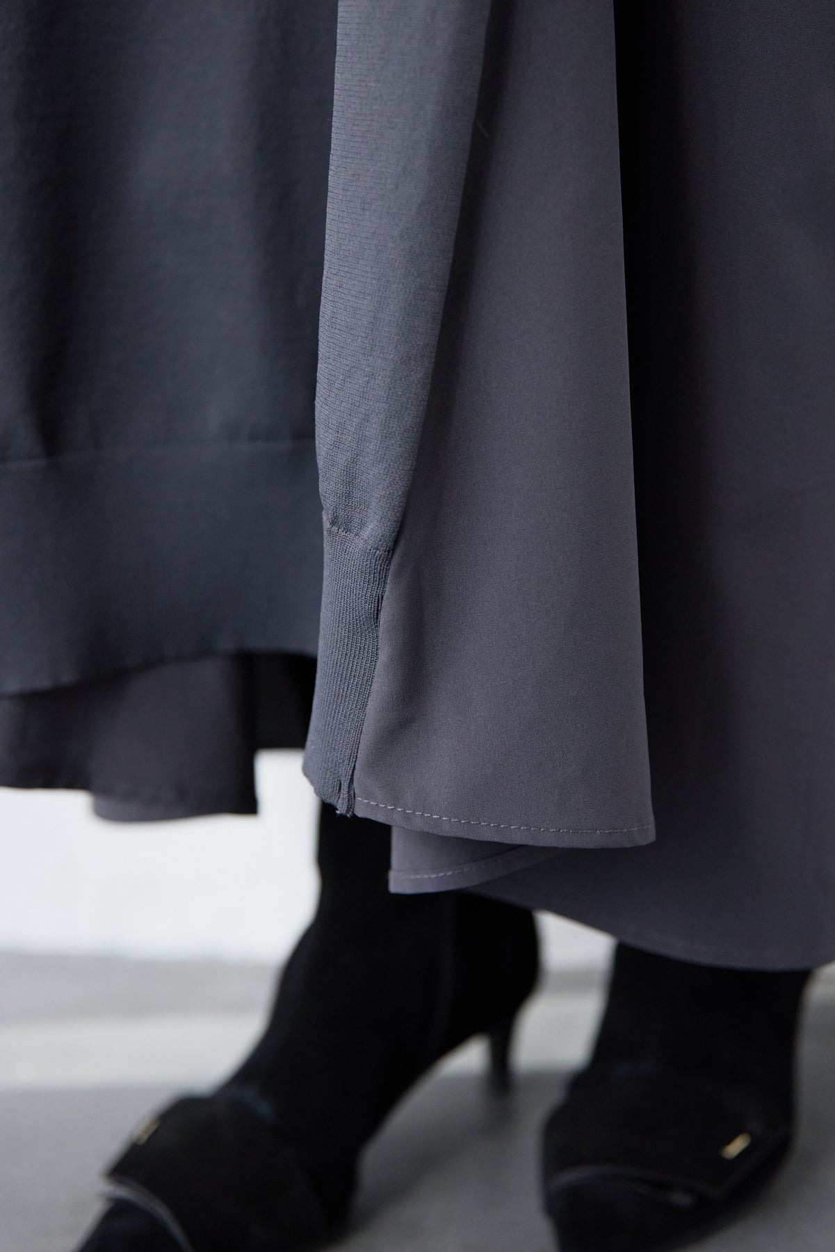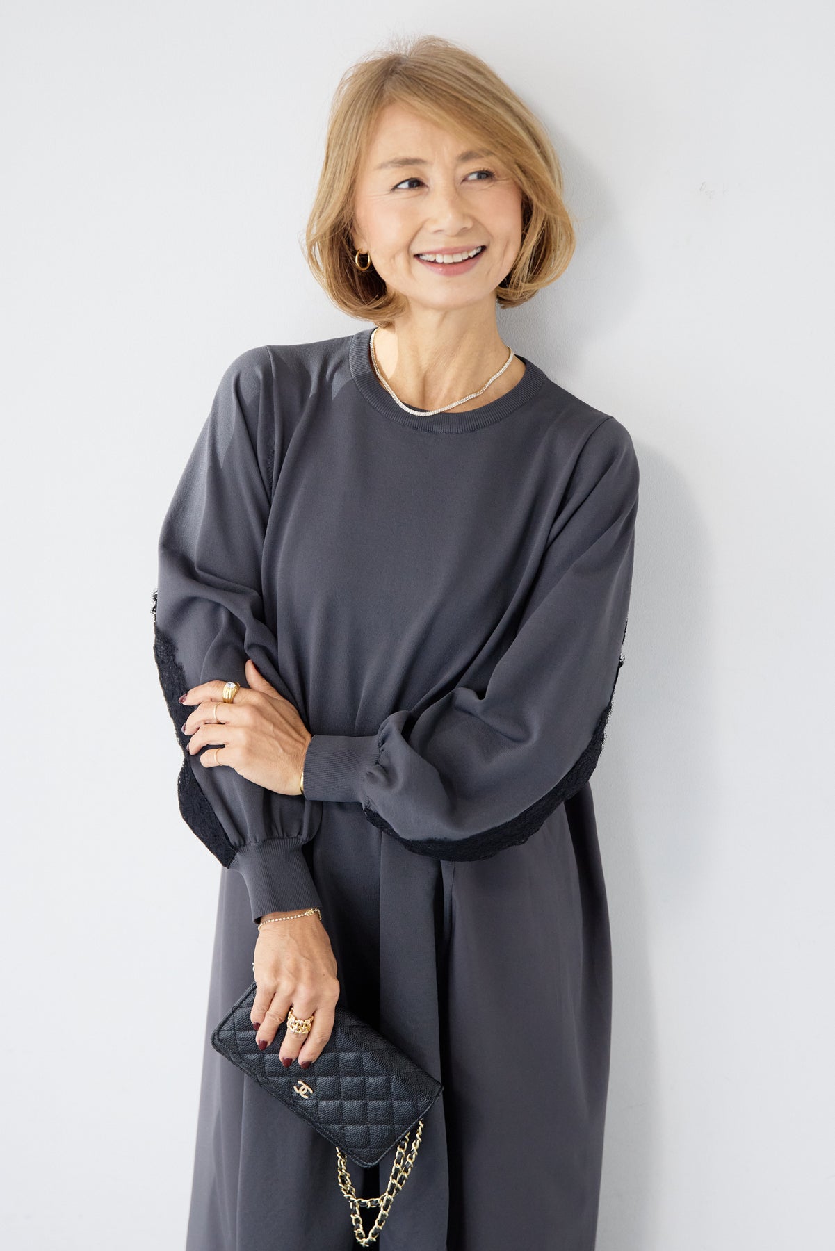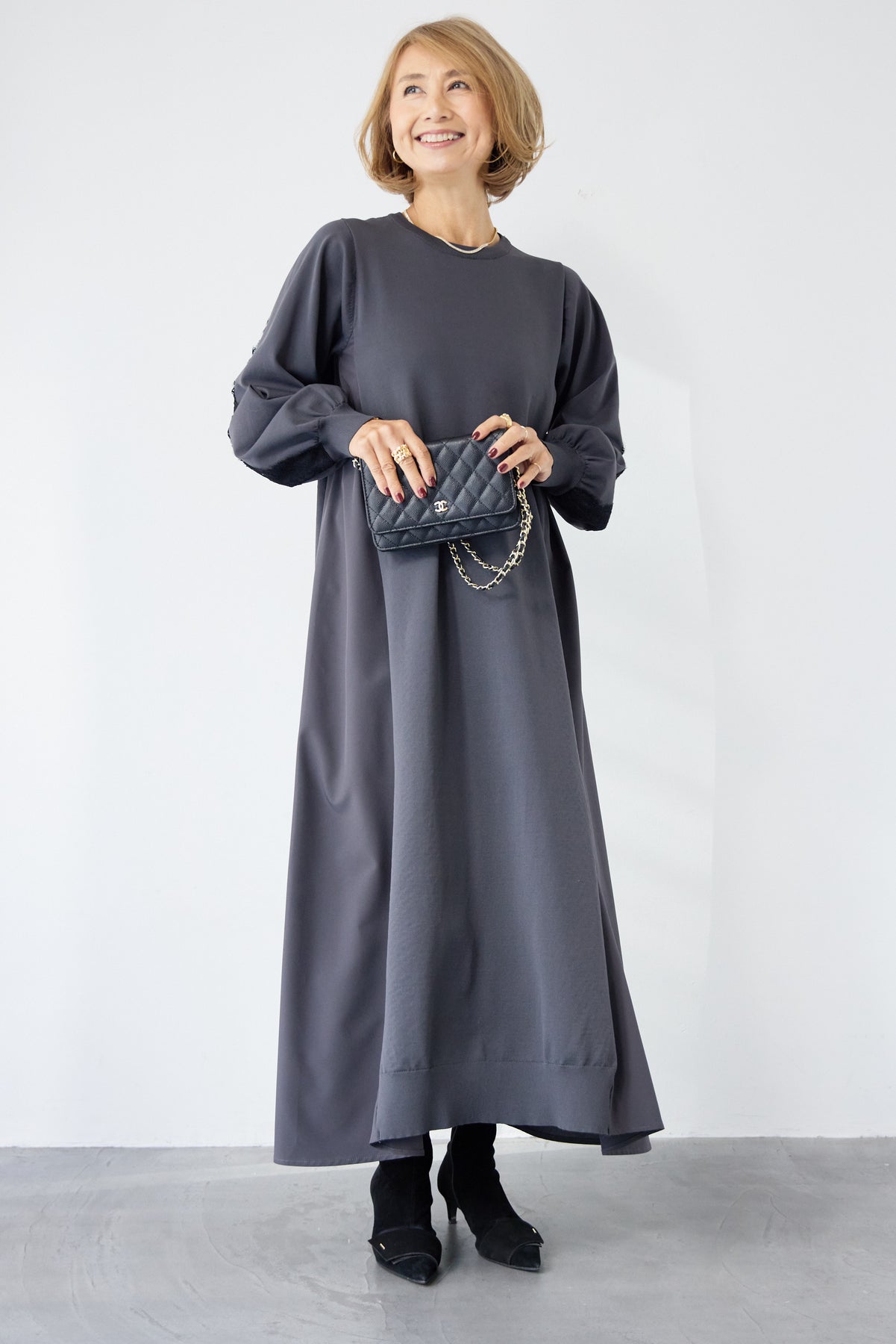 シンプルなフロントデザインに、背面と袖へあしらったレースが印象的なロングワンピース。前から見るとミニマル、後ろ姿でさりげない表情が加わるバランスが魅力です。 ゆったりとしたシルエットと落ち感のある素材が、体のラインを拾いにくく、動くたびに自然な揺れを生みます。袖口はリブ仕様で、ボリュームスリーブもすっきりとした印象に。 一枚で着用するのはもちろん、アウターや小物を合わせることで、日常から少しきちんと感を求めたいシーンまで幅広く対応します。