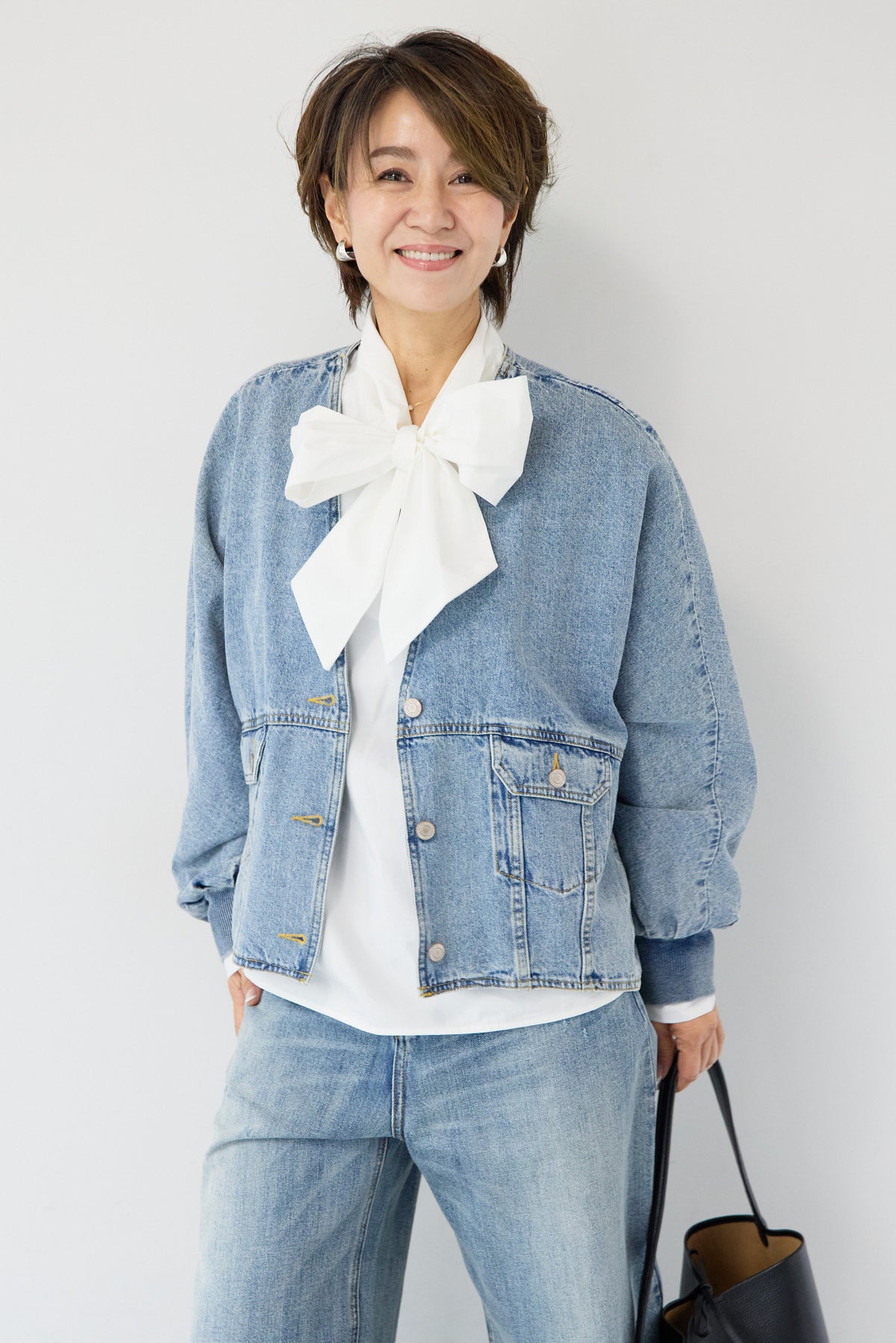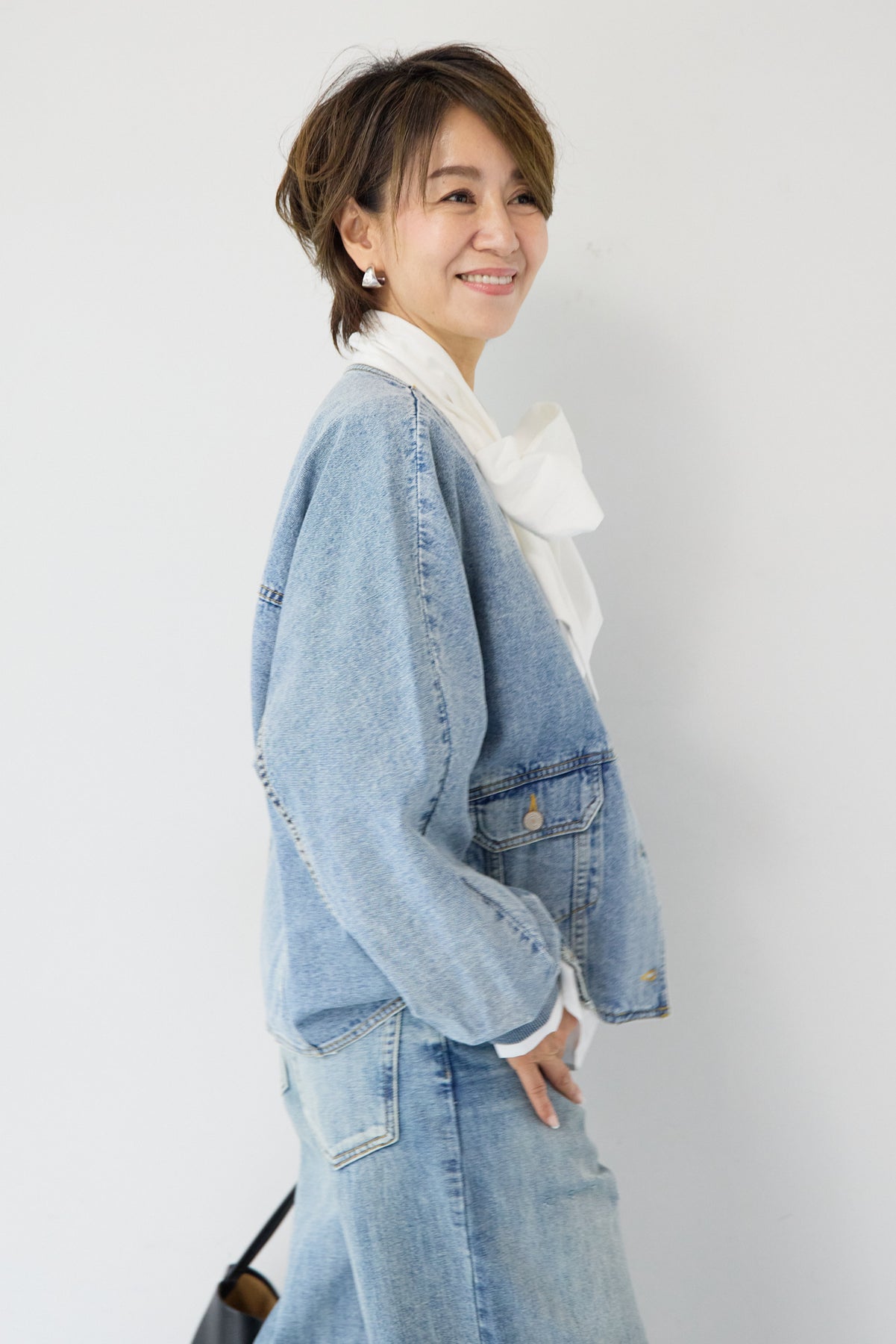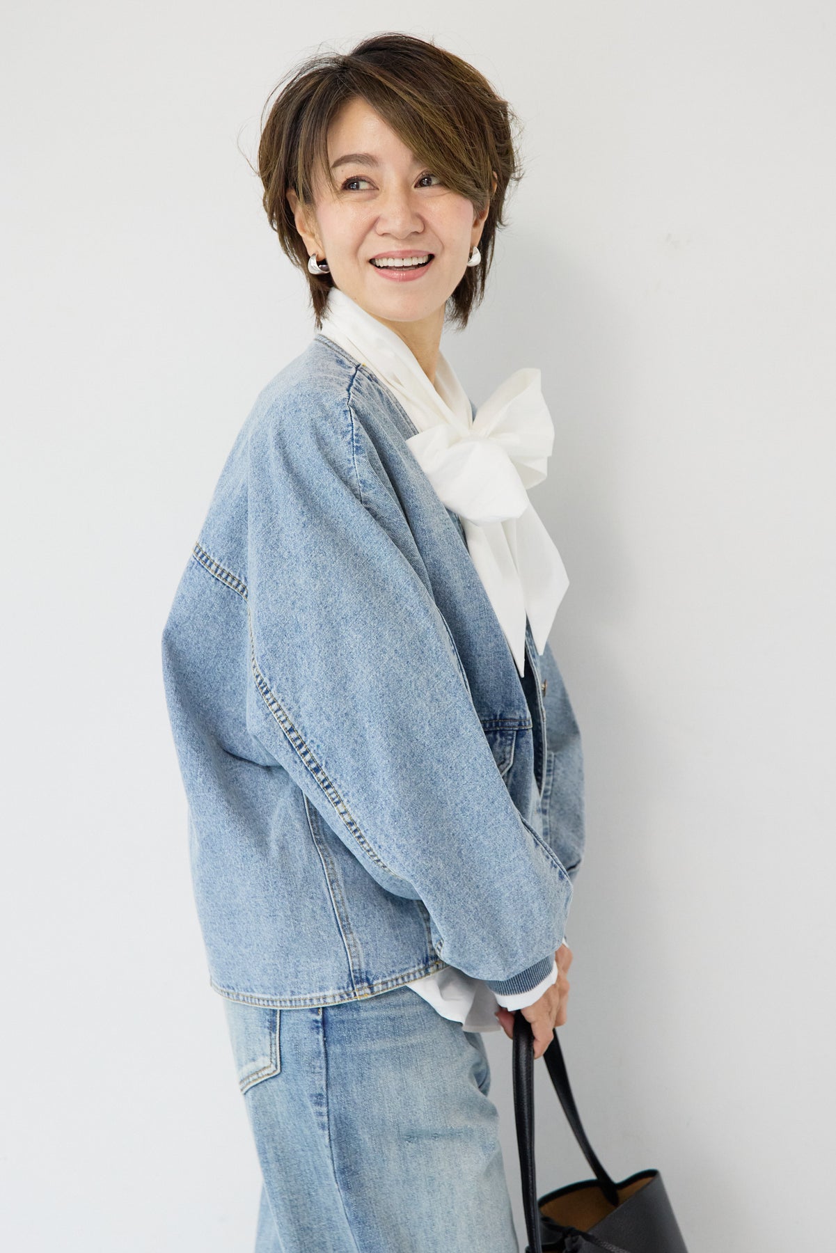 デニムのカジュアルさと、大人の抜け感を兼ね備えたVネックオーバーサイズデニムジャケット。首元をすっきり見せるVネックデザインが、従来のGジャンよりも女性らしく、洗練された印象を演出します。全体はゆったりとしたオーバーサイズシルエットで、肩や身幅に程よい余裕を持たせたリラックス感のある着心地。インナーにブラウスやニットを合わせてももたつかず、季節の変わり目からロングシーズン活躍します。袖口はリブ切替仕様で、たくし上げてもずれにくく、さりげないアクセントに。フロントのフラップポケットやステッチワーク、程よい色落ち加工が、デニムならではの表情を引き立てます。