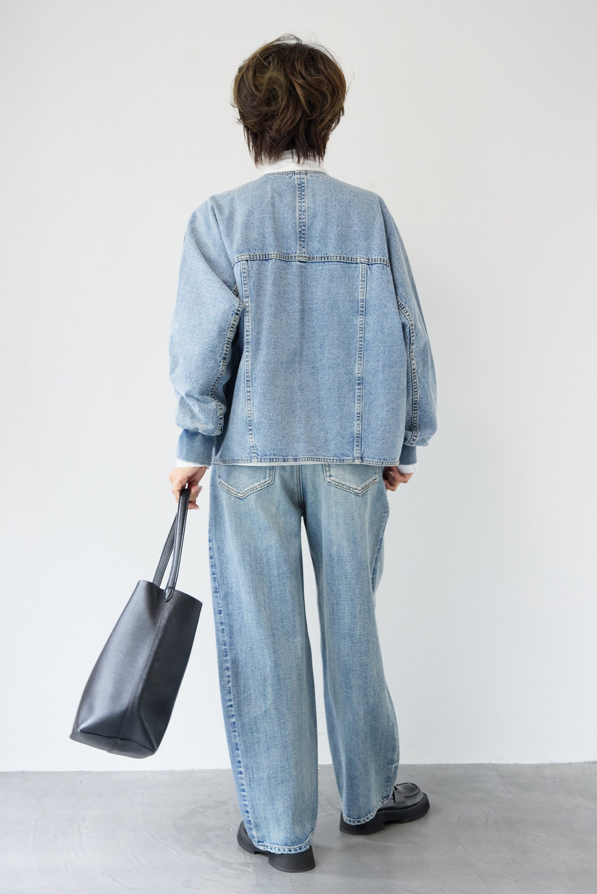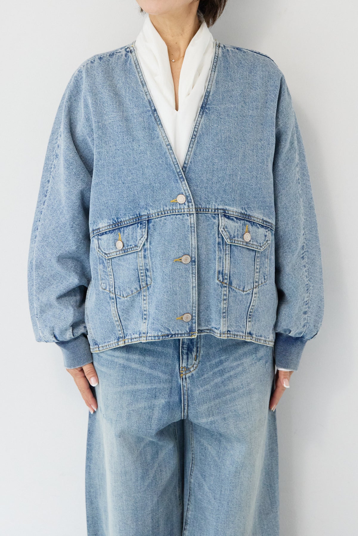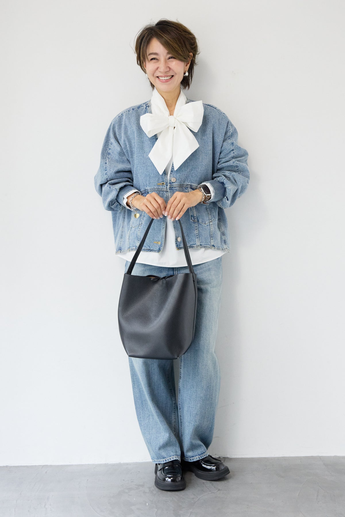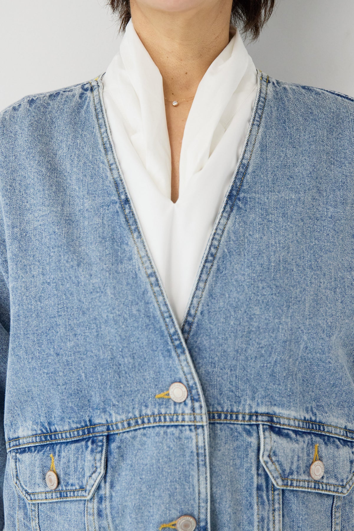 デニムのカジュアルさと、大人の抜け感を兼ね備えたVネックオーバーサイズデニムジャケット。首元をすっきり見せるVネックデザインが、従来のGジャンよりも女性らしく、洗練された印象を演出します。全体はゆったりとしたオーバーサイズシルエットで、肩や身幅に程よい余裕を持たせたリラックス感のある着心地。インナーにブラウスやニットを合わせてももたつかず、季節の変わり目からロングシーズン活躍します。袖口はリブ切替仕様で、たくし上げてもずれにくく、さりげないアクセントに。フロントのフラップポケットやステッチワーク、程よい色落ち加工が、デニムならではの表情を引き立てます。