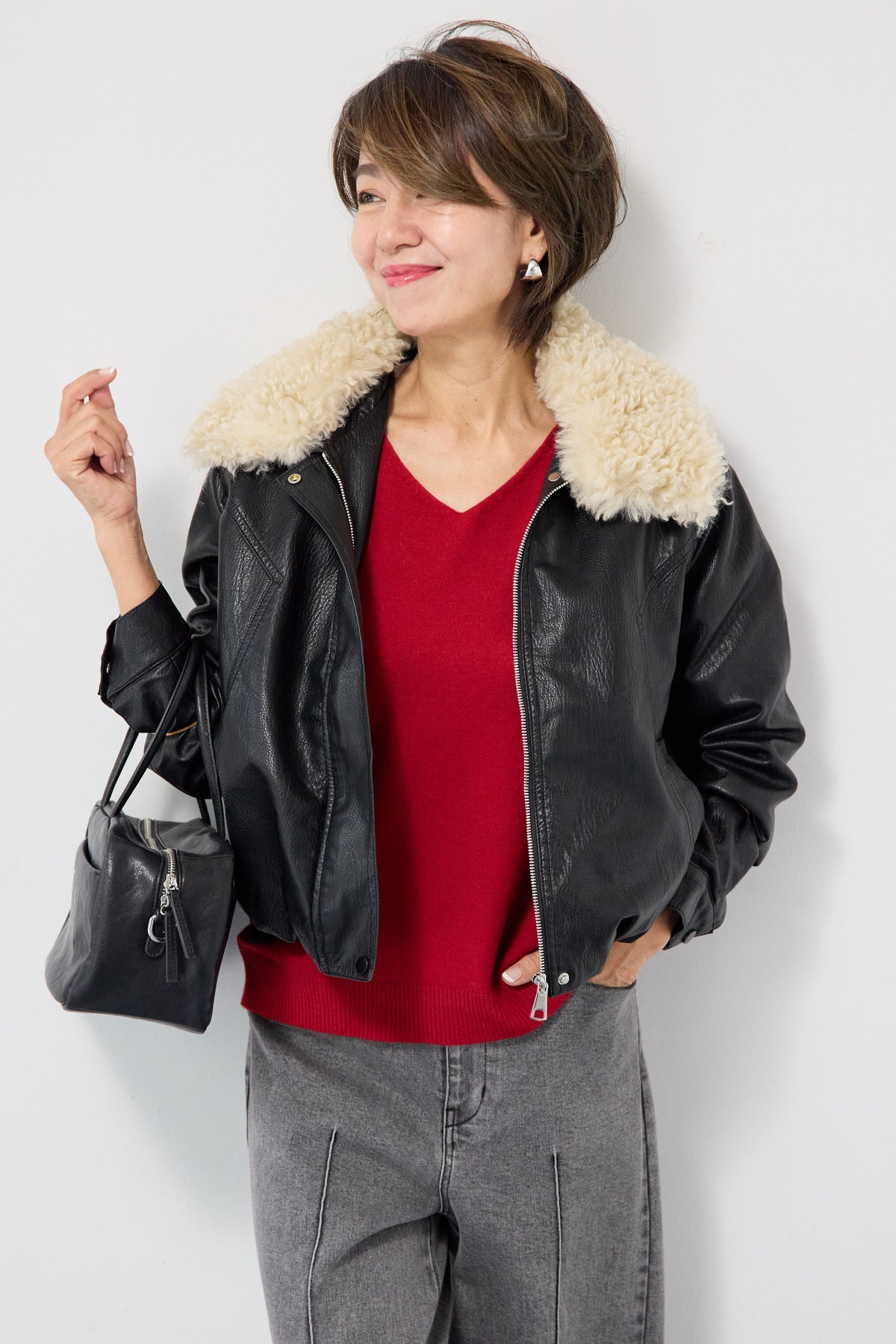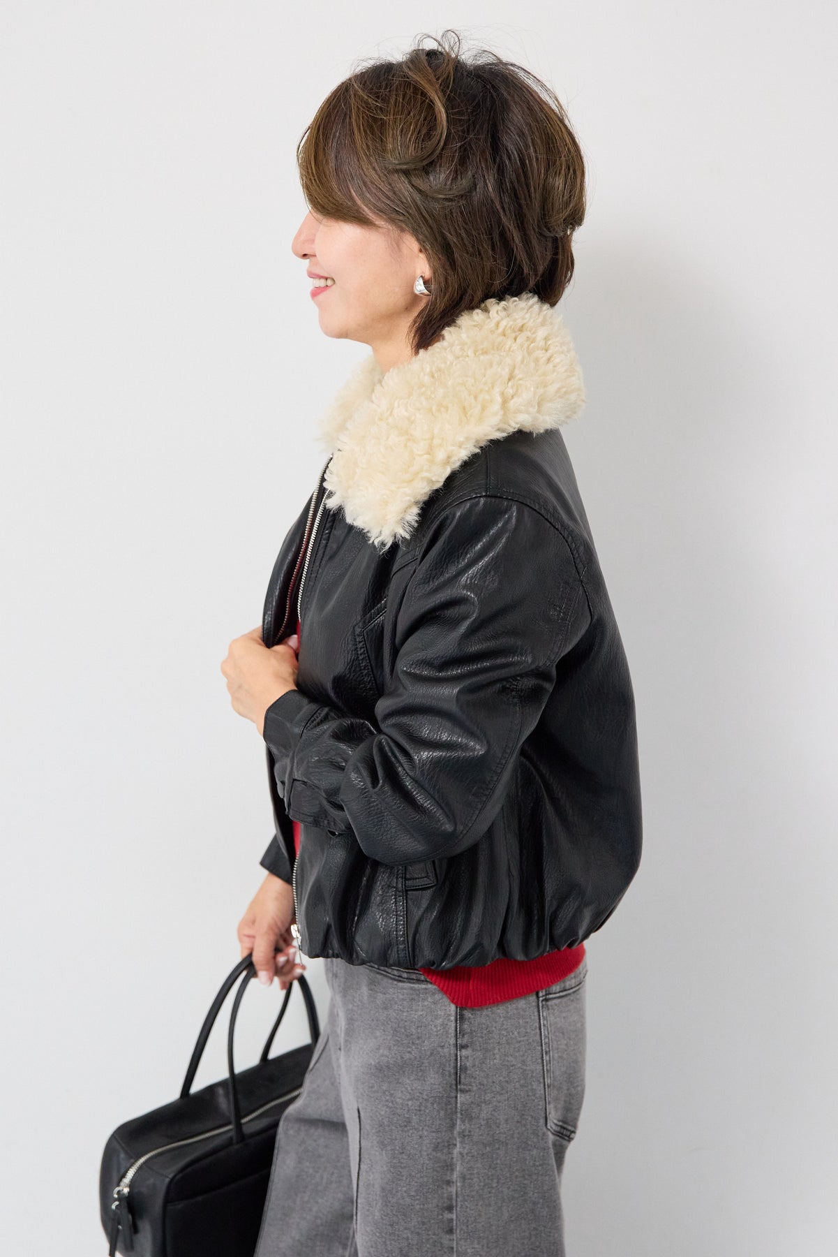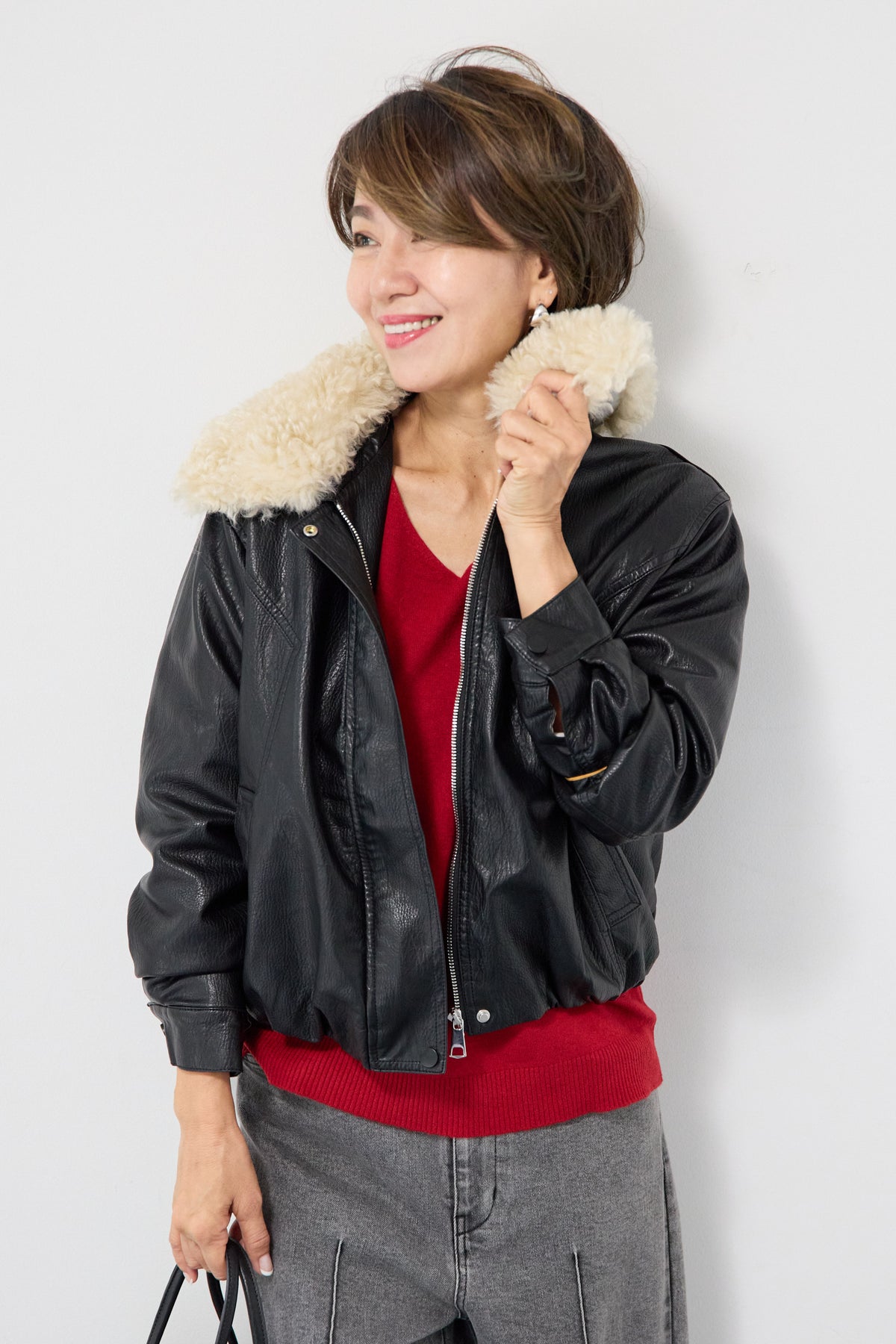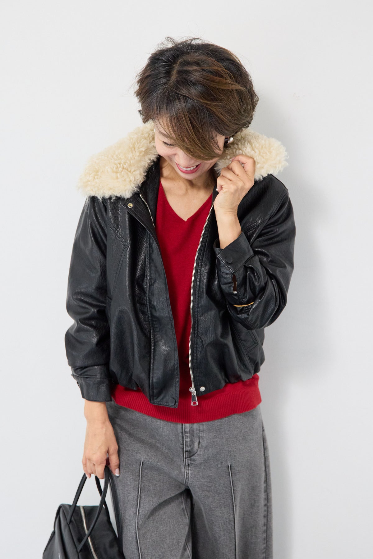 存在感のあるフェイクムートンカラーが、冬の着こなしに上質なアクセントを添えるレザーブルゾン。ふわふわのボリュームカラーデザインは顔まわりを華やかに見せ、取り外し可能な仕様で気分やコーデに合わせてアレンジができます。ボディ部分はしなやかなフェイクレザーを使用し、ほどよいツヤ感と表情のあるシボ加工で大人っぽく仕上げています。裏地には柔らかなボアを全面に施しており、抜群の暖かさと着心地の良さを兼ね備えた一着です。裾はさりげなく絞りを入れたシルエットで、着るだけでこなれたショート丈バランスを実現。デニムからワイドパンツ、スカートまで幅広いアイテムと相性抜群です。