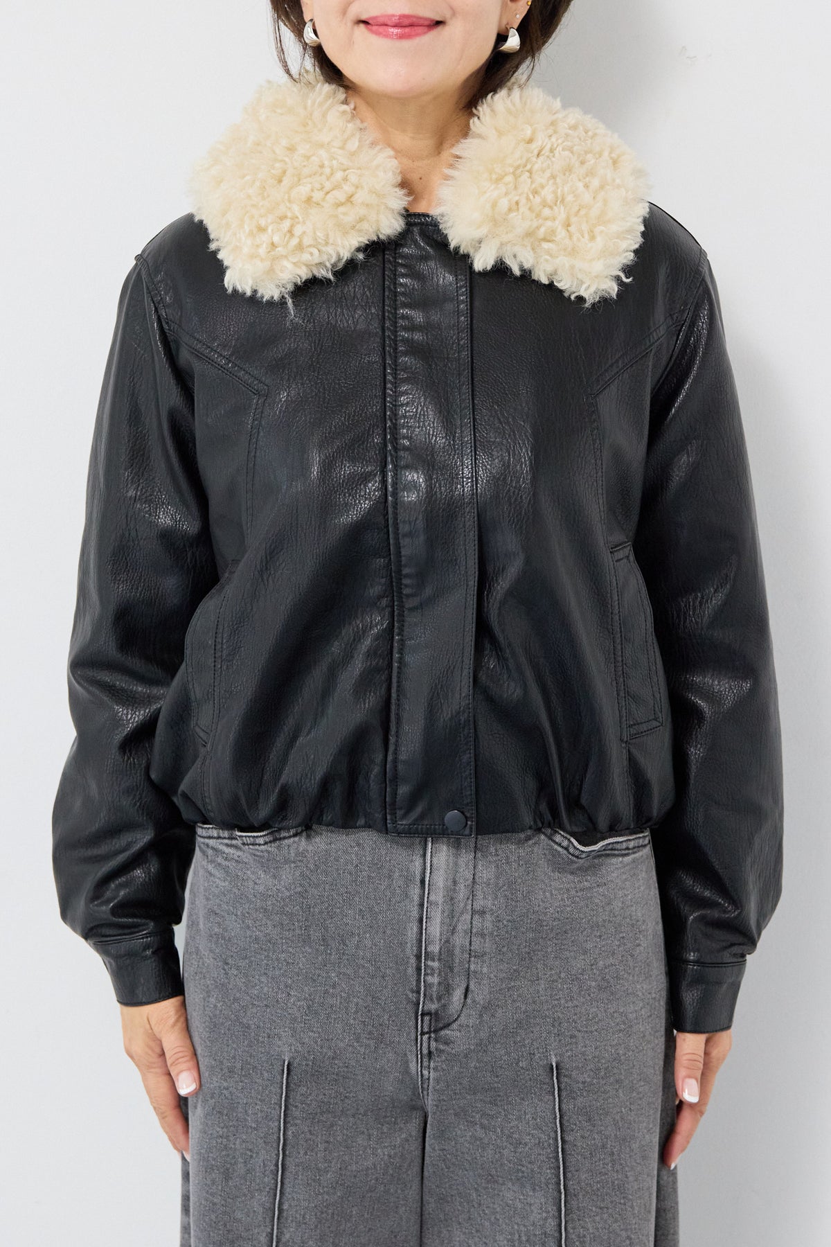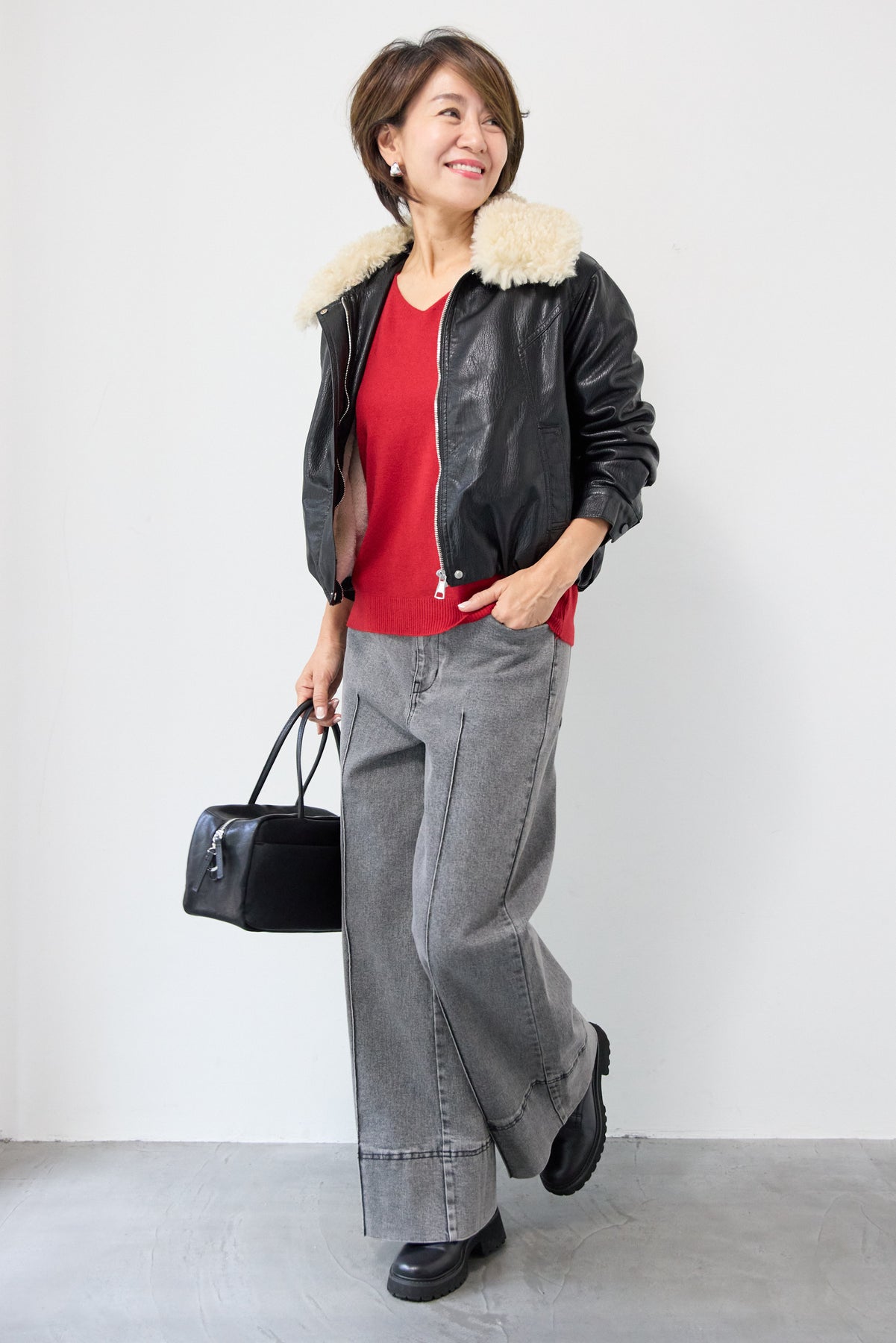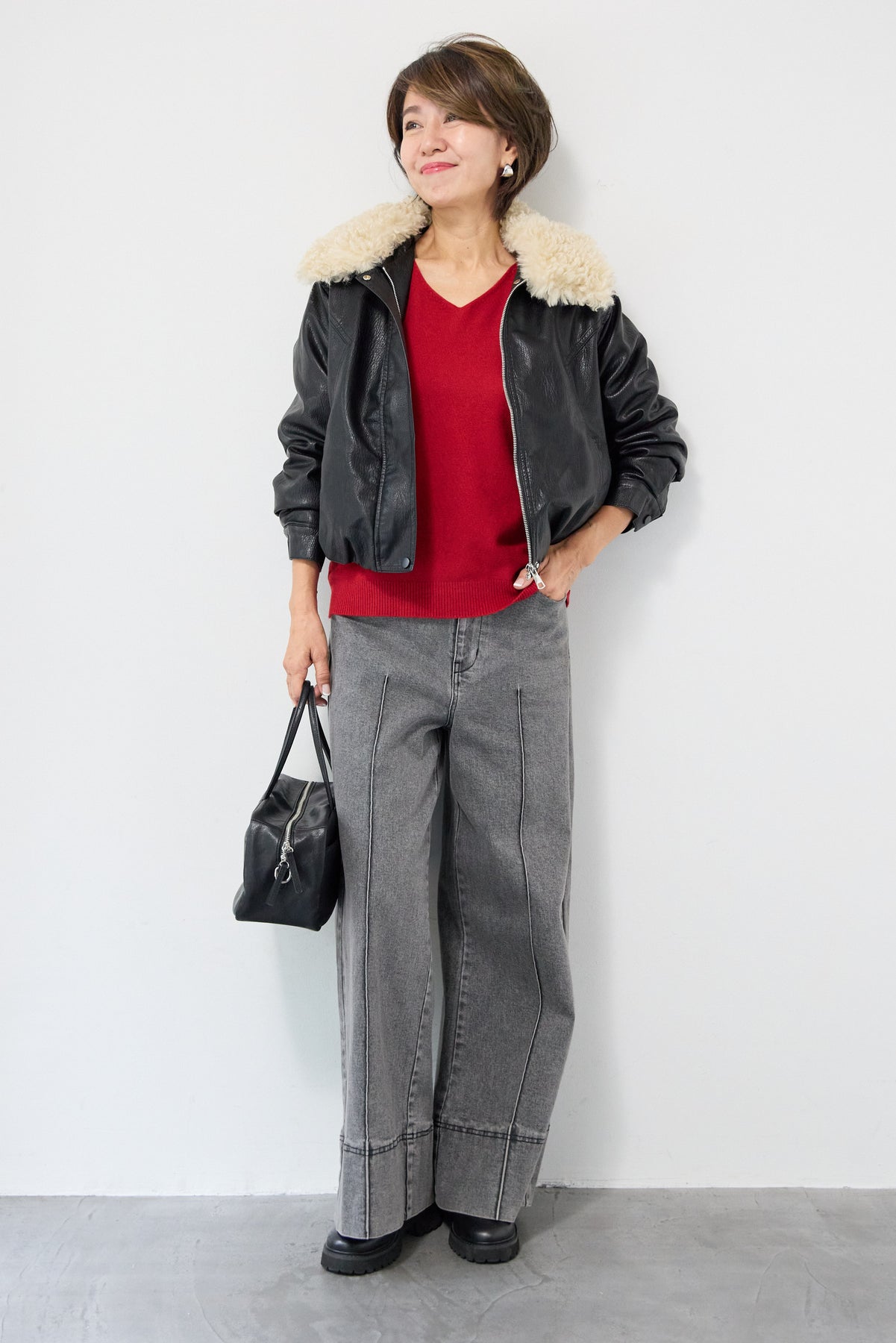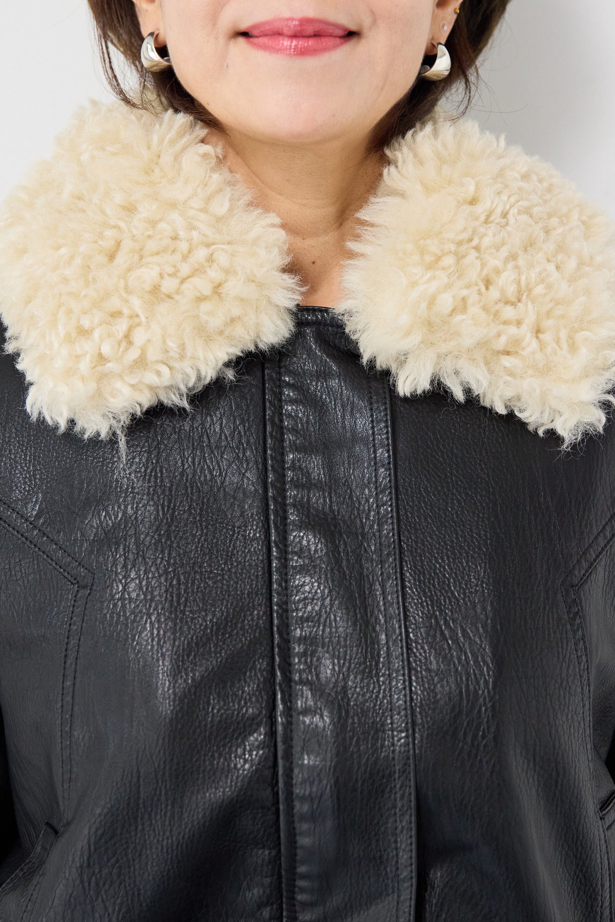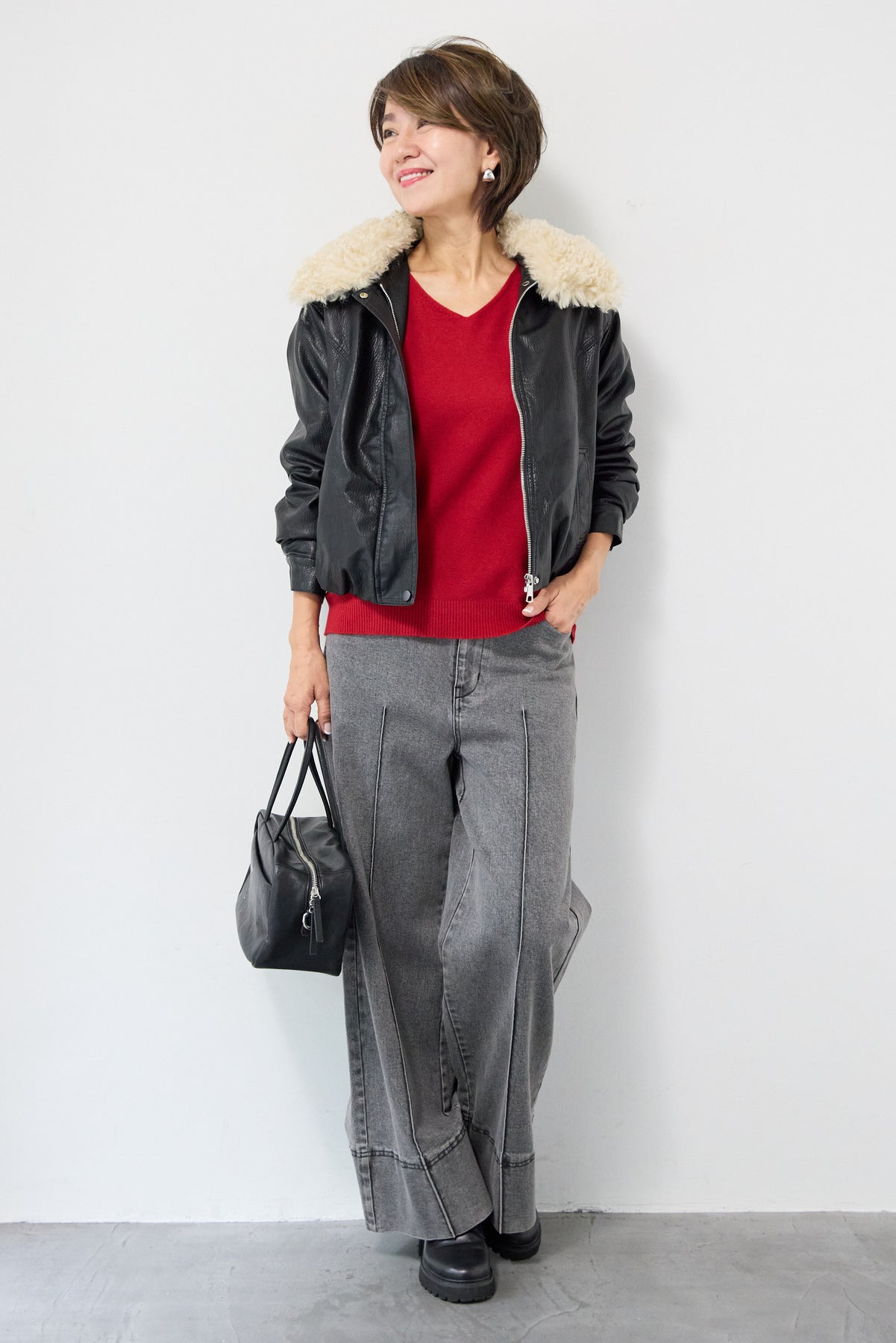 存在感のあるフェイクムートンカラーが、冬の着こなしに上質なアクセントを添えるレザーブルゾン。ふわふわのボリュームカラーデザインは顔まわりを華やかに見せ、取り外し可能な仕様で気分やコーデに合わせてアレンジができます。ボディ部分はしなやかなフェイクレザーを使用し、ほどよいツヤ感と表情のあるシボ加工で大人っぽく仕上げています。裏地には柔らかなボアを全面に施しており、抜群の暖かさと着心地の良さを兼ね備えた一着です。裾はさりげなく絞りを入れたシルエットで、着るだけでこなれたショート丈バランスを実現。デニムからワイドパンツ、スカートまで幅広いアイテムと相性抜群です。