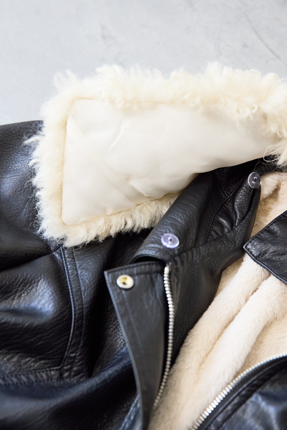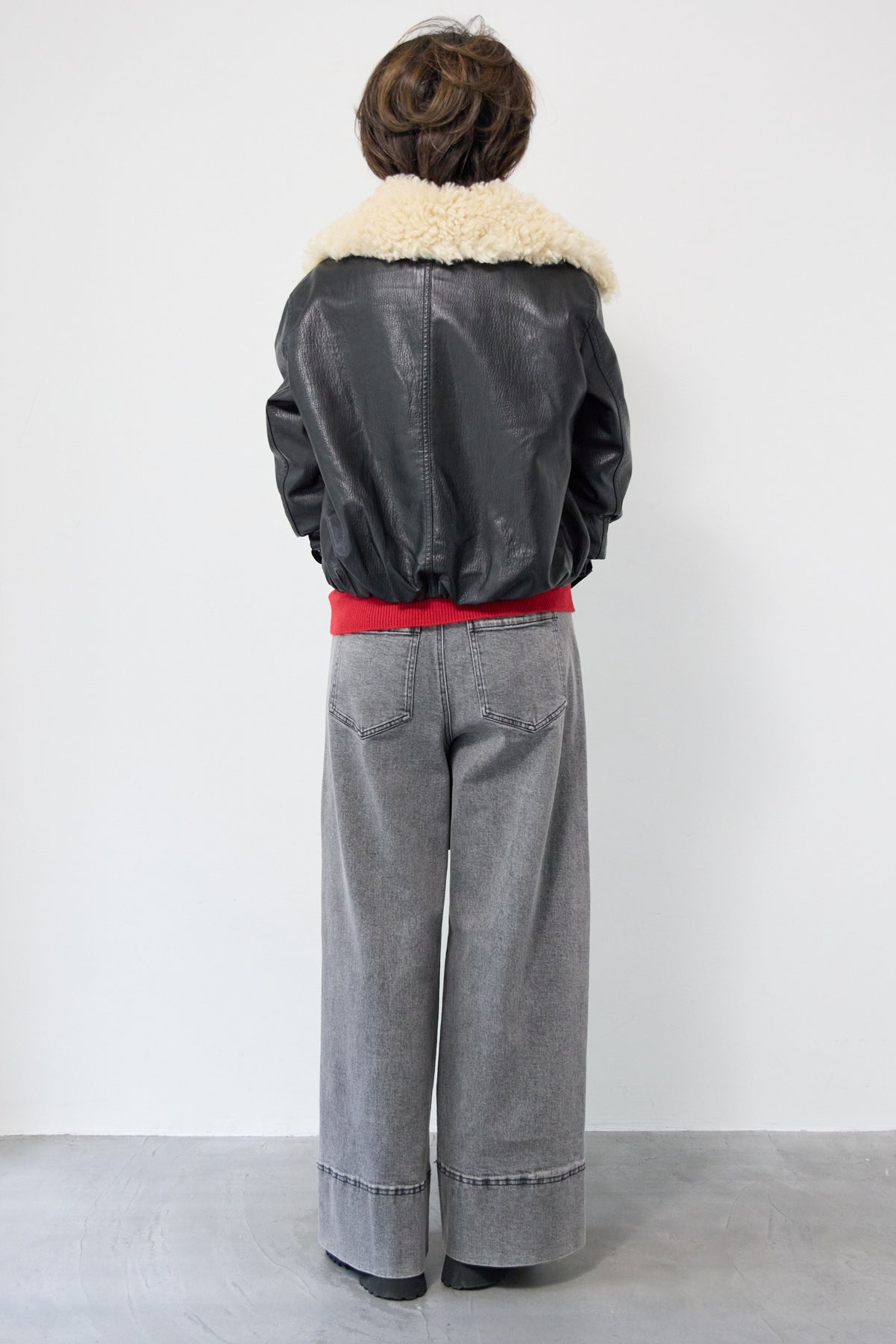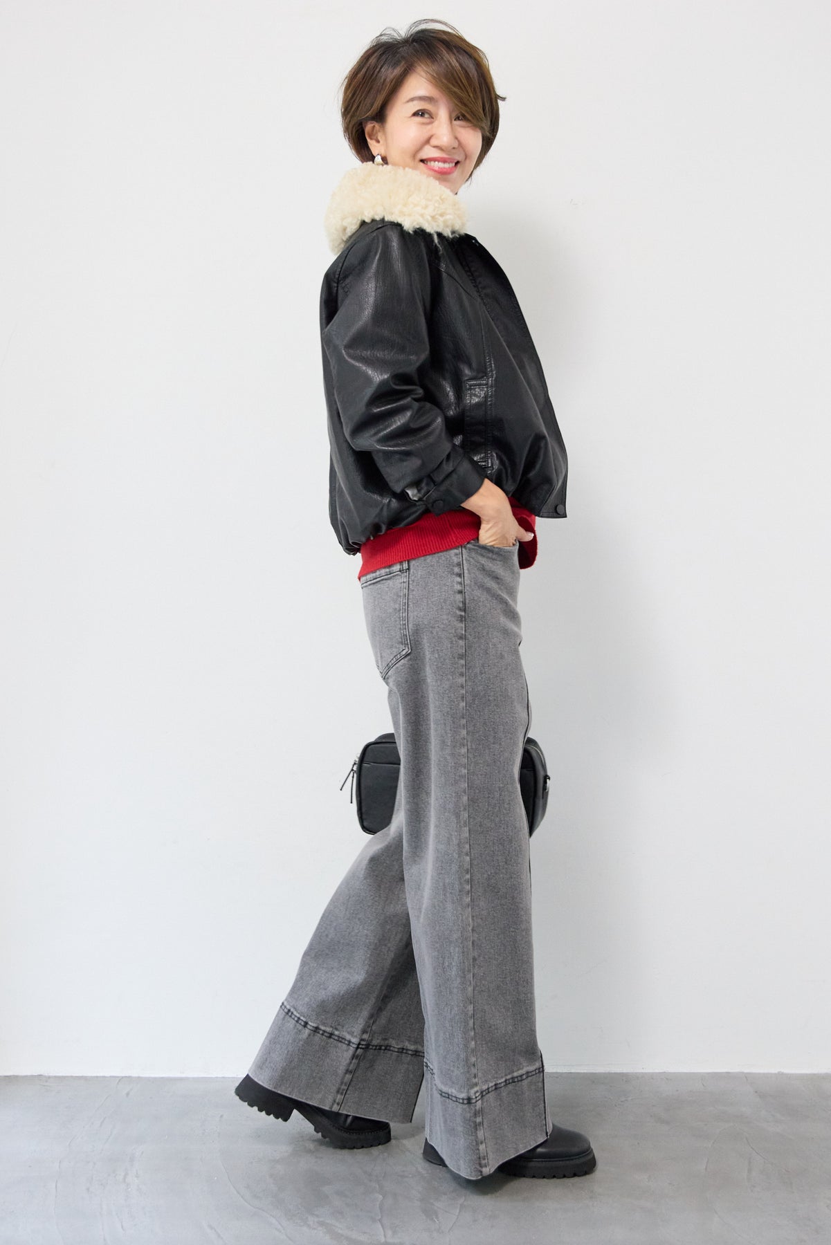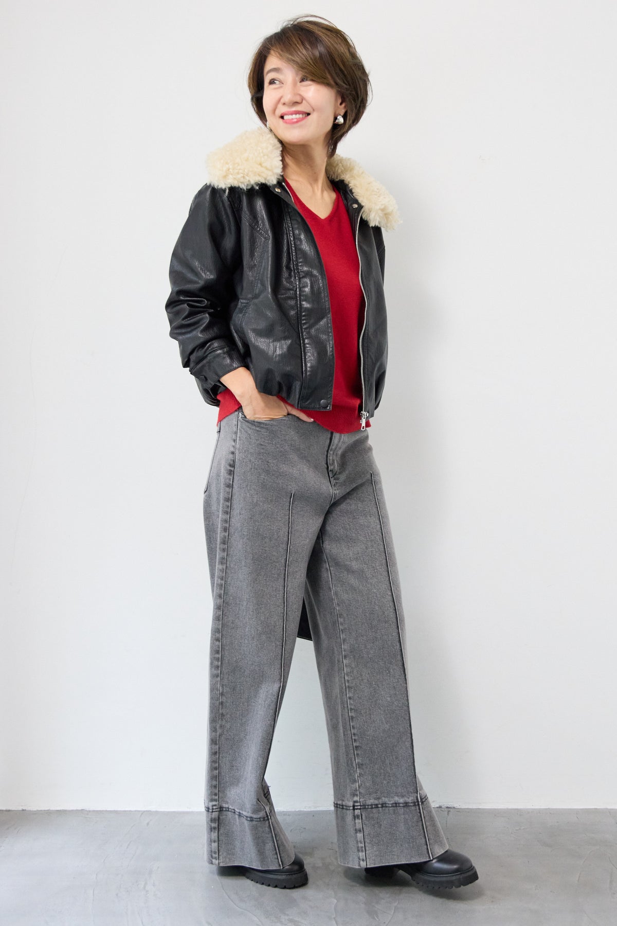 存在感のあるフェイクムートンカラーが、冬の着こなしに上質なアクセントを添えるレザーブルゾン。ふわふわのボリュームカラーデザインは顔まわりを華やかに見せ、取り外し可能な仕様で気分やコーデに合わせてアレンジができます。ボディ部分はしなやかなフェイクレザーを使用し、ほどよいツヤ感と表情のあるシボ加工で大人っぽく仕上げています。裏地には柔らかなボアを全面に施しており、抜群の暖かさと着心地の良さを兼ね備えた一着です。裾はさりげなく絞りを入れたシルエットで、着るだけでこなれたショート丈バランスを実現。デニムからワイドパンツ、スカートまで幅広いアイテムと相性抜群です。