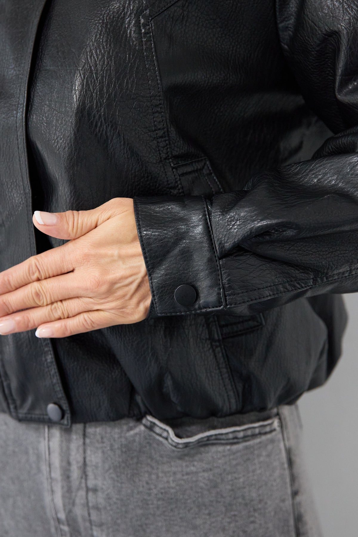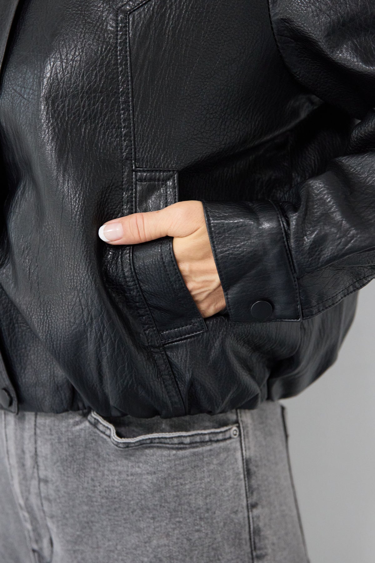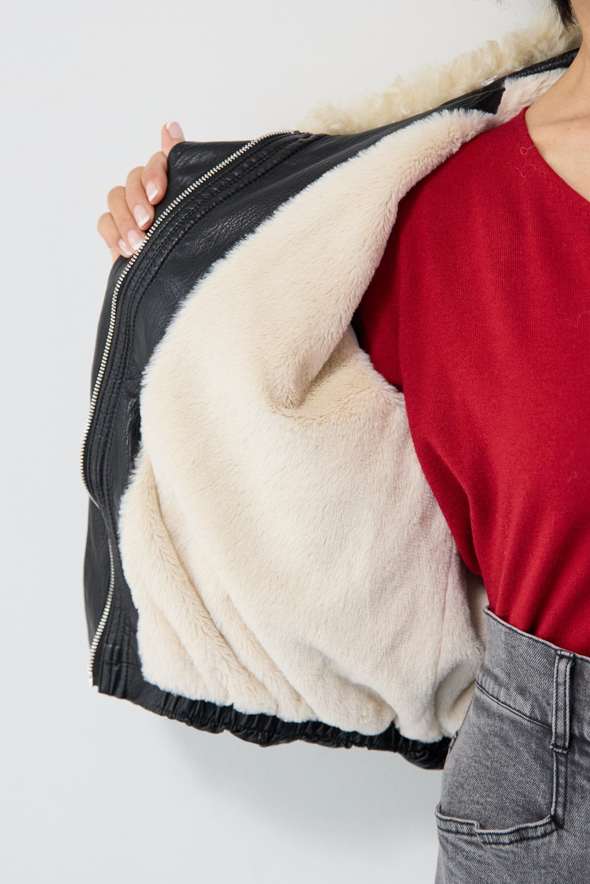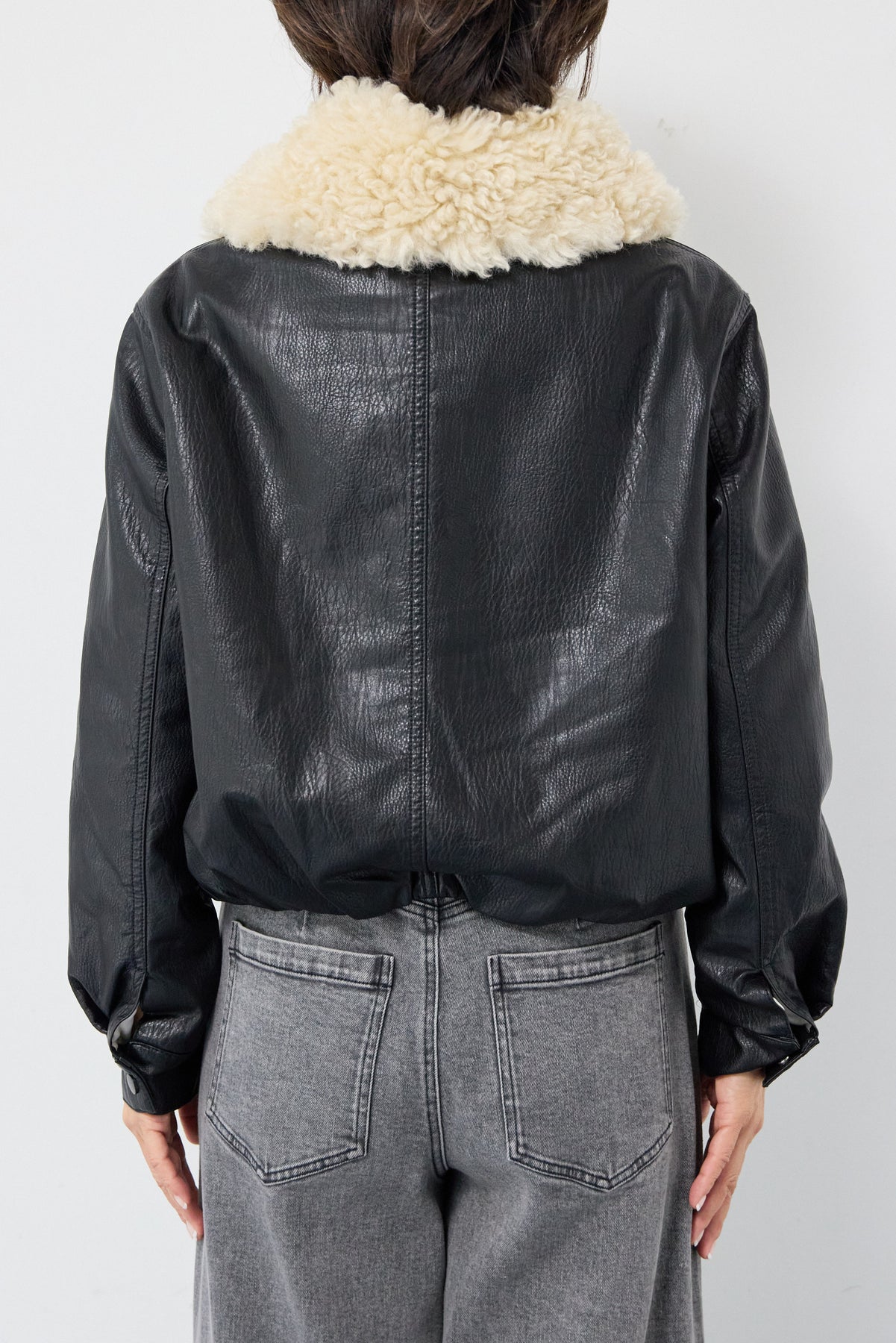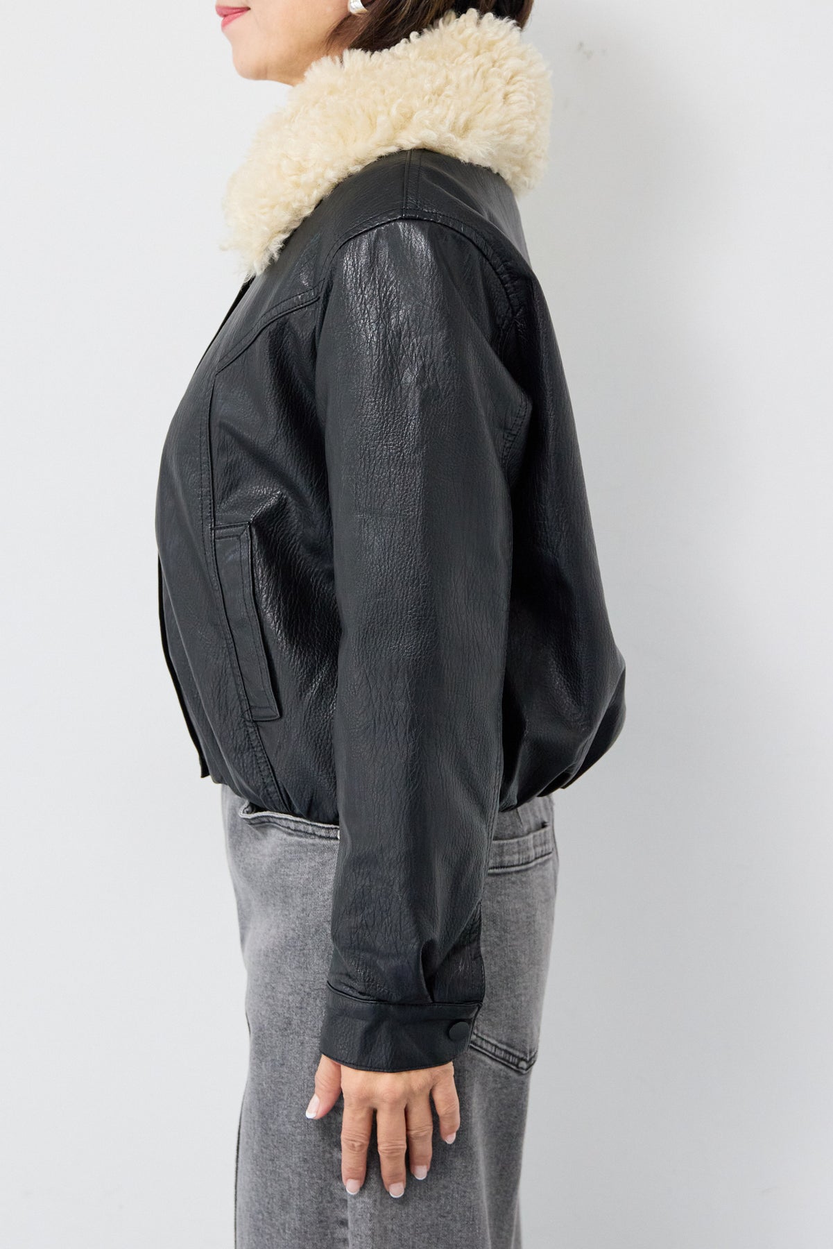 存在感のあるフェイクムートンカラーが、冬の着こなしに上質なアクセントを添えるレザーブルゾン。ふわふわのボリュームカラーデザインは顔まわりを華やかに見せ、取り外し可能な仕様で気分やコーデに合わせてアレンジができます。ボディ部分はしなやかなフェイクレザーを使用し、ほどよいツヤ感と表情のあるシボ加工で大人っぽく仕上げています。裏地には柔らかなボアを全面に施しており、抜群の暖かさと着心地の良さを兼ね備えた一着です。裾はさりげなく絞りを入れたシルエットで、着るだけでこなれたショート丈バランスを実現。デニムからワイドパンツ、スカートまで幅広いアイテムと相性抜群です。