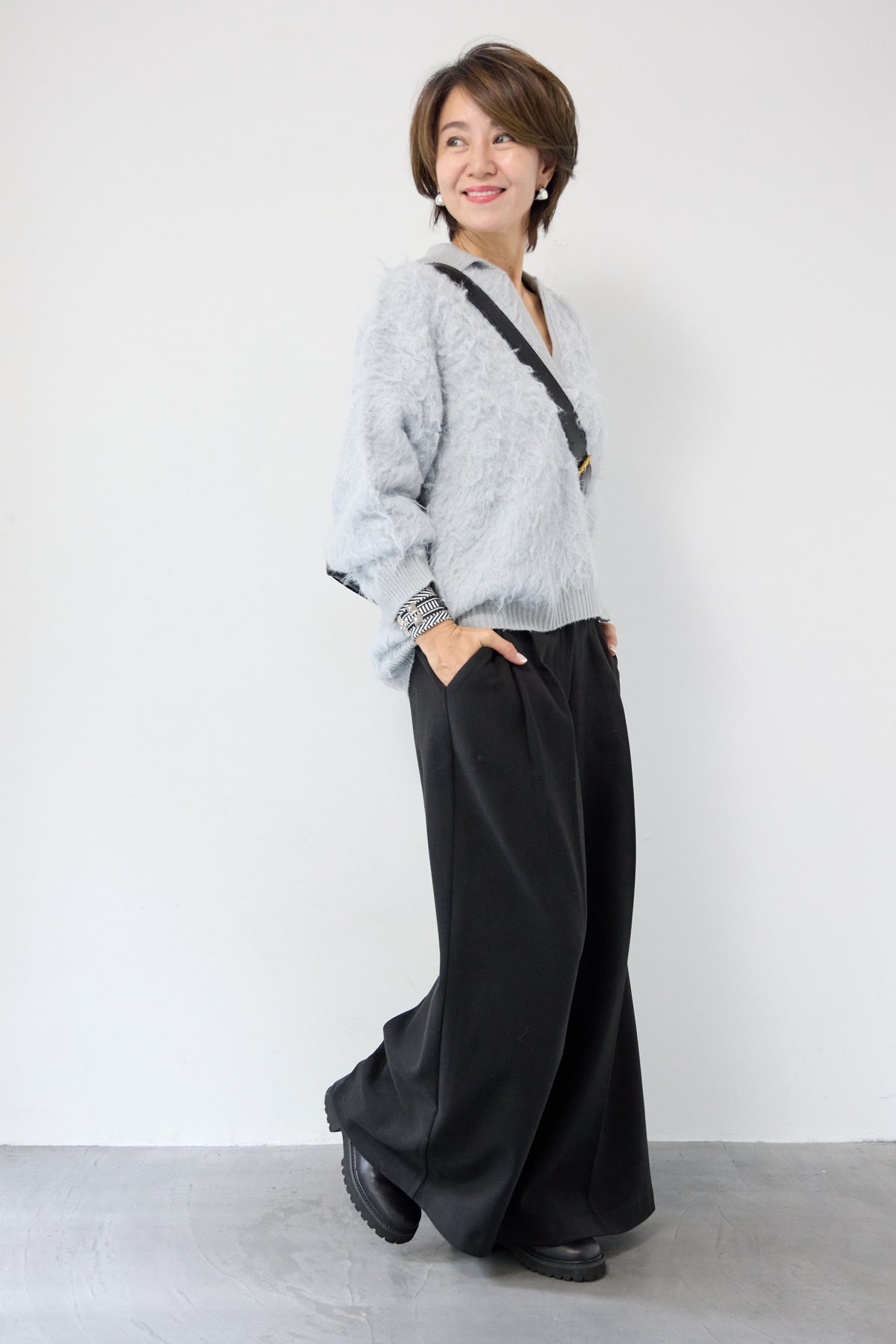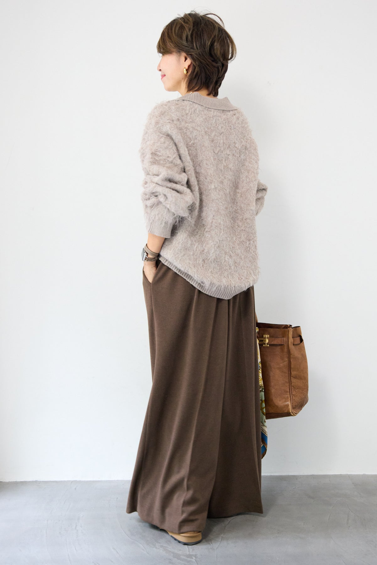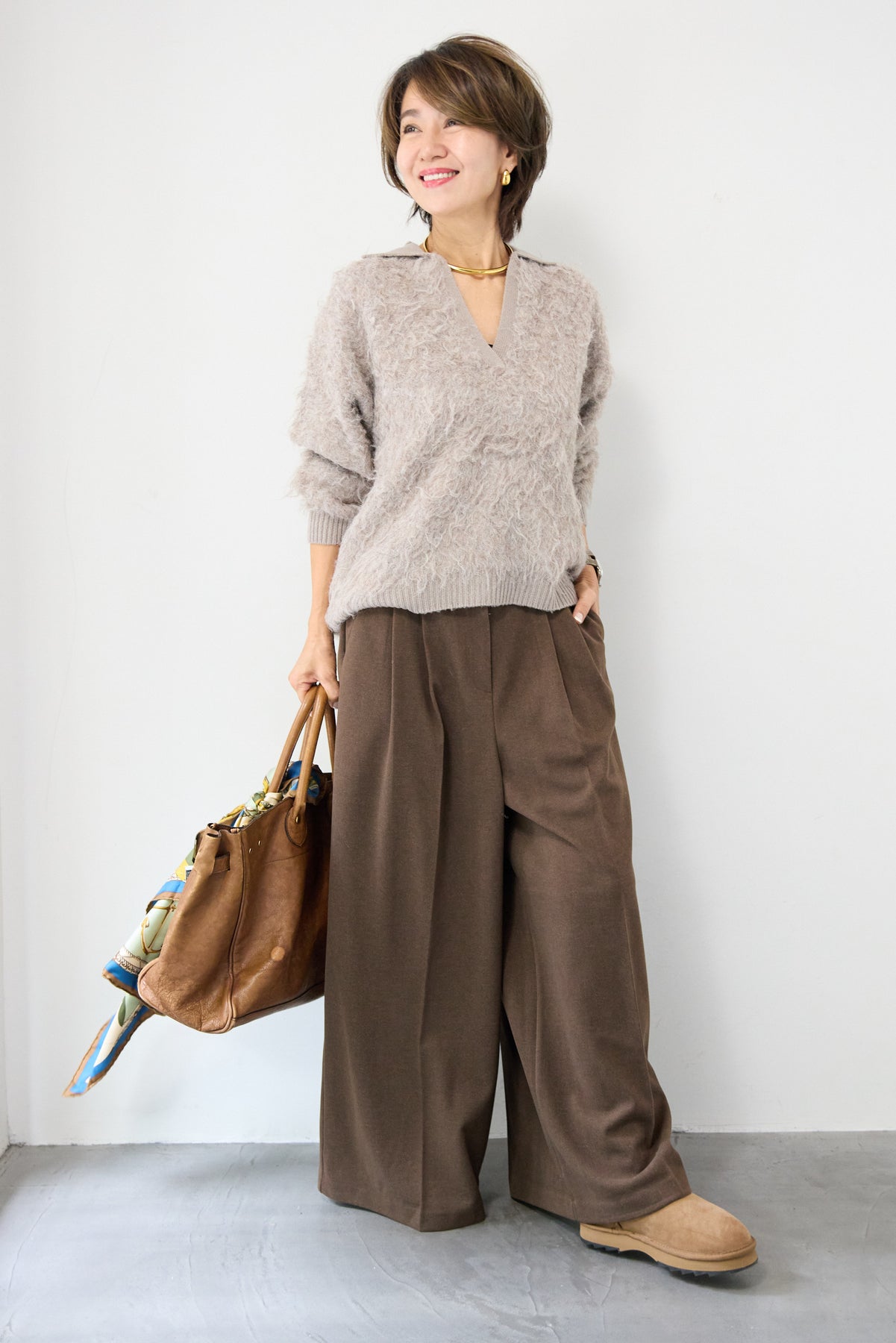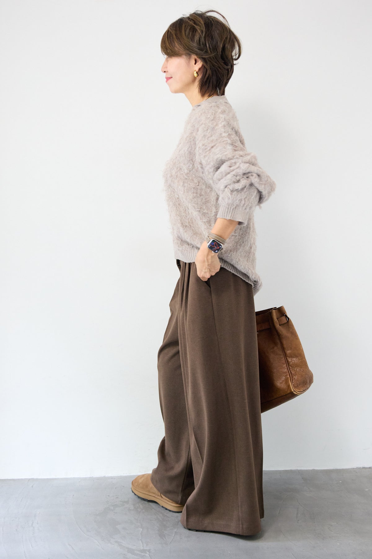 ウール見えする柔らかなメルトン素材で仕立てた、大人のためのワイドタックパンツ。フロントの深めタックが生み出す立体的なシルエットは、きちんと感と抜け感を両立。ゆったりとした落ち感がありながらも、縦のラインを美しく演出してくれる一本です。バックウエストはゴム仕様で、長時間の着用もストレスフリー。サイドポケット付きで実用性も◎。カジュアルなニットと合わせてリラックスした大人スタイルに、シャツやジャケットと合わせて洗練されたモードな印象にも。