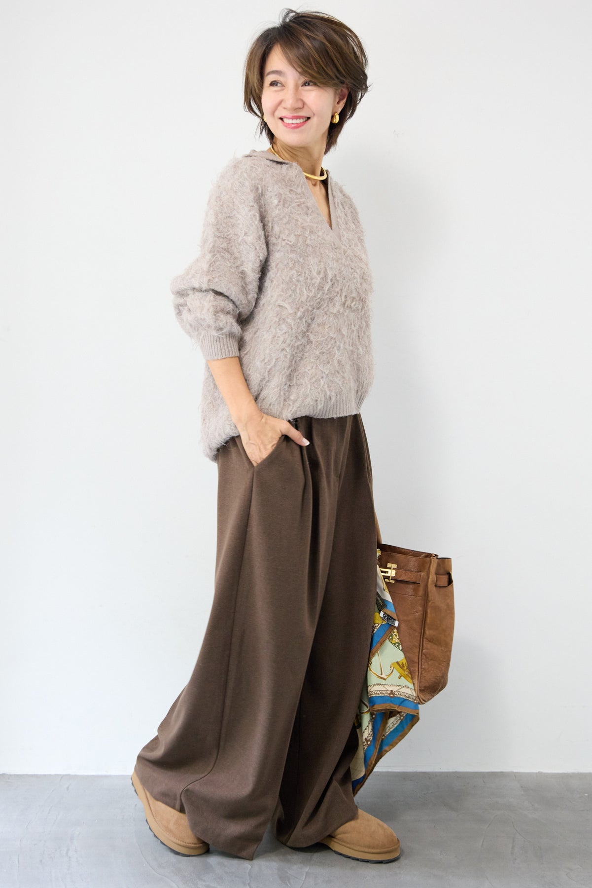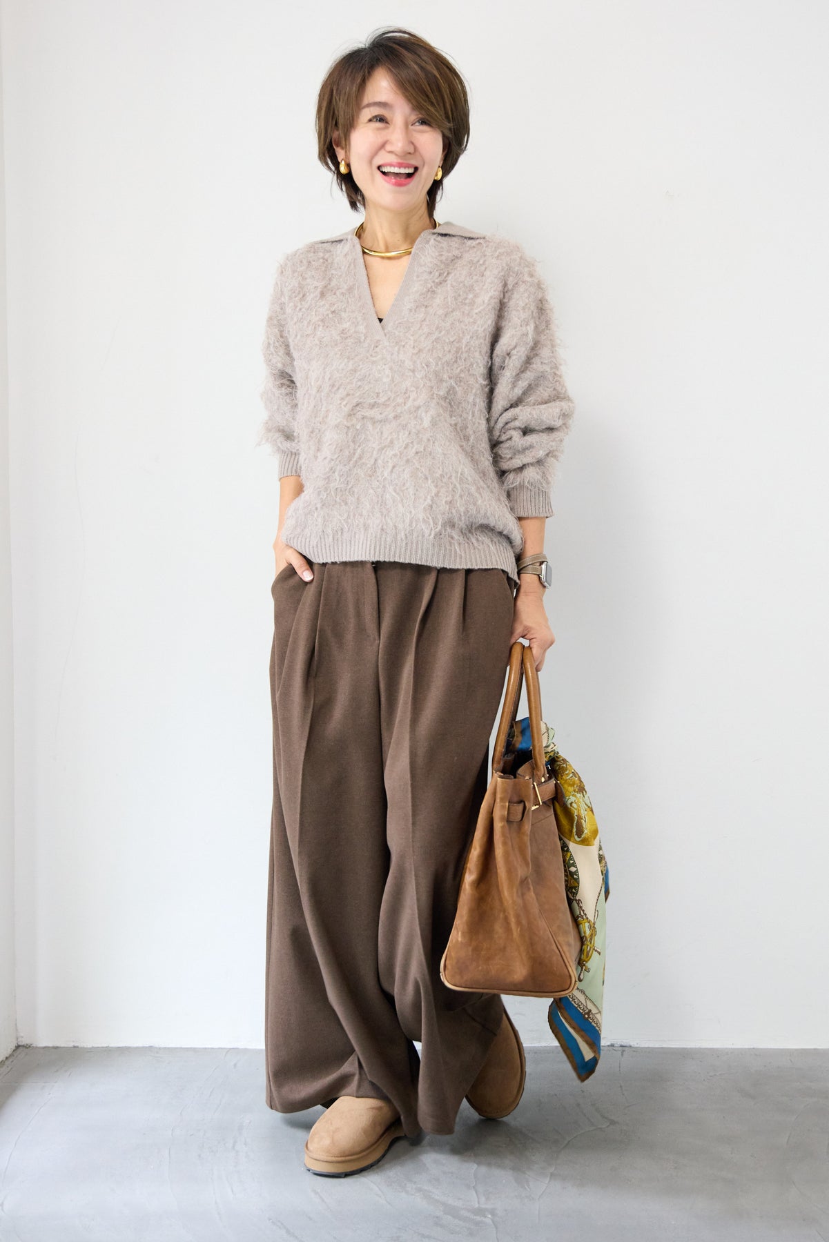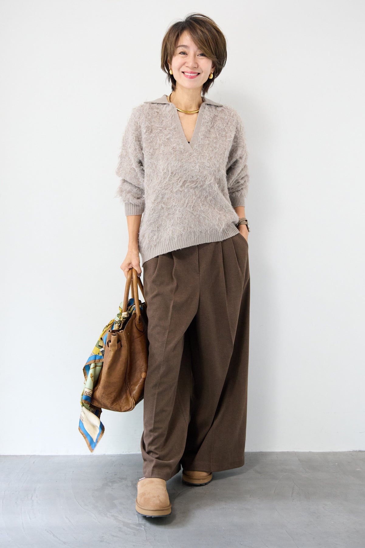 ウール見えする柔らかなメルトン素材で仕立てた、大人のためのワイドタックパンツ。フロントの深めタックが生み出す立体的なシルエットは、きちんと感と抜け感を両立。ゆったりとした落ち感がありながらも、縦のラインを美しく演出してくれる一本です。バックウエストはゴム仕様で、長時間の着用もストレスフリー。サイドポケット付きで実用性も◎。カジュアルなニットと合わせてリラックスした大人スタイルに、シャツやジャケットと合わせて洗練されたモードな印象にも。