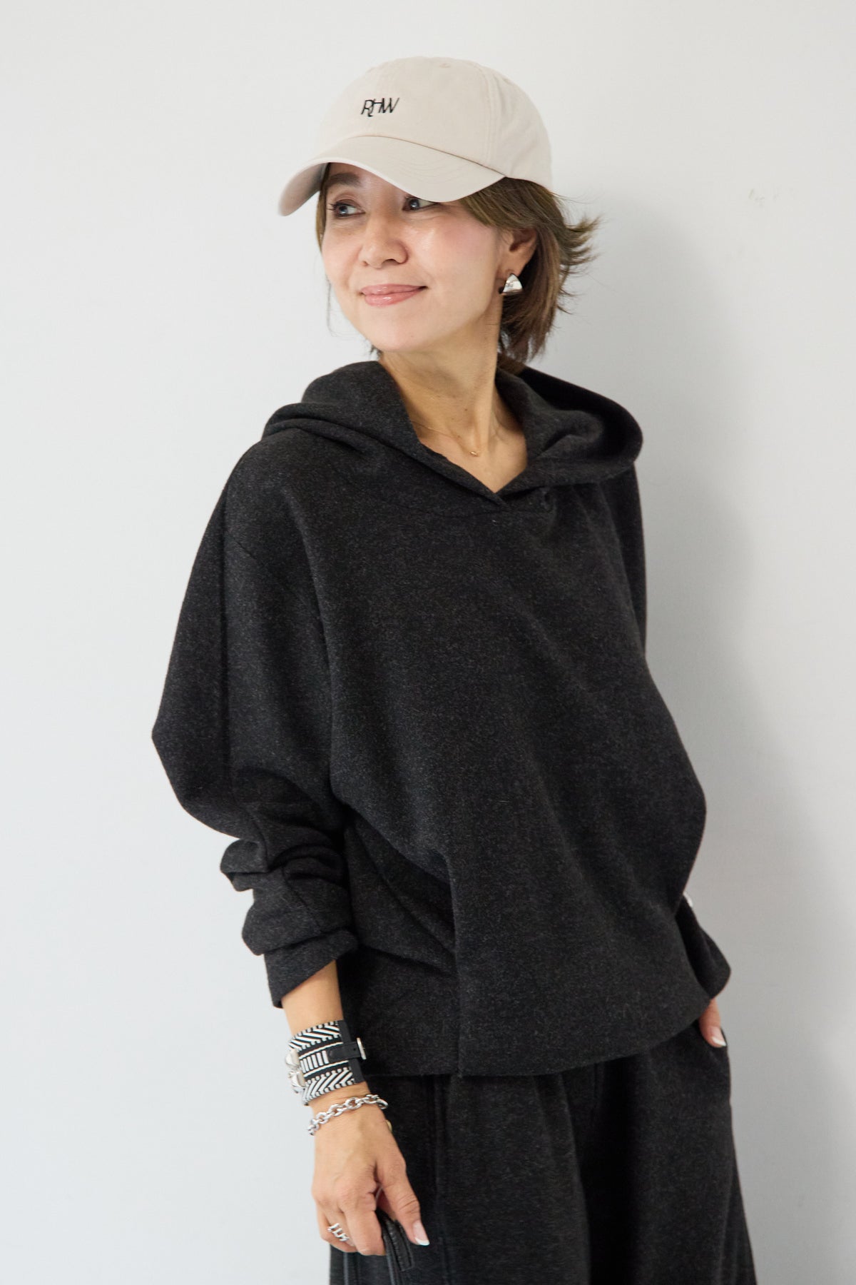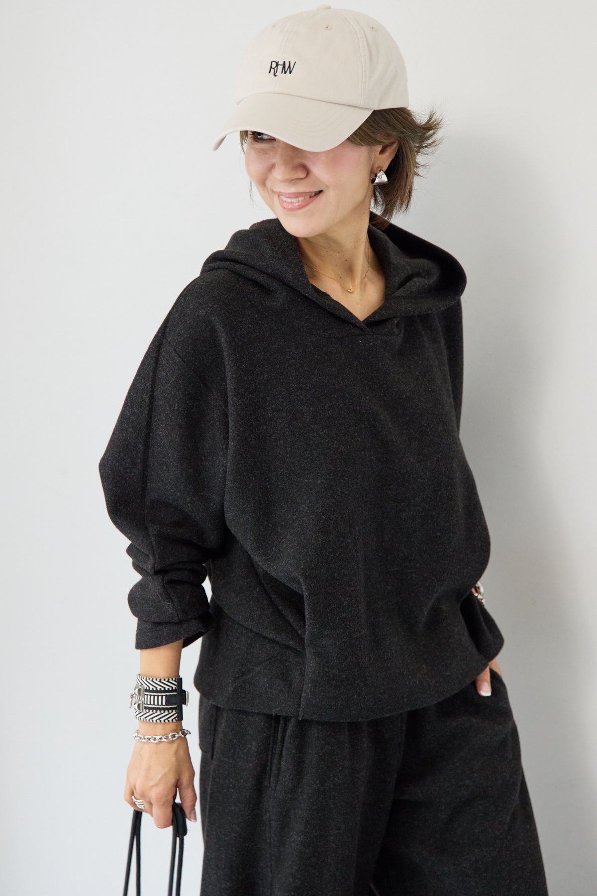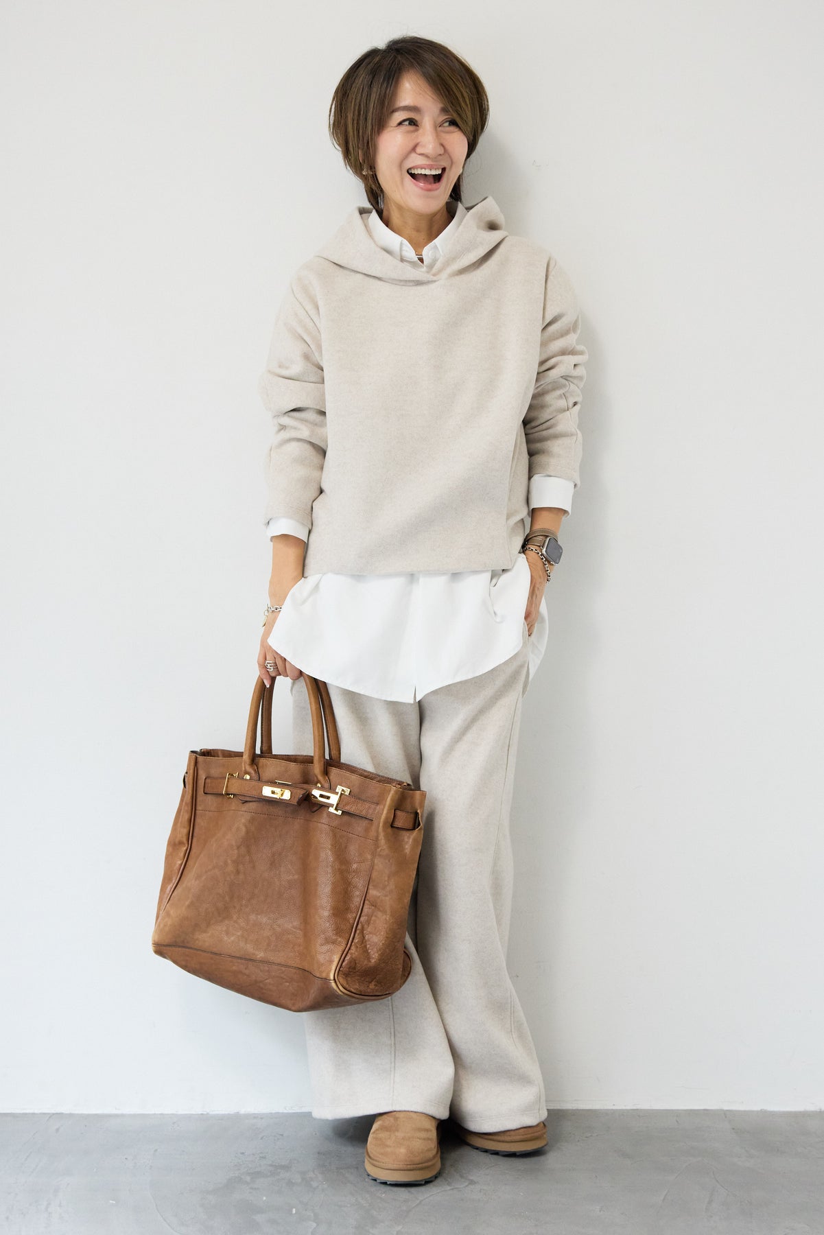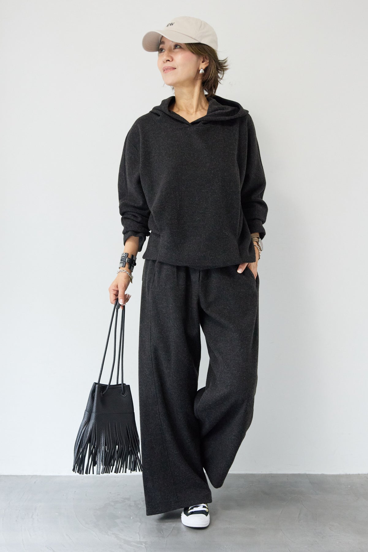 上品さとリラックス感を兼ね備えた、大人のためのフーディトップス。起毛感のあるメルトン素材を使用し、柔らかく暖かな着心地が魅力です。カジュアルな印象のフーディデザインも、素材感と計算されたシルエットで洗練された雰囲気に仕上げています。バックスタイルにはタックヘムデザインを施し、さりげない立体感と動きをプラス。ヒップラインを自然にカバーしつつ、前後で表情の異なるデザインがコーディネートのアクセントになります。程よくゆとりのあるシルエットで、パンツにもスカートにも好相性。同素材のボトムと合わせたセットアップスタイルはもちろん、単品使いでも着回し力の高い一枚です。