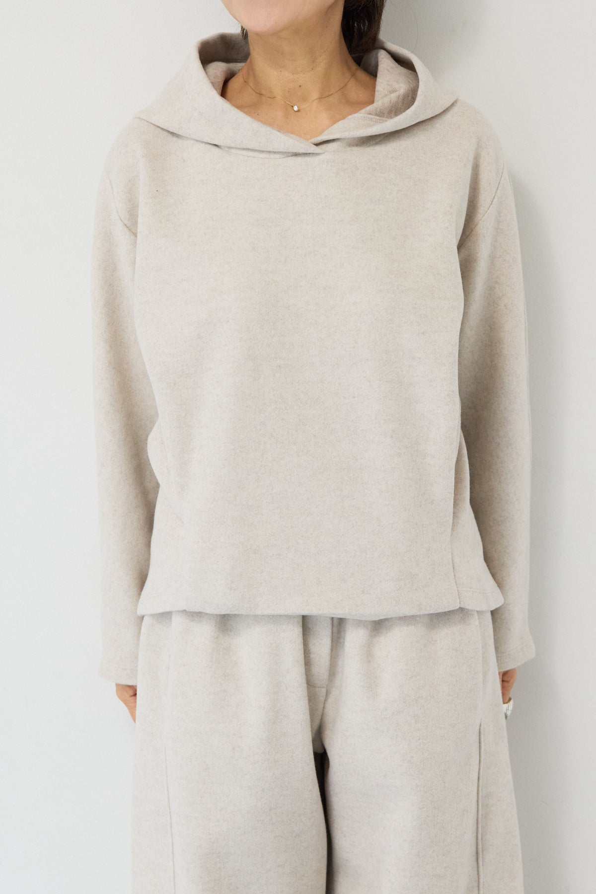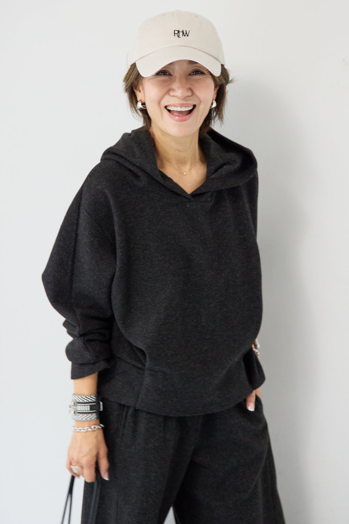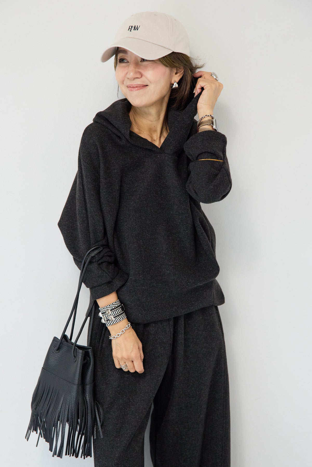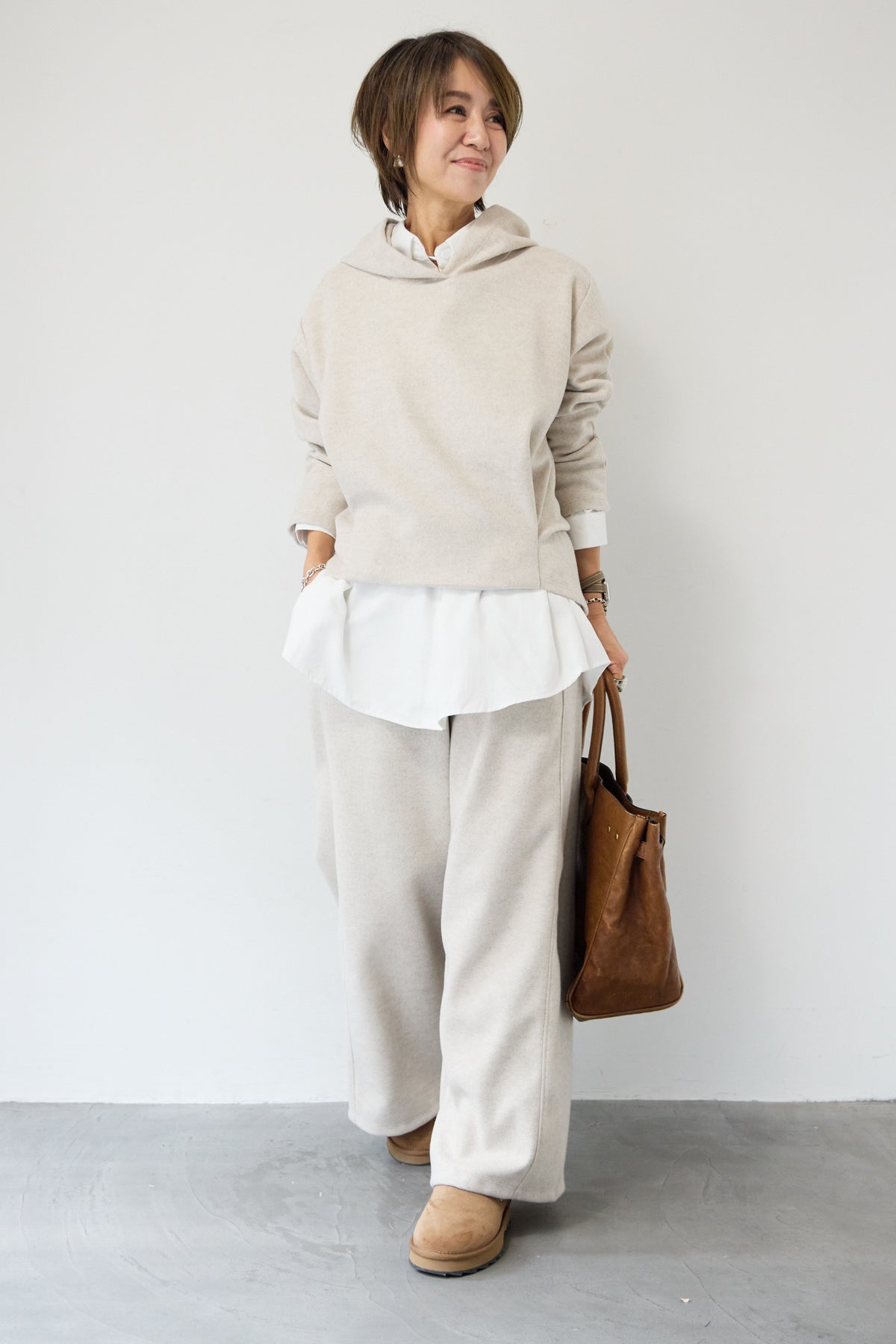 上品さとリラックス感を兼ね備えた、大人のためのフーディトップス。起毛感のあるメルトン素材を使用し、柔らかく暖かな着心地が魅力です。カジュアルな印象のフーディデザインも、素材感と計算されたシルエットで洗練された雰囲気に仕上げています。バックスタイルにはタックヘムデザインを施し、さりげない立体感と動きをプラス。ヒップラインを自然にカバーしつつ、前後で表情の異なるデザインがコーディネートのアクセントになります。程よくゆとりのあるシルエットで、パンツにもスカートにも好相性。同素材のボトムと合わせたセットアップスタイルはもちろん、単品使いでも着回し力の高い一枚です。