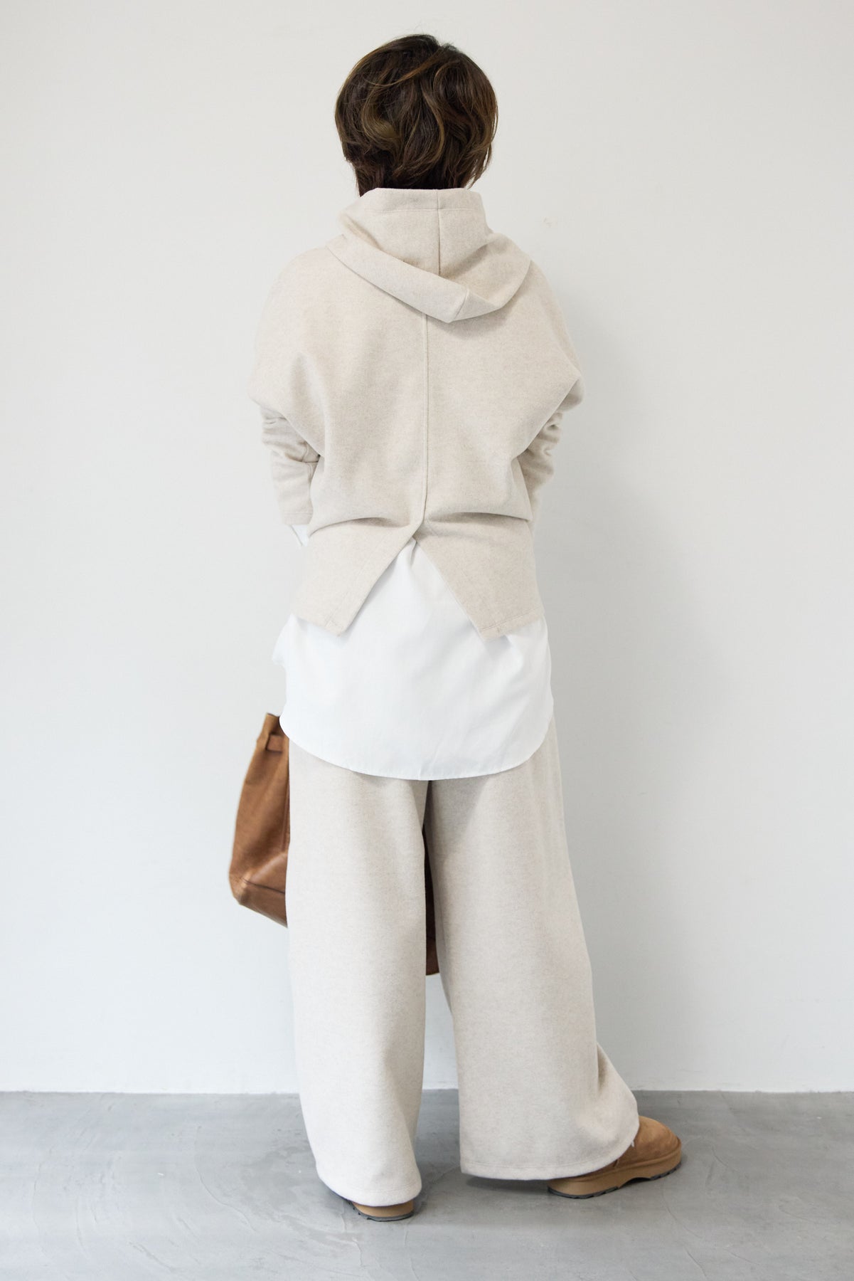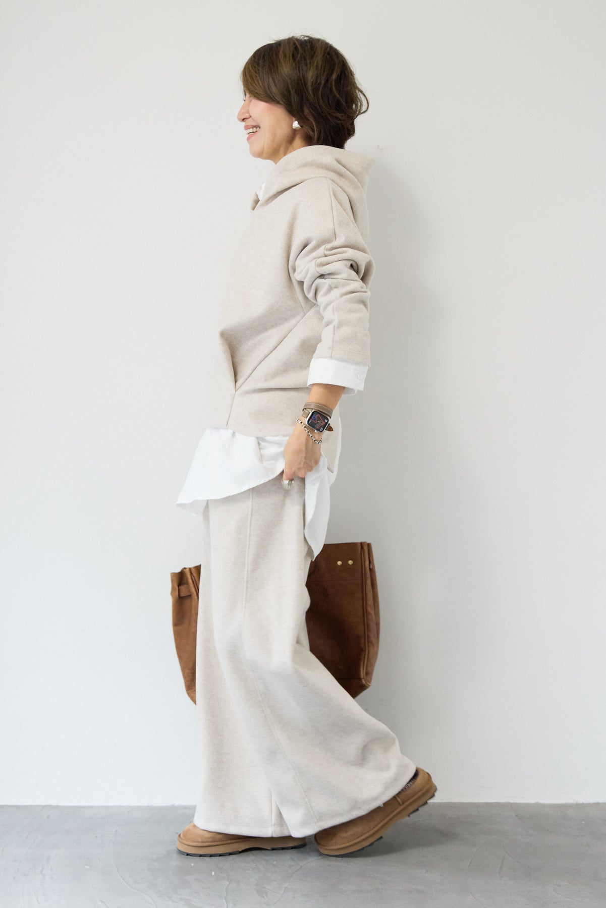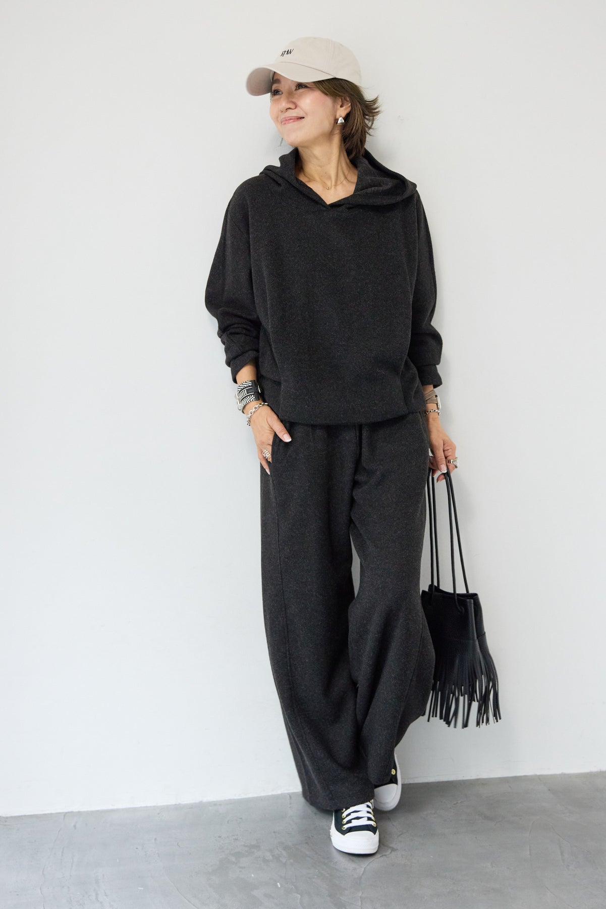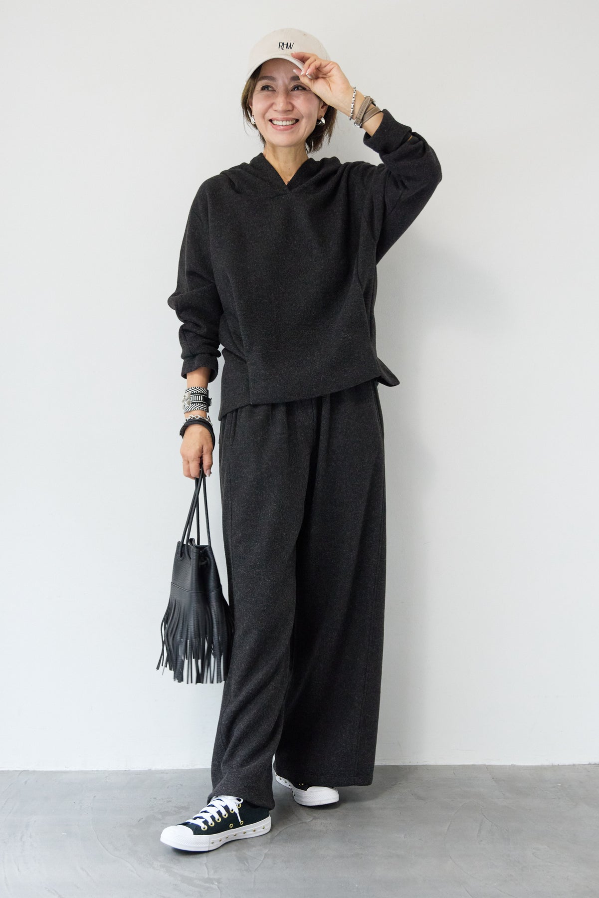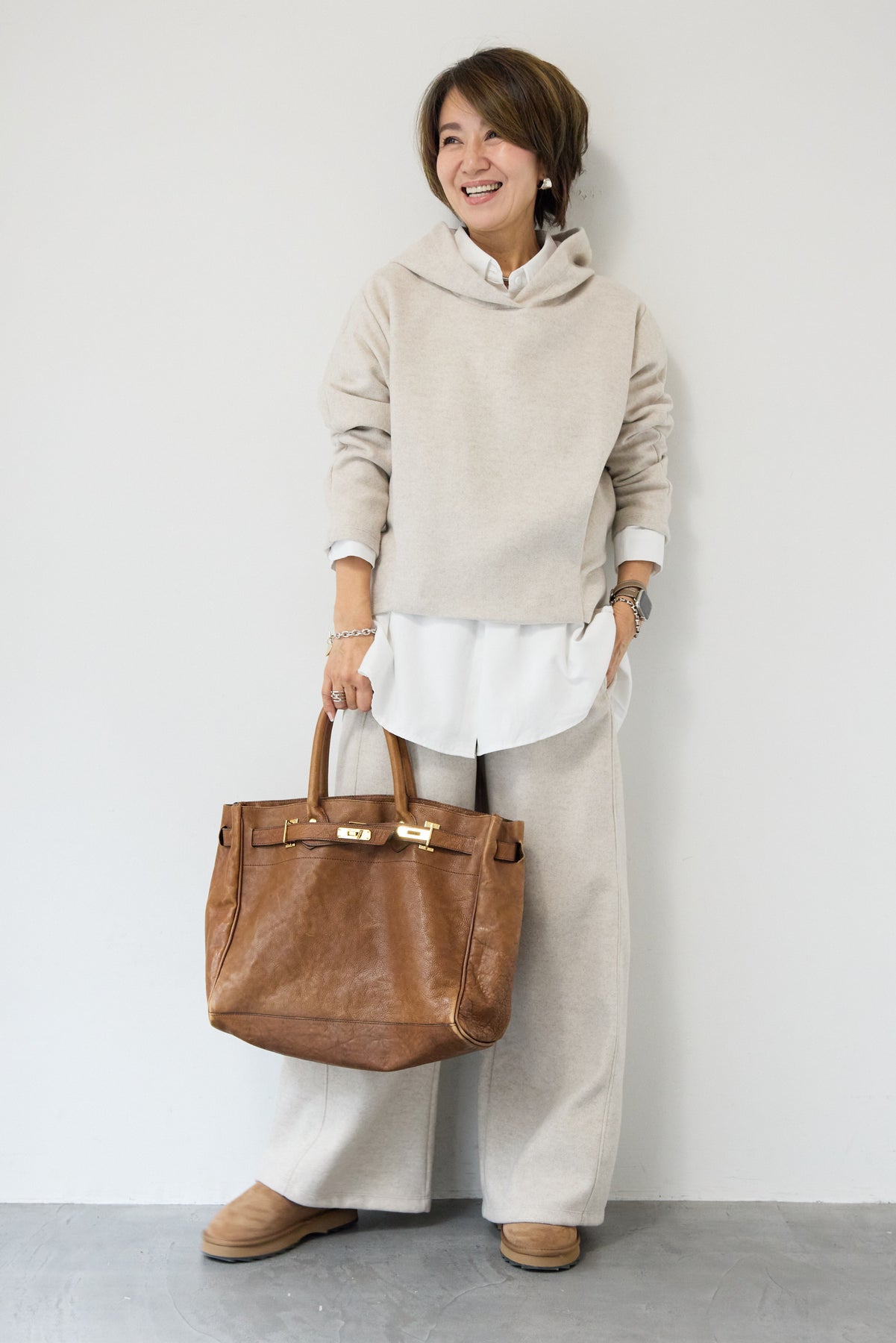 上品さとリラックス感を兼ね備えた、大人のためのフーディトップス。起毛感のあるメルトン素材を使用し、柔らかく暖かな着心地が魅力です。カジュアルな印象のフーディデザインも、素材感と計算されたシルエットで洗練された雰囲気に仕上げています。バックスタイルにはタックヘムデザインを施し、さりげない立体感と動きをプラス。ヒップラインを自然にカバーしつつ、前後で表情の異なるデザインがコーディネートのアクセントになります。程よくゆとりのあるシルエットで、パンツにもスカートにも好相性。同素材のボトムと合わせたセットアップスタイルはもちろん、単品使いでも着回し力の高い一枚です。