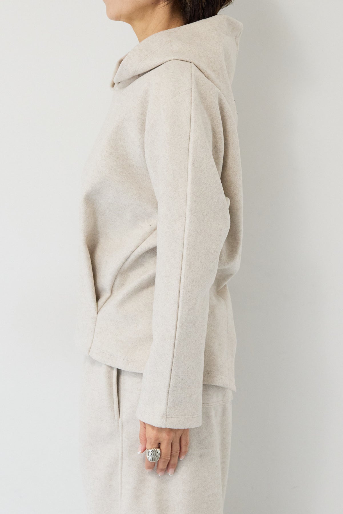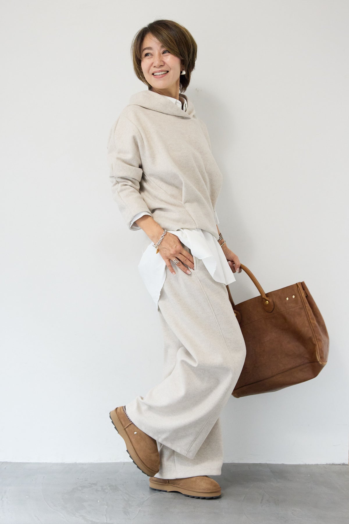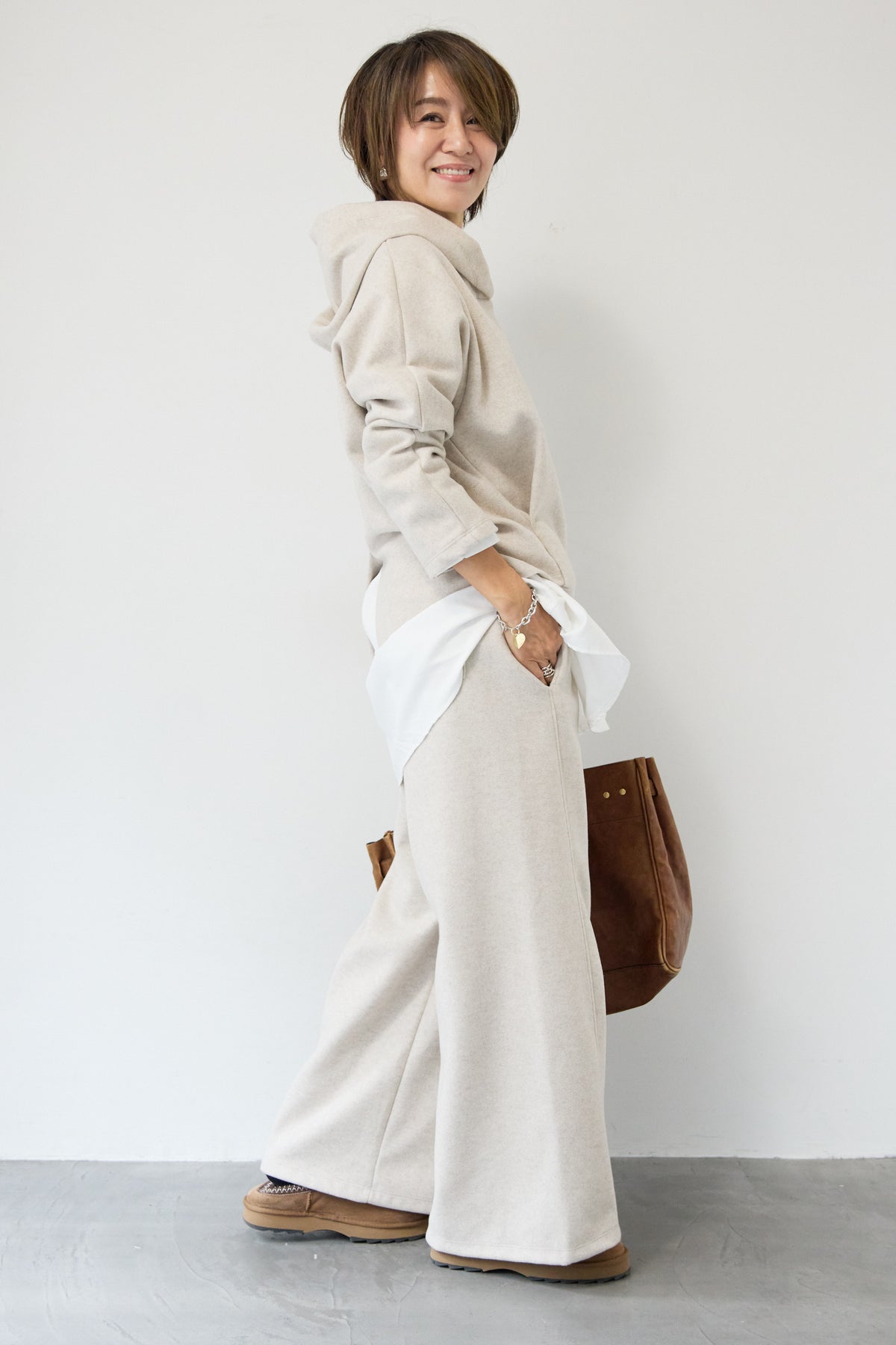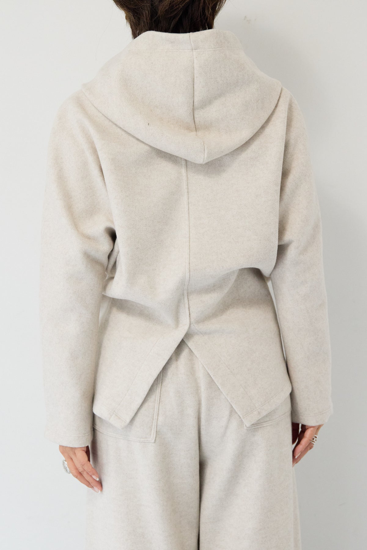 上品さとリラックス感を兼ね備えた、大人のためのフーディトップス。起毛感のあるメルトン素材を使用し、柔らかく暖かな着心地が魅力です。カジュアルな印象のフーディデザインも、素材感と計算されたシルエットで洗練された雰囲気に仕上げています。バックスタイルにはタックヘムデザインを施し、さりげない立体感と動きをプラス。ヒップラインを自然にカバーしつつ、前後で表情の異なるデザインがコーディネートのアクセントになります。程よくゆとりのあるシルエットで、パンツにもスカートにも好相性。同素材のボトムと合わせたセットアップスタイルはもちろん、単品使いでも着回し力の高い一枚です。