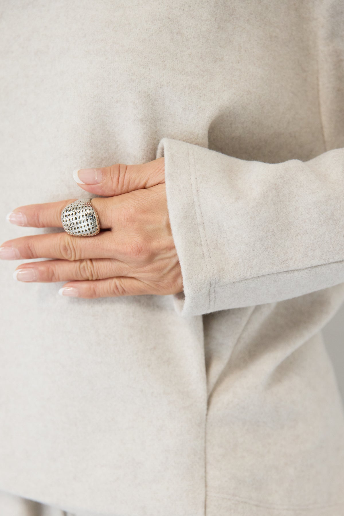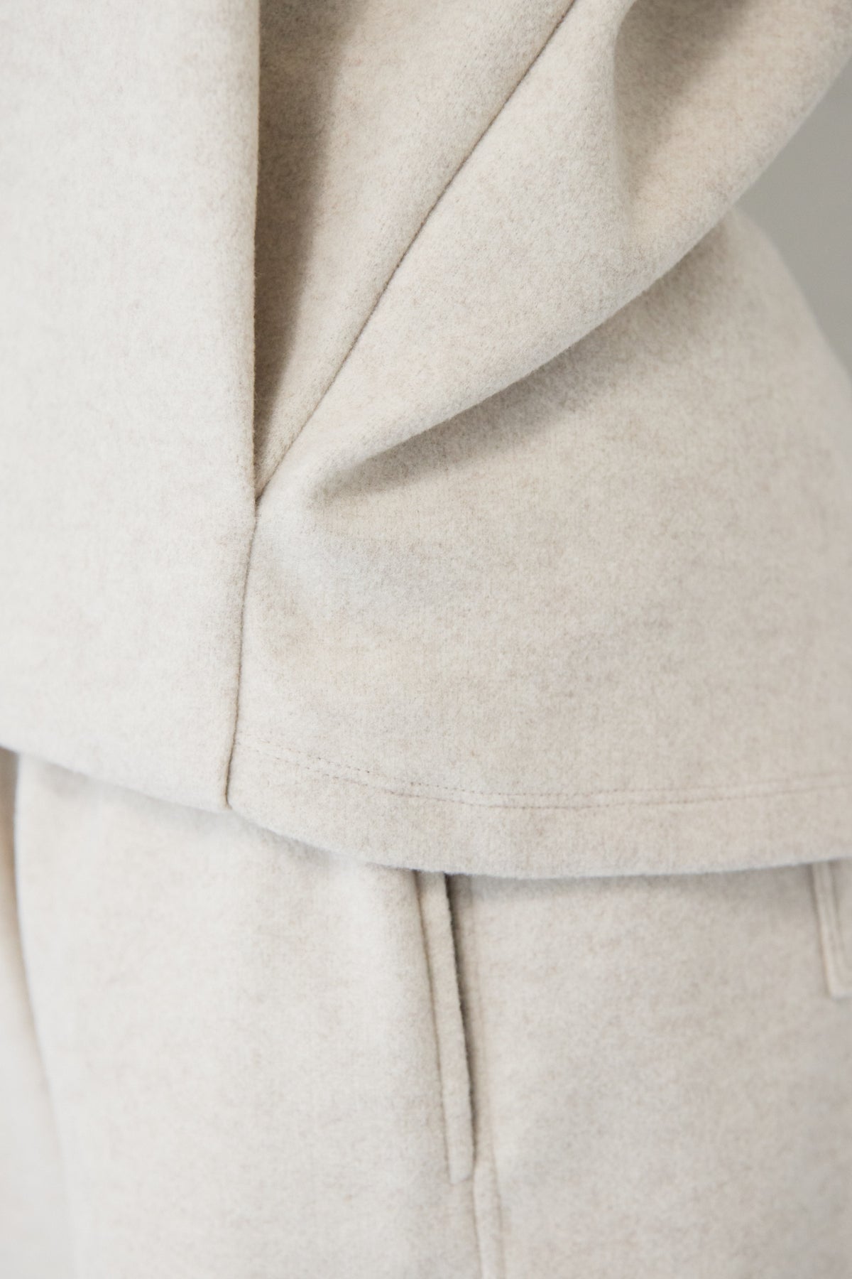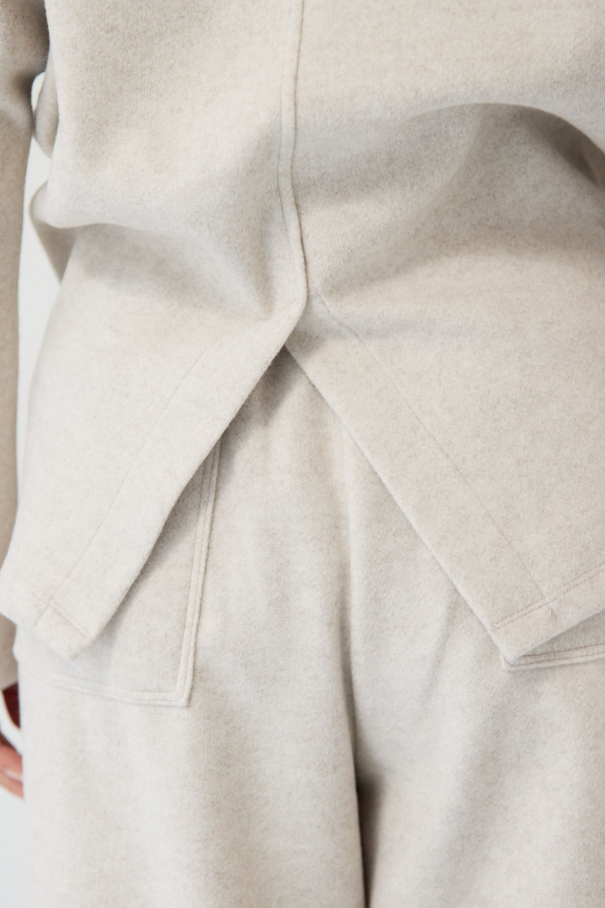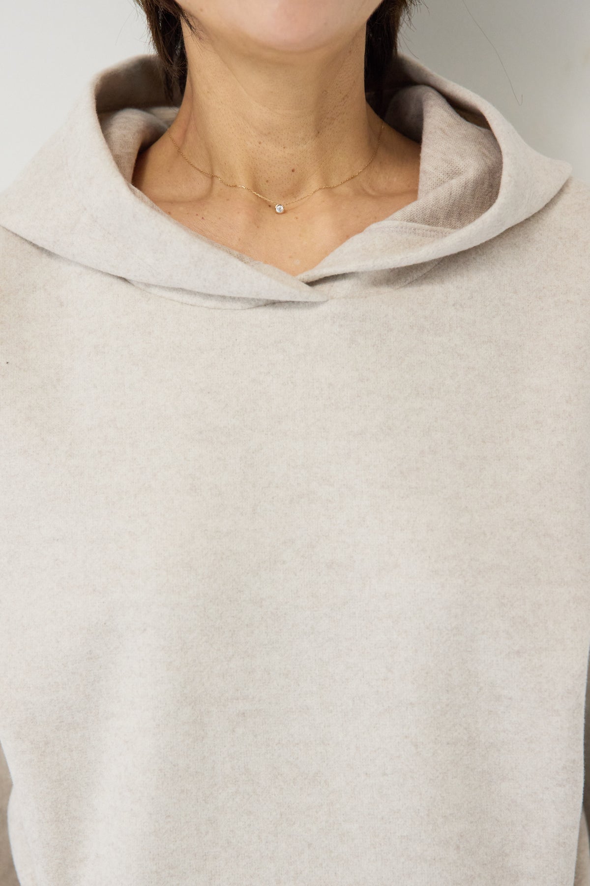 上品さとリラックス感を兼ね備えた、大人のためのフーディトップス。起毛感のあるメルトン素材を使用し、柔らかく暖かな着心地が魅力です。カジュアルな印象のフーディデザインも、素材感と計算されたシルエットで洗練された雰囲気に仕上げています。バックスタイルにはタックヘムデザインを施し、さりげない立体感と動きをプラス。ヒップラインを自然にカバーしつつ、前後で表情の異なるデザインがコーディネートのアクセントになります。程よくゆとりのあるシルエットで、パンツにもスカートにも好相性。同素材のボトムと合わせたセットアップスタイルはもちろん、単品使いでも着回し力の高い一枚です。