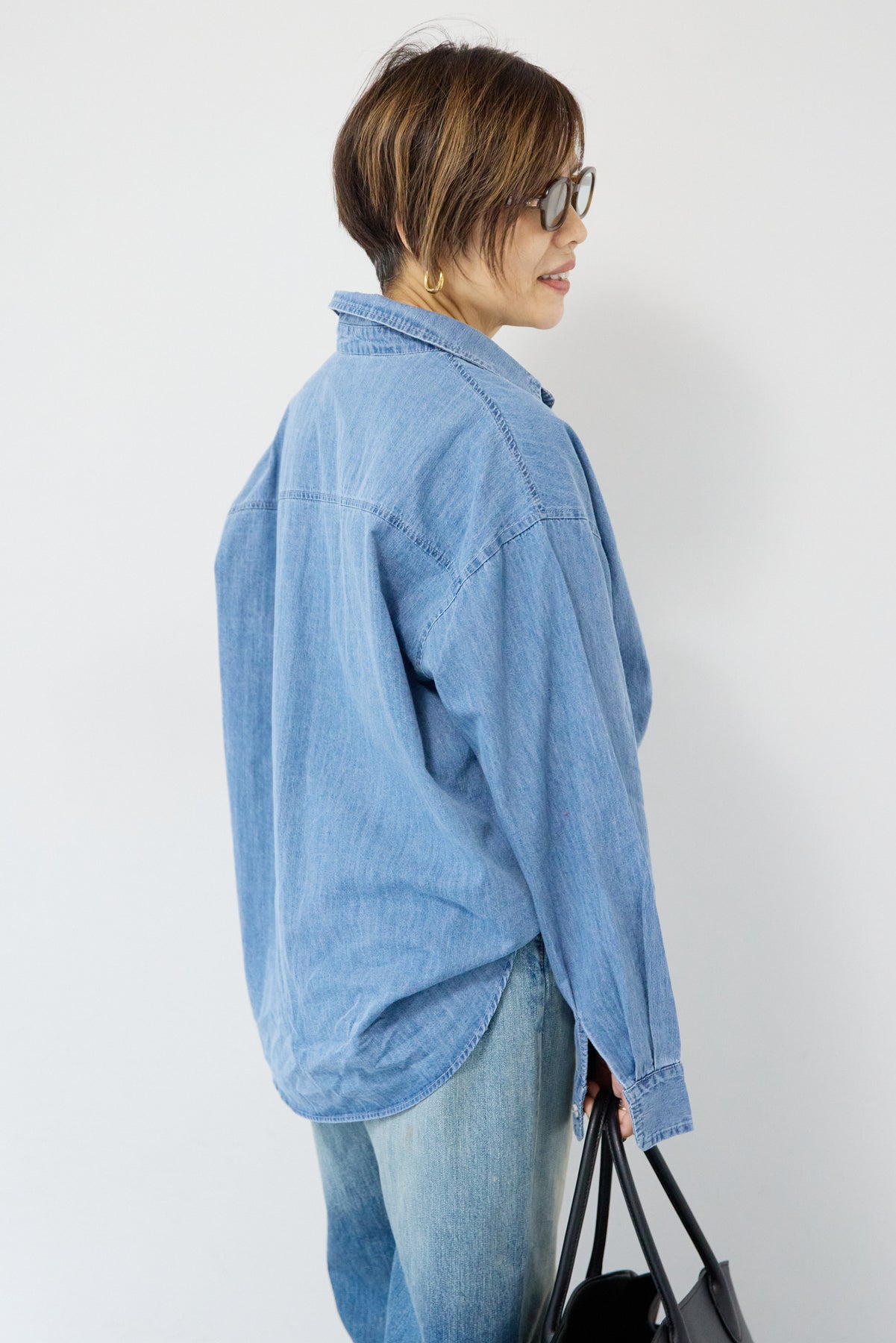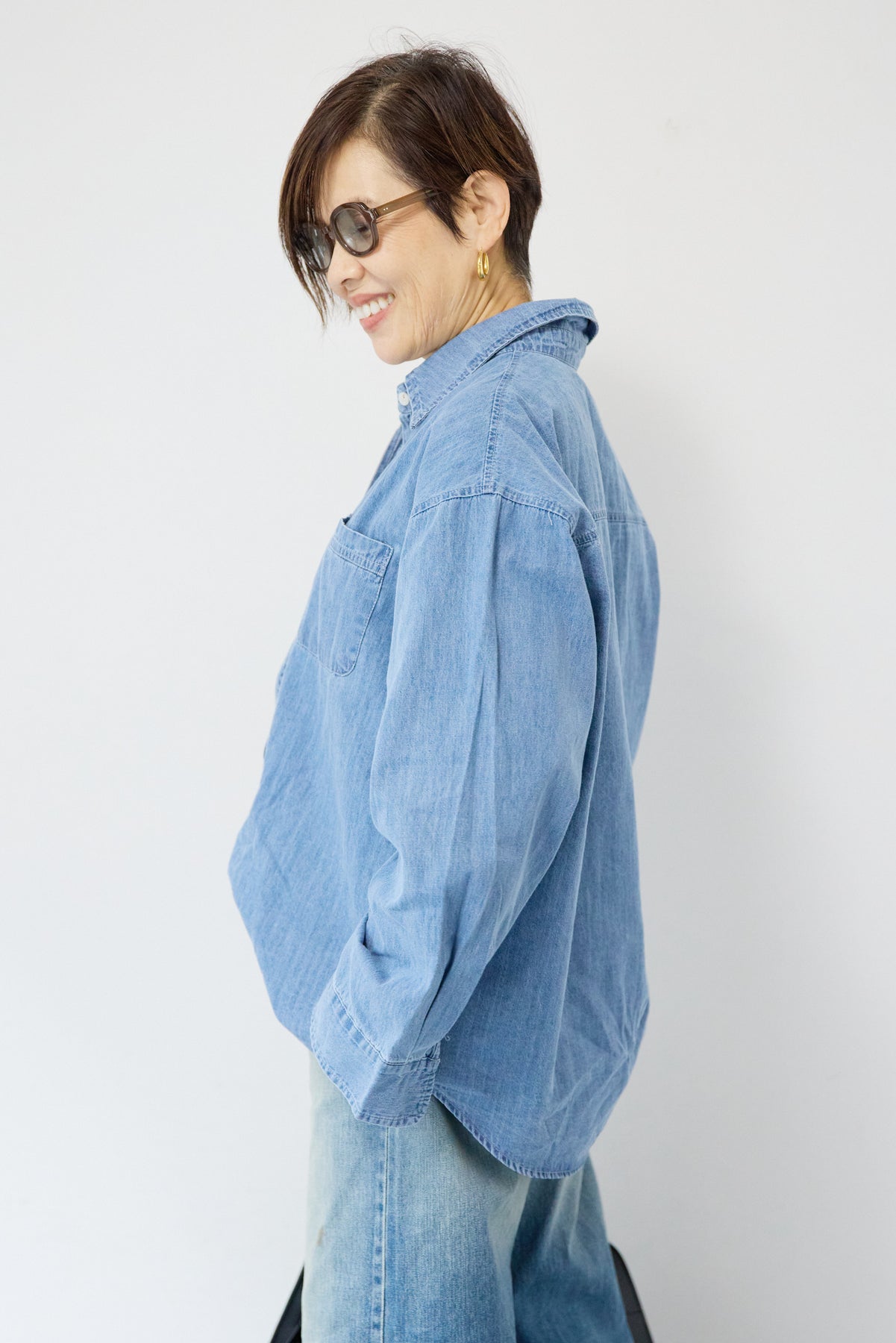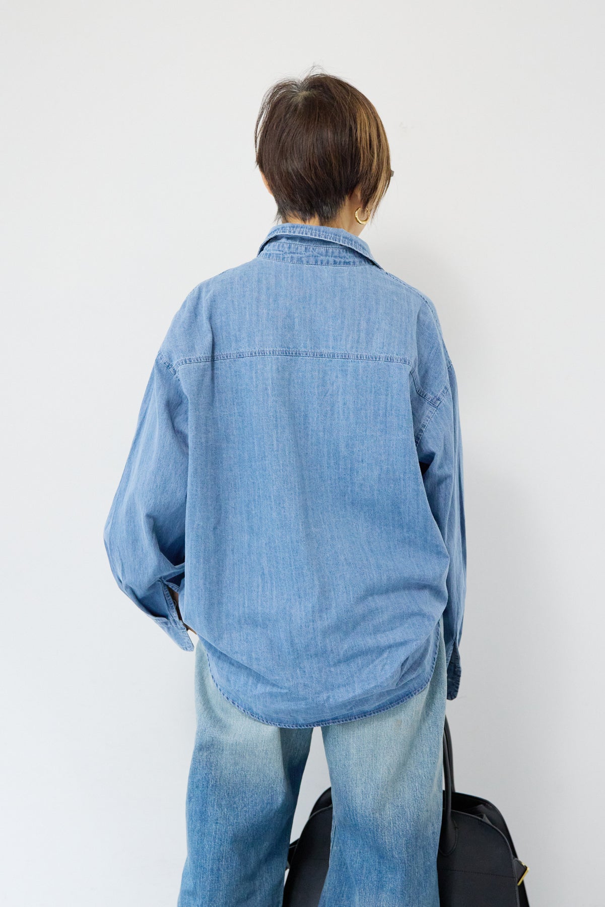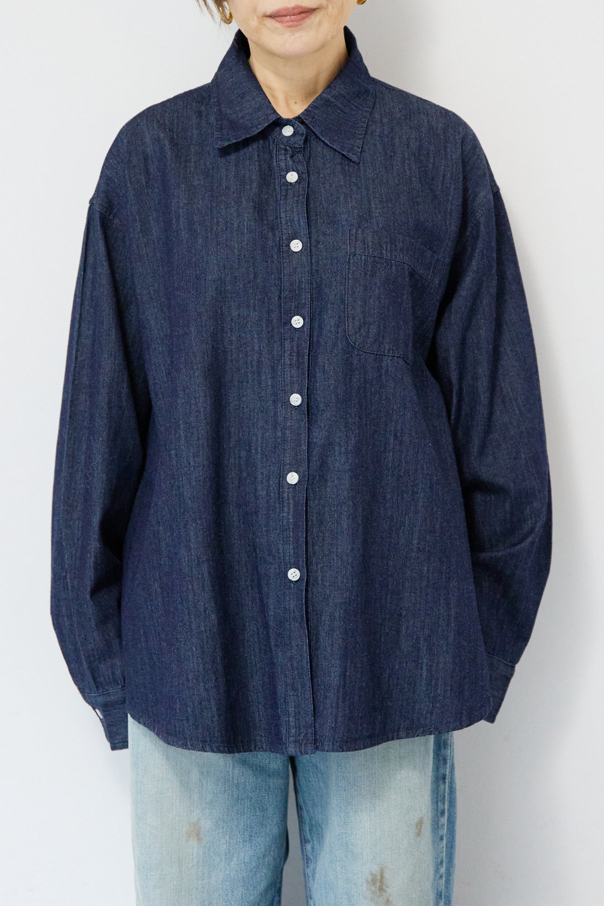 ほどよい軽さとラフな抜け感が魅力の「ライトオンスデニムシャツ」。柔らかく、着始めから身体に馴染むライトオンスデニムを使用し、デニム特有のごわつきがなく、一日中快適に着られる一枚です。全体はリラックス感のあるオーバーサイズシルエット。肩の落ちたドロップショルダーで、大人の余裕あるこなれ感を演出してくれます。前を閉じて1枚着にするのはもちろん、羽織りとしても使いやすく、季節を問わずコーディネートに取り入れやすいアイテムです。 ライトブルーはやわらかな色味でカジュアルになりすぎず、ネイビーはシックで上品な印象に。どちらもデニムならではの風合いがあり、着るほどに自分らしい味わいが楽しめます。胸元には便利なポケット付き。フロントのボタンは小ぶりで上品な白ボタンを採用し、カジュアルアイテムでありながら洗練された雰囲気に仕上げました。