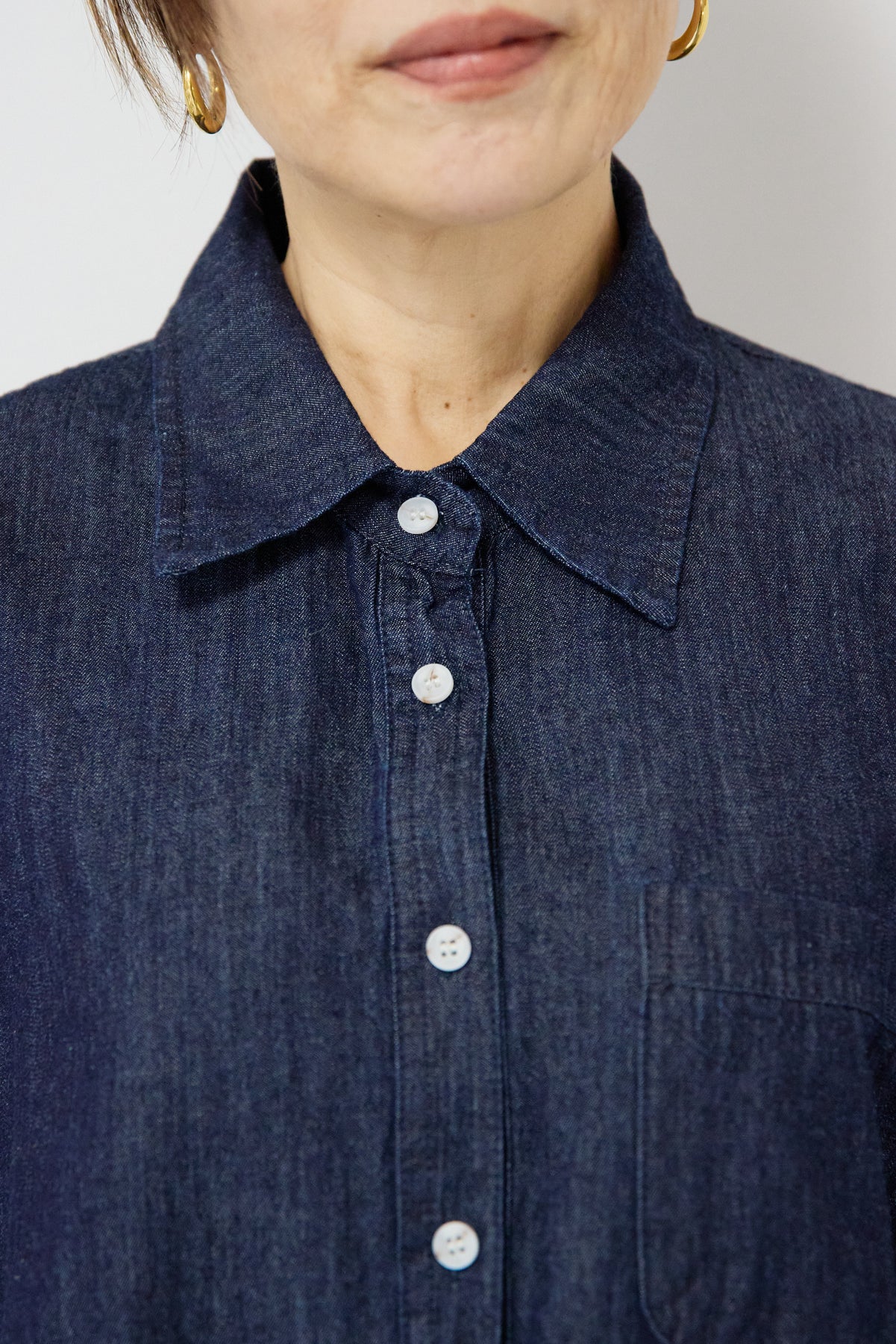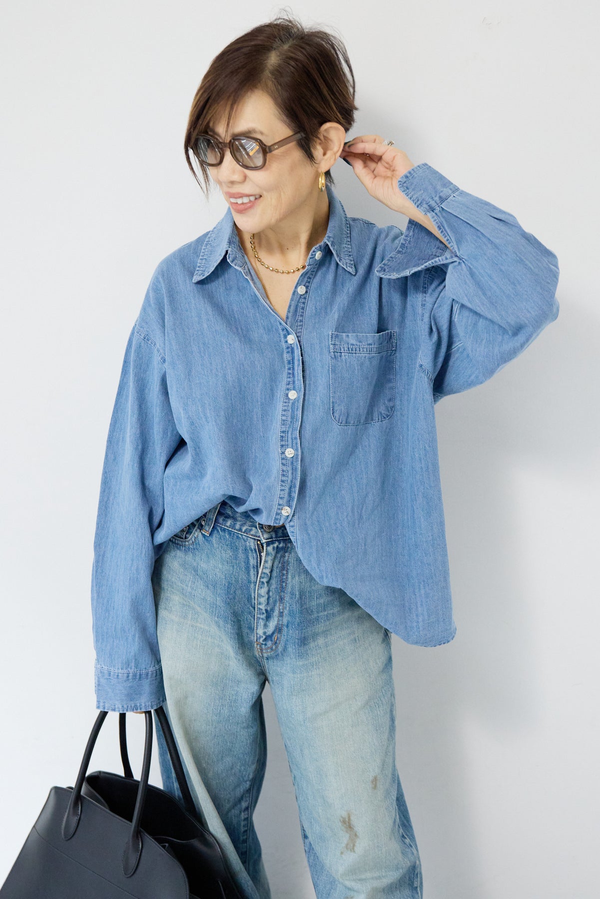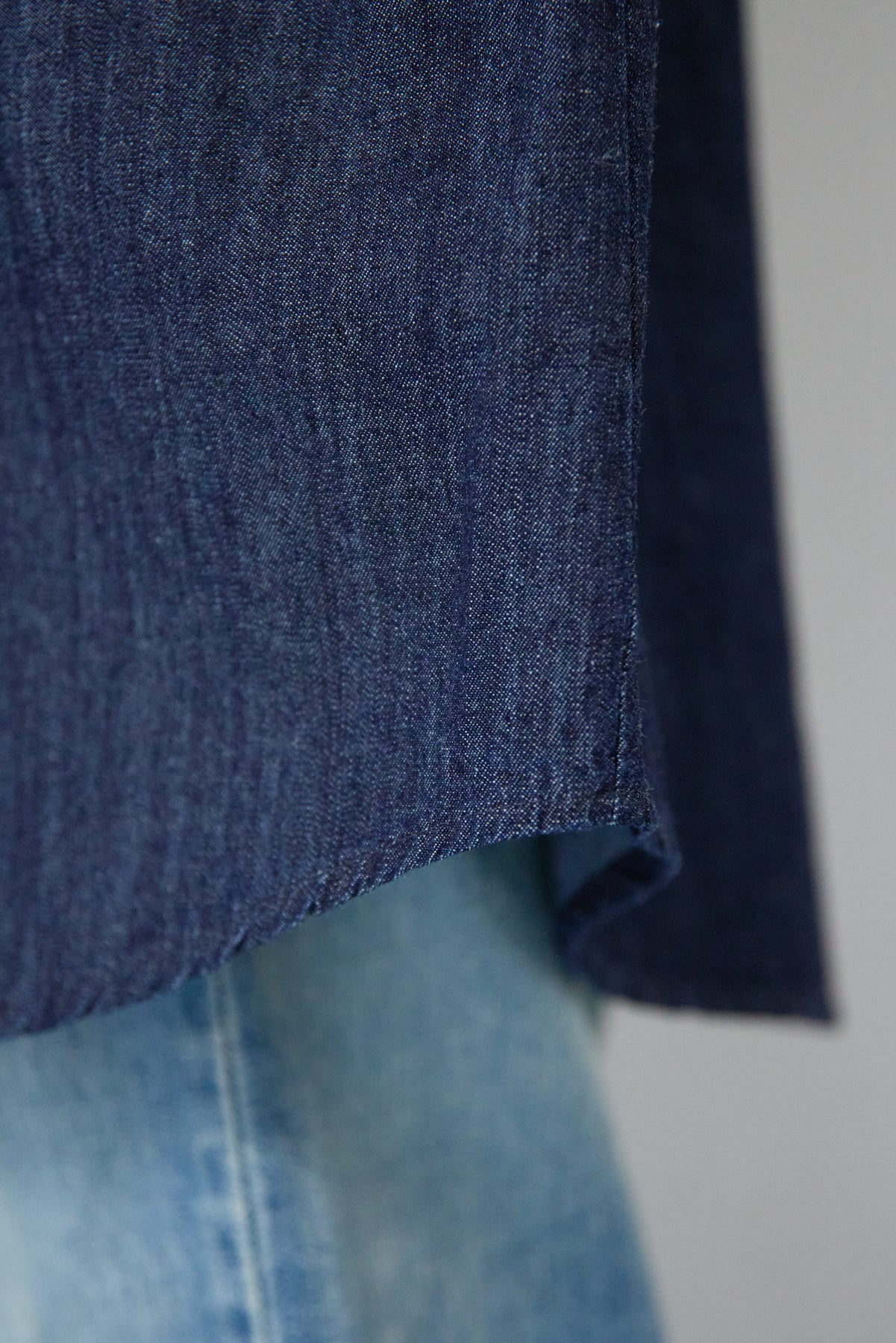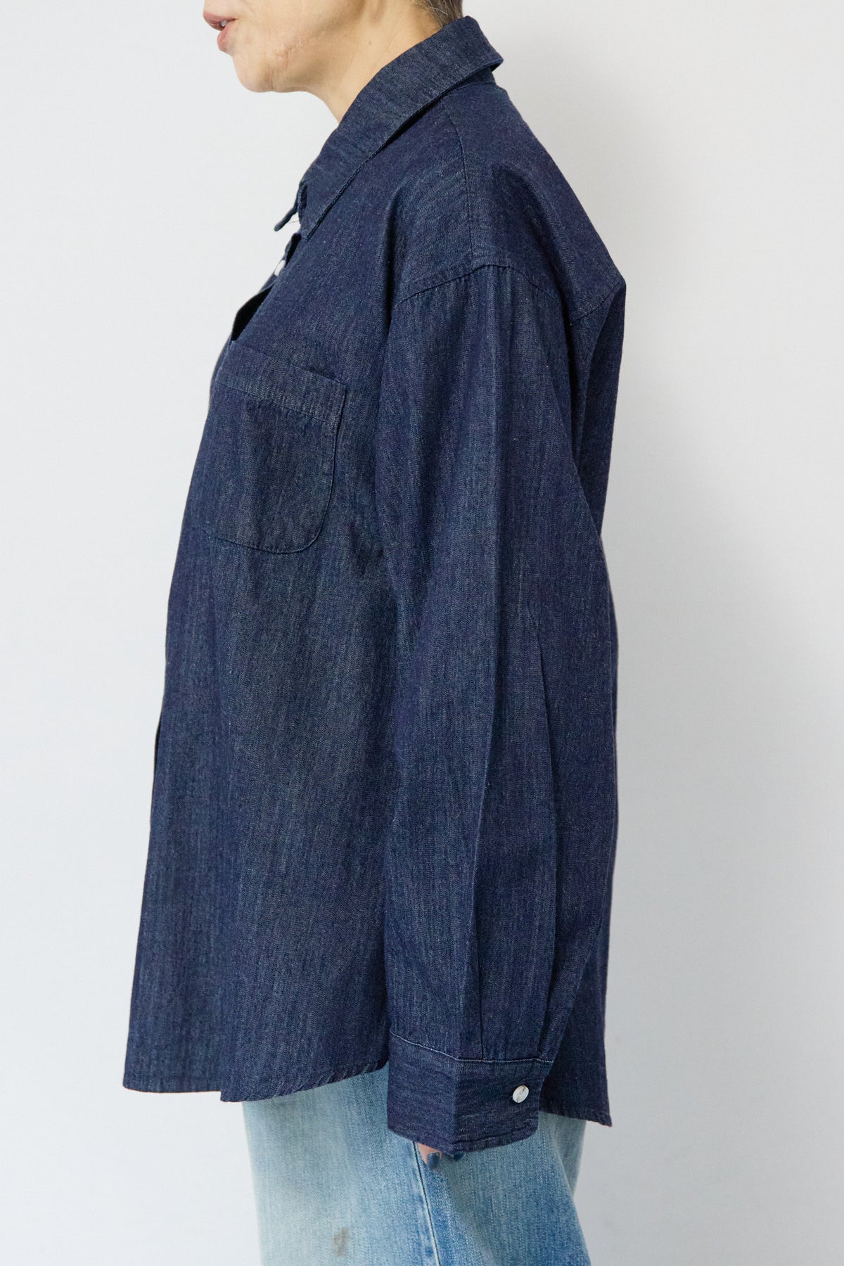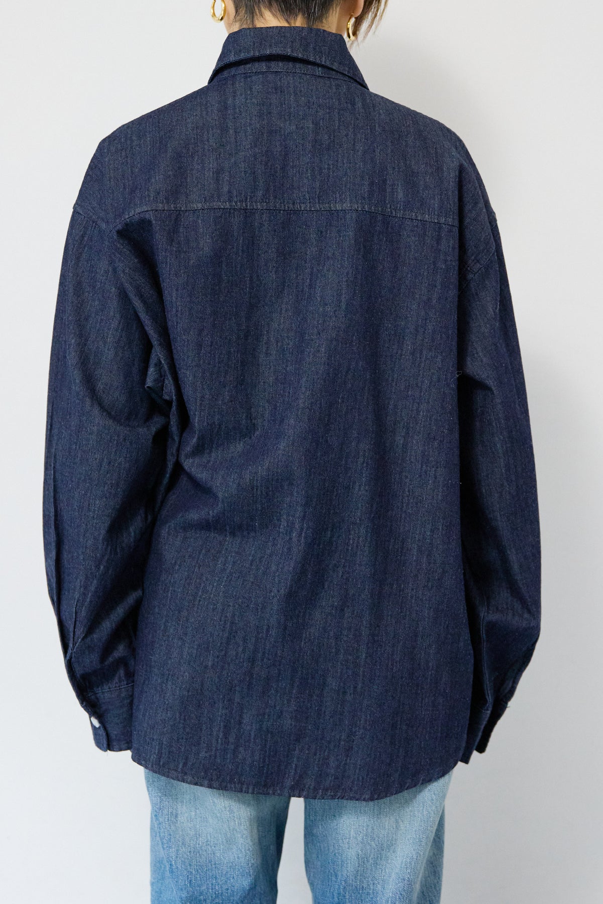 ほどよい軽さとラフな抜け感が魅力の「ライトオンスデニムシャツ」。柔らかく、着始めから身体に馴染むライトオンスデニムを使用し、デニム特有のごわつきがなく、一日中快適に着られる一枚です。全体はリラックス感のあるオーバーサイズシルエット。肩の落ちたドロップショルダーで、大人の余裕あるこなれ感を演出してくれます。前を閉じて1枚着にするのはもちろん、羽織りとしても使いやすく、季節を問わずコーディネートに取り入れやすいアイテムです。 ライトブルーはやわらかな色味でカジュアルになりすぎず、ネイビーはシックで上品な印象に。どちらもデニムならではの風合いがあり、着るほどに自分らしい味わいが楽しめます。胸元には便利なポケット付き。フロントのボタンは小ぶりで上品な白ボタンを採用し、カジュアルアイテムでありながら洗練された雰囲気に仕上げました。