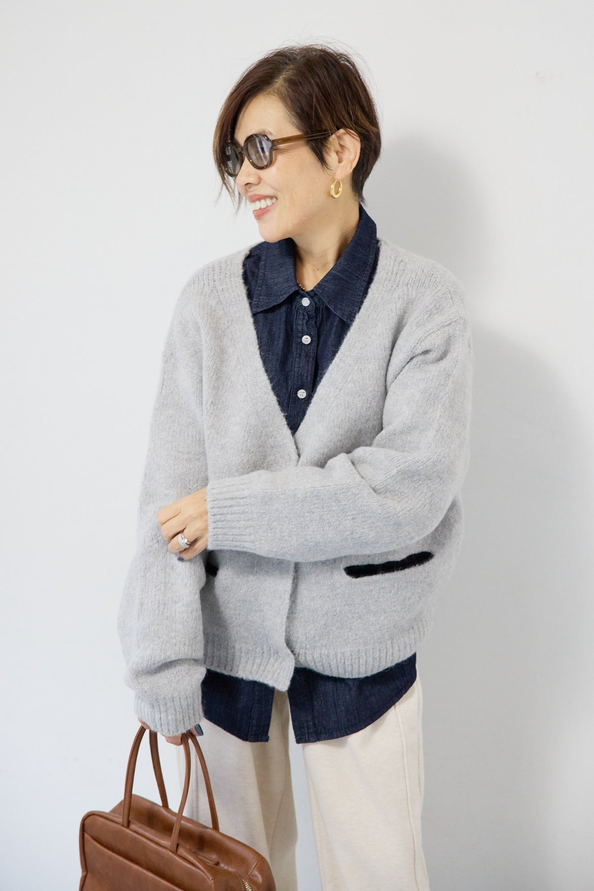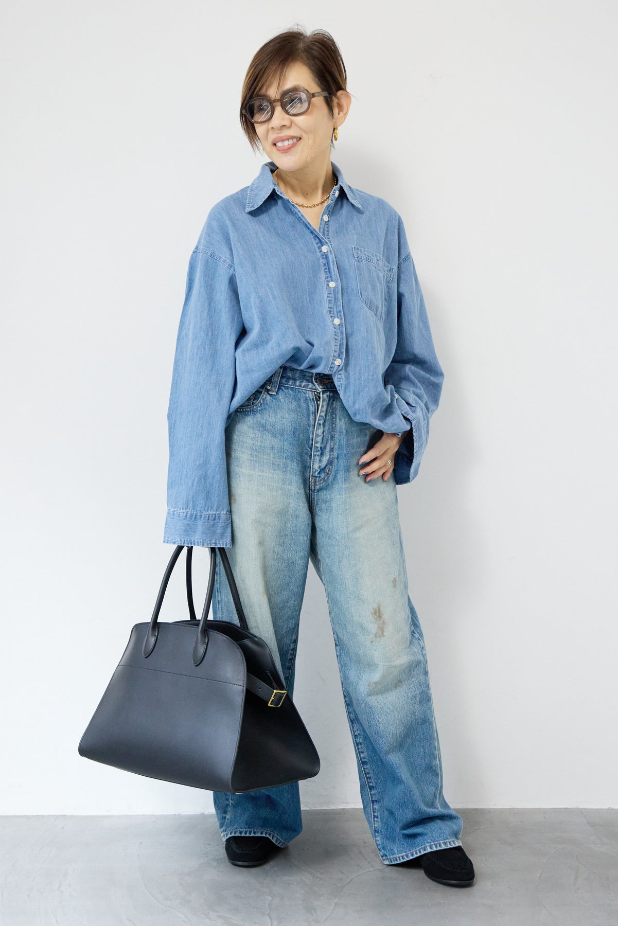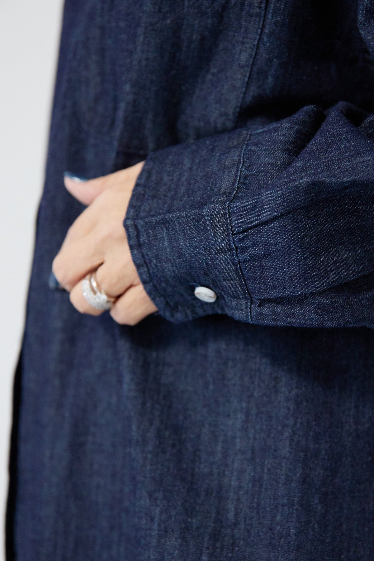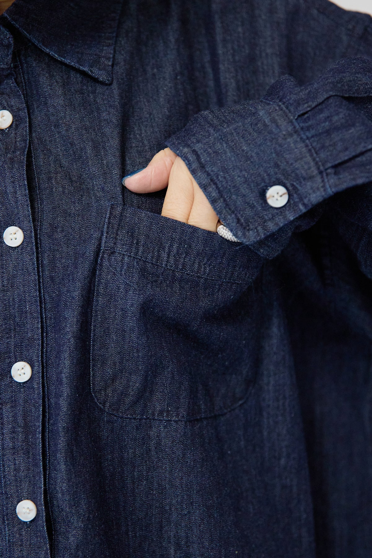 ほどよい軽さとラフな抜け感が魅力の「ライトオンスデニムシャツ」。柔らかく、着始めから身体に馴染むライトオンスデニムを使用し、デニム特有のごわつきがなく、一日中快適に着られる一枚です。全体はリラックス感のあるオーバーサイズシルエット。肩の落ちたドロップショルダーで、大人の余裕あるこなれ感を演出してくれます。前を閉じて1枚着にするのはもちろん、羽織りとしても使いやすく、季節を問わずコーディネートに取り入れやすいアイテムです。 ライトブルーはやわらかな色味でカジュアルになりすぎず、ネイビーはシックで上品な印象に。どちらもデニムならではの風合いがあり、着るほどに自分らしい味わいが楽しめます。胸元には便利なポケット付き。フロントのボタンは小ぶりで上品な白ボタンを採用し、カジュアルアイテムでありながら洗練された雰囲気に仕上げました。