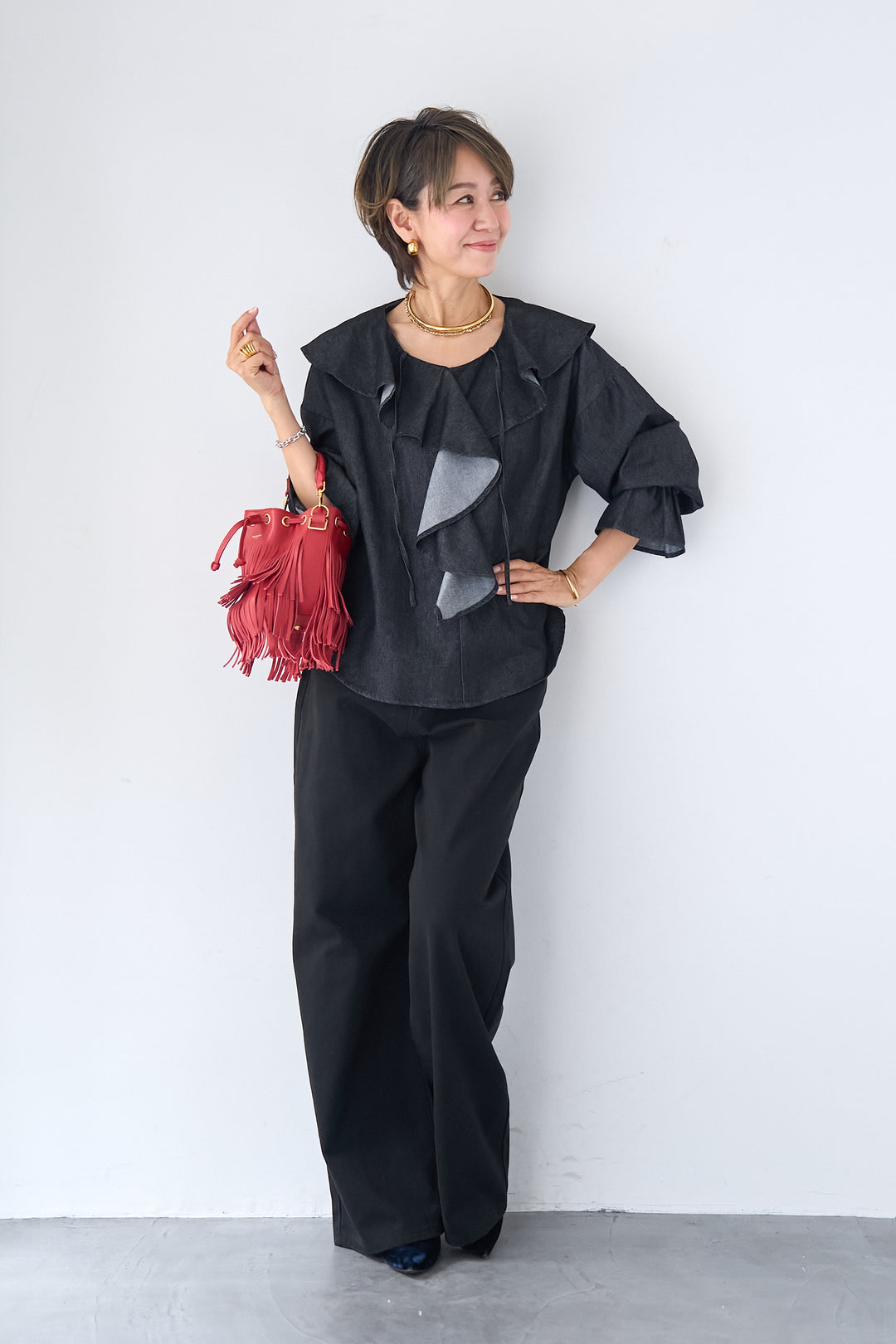 ラッフルカラー ライトデニムブラウス