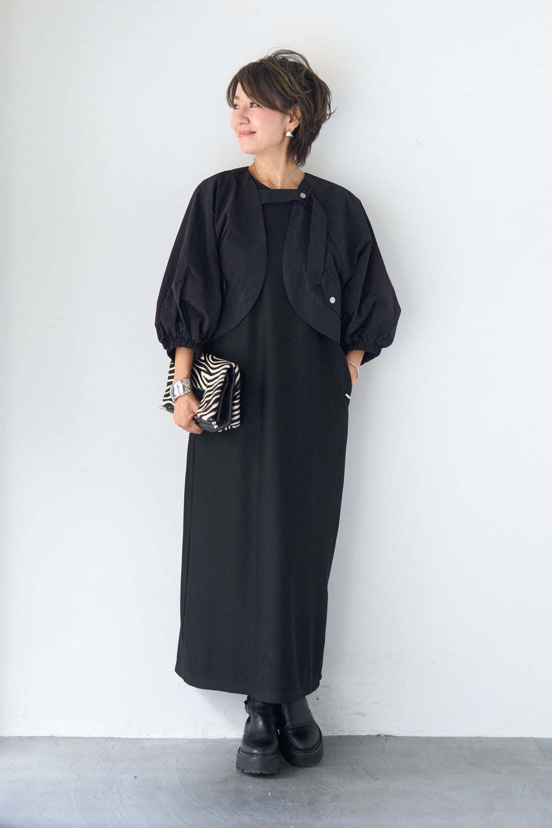ショートブルゾン×リブワンピース レイヤードセットアップ