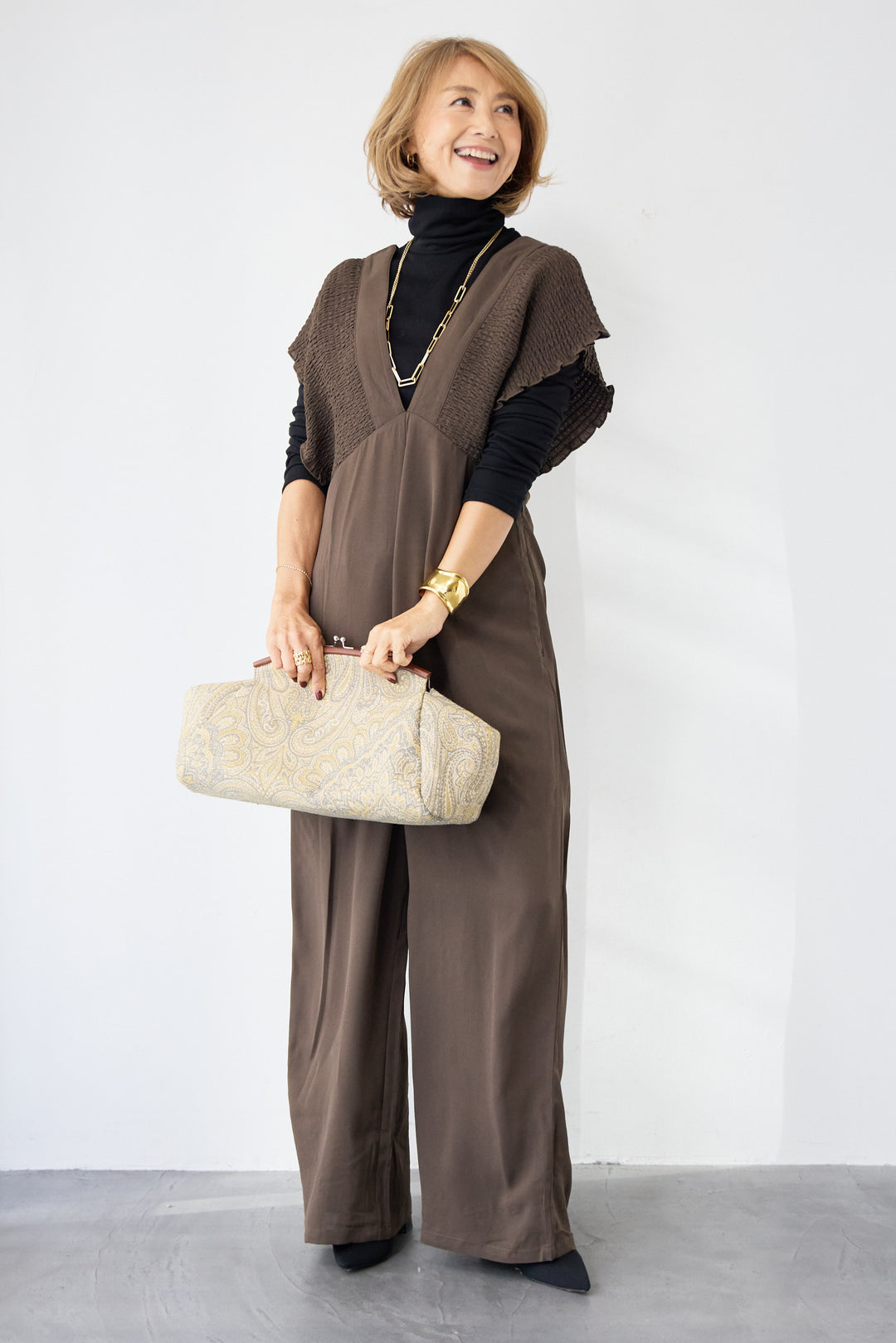 シャーリングスリーブ・Vネックオールインワン
