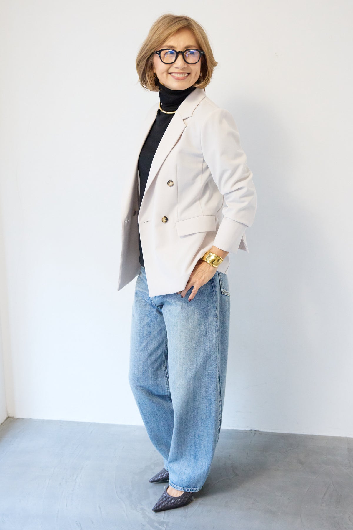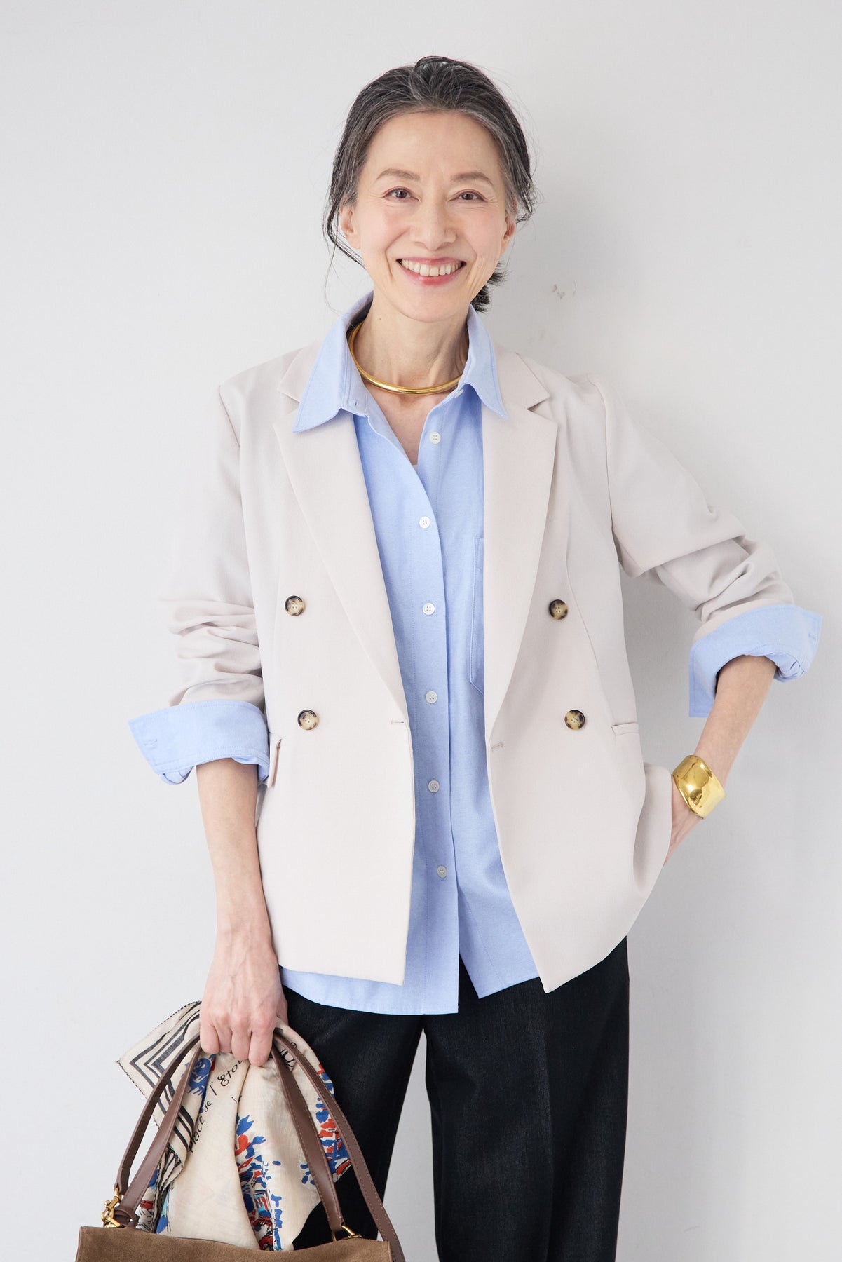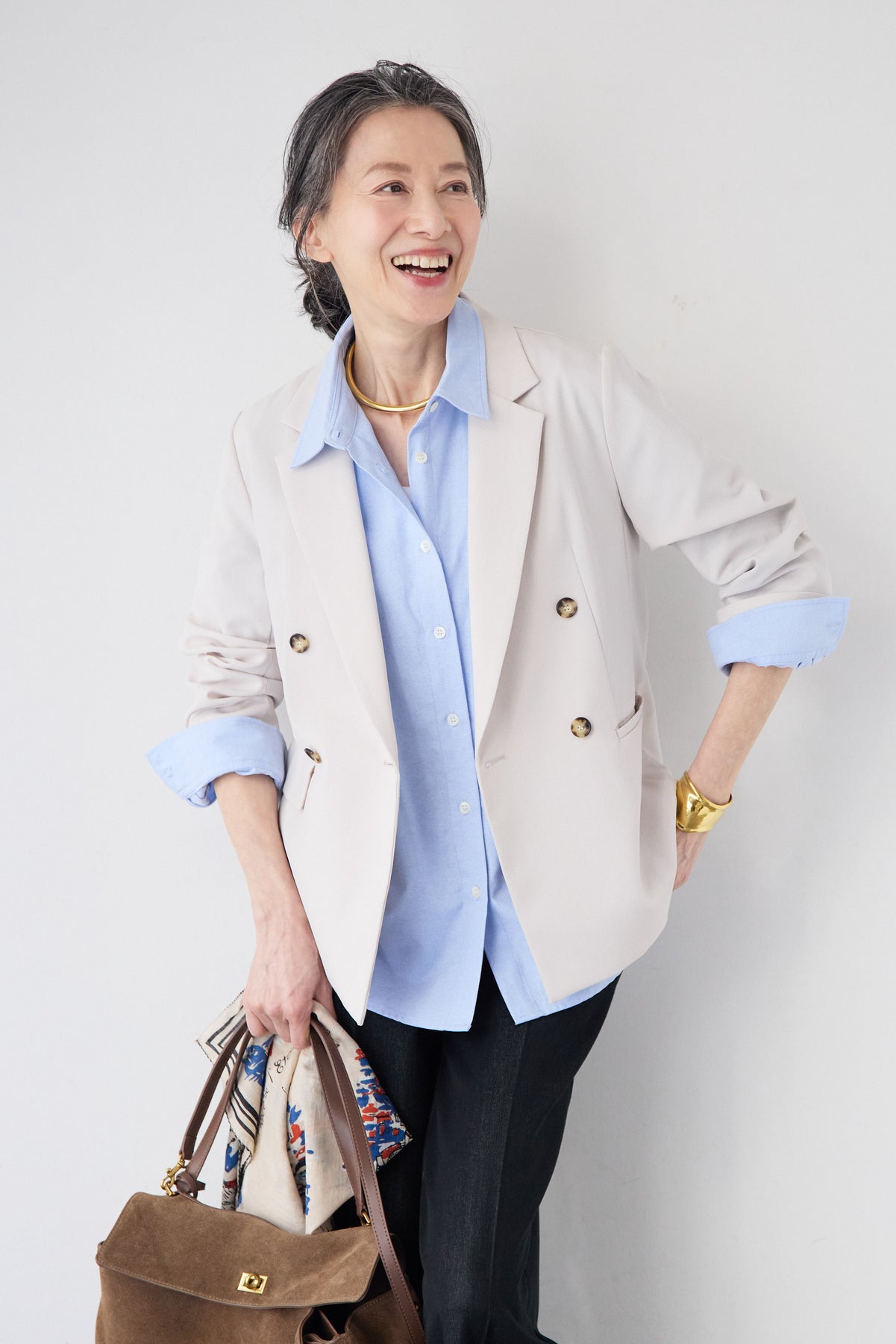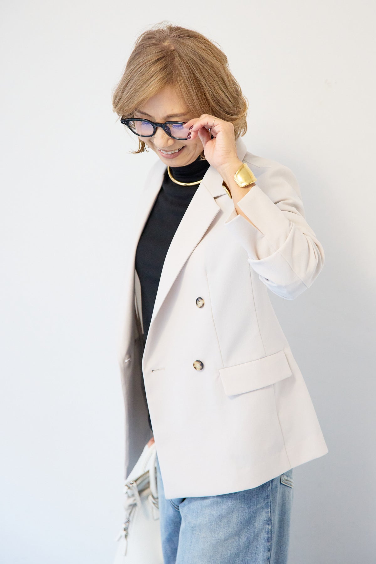 洗練された佇まいと着回し力を兼ね備えた、大人のためのダブルジャケット。繊細なバーズアイ素材が生む上品な表情は、無地感覚で使いやすく、きちんと感の中に程よいニュアンスをプラスしてくれます。ダブルブレスト仕様とやや長めの着丈が、体のラインを美しくカバーしながら縦のラインを強調。インナーを選ばず、タートルネックやカットソー、ブラウスまで幅広く相性抜群です。程よくストレッチの効いた素材感で、長時間の着用も快適。デニムと合わせたカジュアルダウンから、きれいめパンツやスカートと合わせたオフィススタイルまで、オンオフ問わず活躍する一着です。