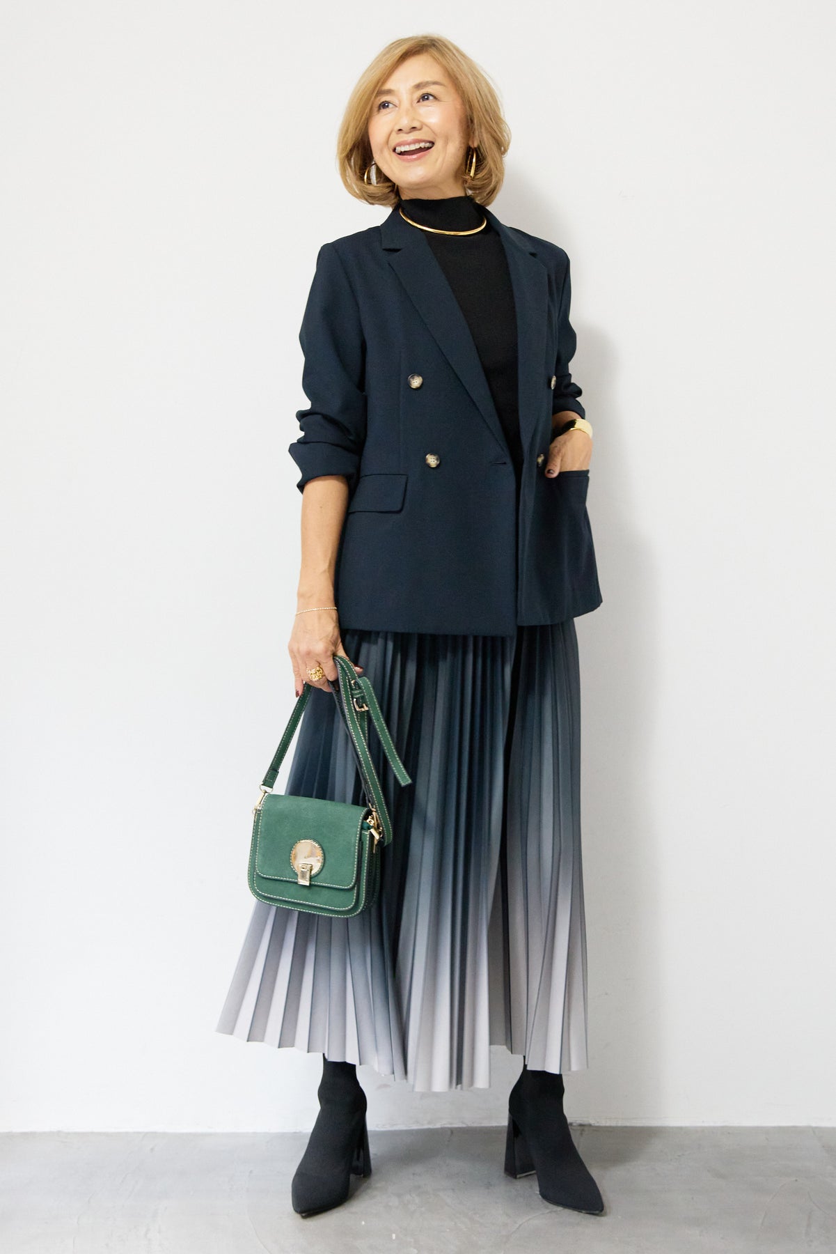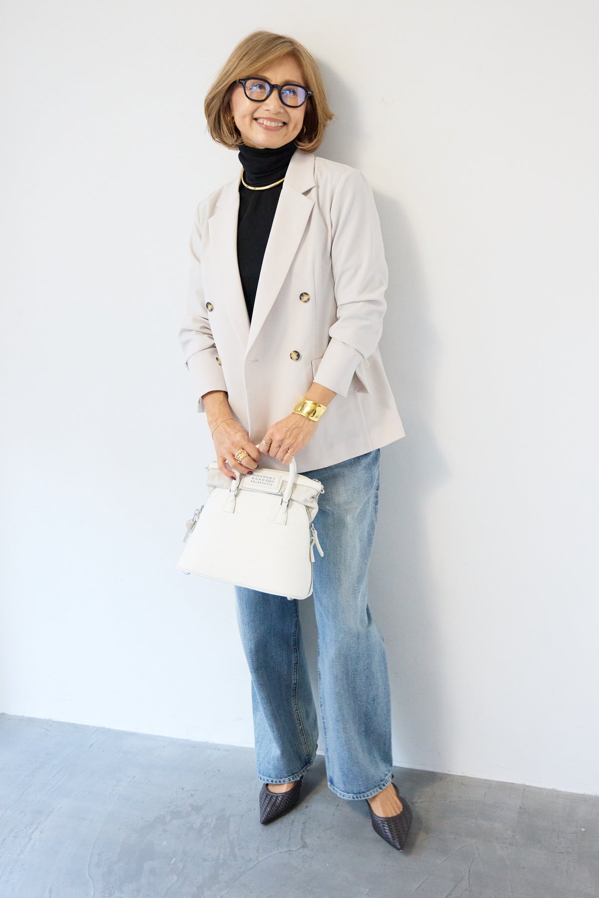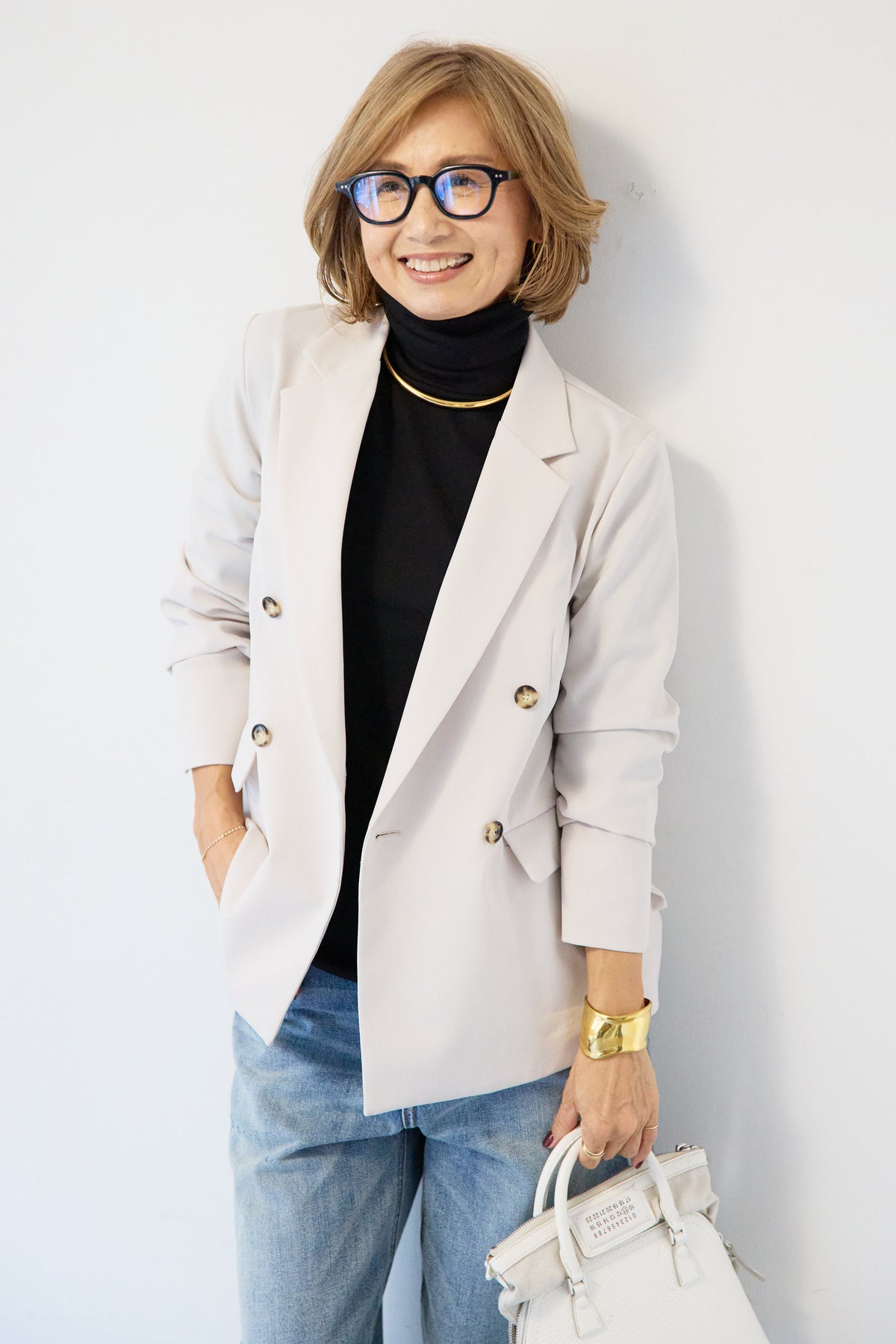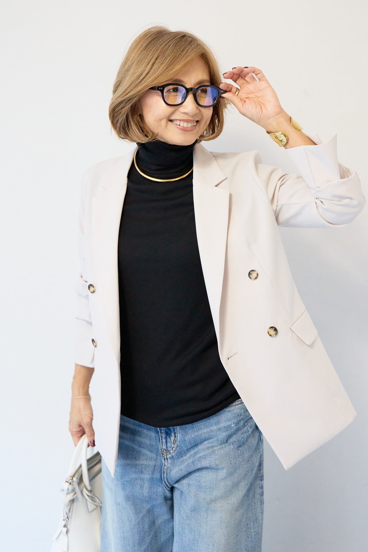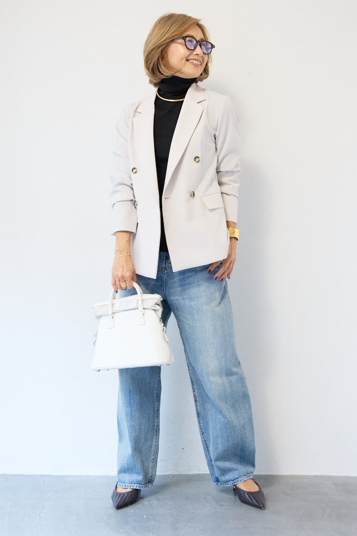 洗練された佇まいと着回し力を兼ね備えた、大人のためのダブルジャケット。繊細なバーズアイ素材が生む上品な表情は、無地感覚で使いやすく、きちんと感の中に程よいニュアンスをプラスしてくれます。ダブルブレスト仕様とやや長めの着丈が、体のラインを美しくカバーしながら縦のラインを強調。インナーを選ばず、タートルネックやカットソー、ブラウスまで幅広く相性抜群です。程よくストレッチの効いた素材感で、長時間の着用も快適。デニムと合わせたカジュアルダウンから、きれいめパンツやスカートと合わせたオフィススタイルまで、オンオフ問わず活躍する一着です。