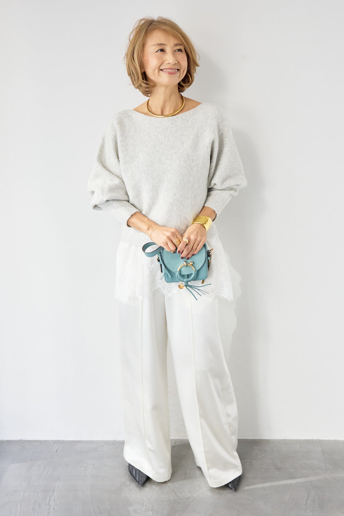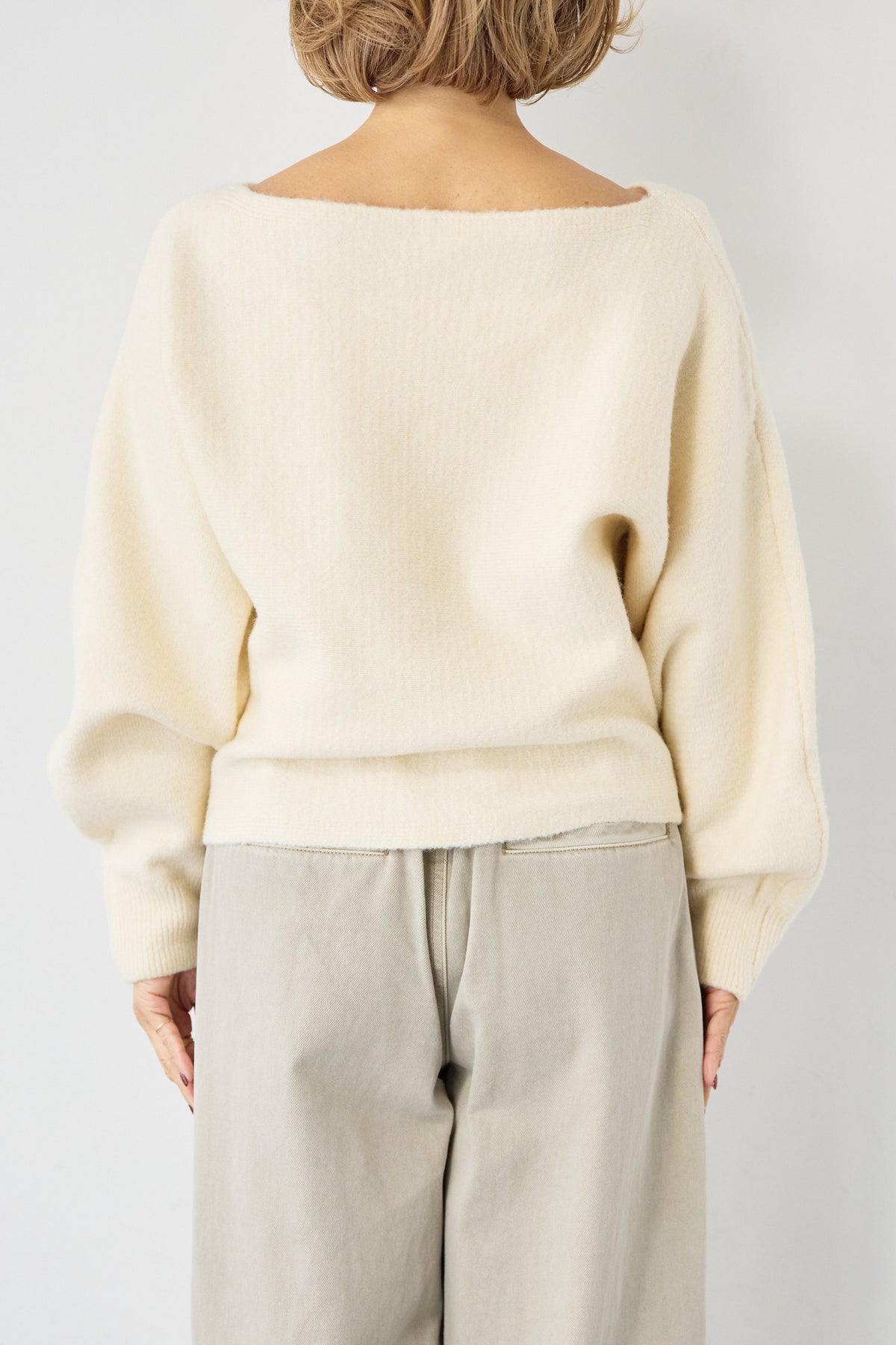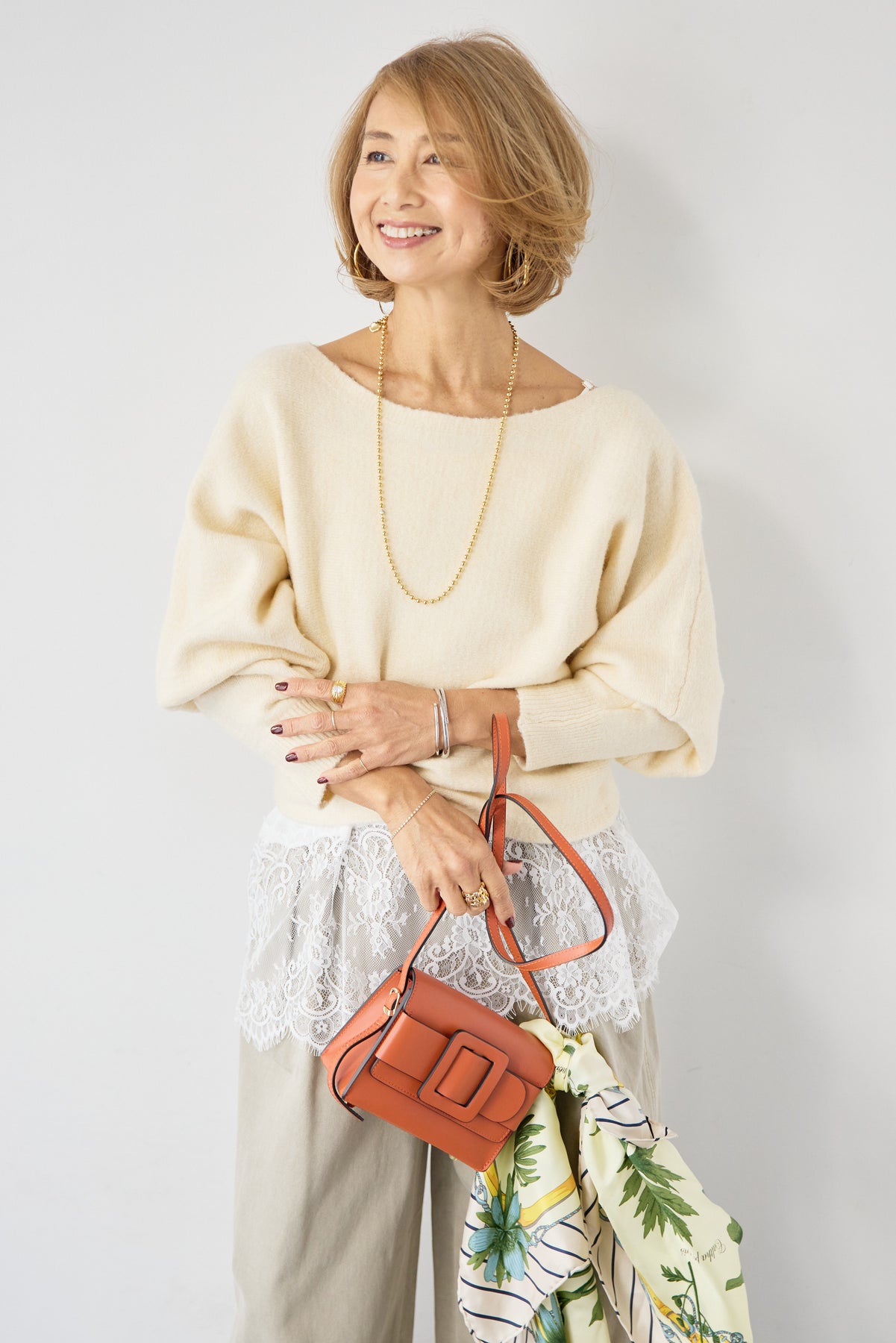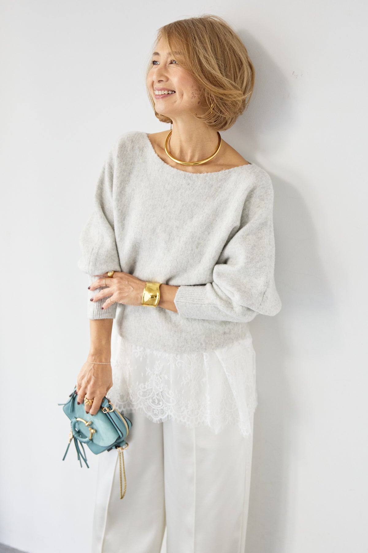 やさしい起毛感が印象的な、シャギー素材のニットプルオーバー。 表面にほどよい毛足を持たせることで、軽やかさと温もりを両立した一枚に仕上がっています。 首元は横に広がるボートネックデザイン。デコルテラインをすっきりと見せつつ、抜け感のある印象に。 身頃は程よくゆとりを持たせ、リラックスした着心地ながらもバランスよくまとまります。 袖には自然な丸みを持たせ、手元はリブで引き締めることで、全体にメリハリをプラス。 ボトムスを選ばず合わせやすく、デイリーから少しきれいめなスタイリングまで幅広く活躍します。 柔らかな風合いを楽しみながら、季節感をさりげなく取り入れられるニットです。