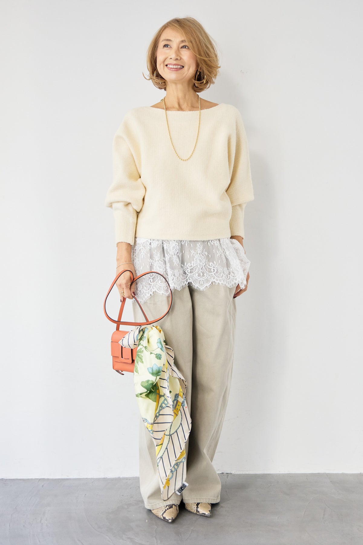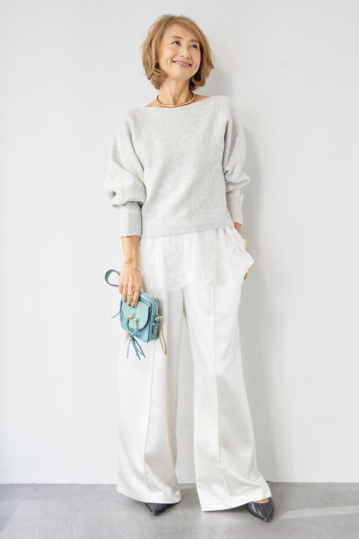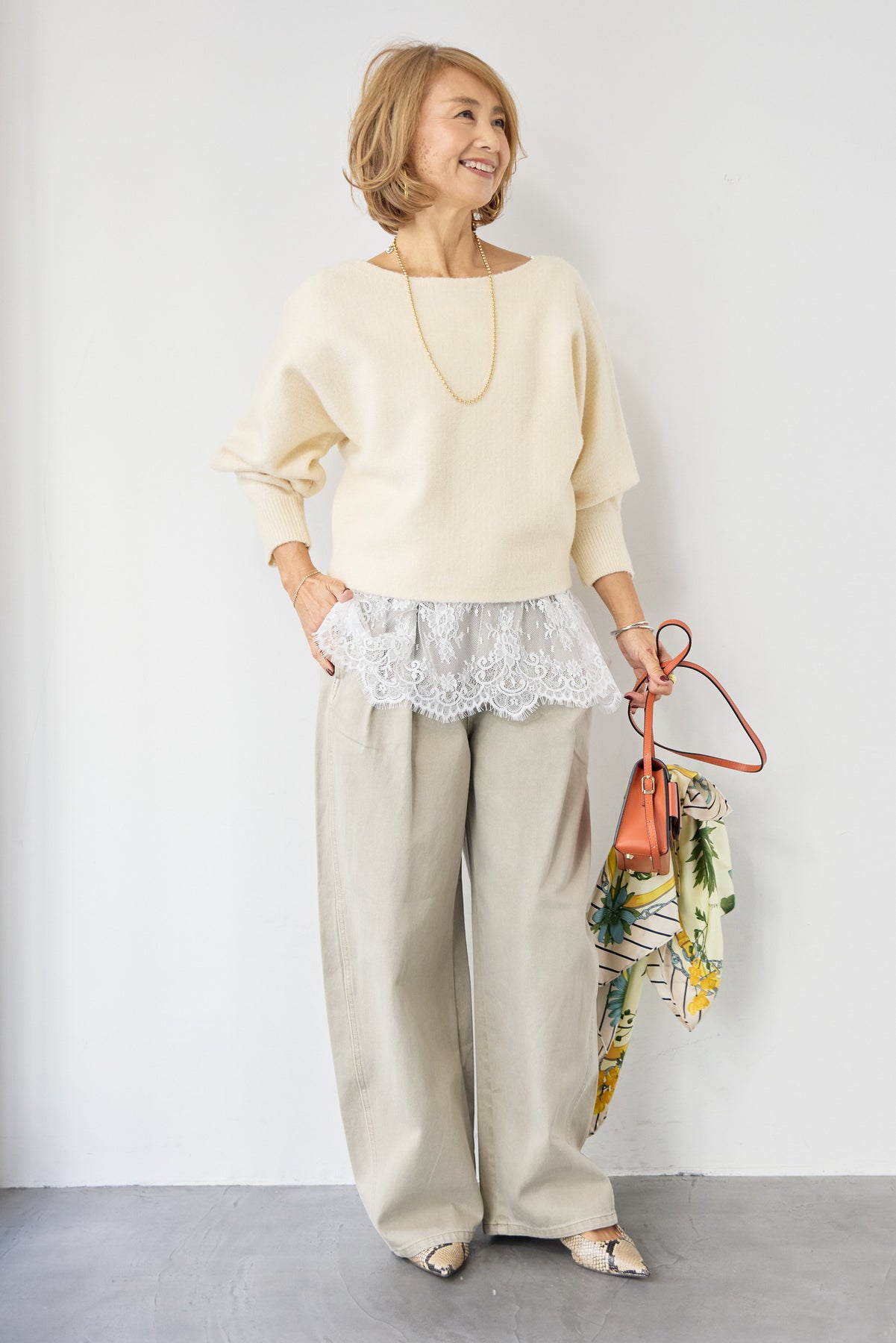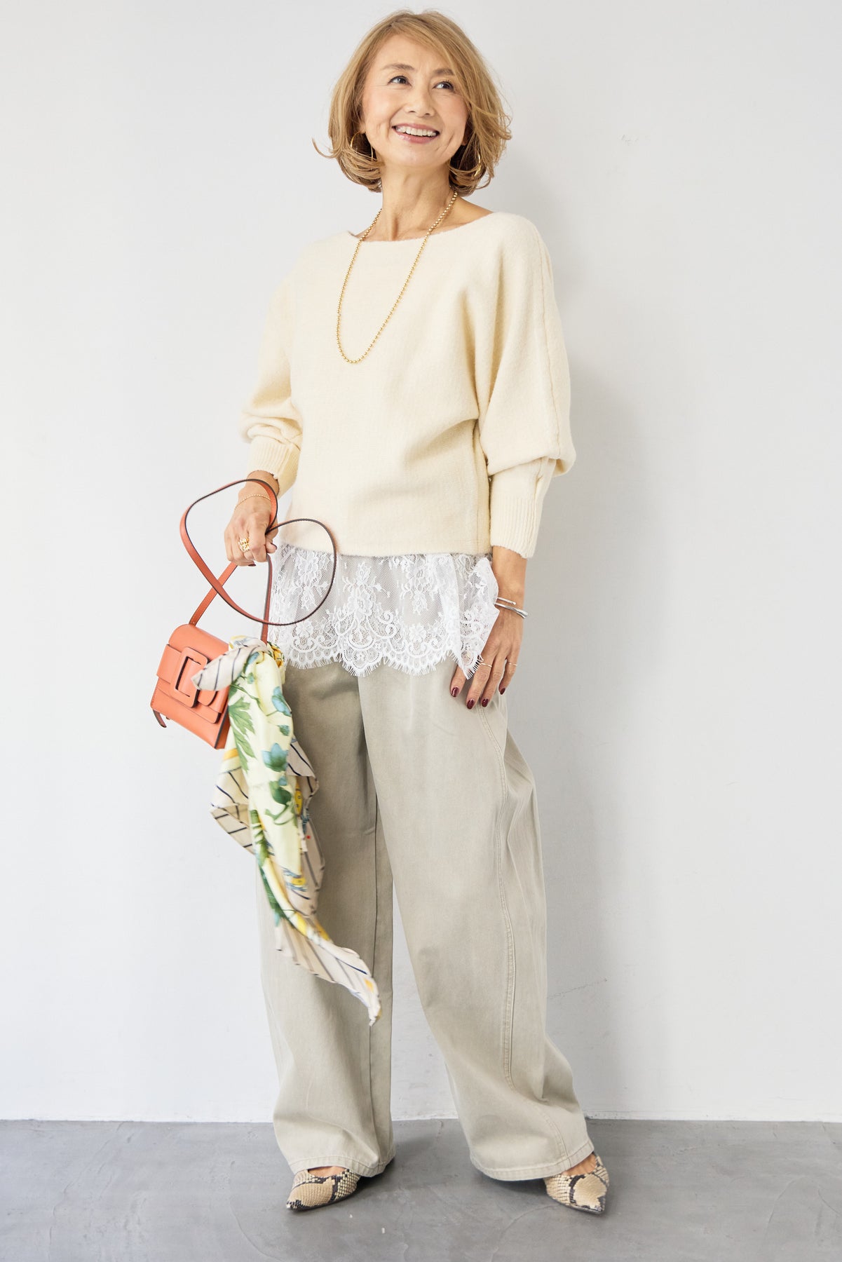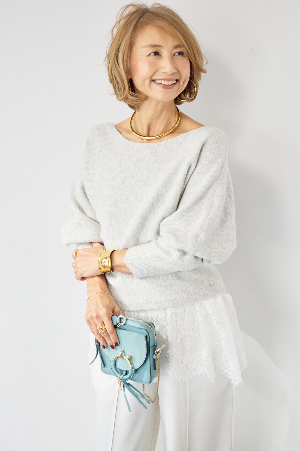 やさしい起毛感が印象的な、シャギー素材のニットプルオーバー。 表面にほどよい毛足を持たせることで、軽やかさと温もりを両立した一枚に仕上がっています。 首元は横に広がるボートネックデザイン。デコルテラインをすっきりと見せつつ、抜け感のある印象に。 身頃は程よくゆとりを持たせ、リラックスした着心地ながらもバランスよくまとまります。 袖には自然な丸みを持たせ、手元はリブで引き締めることで、全体にメリハリをプラス。 ボトムスを選ばず合わせやすく、デイリーから少しきれいめなスタイリングまで幅広く活躍します。 柔らかな風合いを楽しみながら、季節感をさりげなく取り入れられるニットです。
