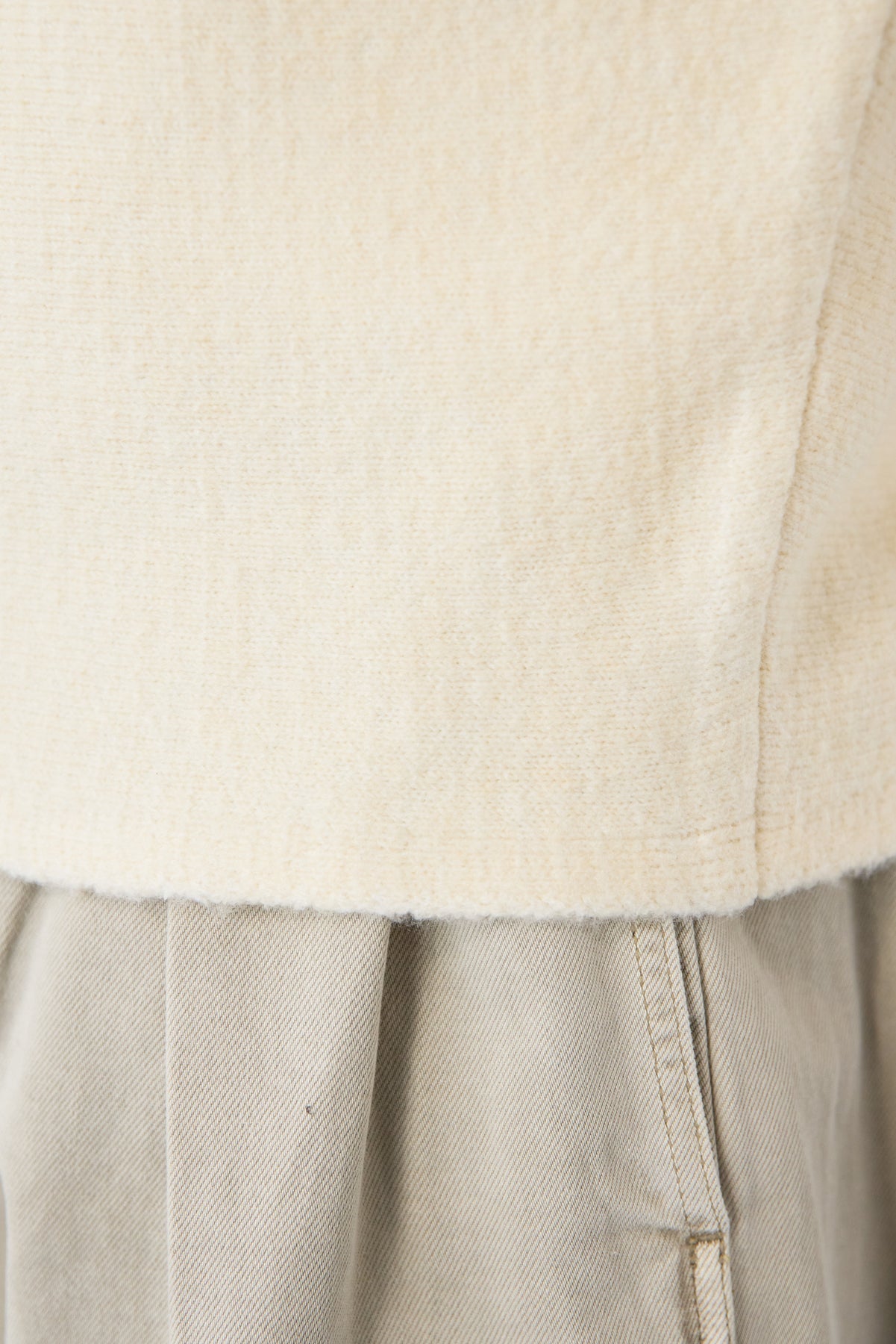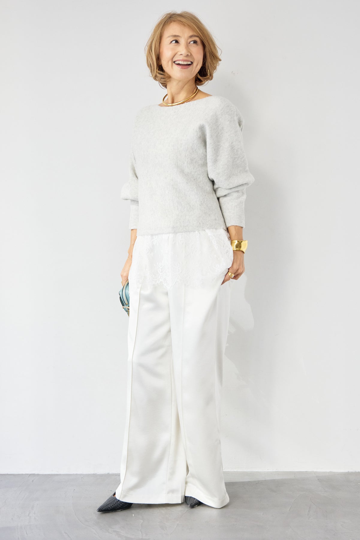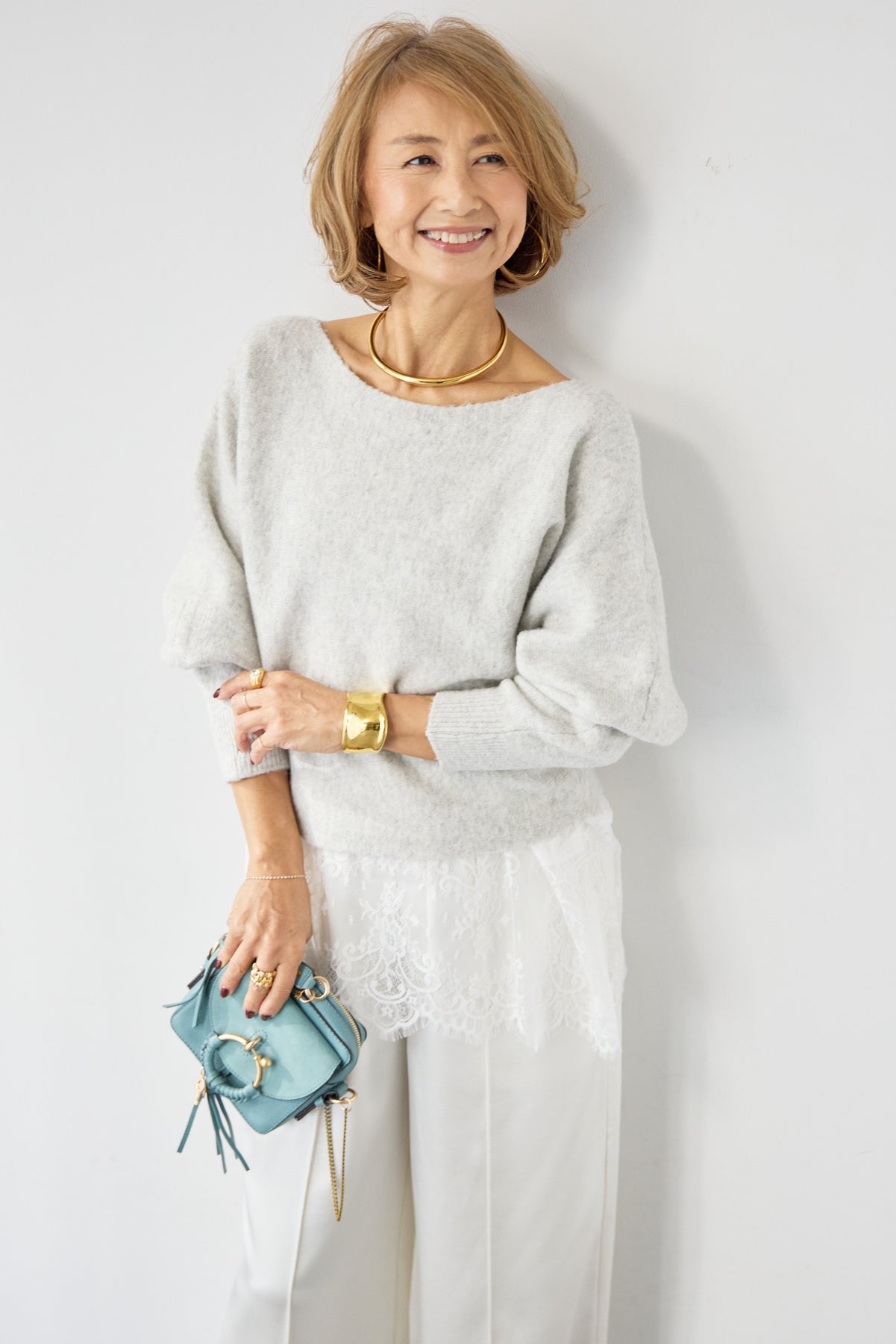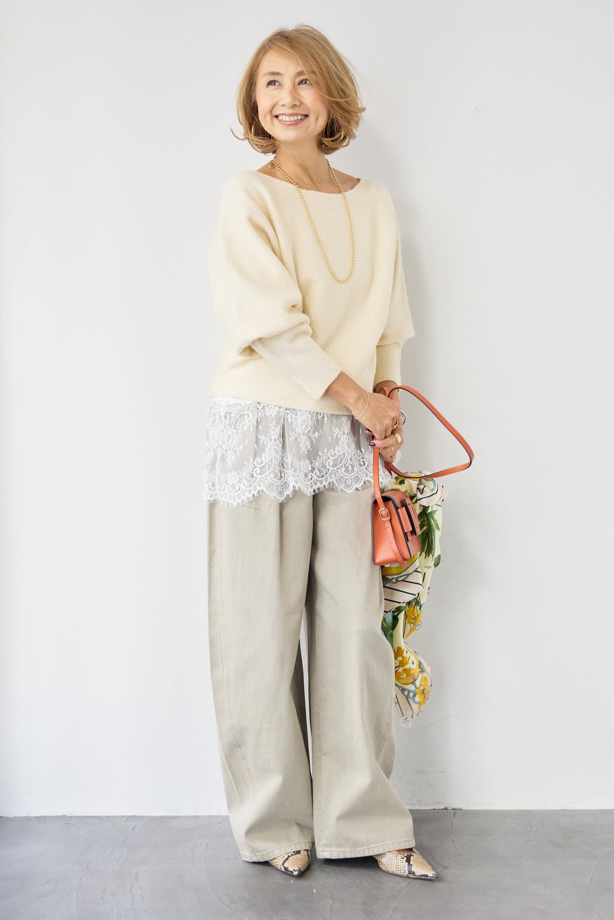 やさしい起毛感が印象的な、シャギー素材のニットプルオーバー。 表面にほどよい毛足を持たせることで、軽やかさと温もりを両立した一枚に仕上がっています。 首元は横に広がるボートネックデザイン。デコルテラインをすっきりと見せつつ、抜け感のある印象に。 身頃は程よくゆとりを持たせ、リラックスした着心地ながらもバランスよくまとまります。 袖には自然な丸みを持たせ、手元はリブで引き締めることで、全体にメリハリをプラス。 ボトムスを選ばず合わせやすく、デイリーから少しきれいめなスタイリングまで幅広く活躍します。 柔らかな風合いを楽しみながら、季節感をさりげなく取り入れられるニットです。