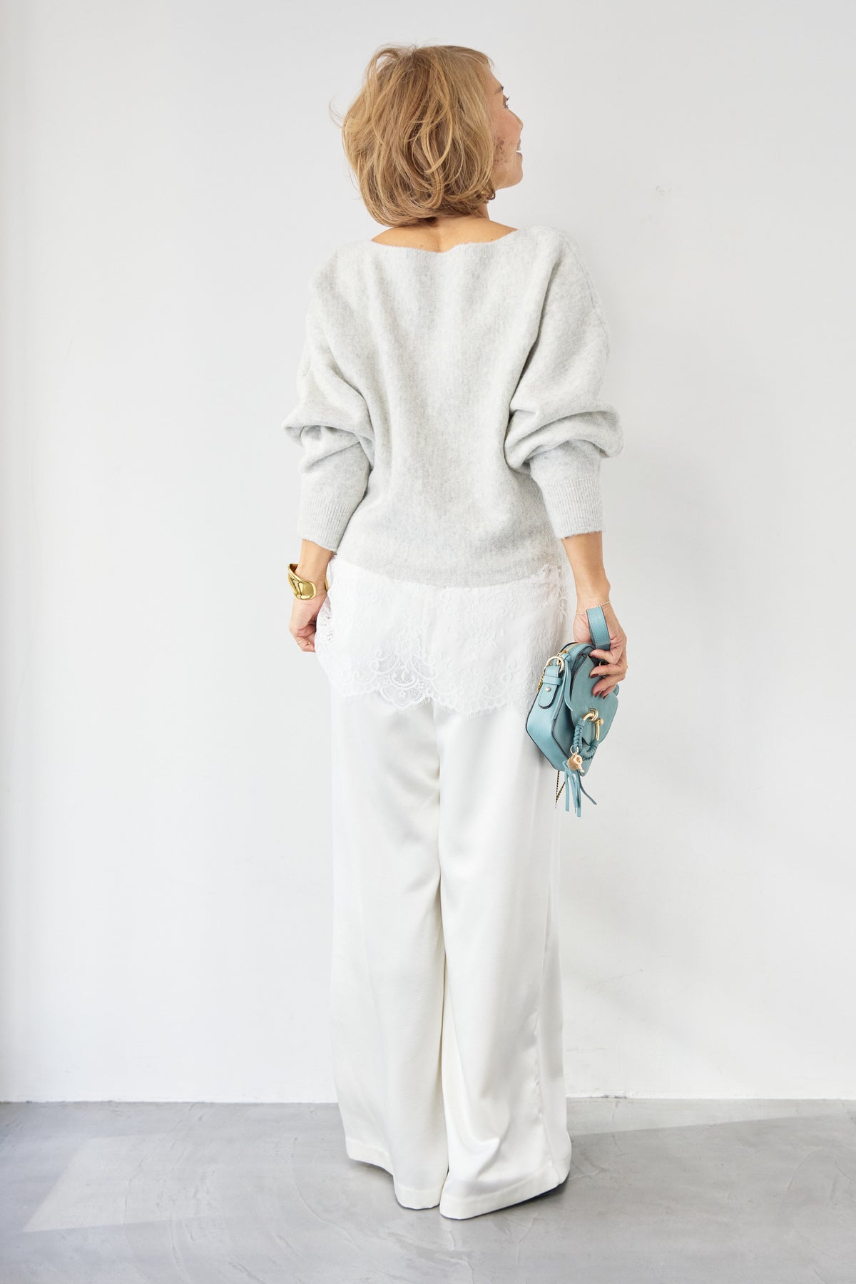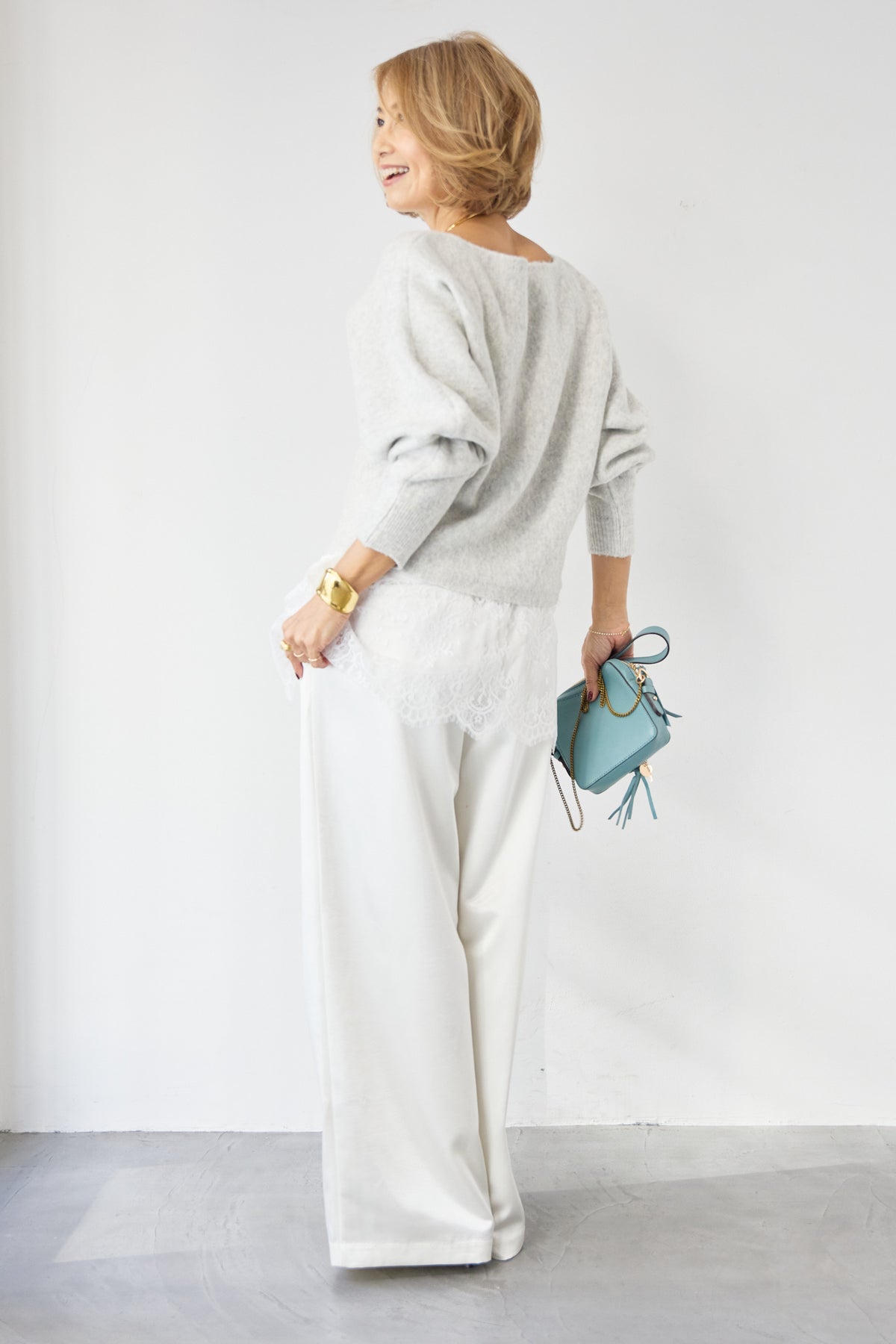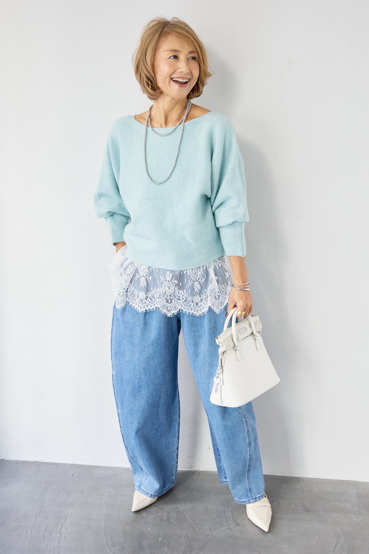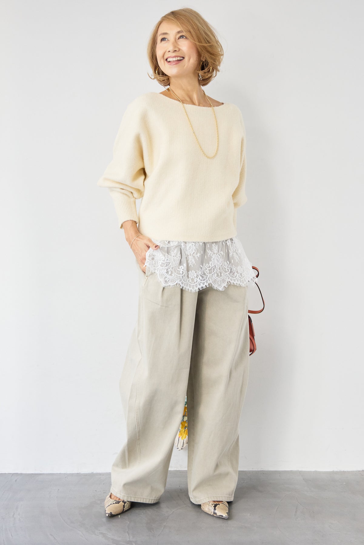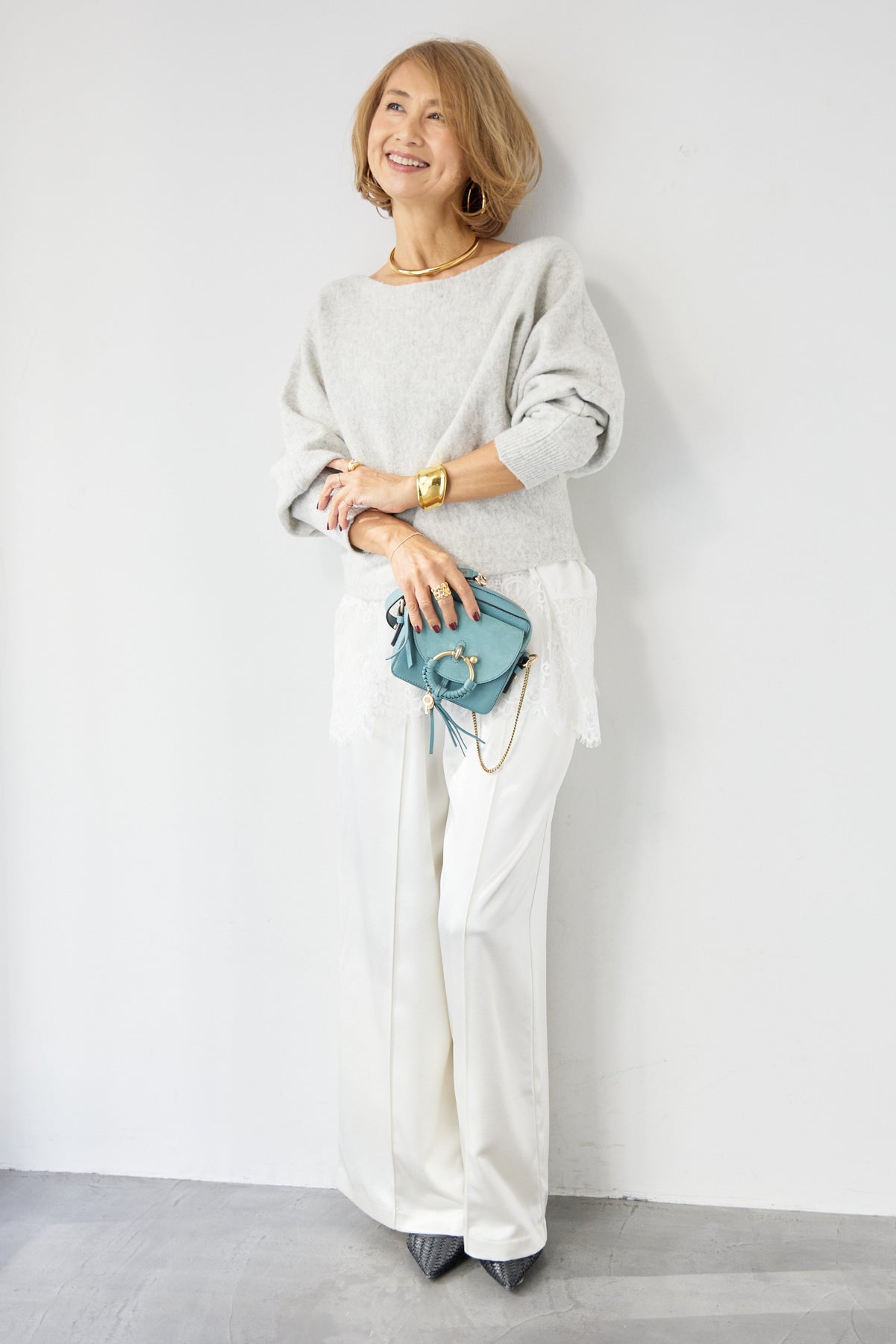 やさしい起毛感が印象的な、シャギー素材のニットプルオーバー。 表面にほどよい毛足を持たせることで、軽やかさと温もりを両立した一枚に仕上がっています。 首元は横に広がるボートネックデザイン。デコルテラインをすっきりと見せつつ、抜け感のある印象に。 身頃は程よくゆとりを持たせ、リラックスした着心地ながらもバランスよくまとまります。 袖には自然な丸みを持たせ、手元はリブで引き締めることで、全体にメリハリをプラス。 ボトムスを選ばず合わせやすく、デイリーから少しきれいめなスタイリングまで幅広く活躍します。 柔らかな風合いを楽しみながら、季節感をさりげなく取り入れられるニットです。