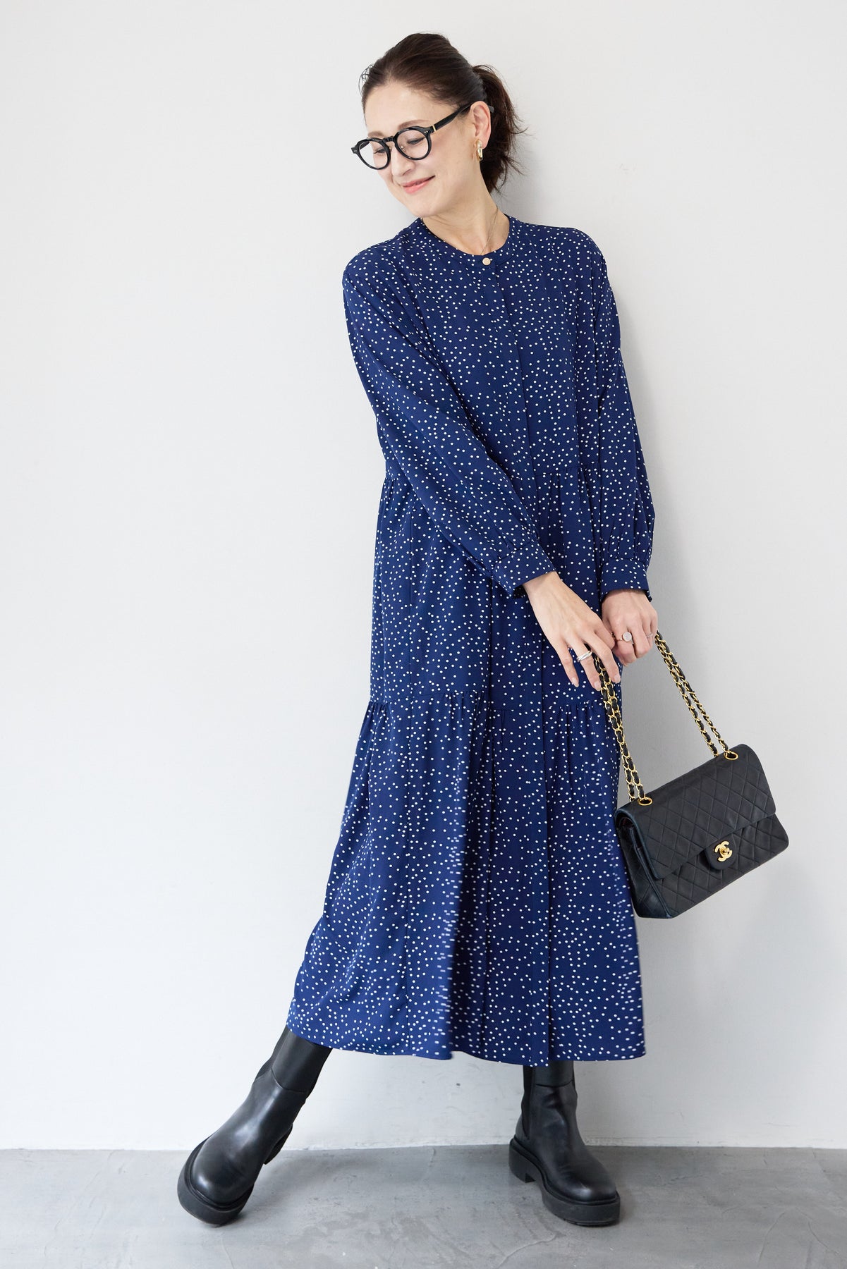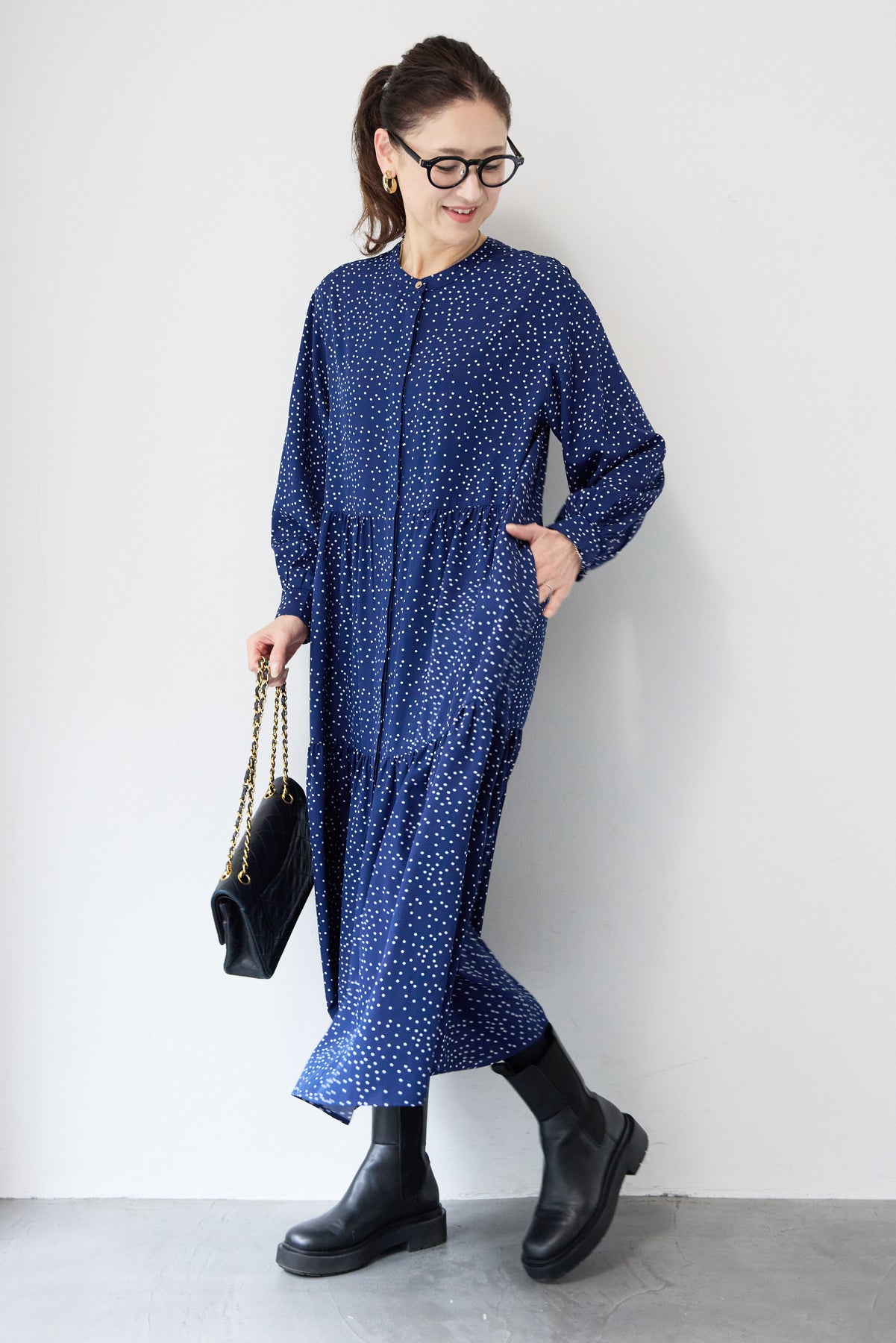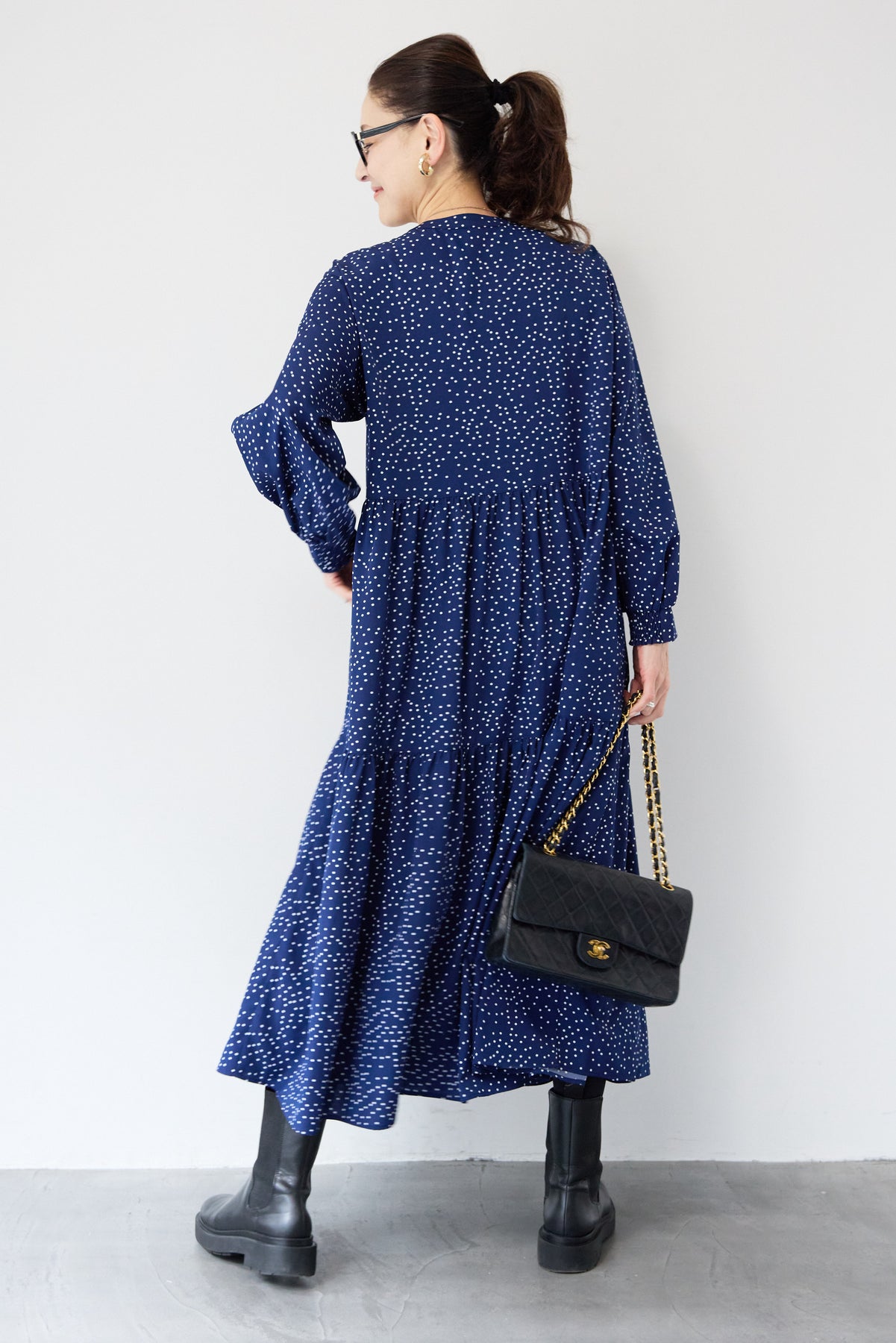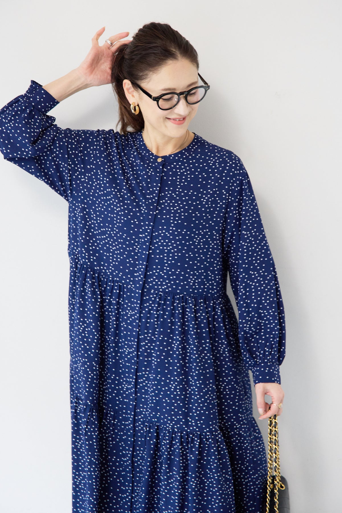 細やかなドット柄が上品な印象を与える、大人フェミニンなティアードワンピース。落ち着いたネイビーベースにホワイトドットを散りばめ、甘さを抑えつつも華やかさのある一枚に仕上げました。ウエスト位置から切り替えたティアードデザインが、自然な立体感と動くたびに揺れる美しいシルエットを演出。身体のラインを拾いにくく、リラックス感がありながらもきちんと見えを叶えます。首元はすっきりとしたラウンドネックに、フロントは比翼仕様で上品な印象。袖口にはギャザーを施し、さりげないボリューム感が女性らしさをプラスします。便利なサイドポケット付きで、実用性も◎。