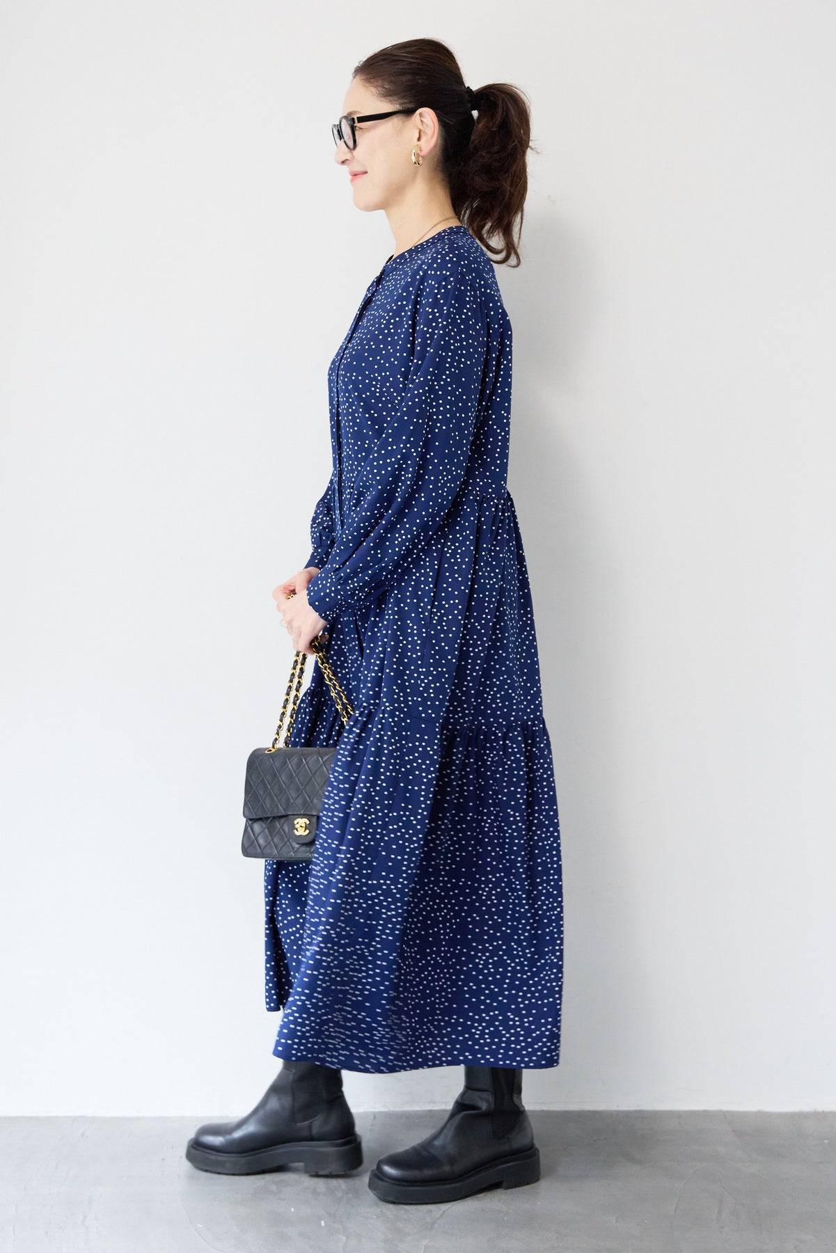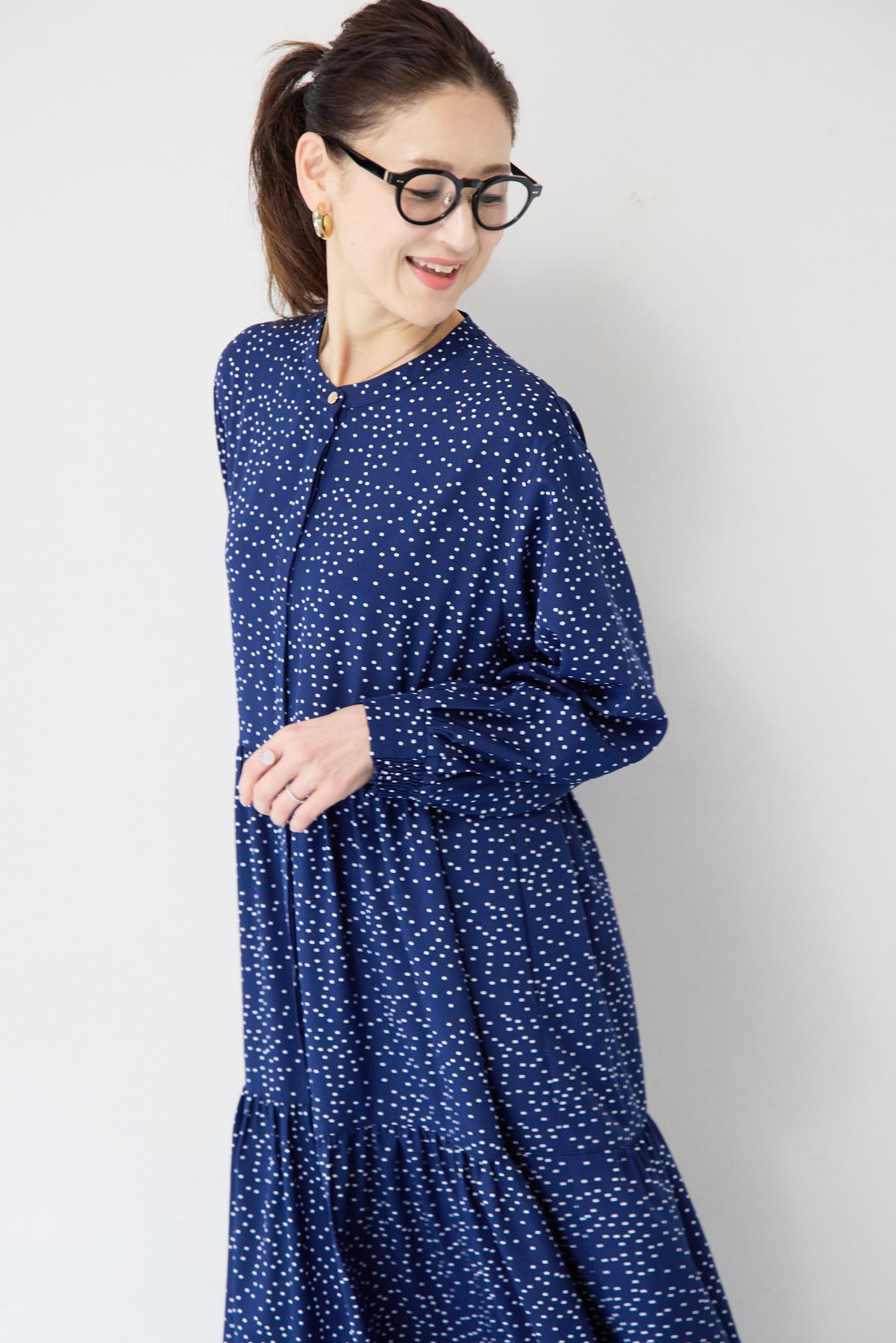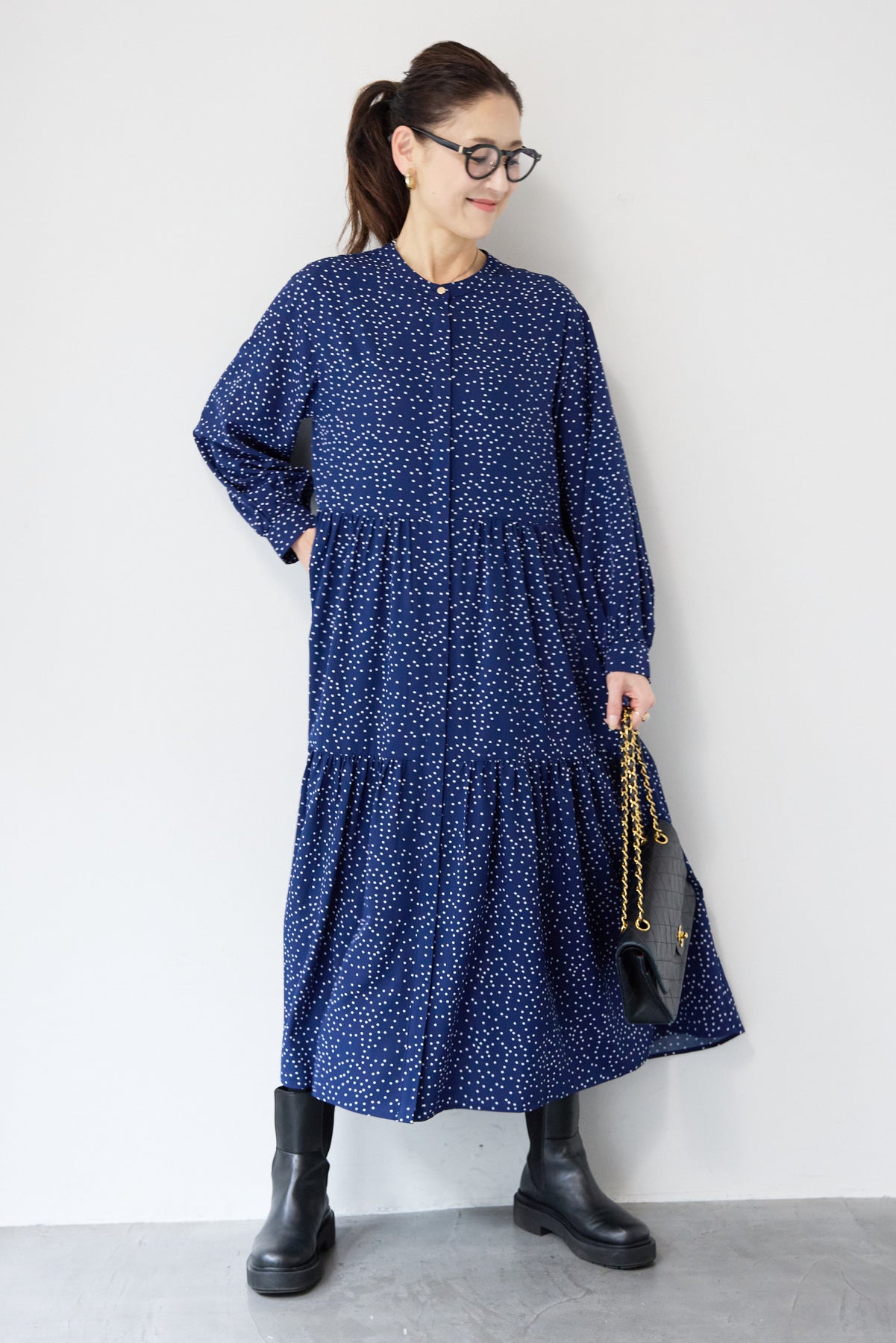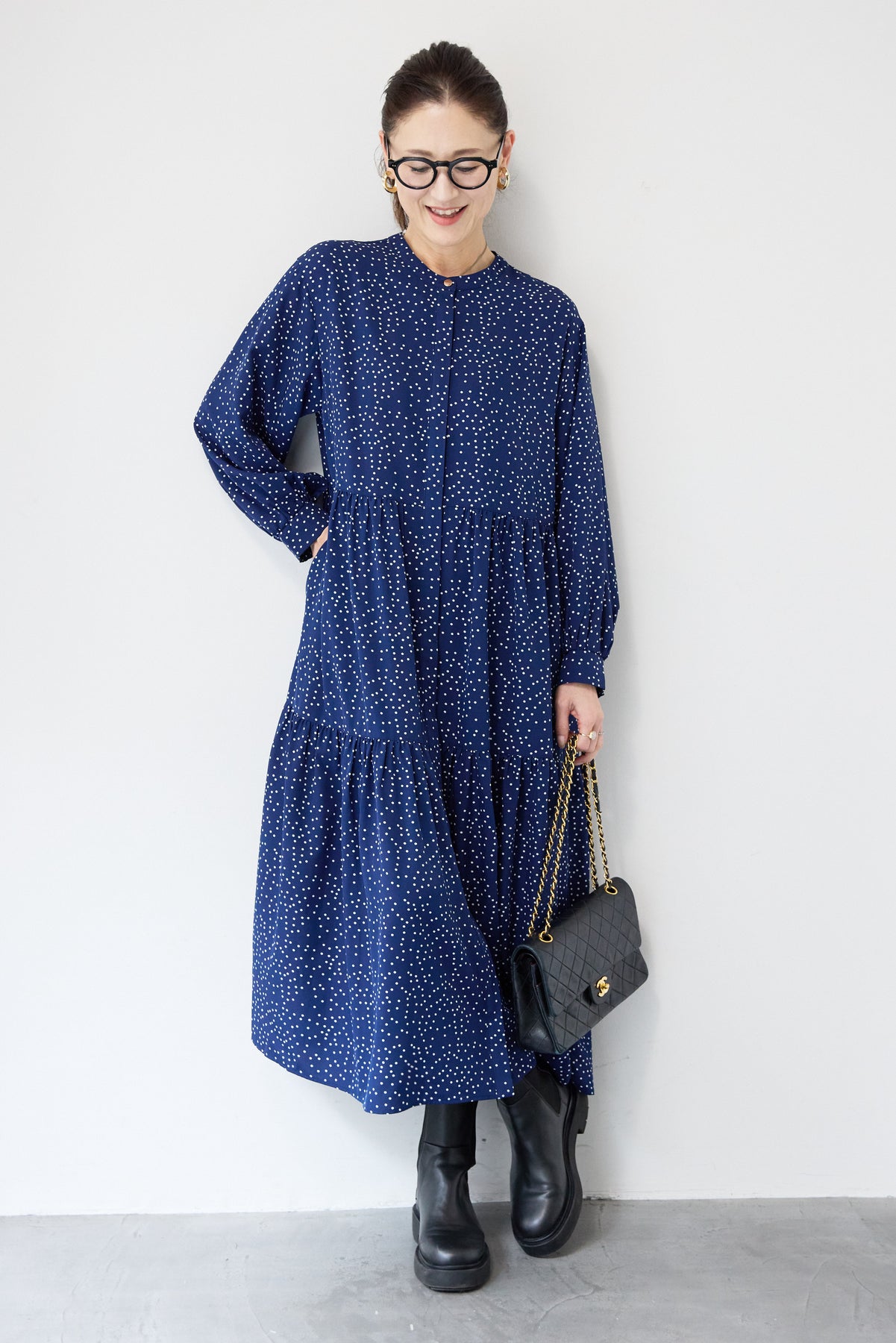 細やかなドット柄が上品な印象を与える、大人フェミニンなティアードワンピース。落ち着いたネイビーベースにホワイトドットを散りばめ、甘さを抑えつつも華やかさのある一枚に仕上げました。ウエスト位置から切り替えたティアードデザインが、自然な立体感と動くたびに揺れる美しいシルエットを演出。身体のラインを拾いにくく、リラックス感がありながらもきちんと見えを叶えます。首元はすっきりとしたラウンドネックに、フロントは比翼仕様で上品な印象。袖口にはギャザーを施し、さりげないボリューム感が女性らしさをプラスします。便利なサイドポケット付きで、実用性も◎。