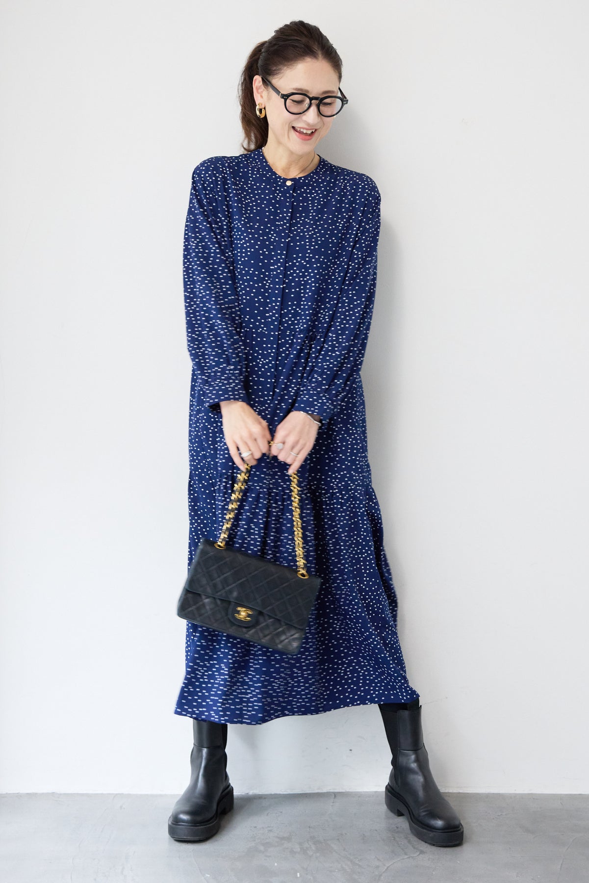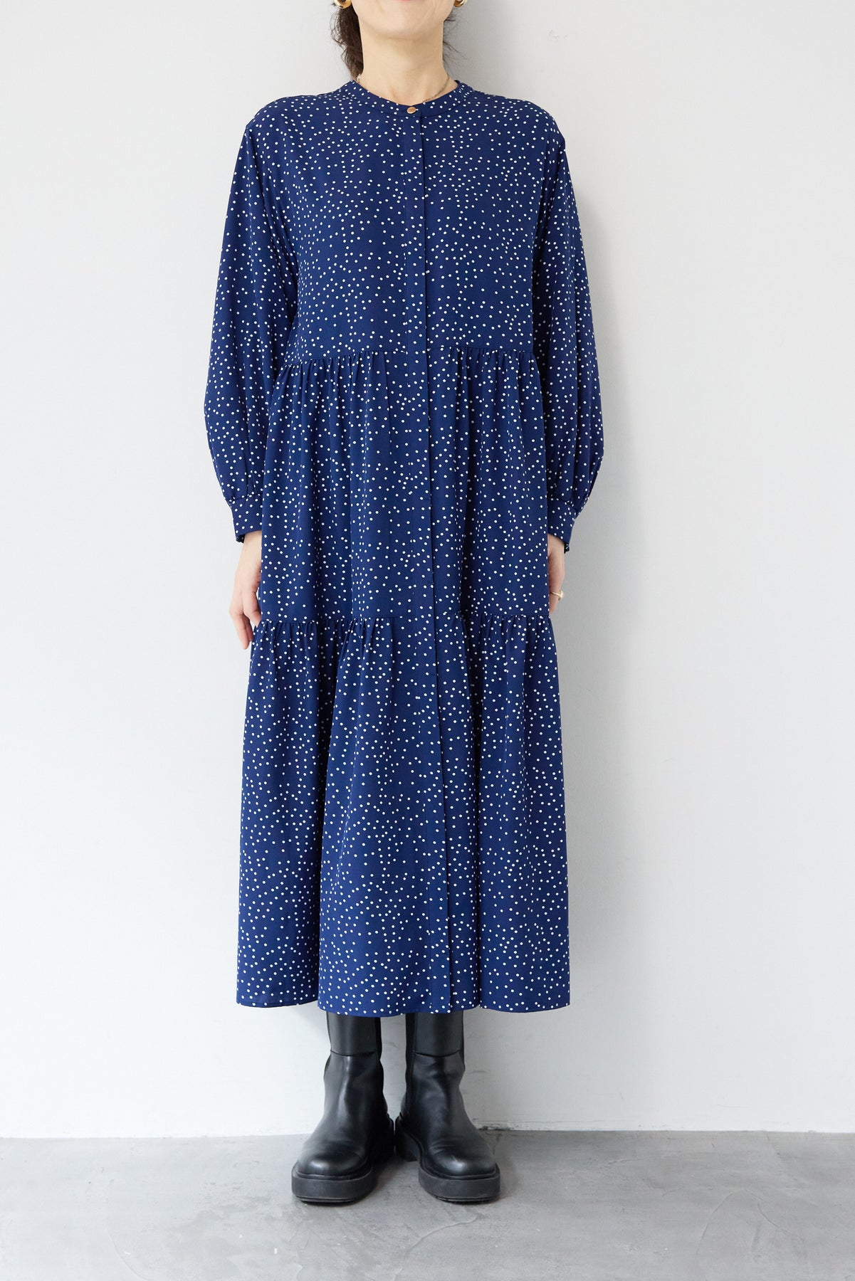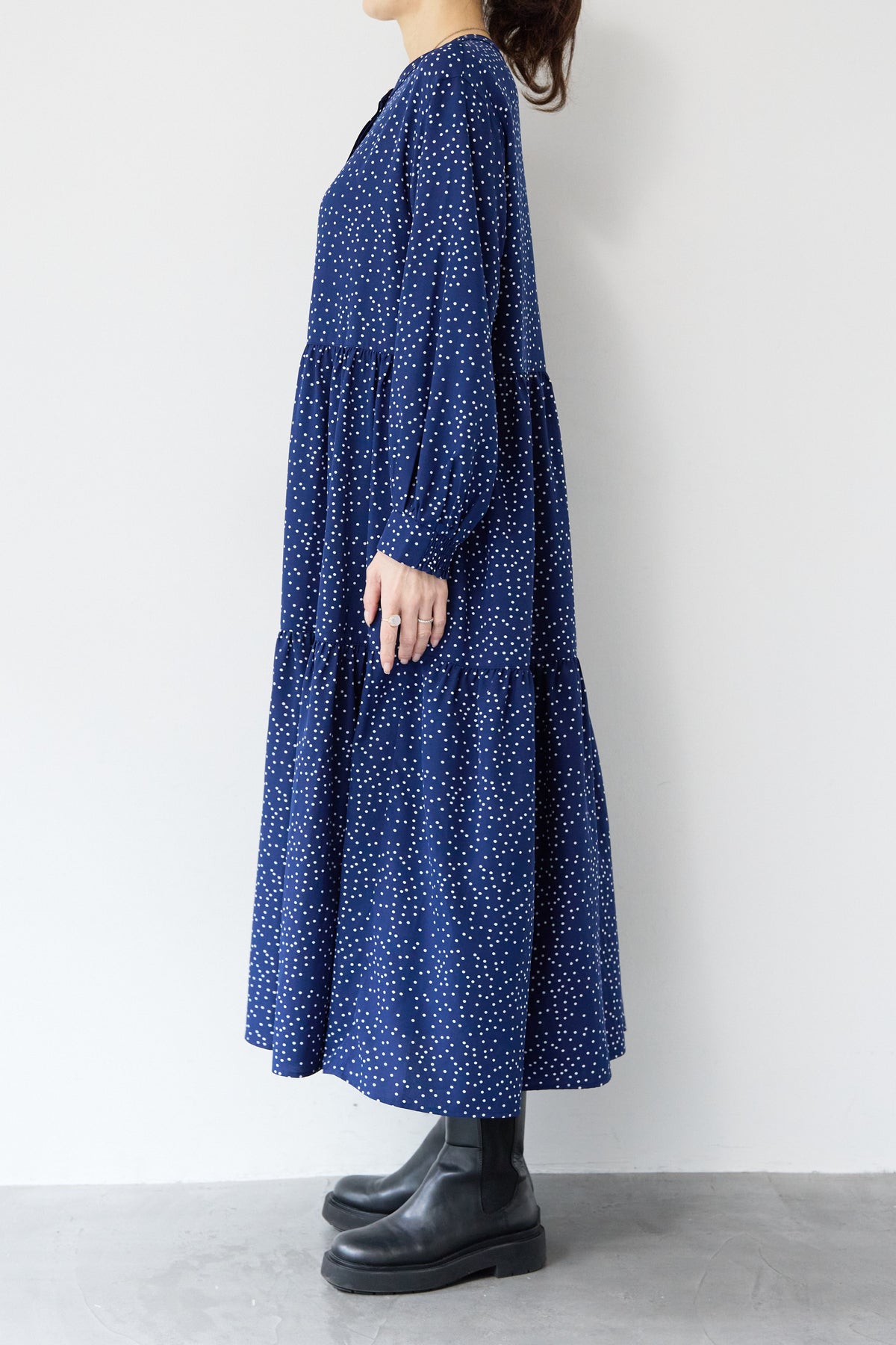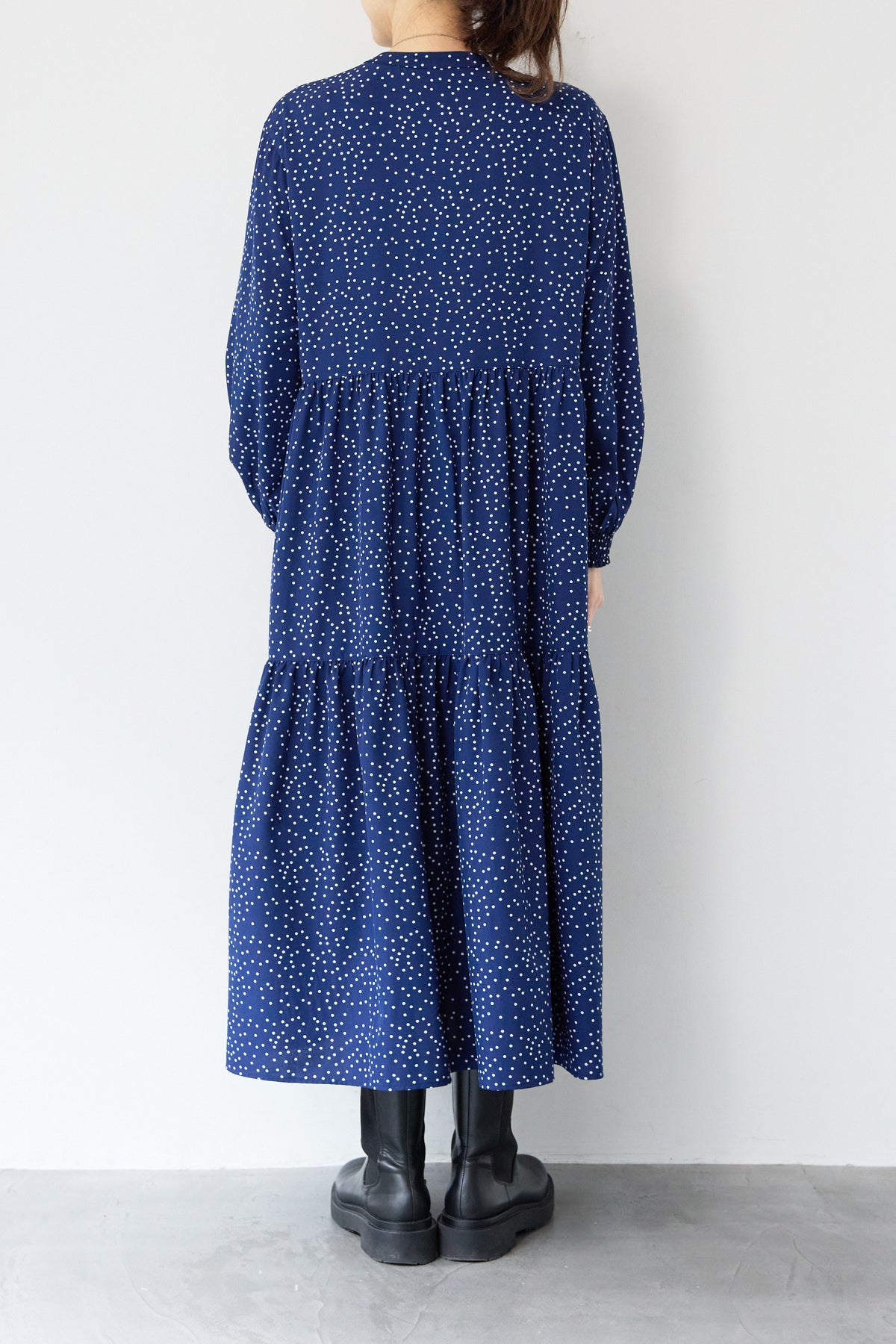 細やかなドット柄が上品な印象を与える、大人フェミニンなティアードワンピース。落ち着いたネイビーベースにホワイトドットを散りばめ、甘さを抑えつつも華やかさのある一枚に仕上げました。ウエスト位置から切り替えたティアードデザインが、自然な立体感と動くたびに揺れる美しいシルエットを演出。身体のラインを拾いにくく、リラックス感がありながらもきちんと見えを叶えます。首元はすっきりとしたラウンドネックに、フロントは比翼仕様で上品な印象。袖口にはギャザーを施し、さりげないボリューム感が女性らしさをプラスします。便利なサイドポケット付きで、実用性も◎。