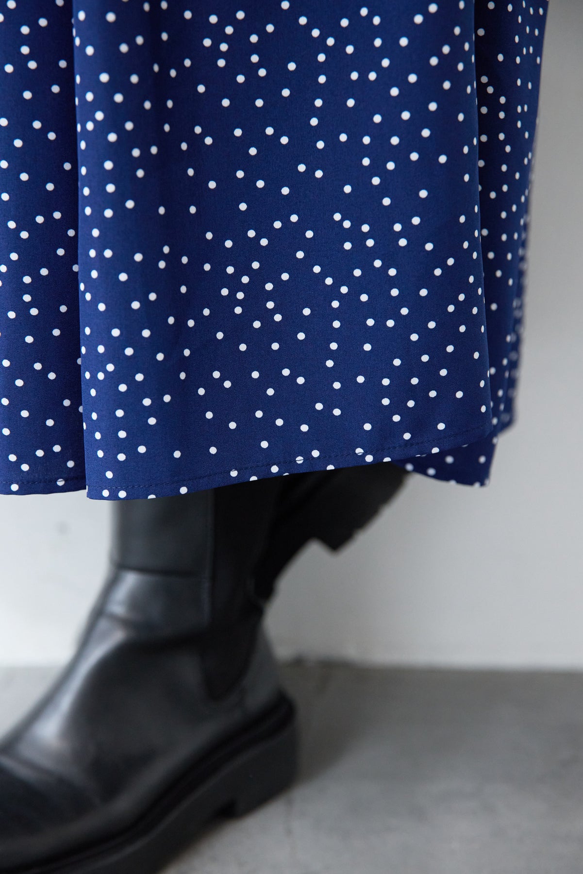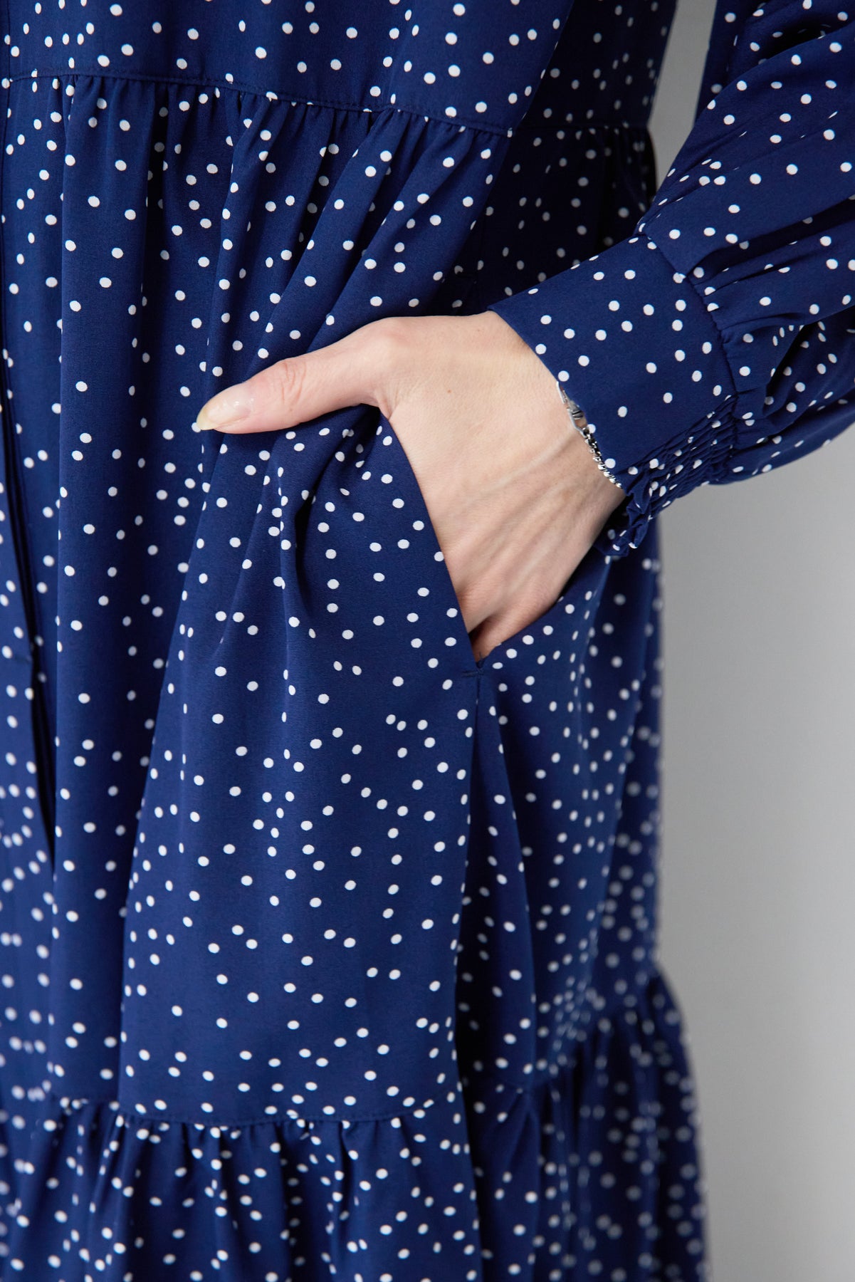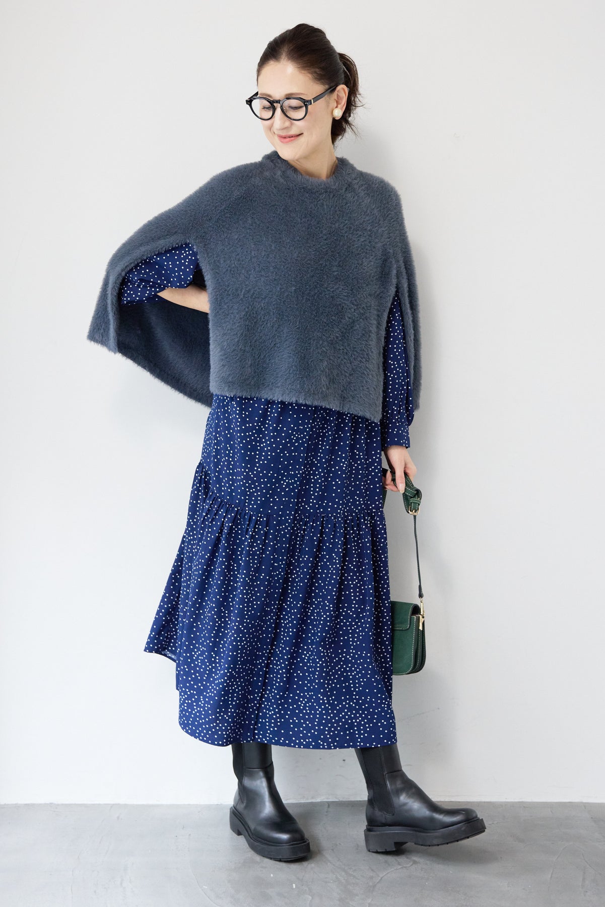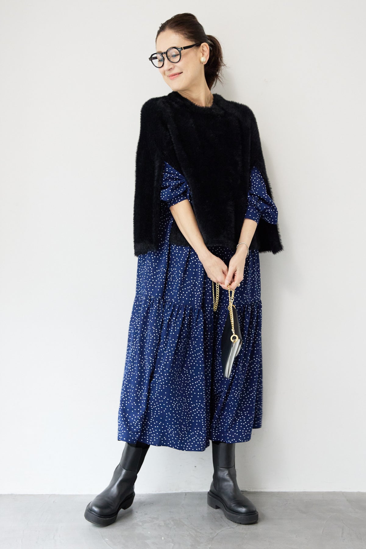 細やかなドット柄が上品な印象を与える、大人フェミニンなティアードワンピース。落ち着いたネイビーベースにホワイトドットを散りばめ、甘さを抑えつつも華やかさのある一枚に仕上げました。ウエスト位置から切り替えたティアードデザインが、自然な立体感と動くたびに揺れる美しいシルエットを演出。身体のラインを拾いにくく、リラックス感がありながらもきちんと見えを叶えます。首元はすっきりとしたラウンドネックに、フロントは比翼仕様で上品な印象。袖口にはギャザーを施し、さりげないボリューム感が女性らしさをプラスします。便利なサイドポケット付きで、実用性も◎。