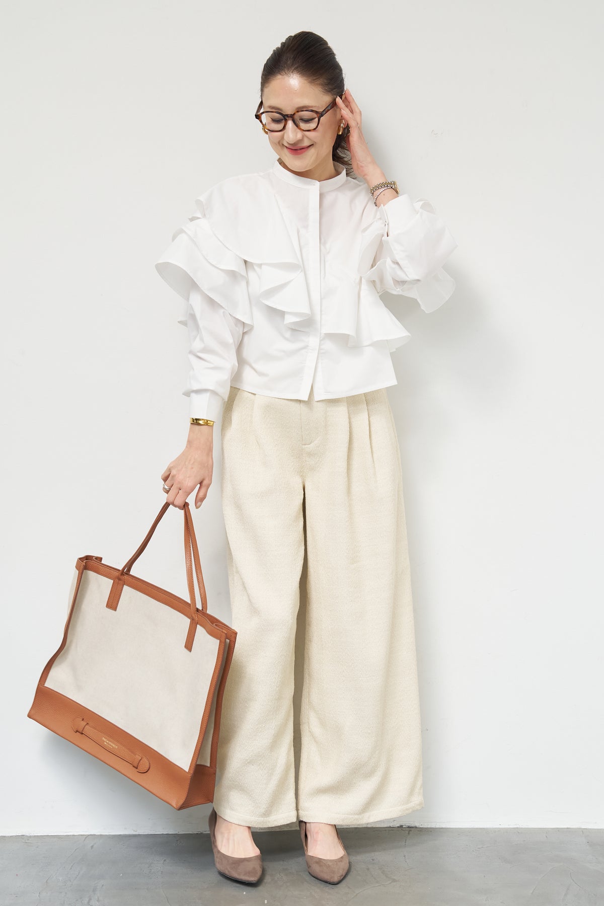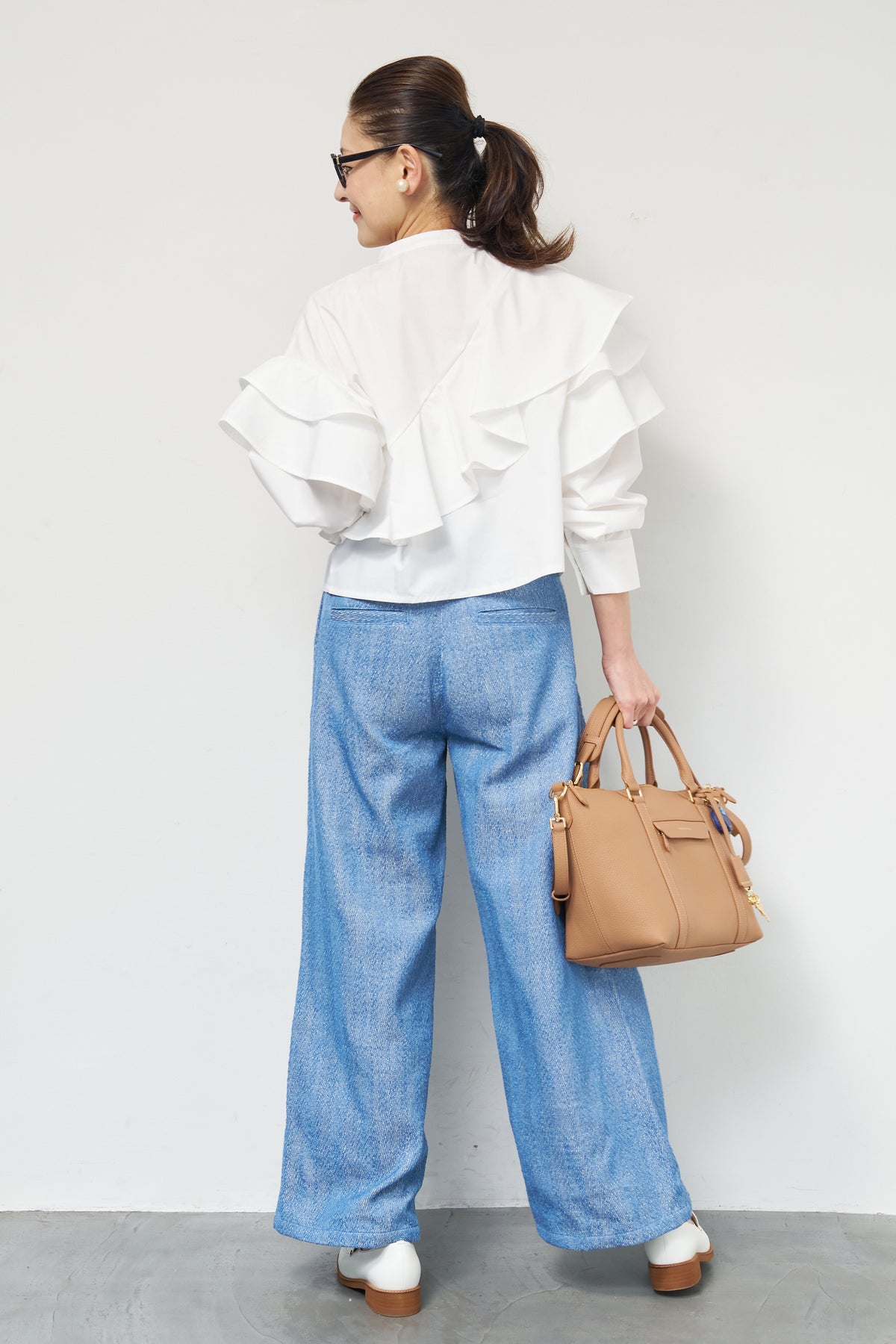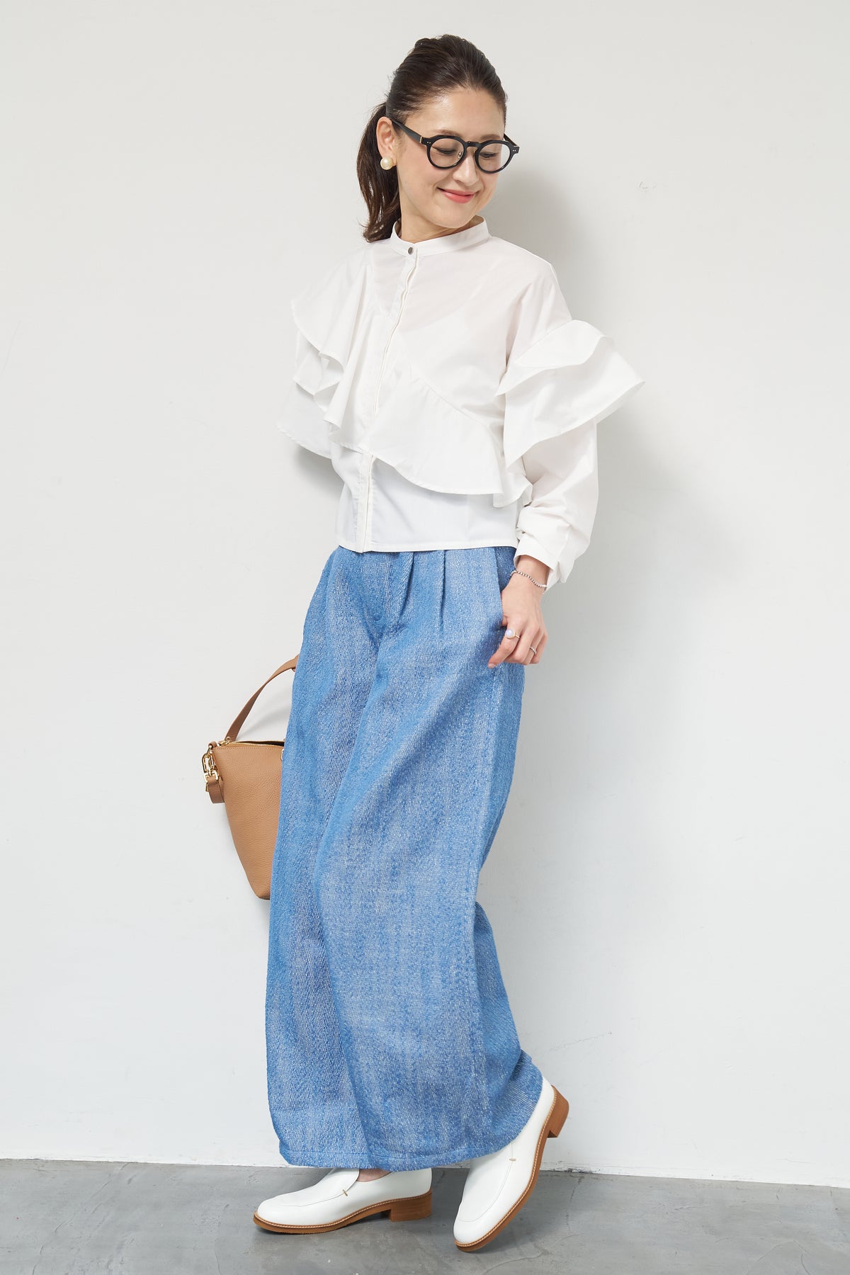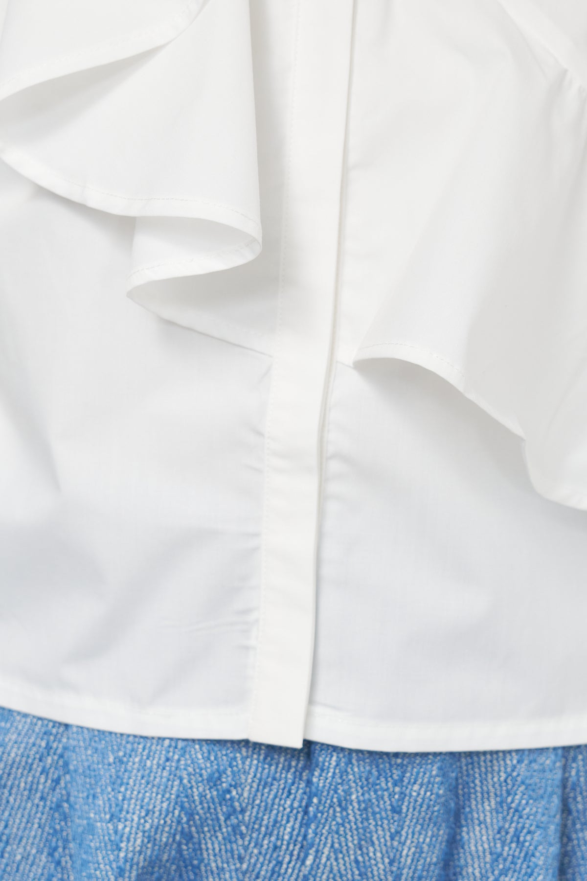 ショートアシメラッフルシャツ/デニムライクヘリンボーンパンツ