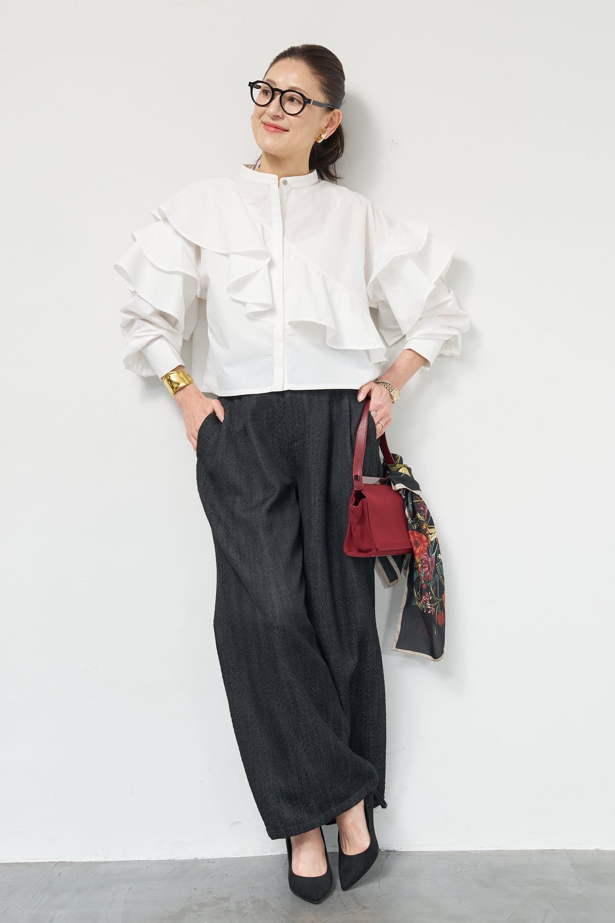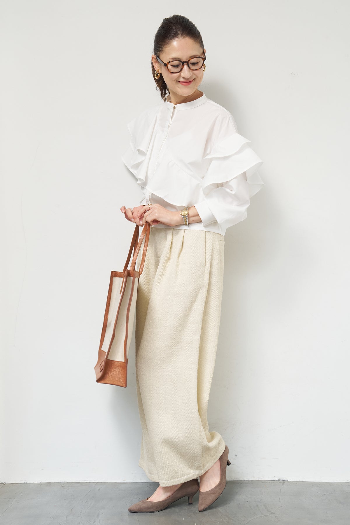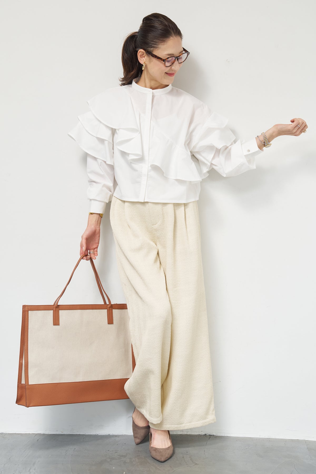 ショートアシメラッフルシャツ/デニムライクヘリンボーンパンツ