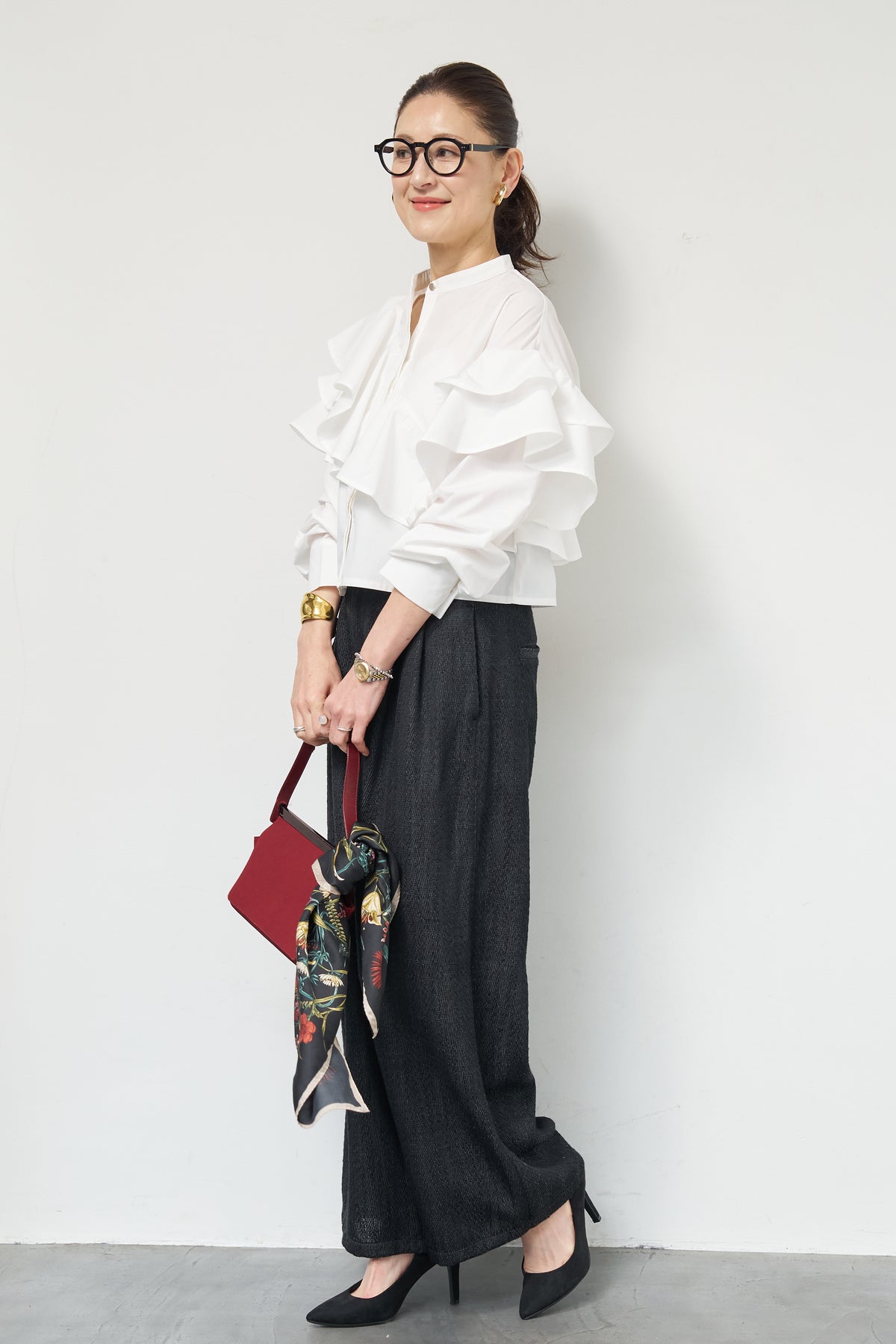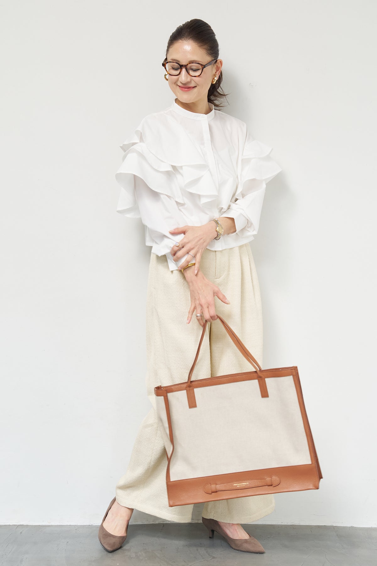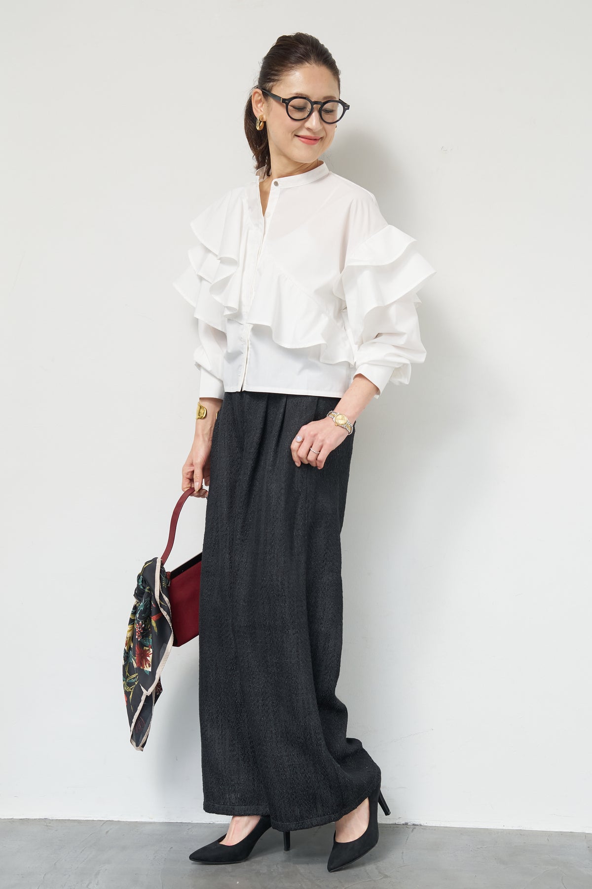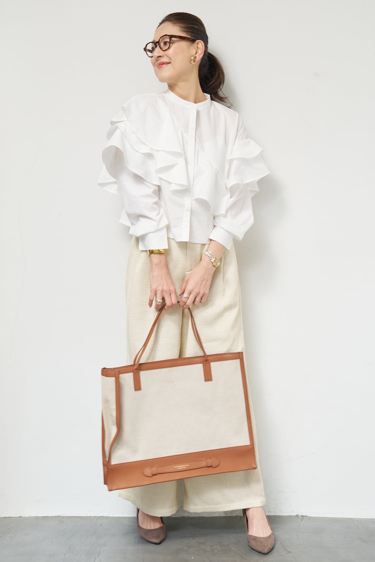 ショートアシメラッフルシャツ/デニムライクヘリンボーンパンツ