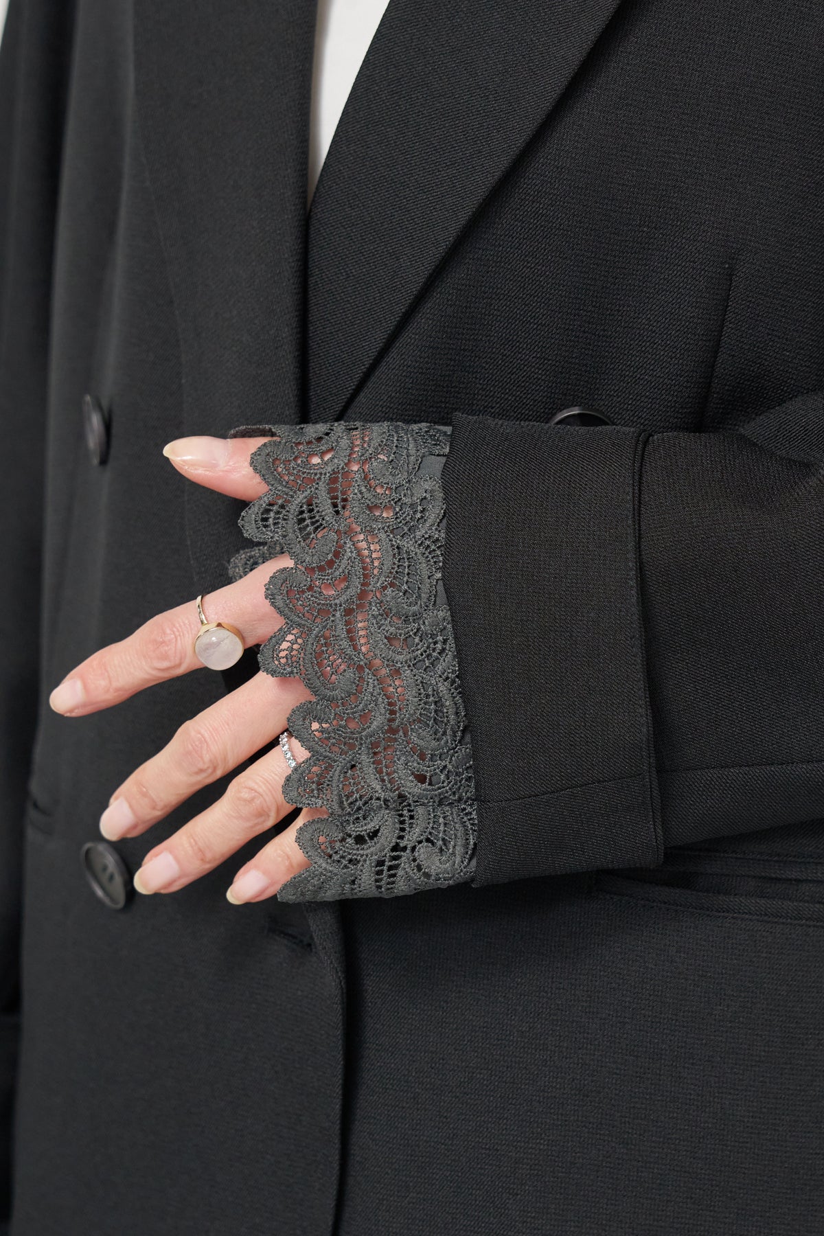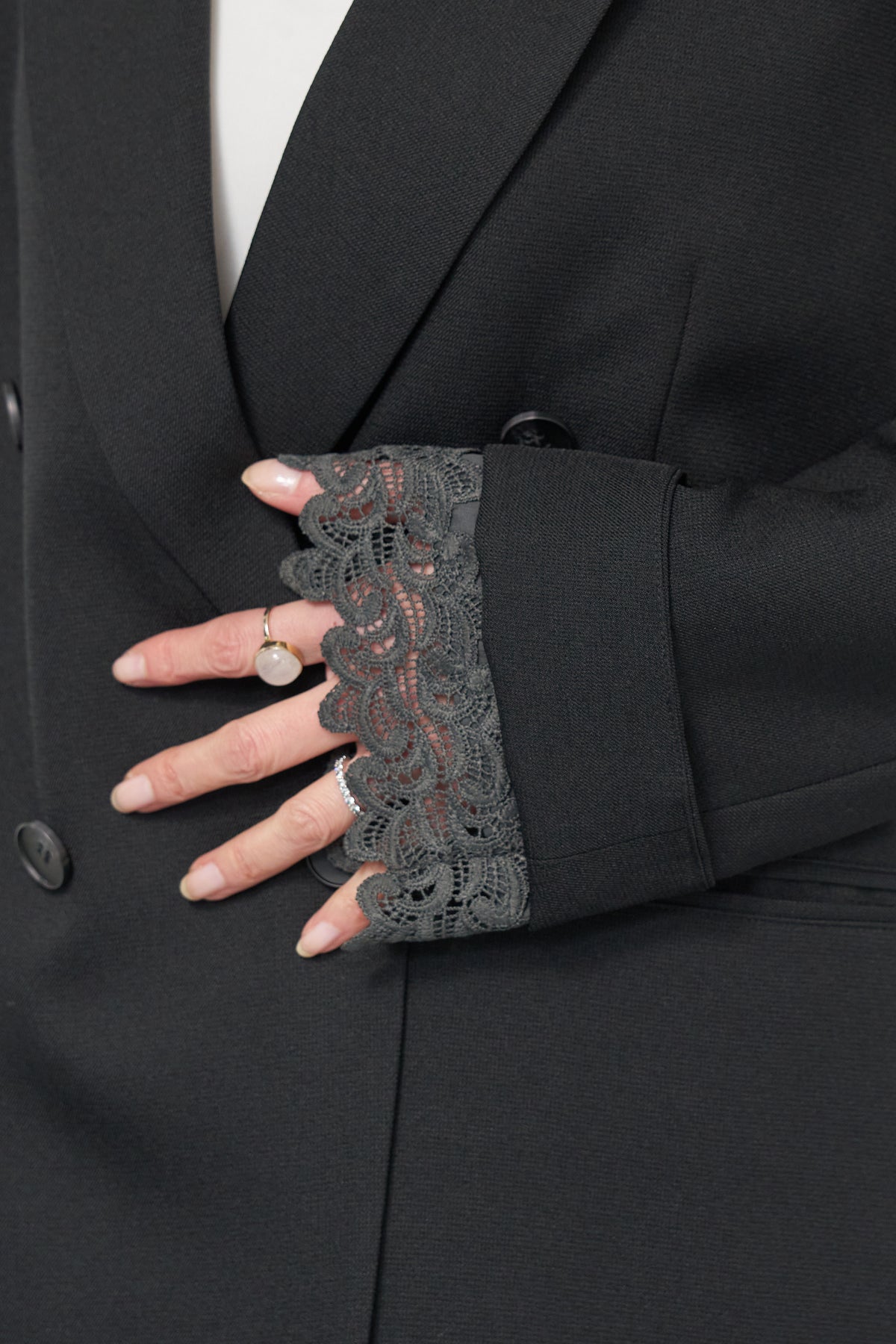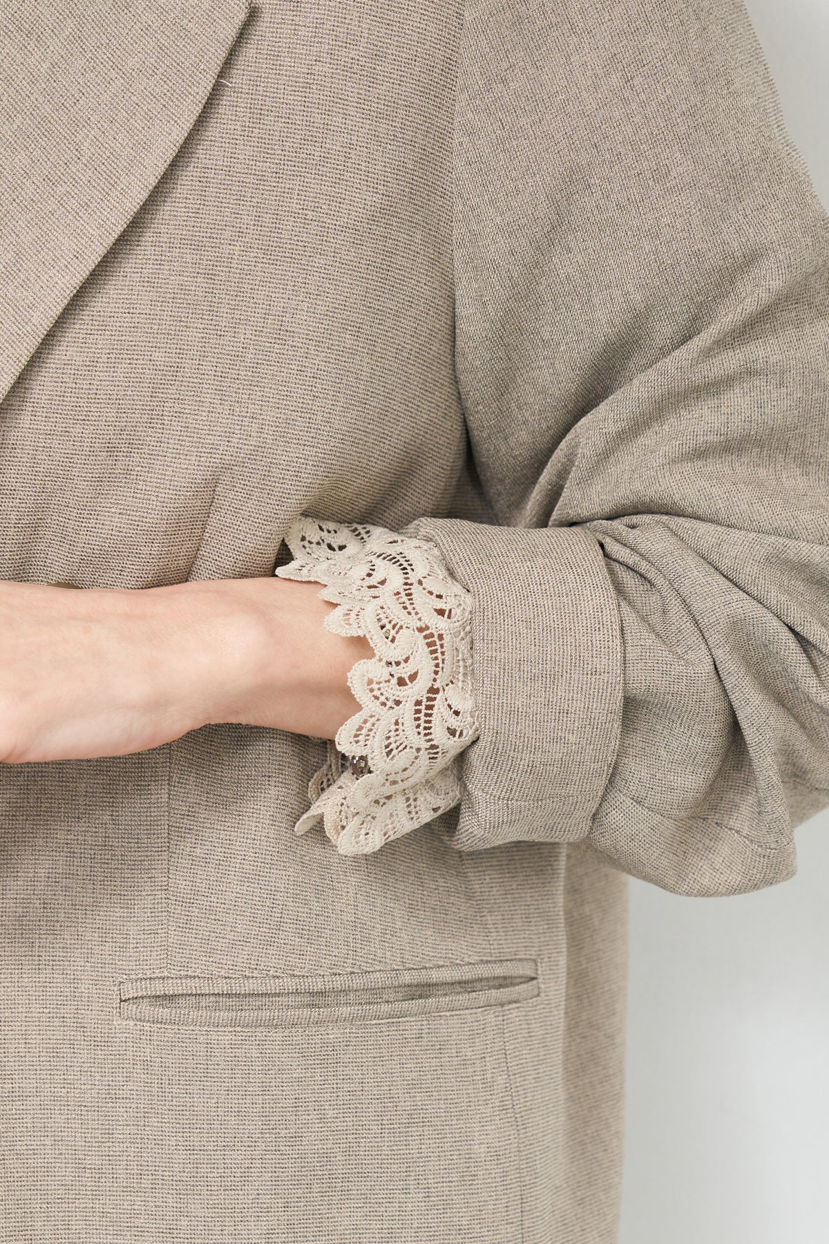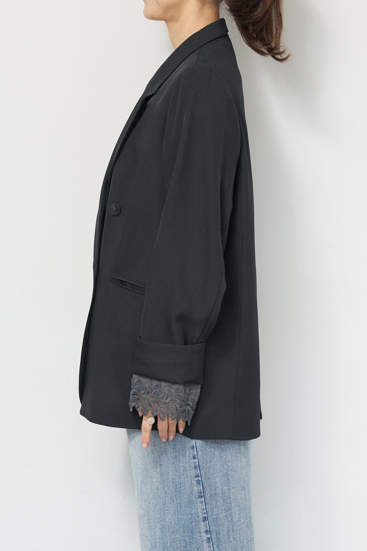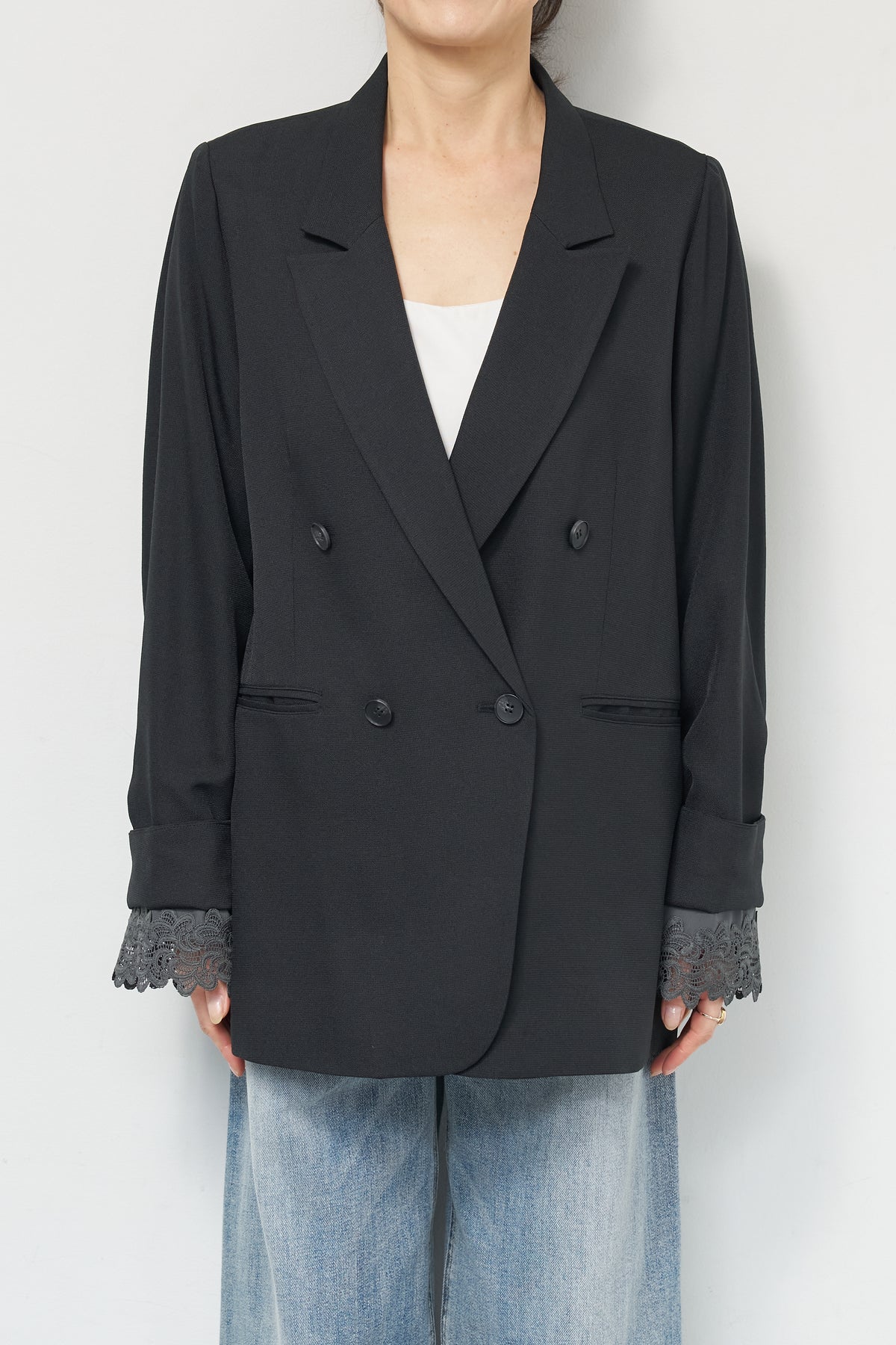 マニッシュなダブルブレストに、繊細なレースディテールを添えた大人のためのジャケット。きちんと感のあるテーラードデザインに、袖口から覗くレースが女性らしい抜け感を演出します。程よくゆとりのあるシルエットで、羽織るだけでこなれた印象に。デニムと合わせたカジュアルミックスはもちろん、きれいめボトムやワンピースの上に羽織れば、オンシーンにも対応可能です。袖はロールアップしてレースを際立たせる着こなしもおすすめ。シンプルながらもディテールにこだわった一着で、いつものスタイリングをワンランクアップしてくれます。