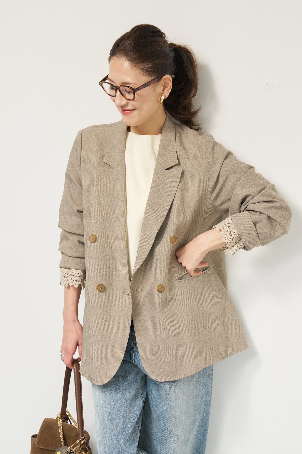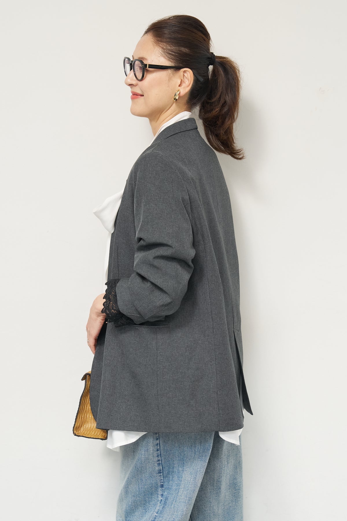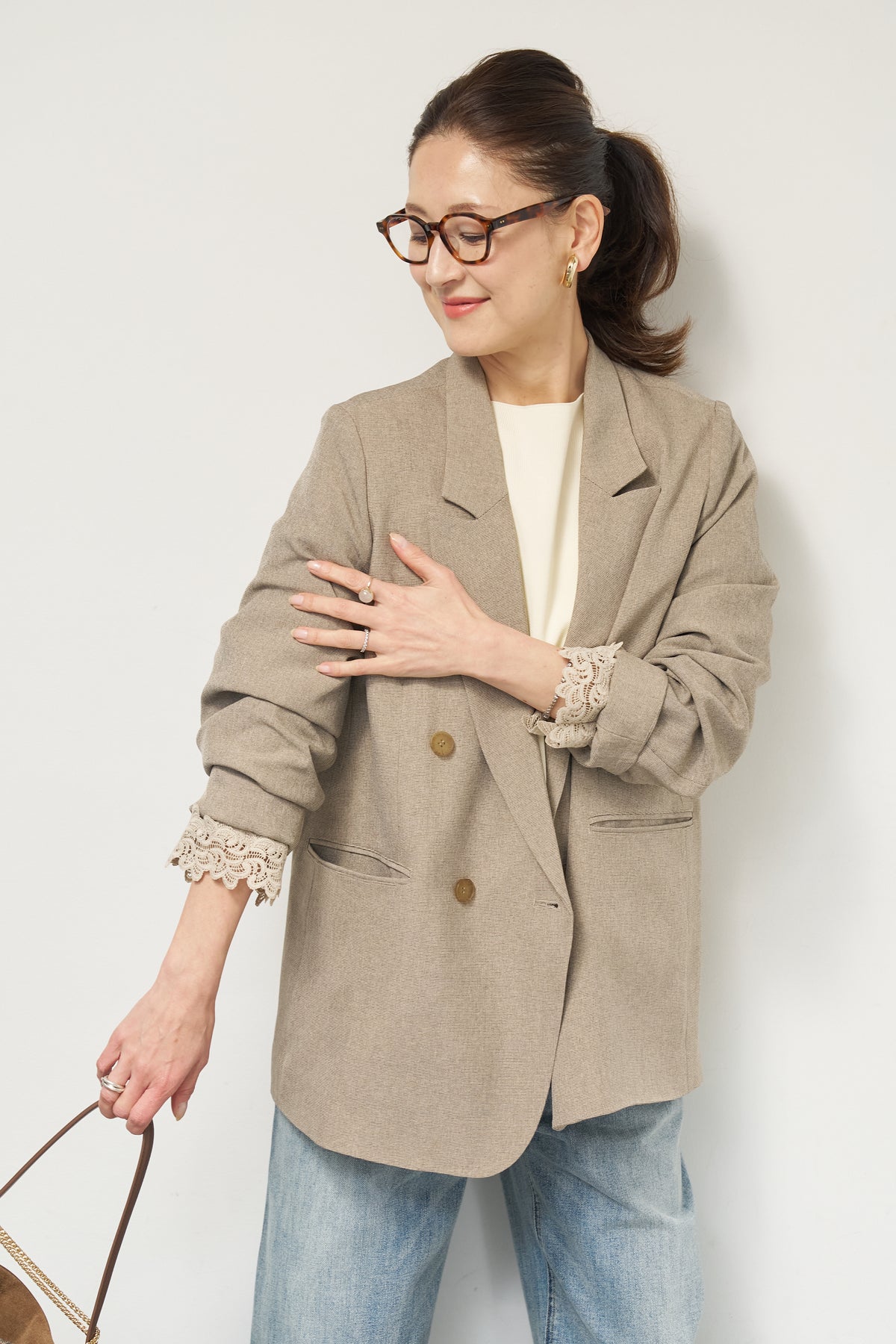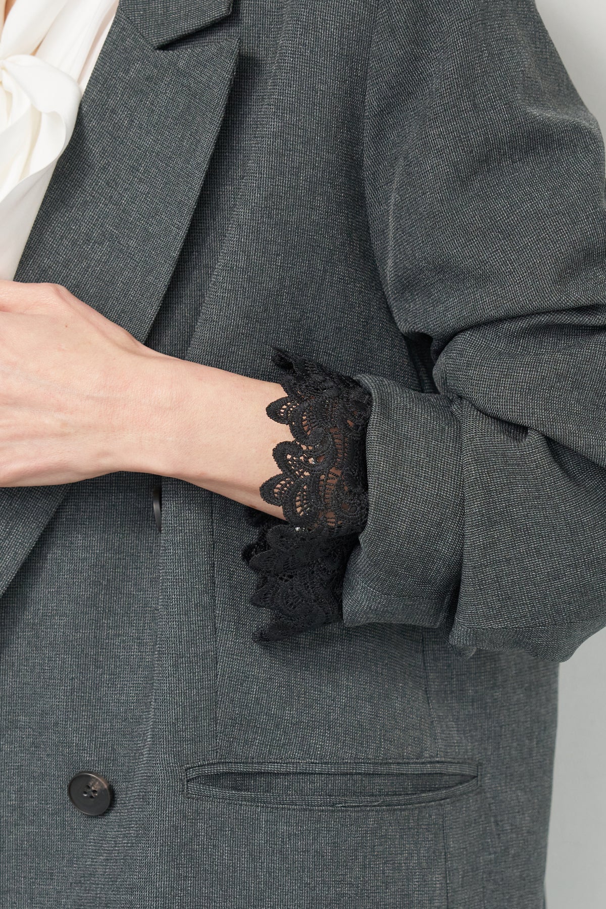 マニッシュなダブルブレストに、繊細なレースディテールを添えた大人のためのジャケット。きちんと感のあるテーラードデザインに、袖口から覗くレースが女性らしい抜け感を演出します。程よくゆとりのあるシルエットで、羽織るだけでこなれた印象に。デニムと合わせたカジュアルミックスはもちろん、きれいめボトムやワンピースの上に羽織れば、オンシーンにも対応可能です。袖はロールアップしてレースを際立たせる着こなしもおすすめ。シンプルながらもディテールにこだわった一着で、いつものスタイリングをワンランクアップしてくれます。
