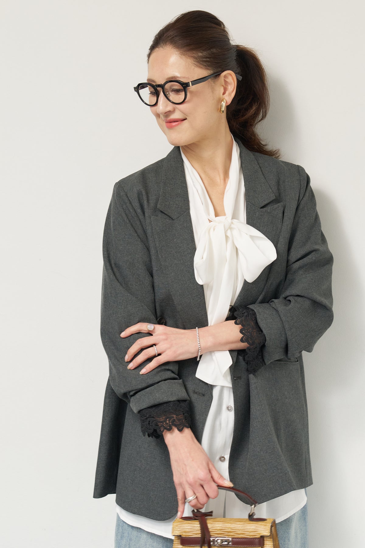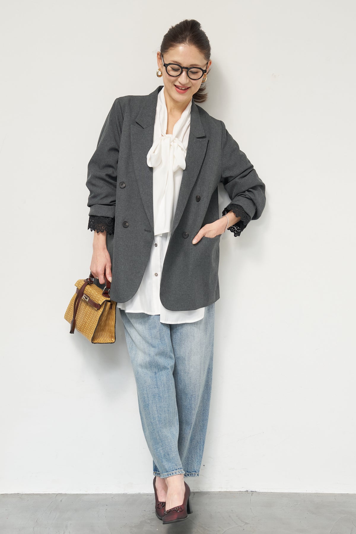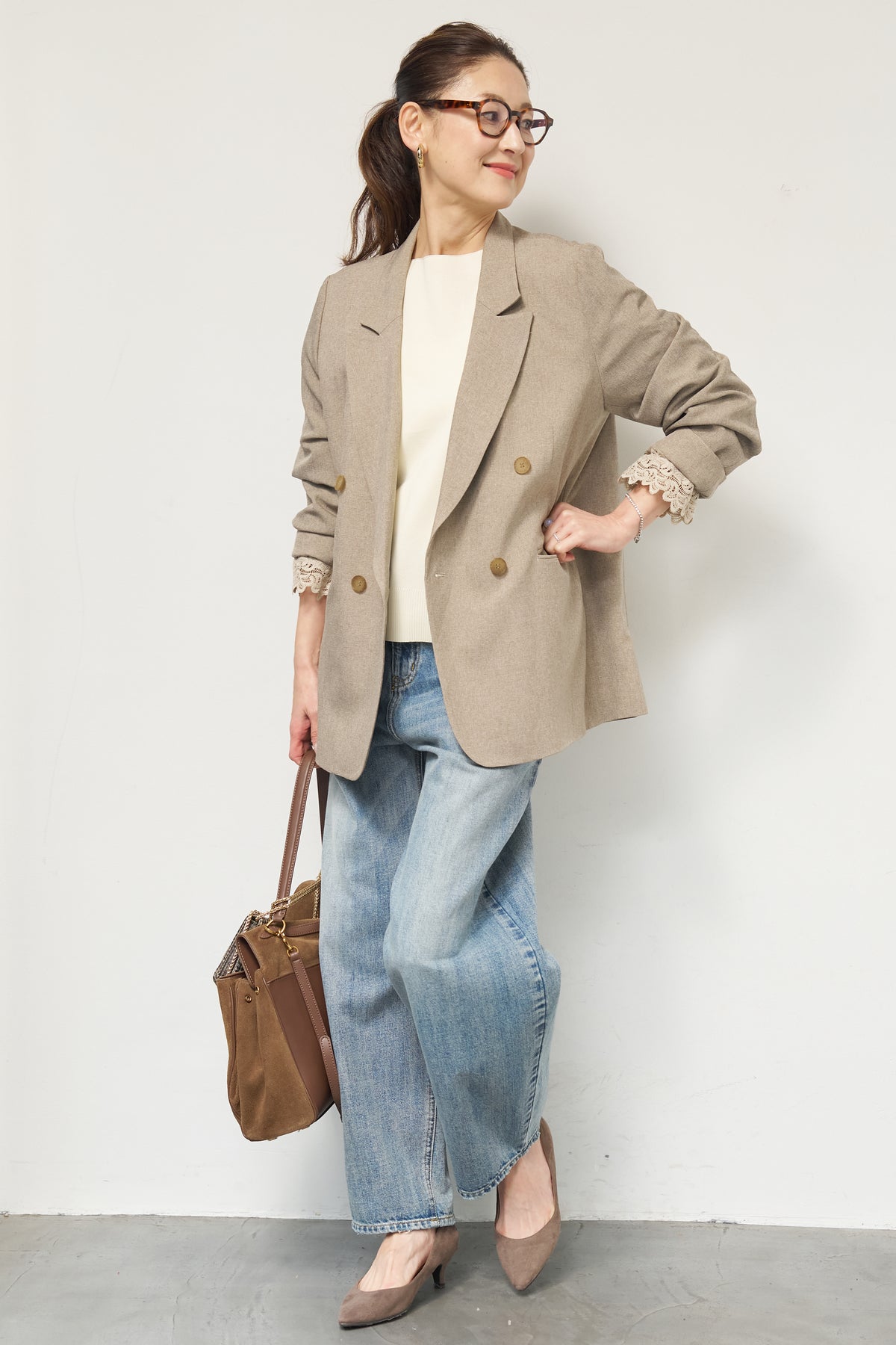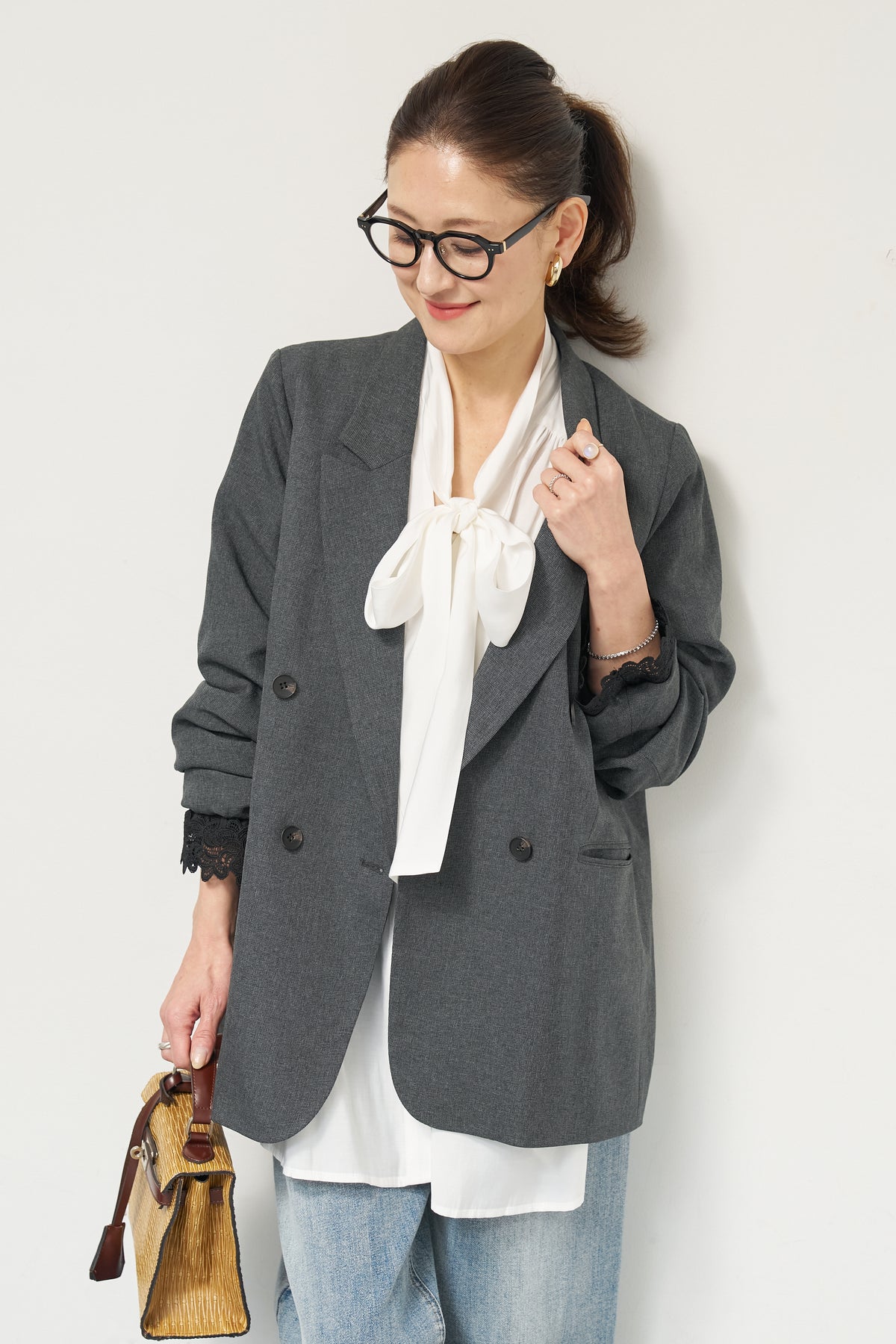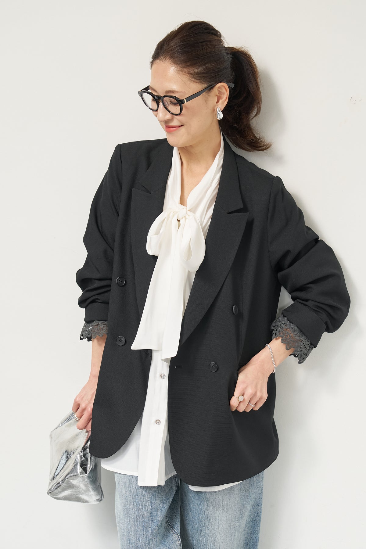 マニッシュなダブルブレストに、繊細なレースディテールを添えた大人のためのジャケット。きちんと感のあるテーラードデザインに、袖口から覗くレースが女性らしい抜け感を演出します。程よくゆとりのあるシルエットで、羽織るだけでこなれた印象に。デニムと合わせたカジュアルミックスはもちろん、きれいめボトムやワンピースの上に羽織れば、オンシーンにも対応可能です。袖はロールアップしてレースを際立たせる着こなしもおすすめ。シンプルながらもディテールにこだわった一着で、いつものスタイリングをワンランクアップしてくれます。