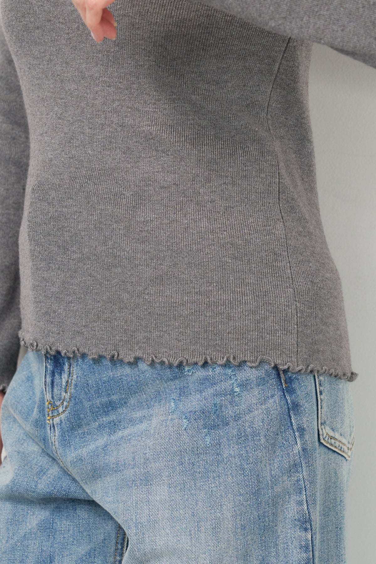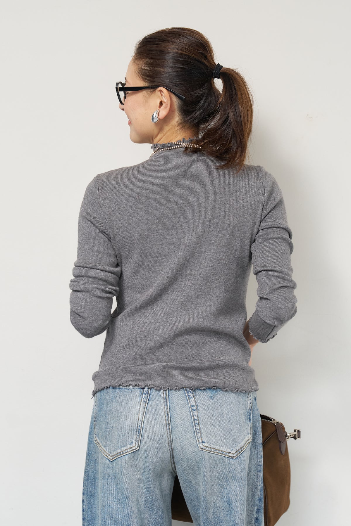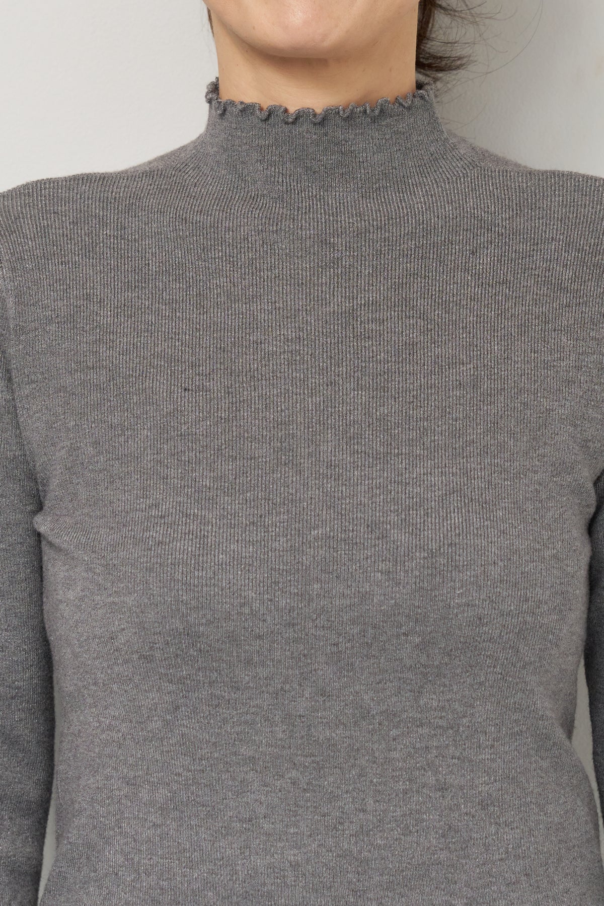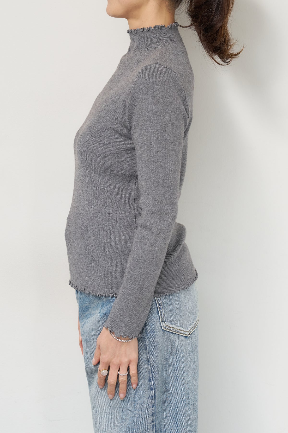 首元・袖口・裾にあしらった繊細なフリルが、さりげないフェミニンさを演出するタートルネックニット。程よくフィットするコンパクトなシルエットで、レイヤードにも一枚着にも使いやすい万能アイテムです。リブ編みの柔らかなニット素材は、身体のラインに自然になじみながらも締め付け感が少なく、快適な着心地。タートルネック部分は高さを抑え、首元を優しく包み込むデザインに仕上げています。 ジャンスカやキャミワンピースのインナーとしてはもちろん、ワイドパンツやスカートと合わせたシンプルなスタイリングにもおすすめ。 甘さと上品さを兼ね備え、デイリーからきれいめコーデまで幅広く活躍する一着です。