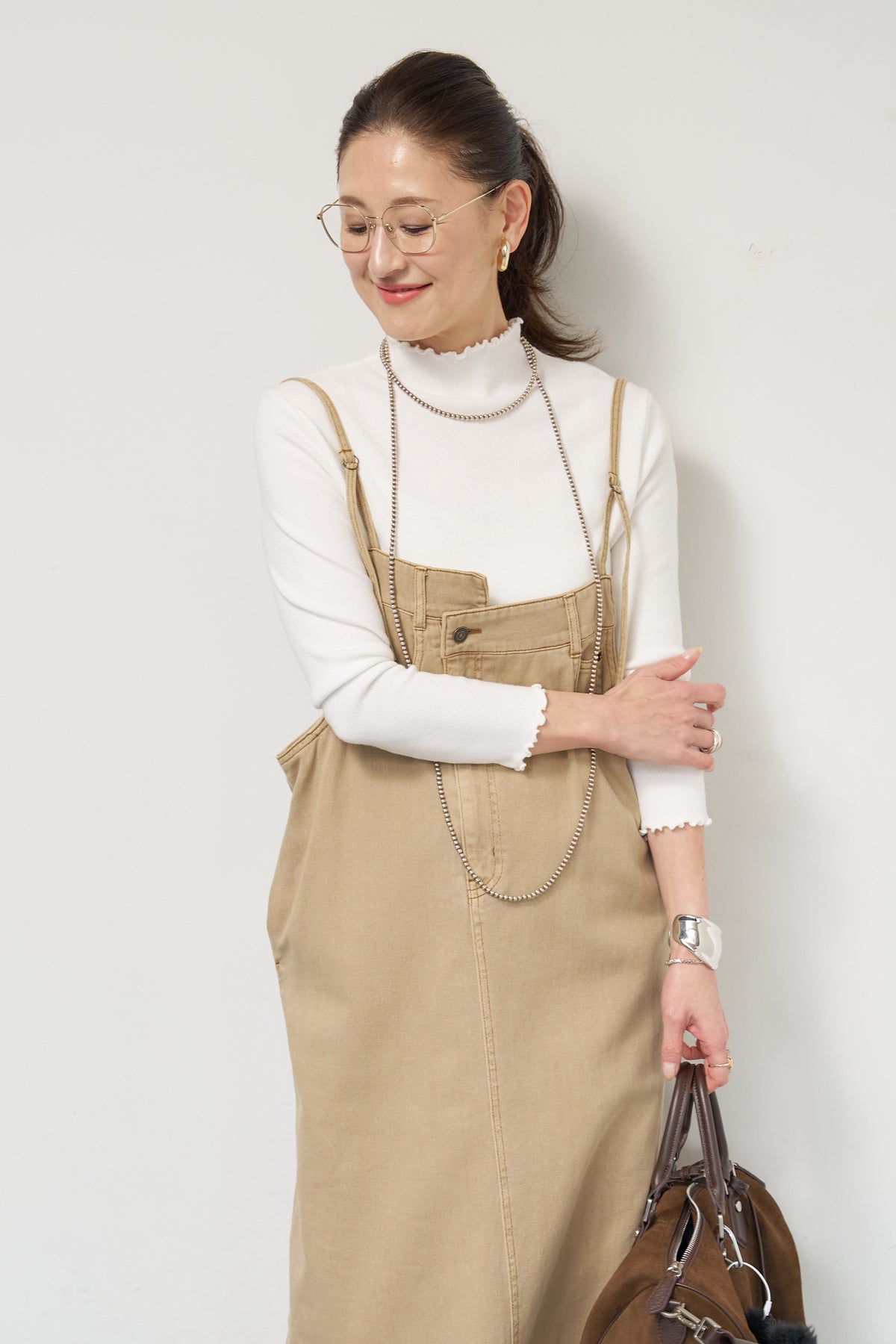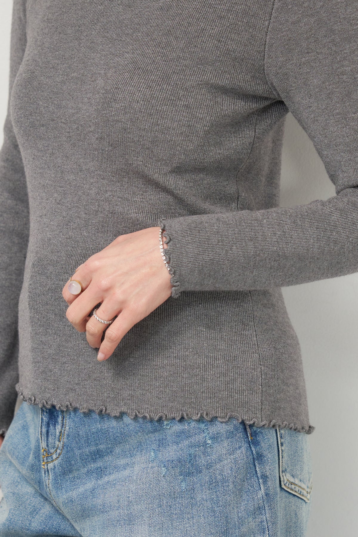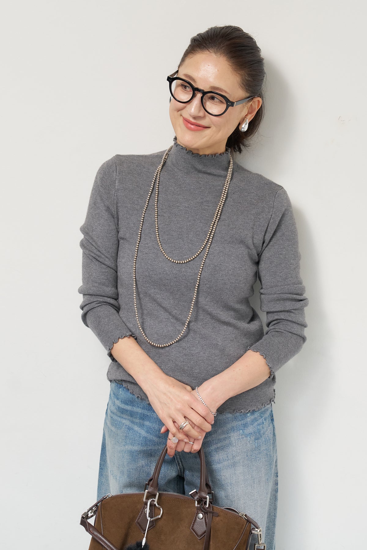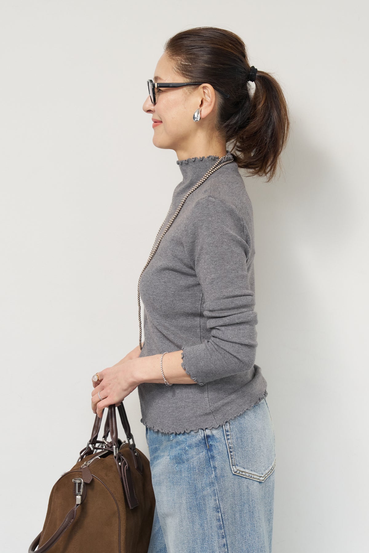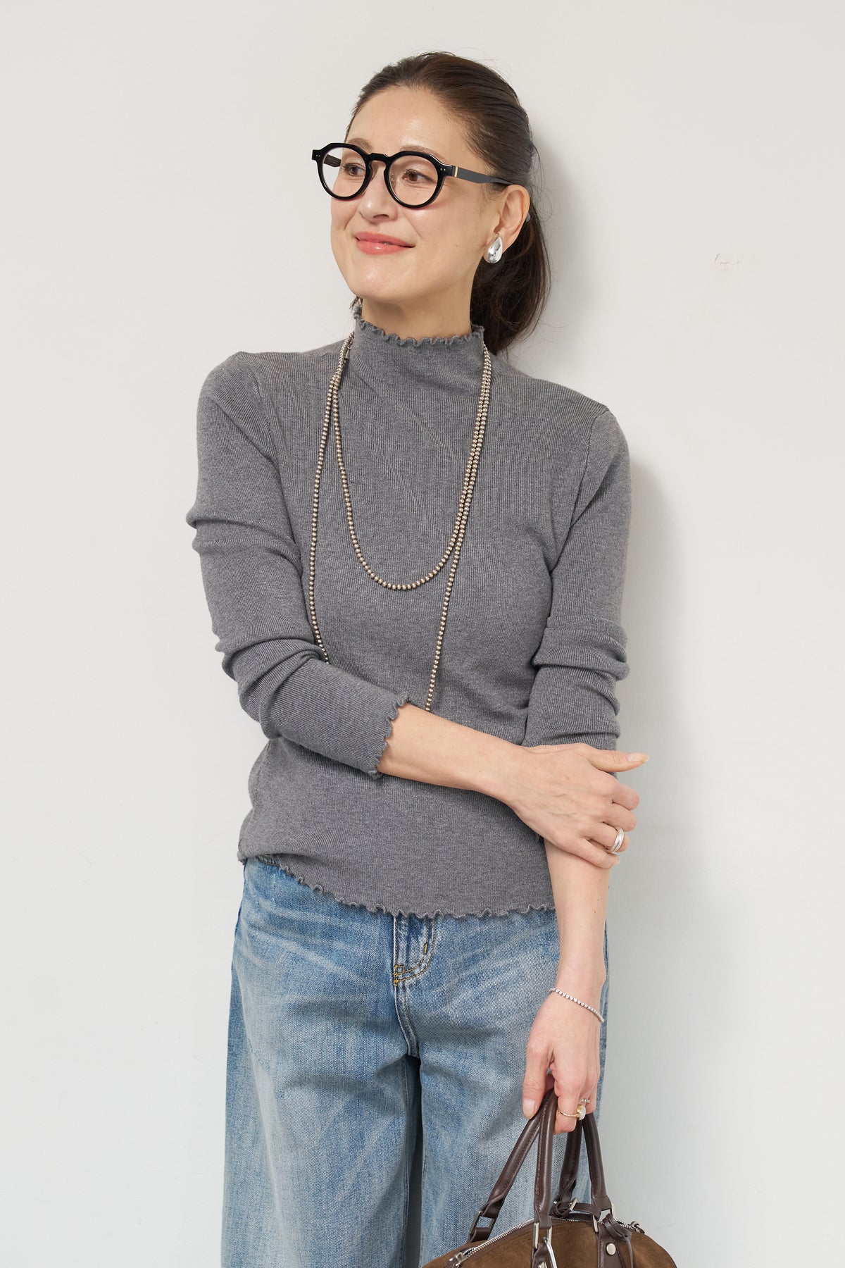首元・袖口・裾にあしらった繊細なフリルが、さりげないフェミニンさを演出するタートルネックニット。程よくフィットするコンパクトなシルエットで、レイヤードにも一枚着にも使いやすい万能アイテムです。リブ編みの柔らかなニット素材は、身体のラインに自然になじみながらも締め付け感が少なく、快適な着心地。タートルネック部分は高さを抑え、首元を優しく包み込むデザインに仕上げています。 ジャンスカやキャミワンピースのインナーとしてはもちろん、ワイドパンツやスカートと合わせたシンプルなスタイリングにもおすすめ。 甘さと上品さを兼ね備え、デイリーからきれいめコーデまで幅広く活躍する一着です。