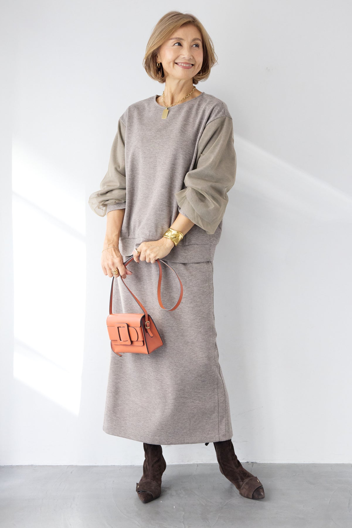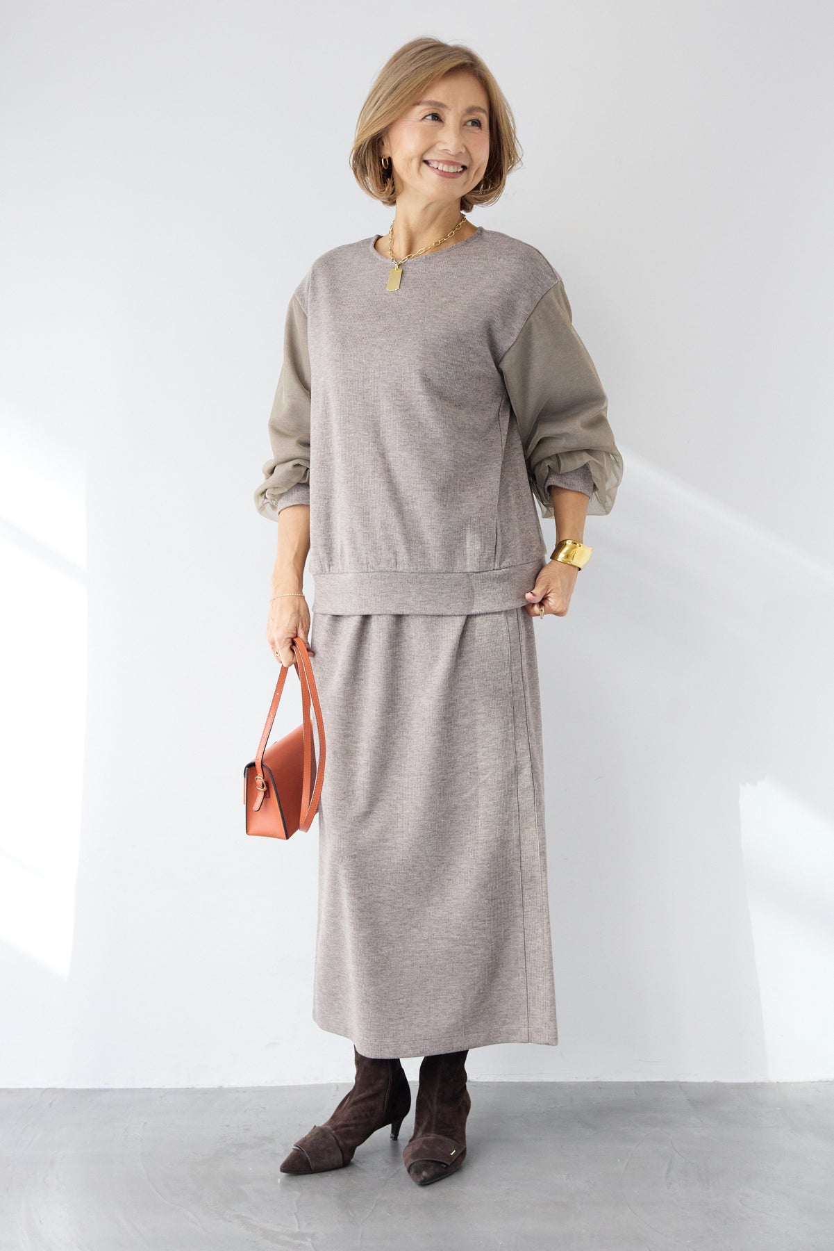 バックにはスリットを施し、足さばきの良さとさりげない抜け感をプラス。同素材のトップスと合わせたセットアップスタイルはもちろん、ニットやブラウスとも相性が良く、デイリーからきれいめまで幅広く活躍する一着です。