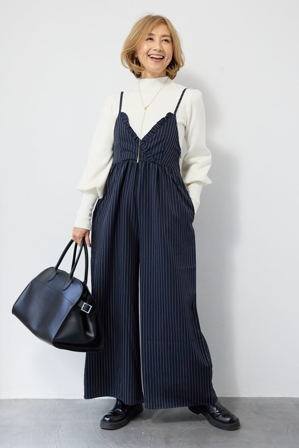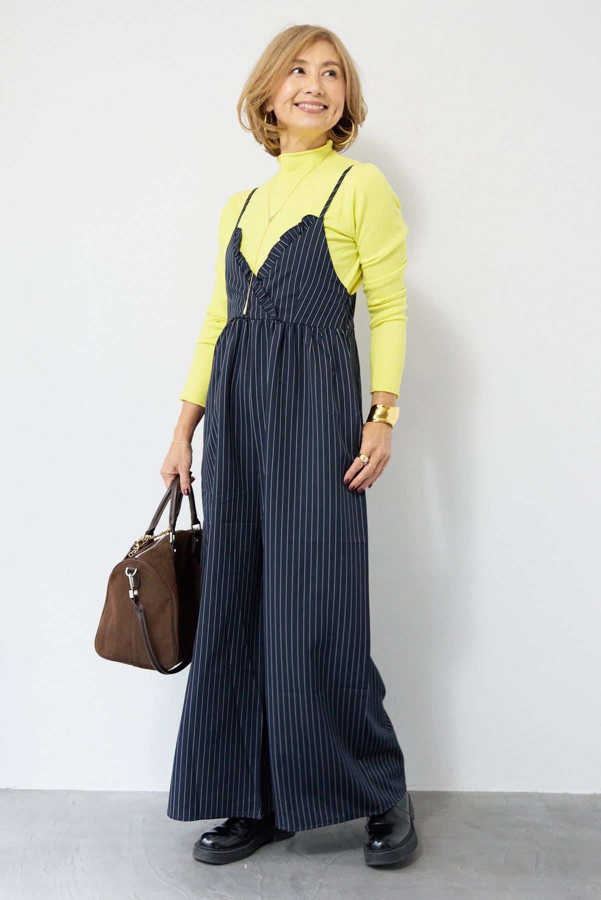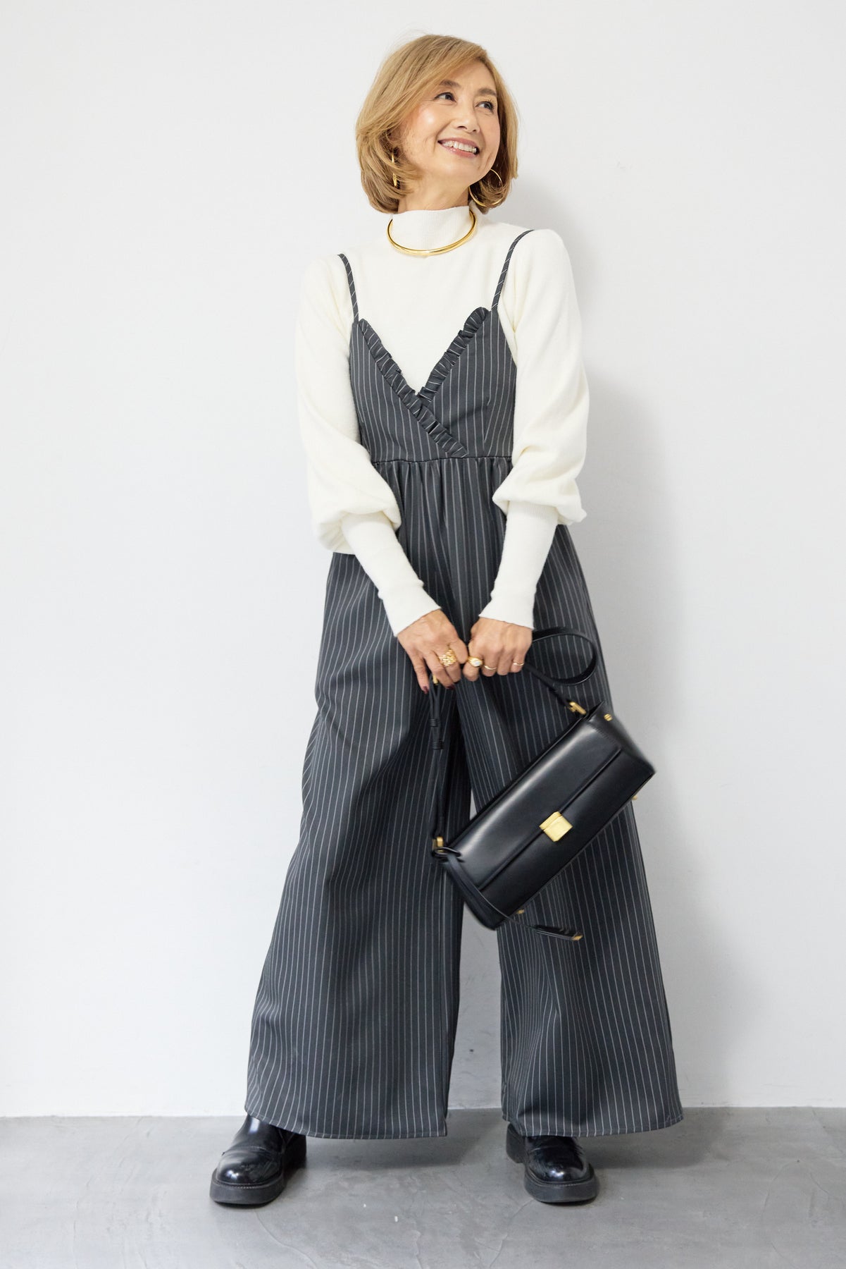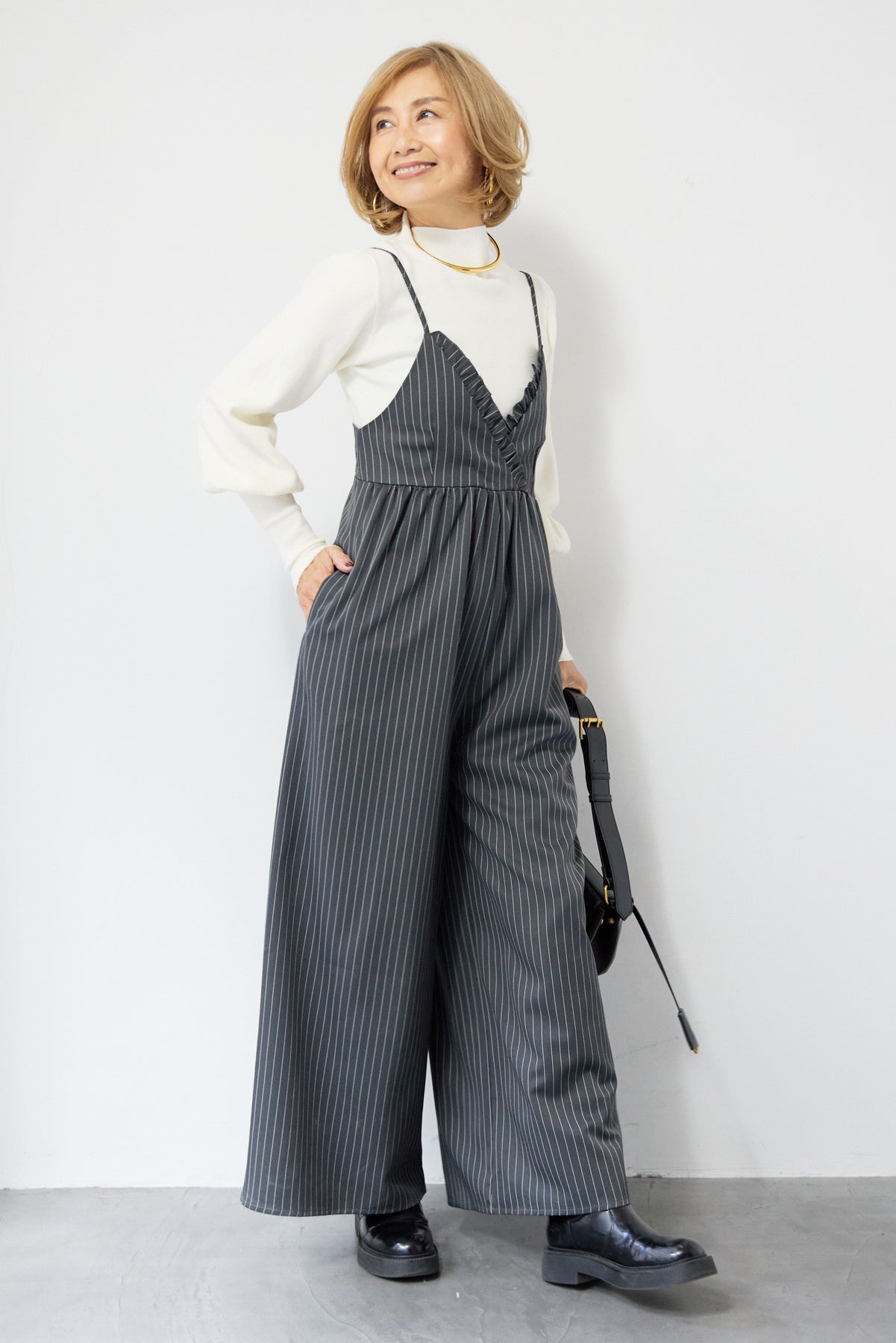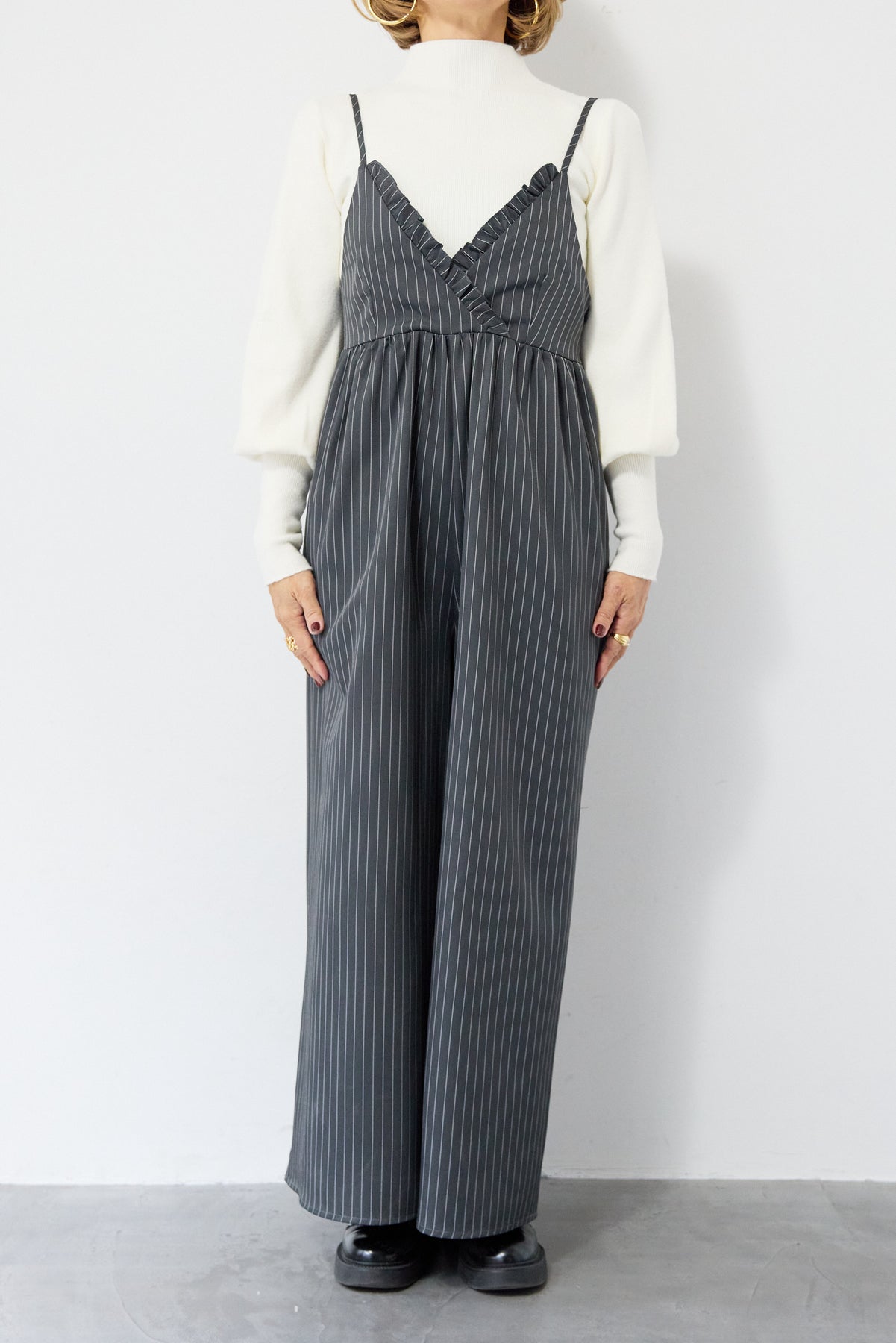 ピンストライプ×フリルが映える上品モードなオールインワン ピンストライプ柄でスタイリッシュな印象を与えるオールインワン。 V字部分に施したフリルが顔まわりを華やかに見せ、きちんと感の中にも柔らかい女性らしさをプラス◎ ウエストはやや高めの位置で切り替えられており、自然にバランスよくスタイルアップを叶えます。 パンツ部分はややワイドめのラインで、脚のラインを拾わずすっきりと縦長シルエットを強調。 ストンと落ちる落ち感のある生地が縦のラインを強調し、全体をすっきりとした印象になります。