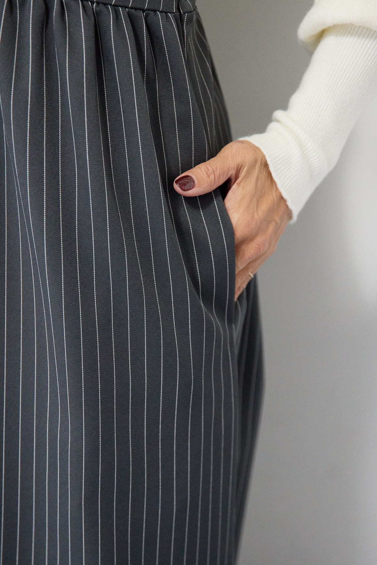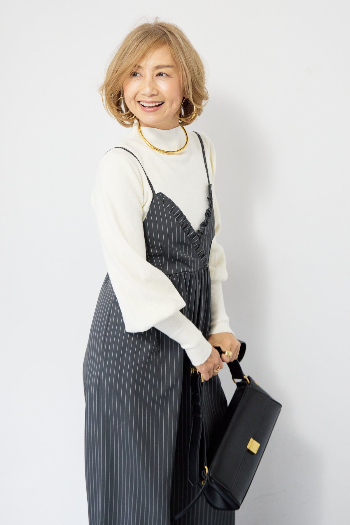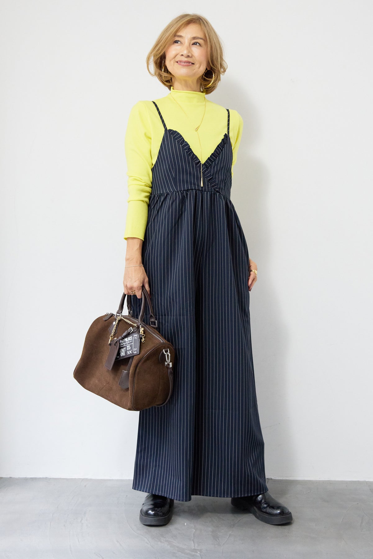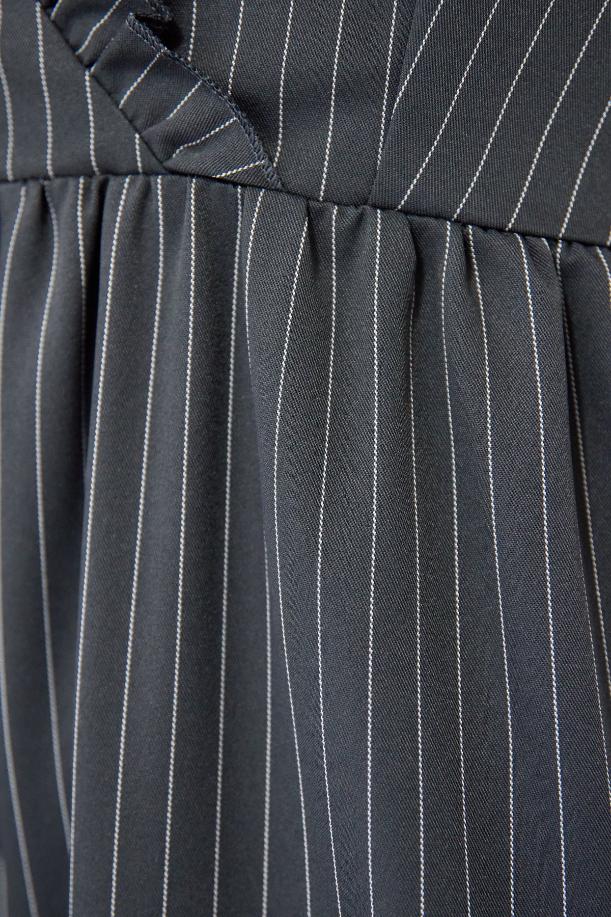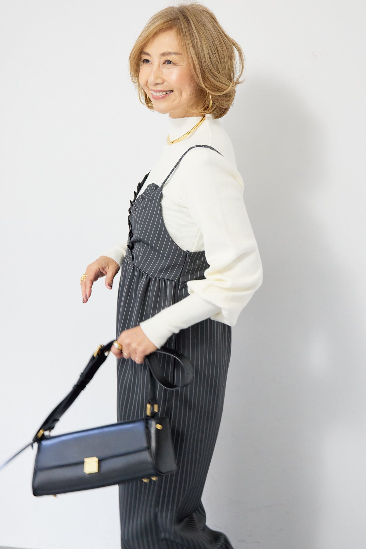 ピンストライプ×フリルが映える上品モードなオールインワン ピンストライプ柄でスタイリッシュな印象を与えるオールインワン。 V字部分に施したフリルが顔まわりを華やかに見せ、きちんと感の中にも柔らかい女性らしさをプラス◎ ウエストはやや高めの位置で切り替えられており、自然にバランスよくスタイルアップを叶えます。 パンツ部分はややワイドめのラインで、脚のラインを拾わずすっきりと縦長シルエットを強調。 ストンと落ちる落ち感のある生地が縦のラインを強調し、全体をすっきりとした印象になります。