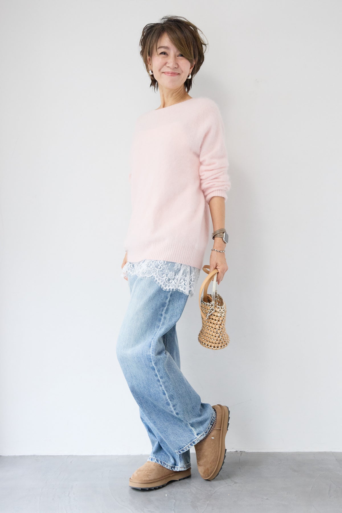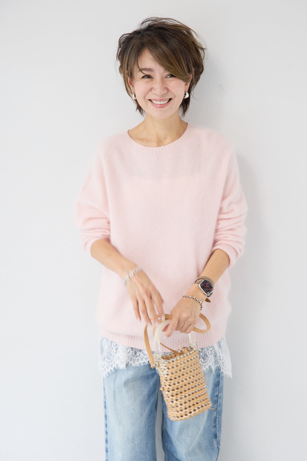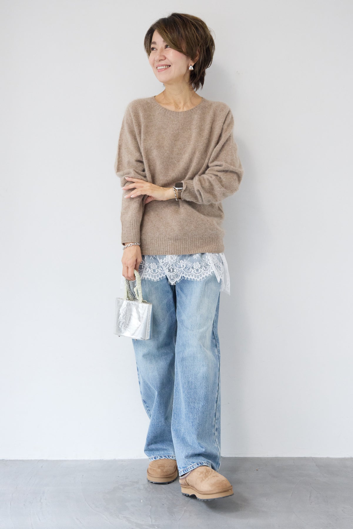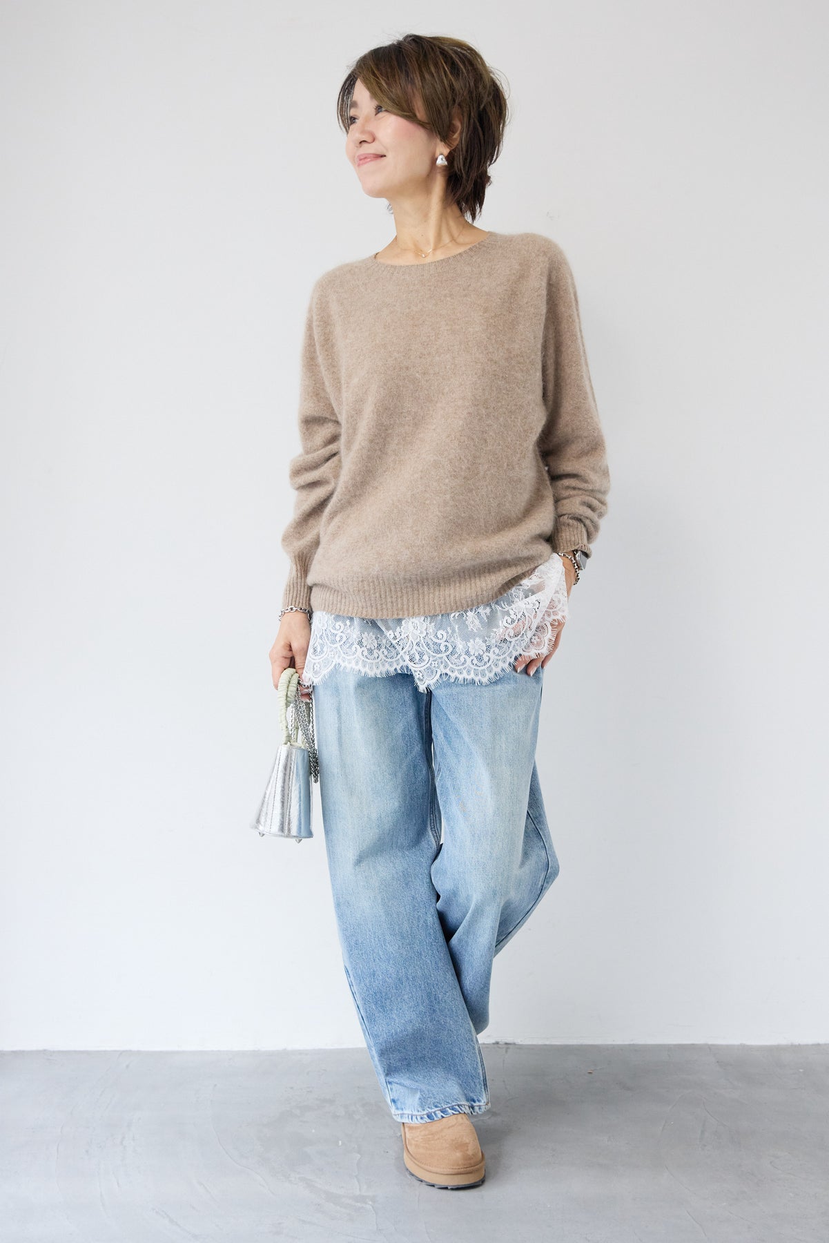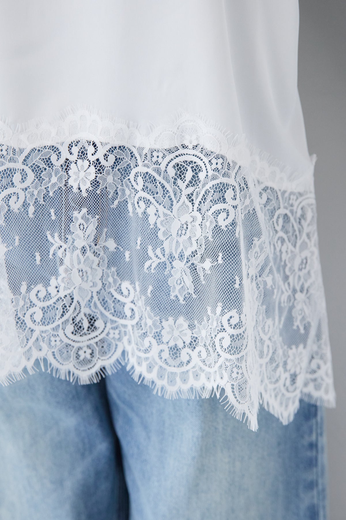 裾には繊細で上品なレースをあしらい、甘さを抑えた大人フェミニンな印象に仕上げています。レース部分は程よい透け感があり、重ね着しても軽やかな見え方が魅力です。