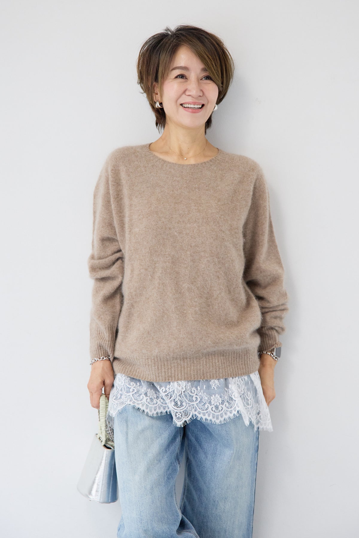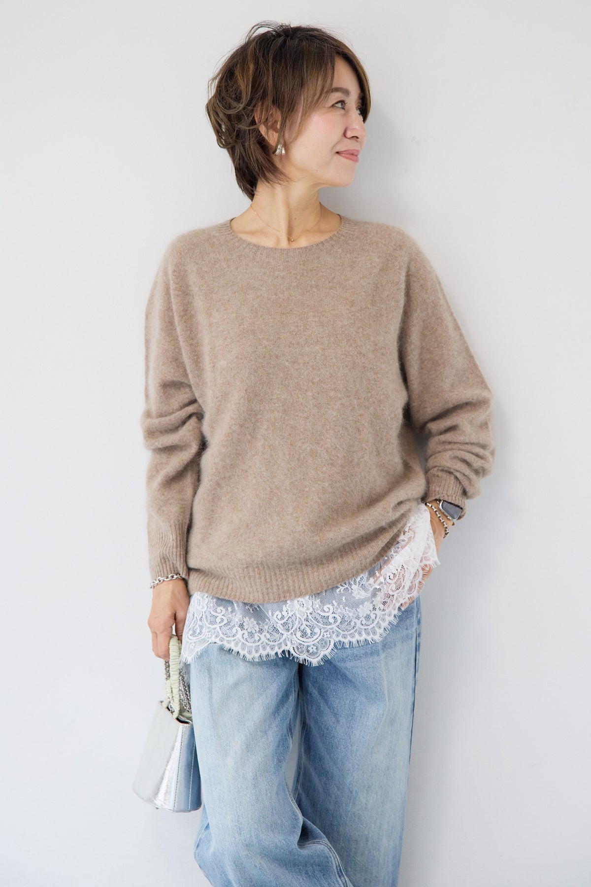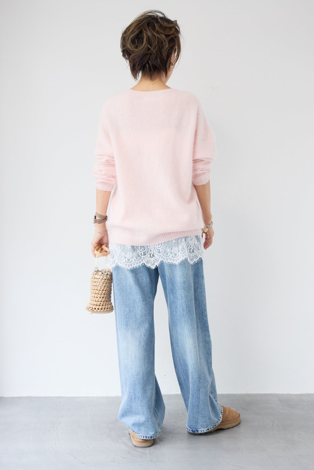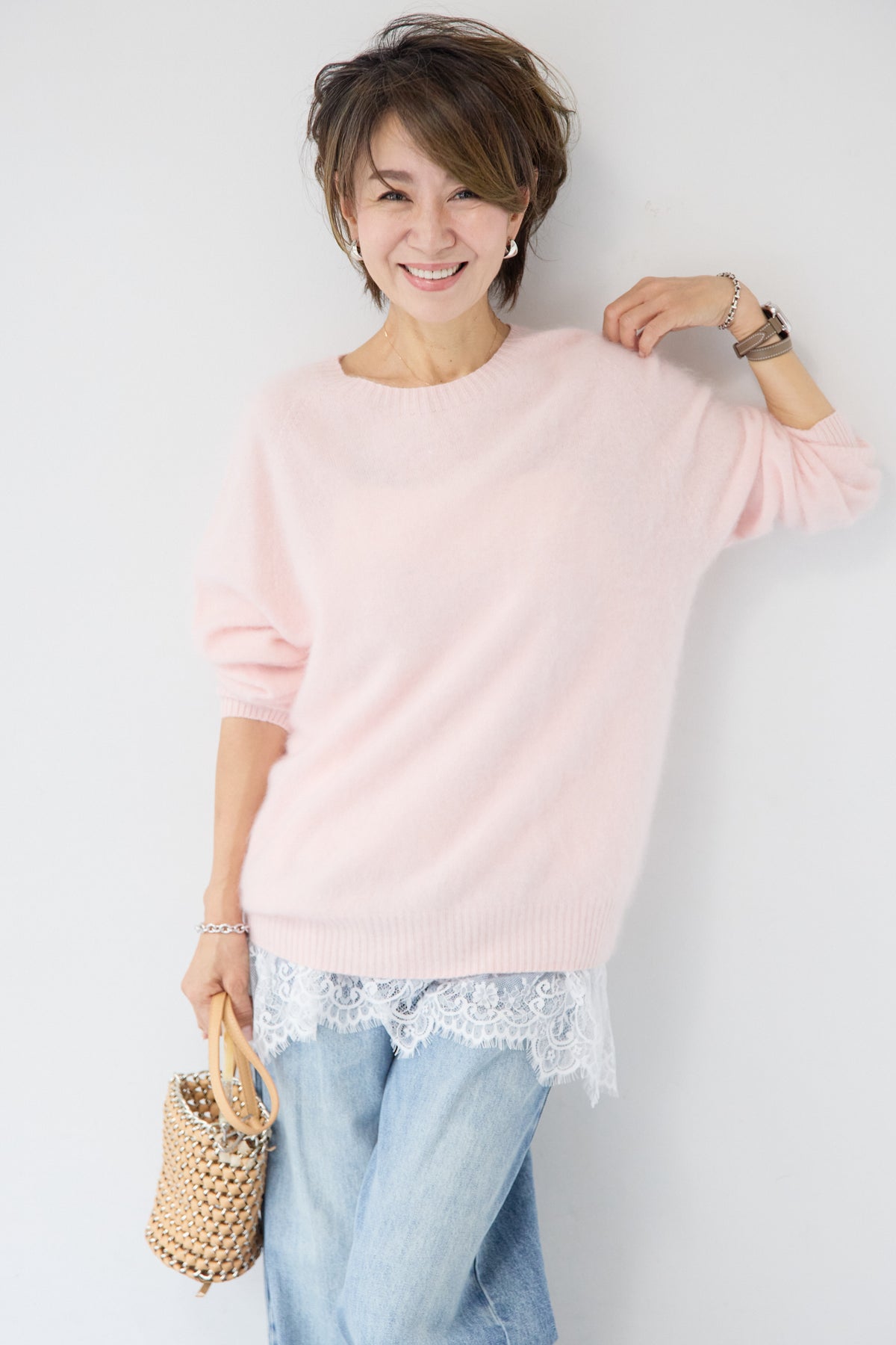 裾には繊細で上品なレースをあしらい、甘さを抑えた大人フェミニンな印象に仕上げています。レース部分は程よい透け感があり、重ね着しても軽やかな見え方が魅力です。